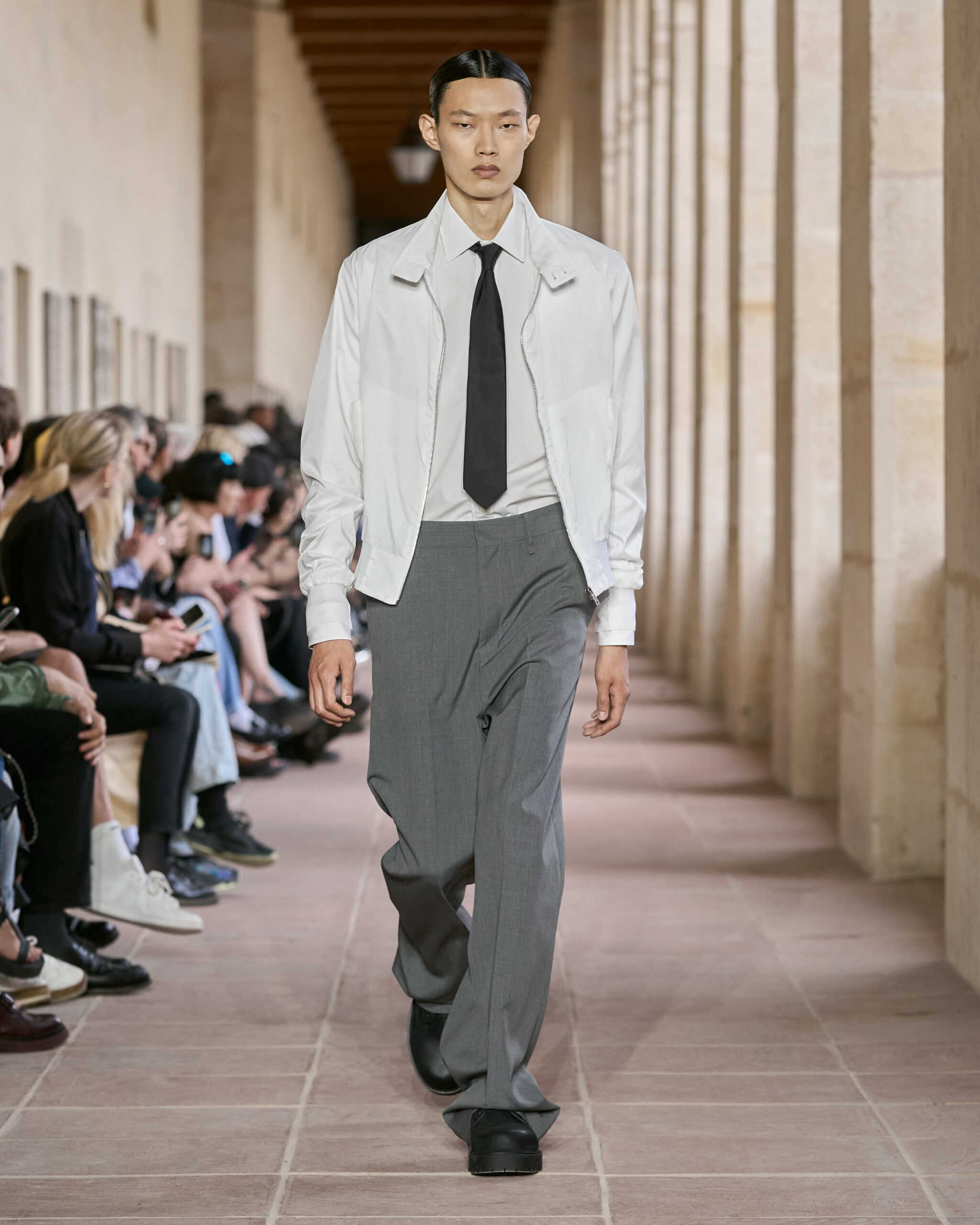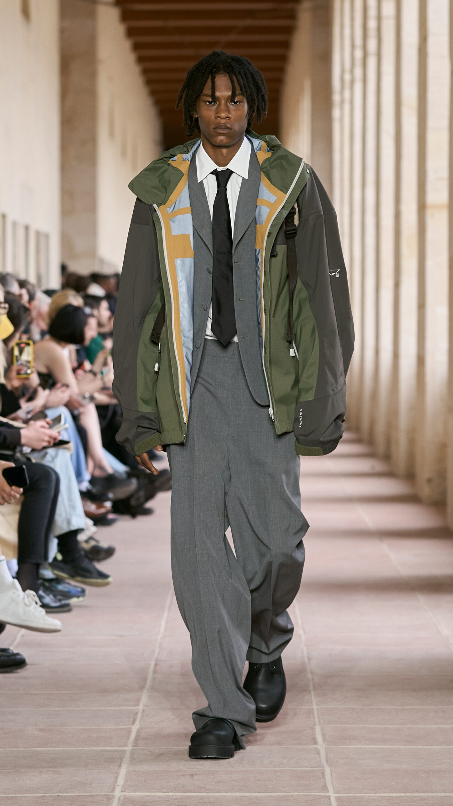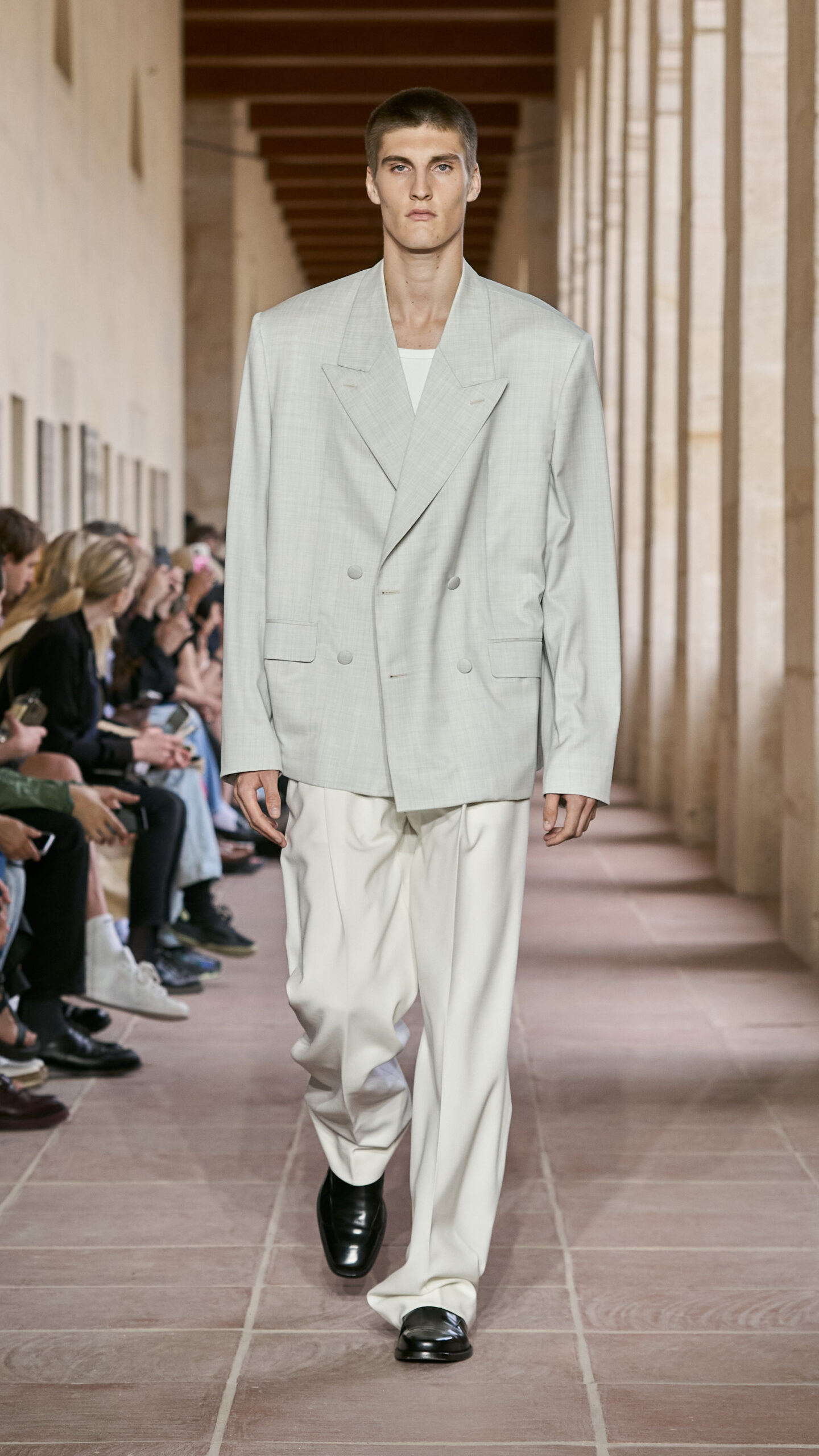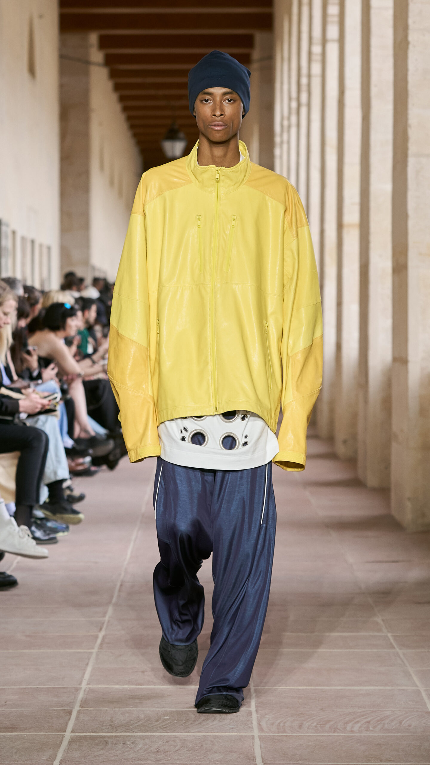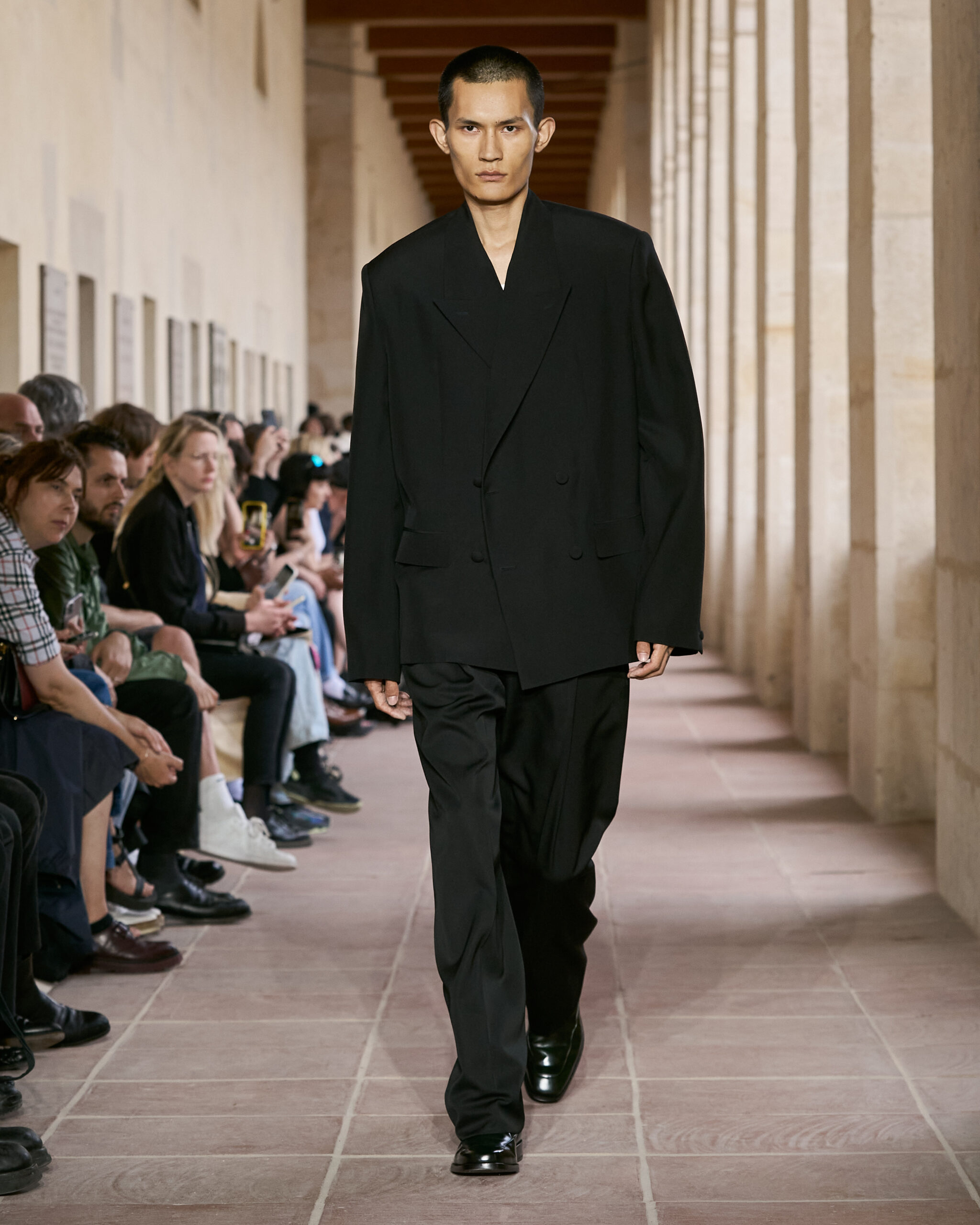 La silhouette évolue pour explorer les articles essentiels de la garde-robe, sublimés par des techniques de luxe. T-shirts longs, pièces en jersey, pantalons cargo larges et chinos surdimensionnés reflètent une idée de proportion réaliste. La texture, l’ajustement et le matériau se fusionnent pour créer une esthétique riche et multidimensionnelle, reflet d’une approche réfléchie de l’élégance masculine.