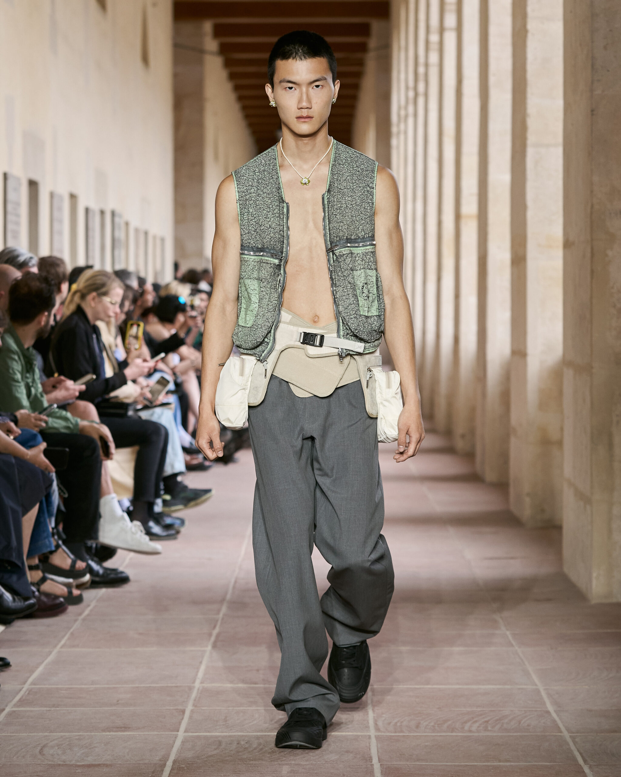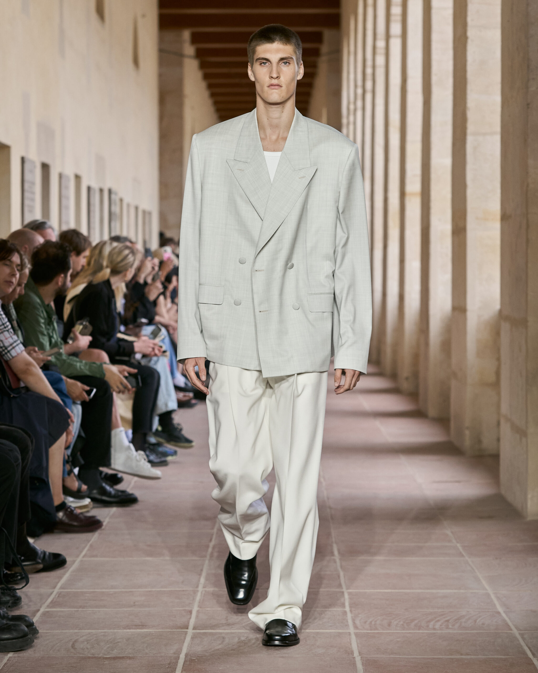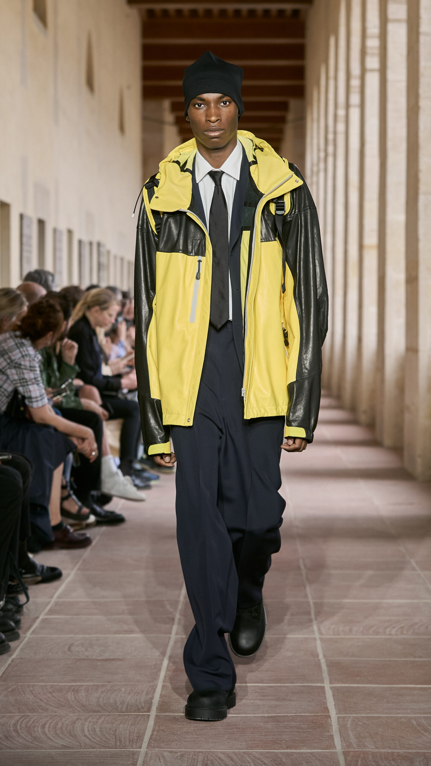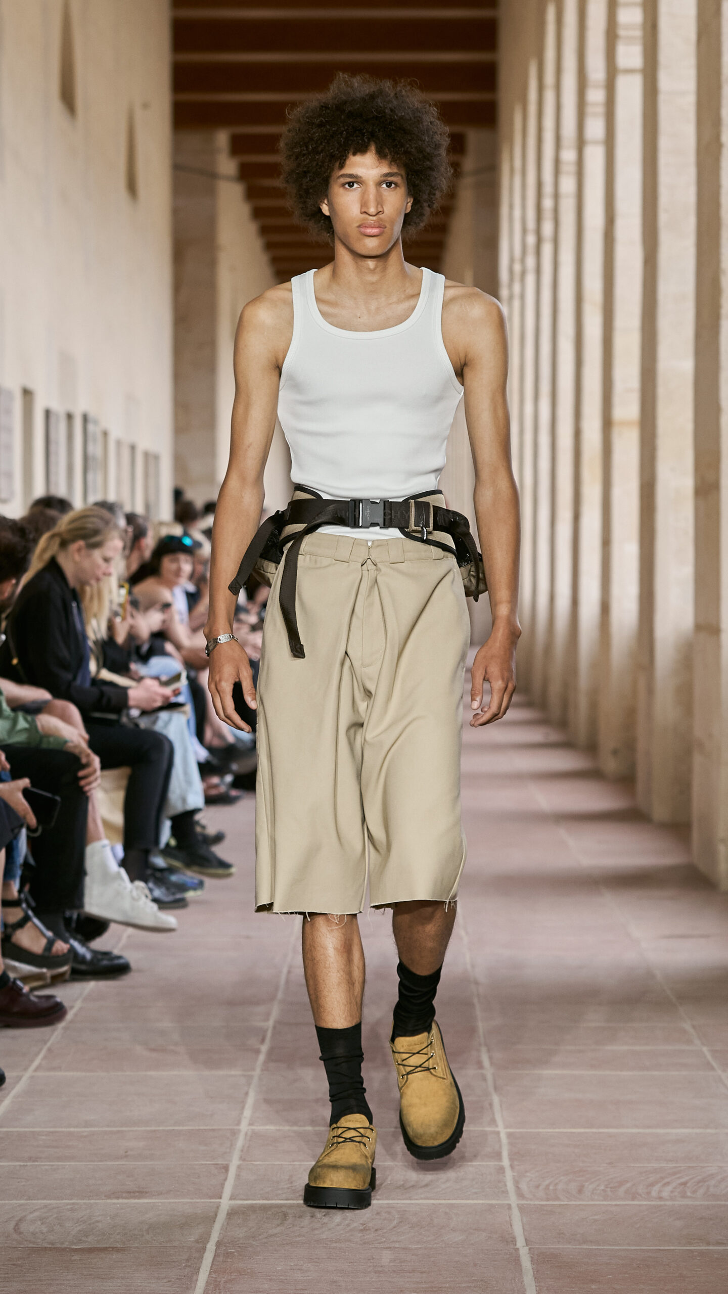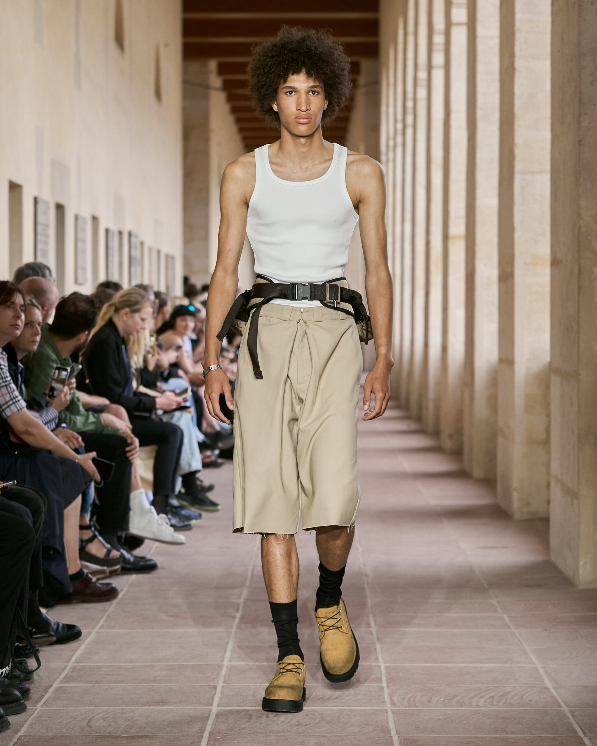 La silhouette évolue pour explorer les articles essentiels de la garde-robe, sublimés par des techniques de luxe. T-shirts longs, pièces en jersey, pantalons cargo larges et chinos surdimensionnés reflètent une idée de proportion réaliste. La texture, l’ajustement et le matériau se fusionnent pour créer une esthétique riche et multidimensionnelle, reflet d’une approche réfléchie de l’élégance masculine.