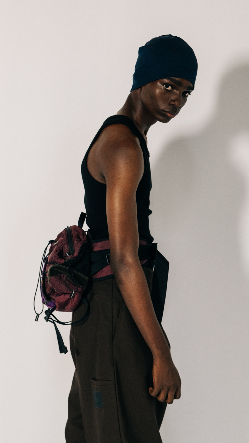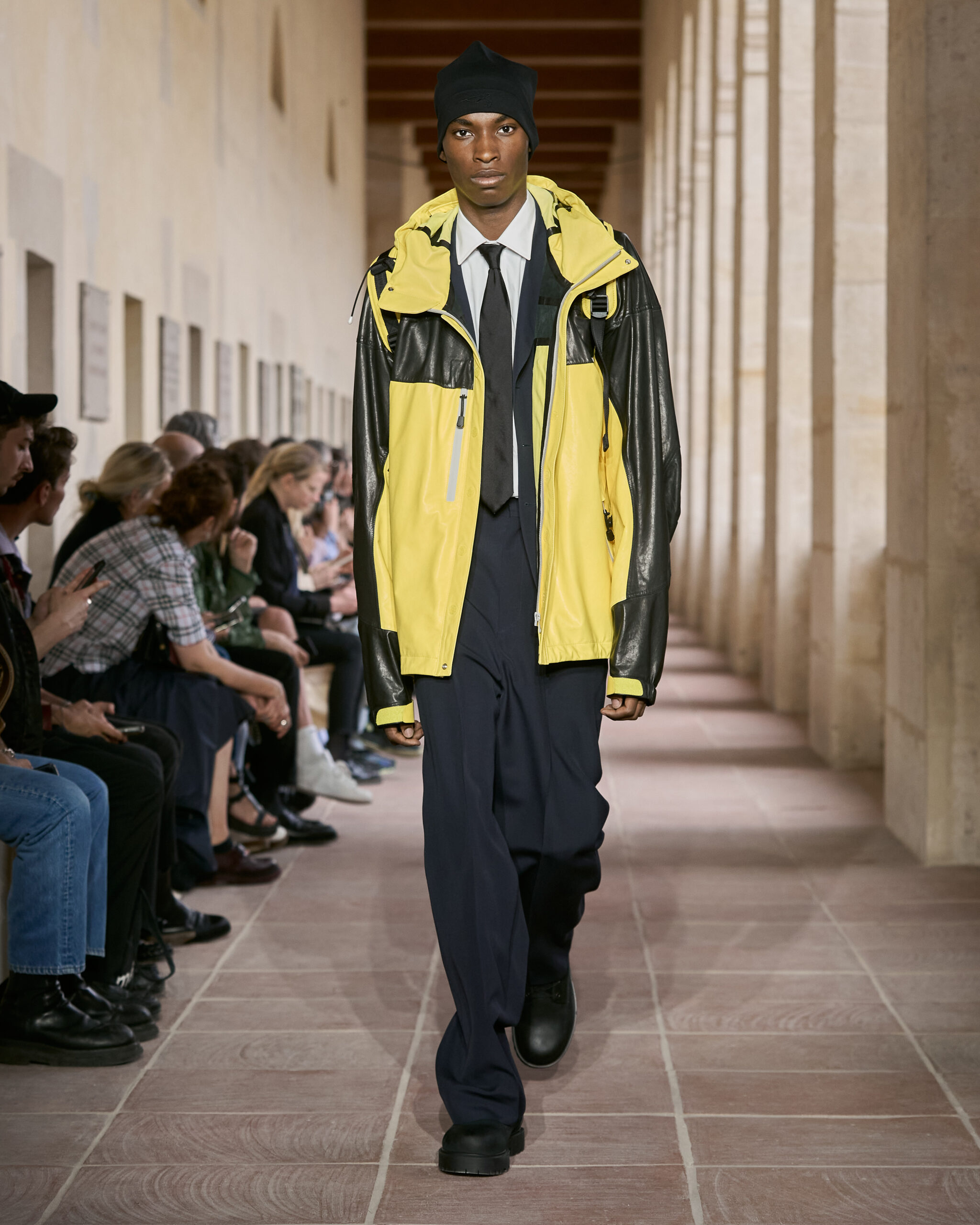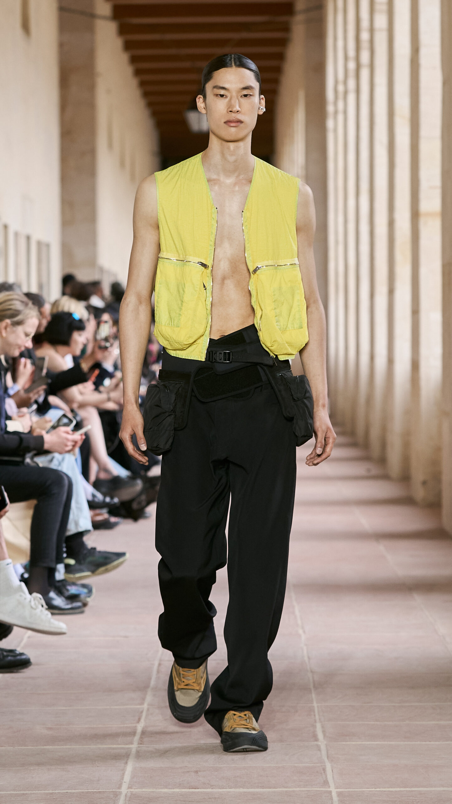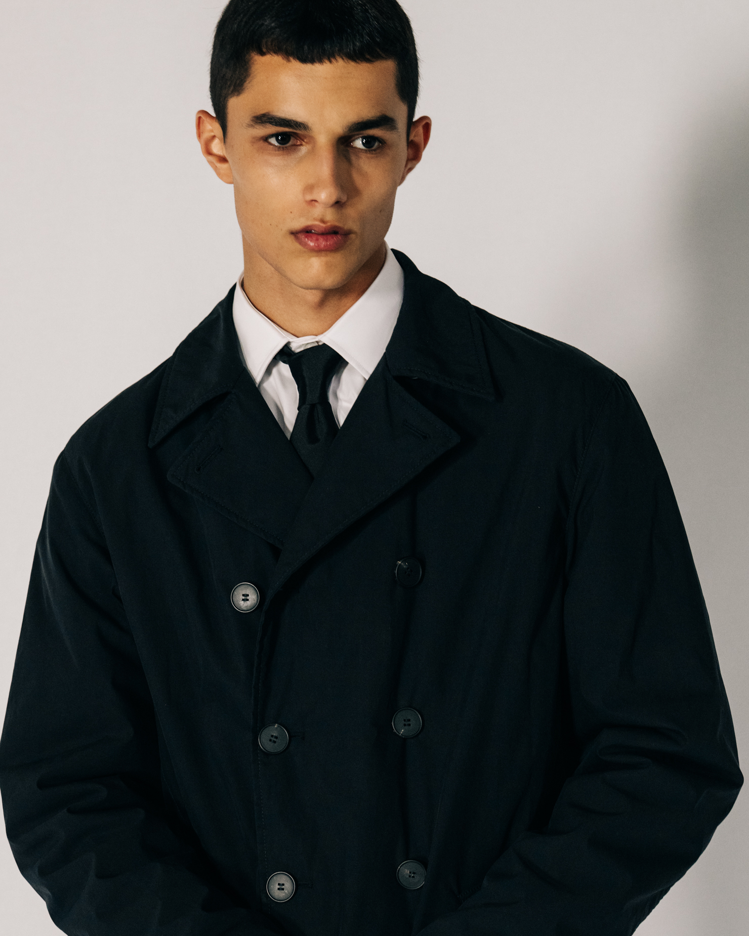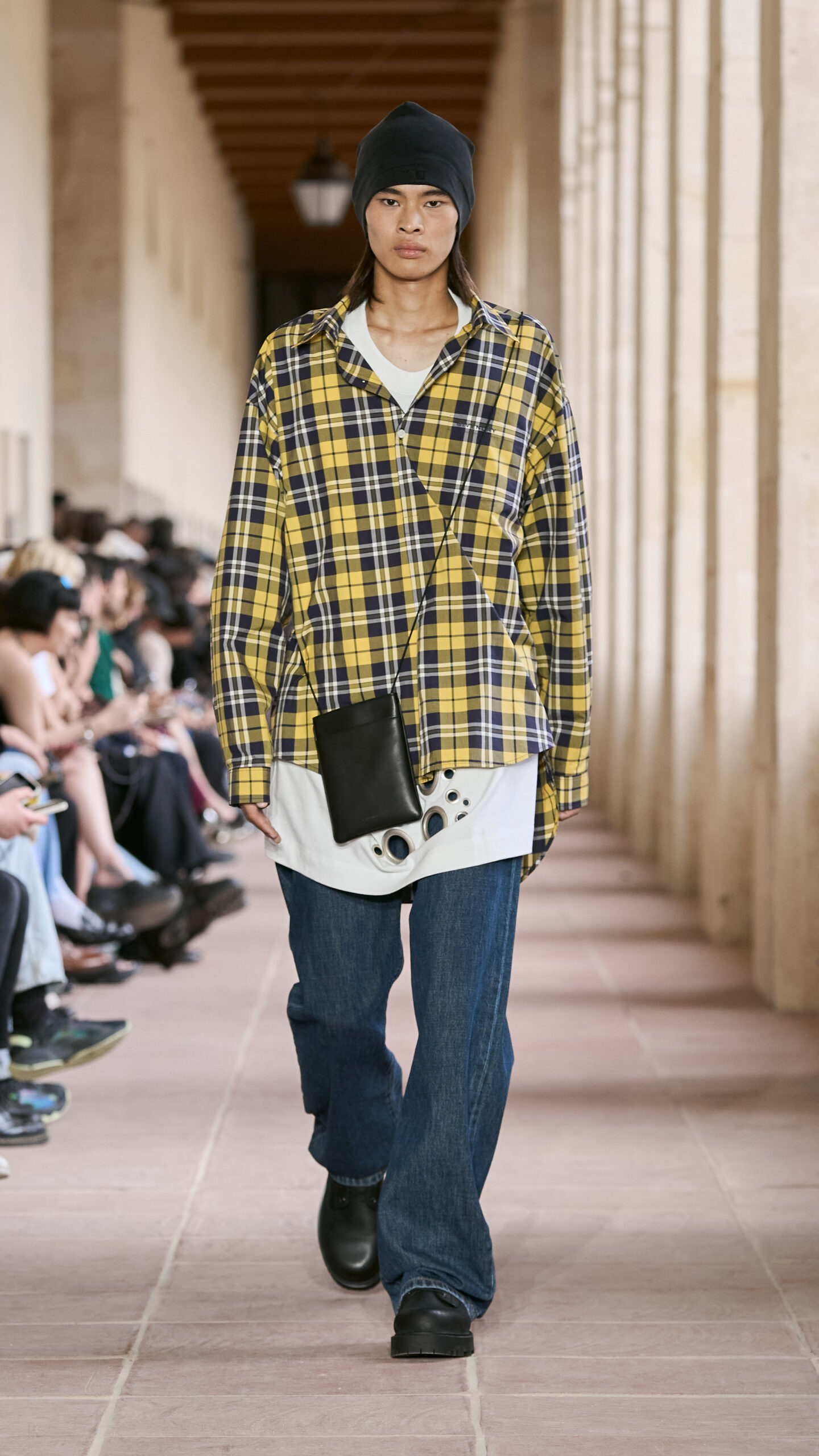 La silhouette évolue pour explorer les articles essentiels de la garde-robe, sublimés par des techniques de luxe. T-shirts longs, pièces en jersey, pantalons cargo larges et chinos surdimensionnés reflètent une idée de proportion réaliste. La texture, l’ajustement et le matériau se fusionnent pour créer une esthétique riche et multidimensionnelle, reflet d’une approche réfléchie de l’élégance masculine.