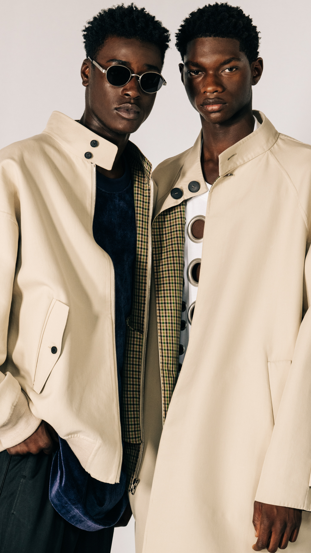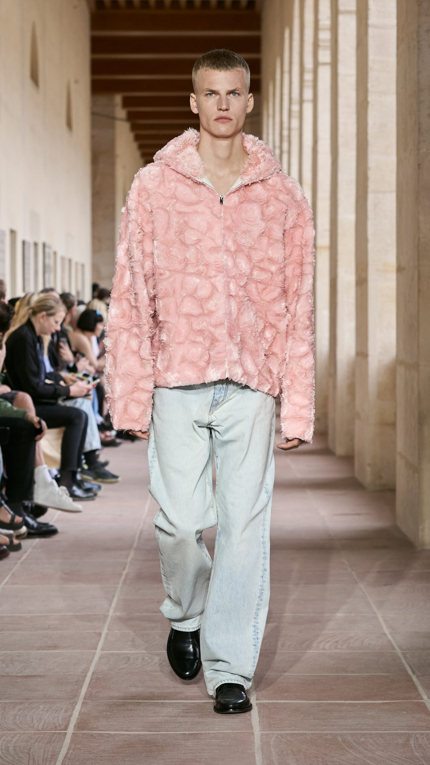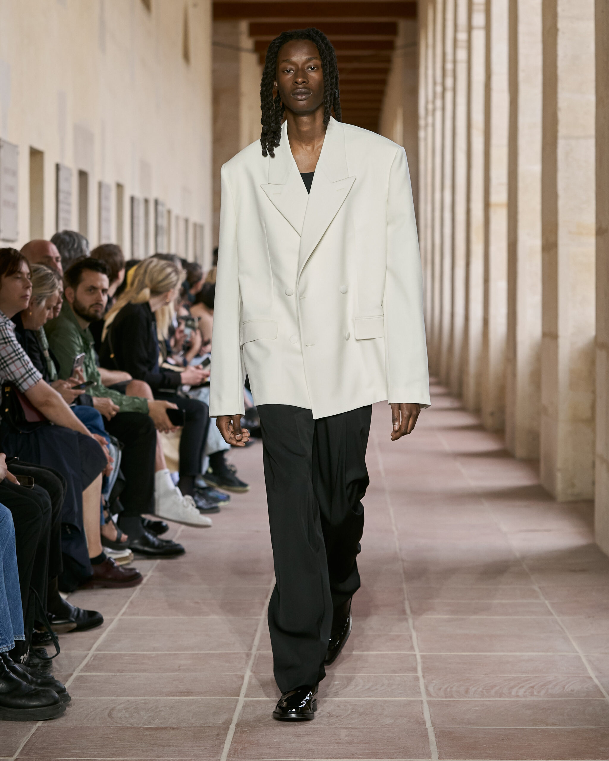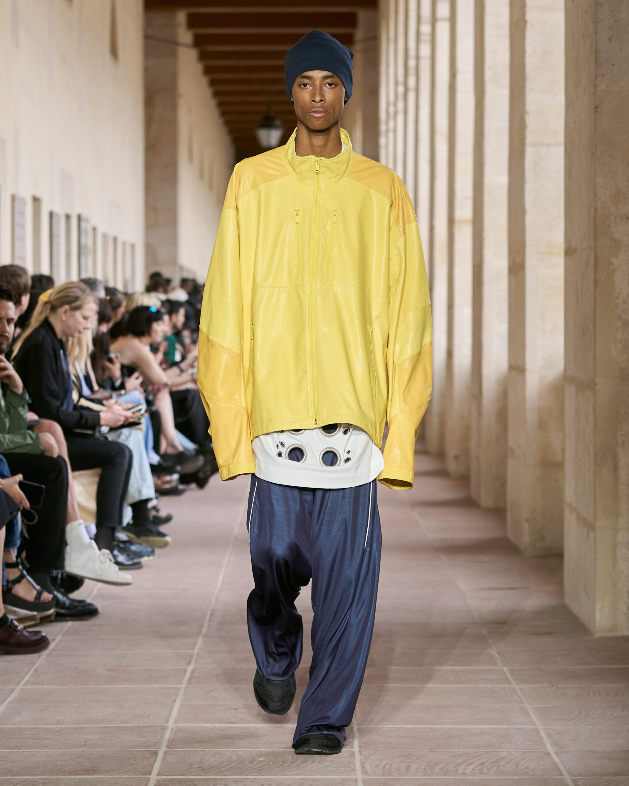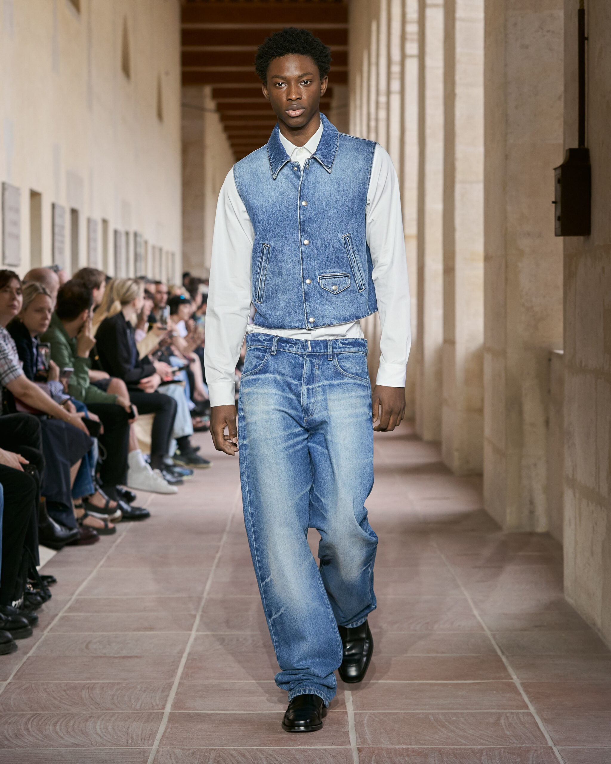 La silhouette évolue pour explorer les articles essentiels de la garde-robe, sublimés par des techniques de luxe. T-shirts longs, pièces en jersey, pantalons cargo larges et chinos surdimensionnés reflètent une idée de proportion réaliste. La texture, l’ajustement et le matériau se fusionnent pour créer une esthétique riche et multidimensionnelle, reflet d’une approche réfléchie de l’élégance masculine.