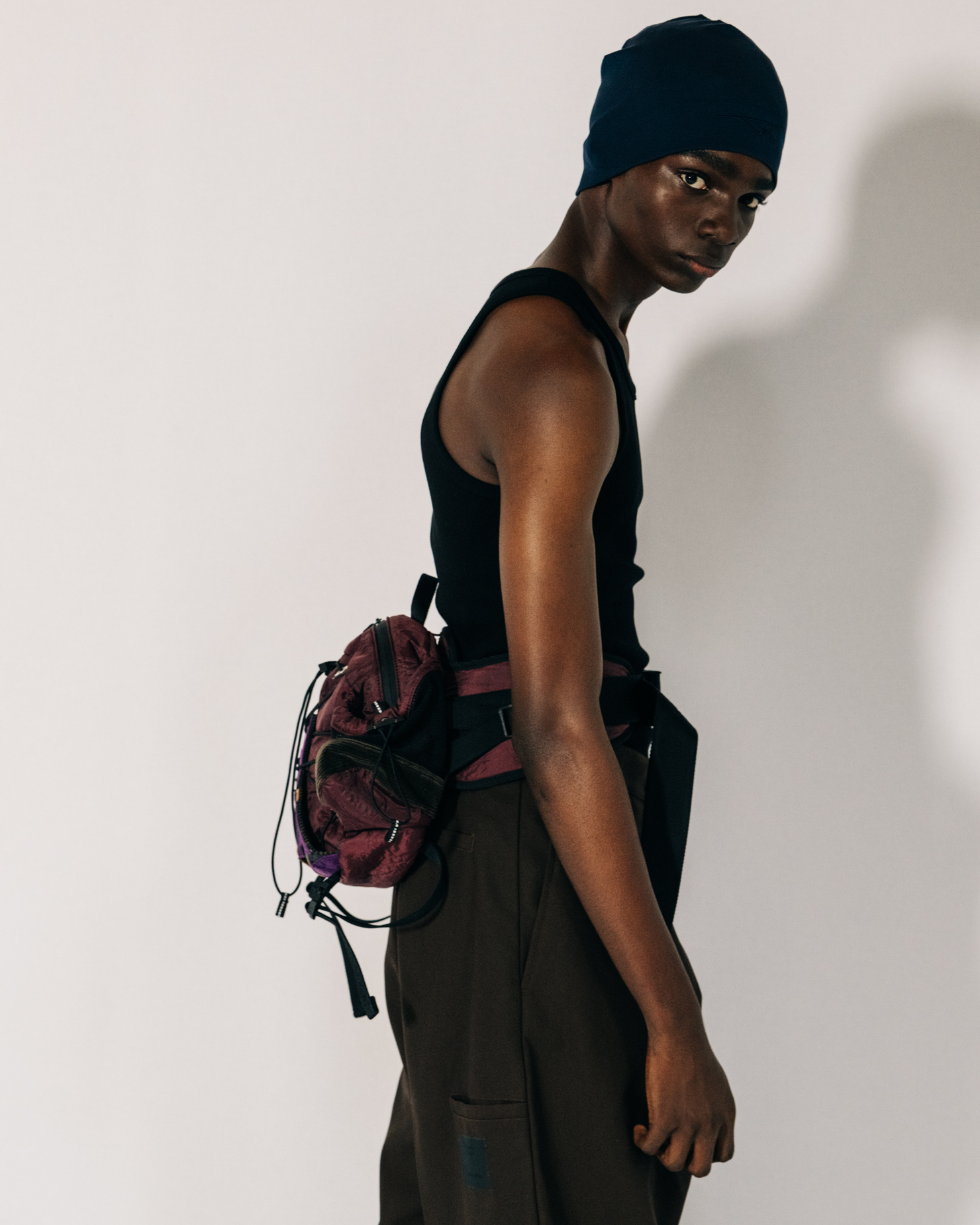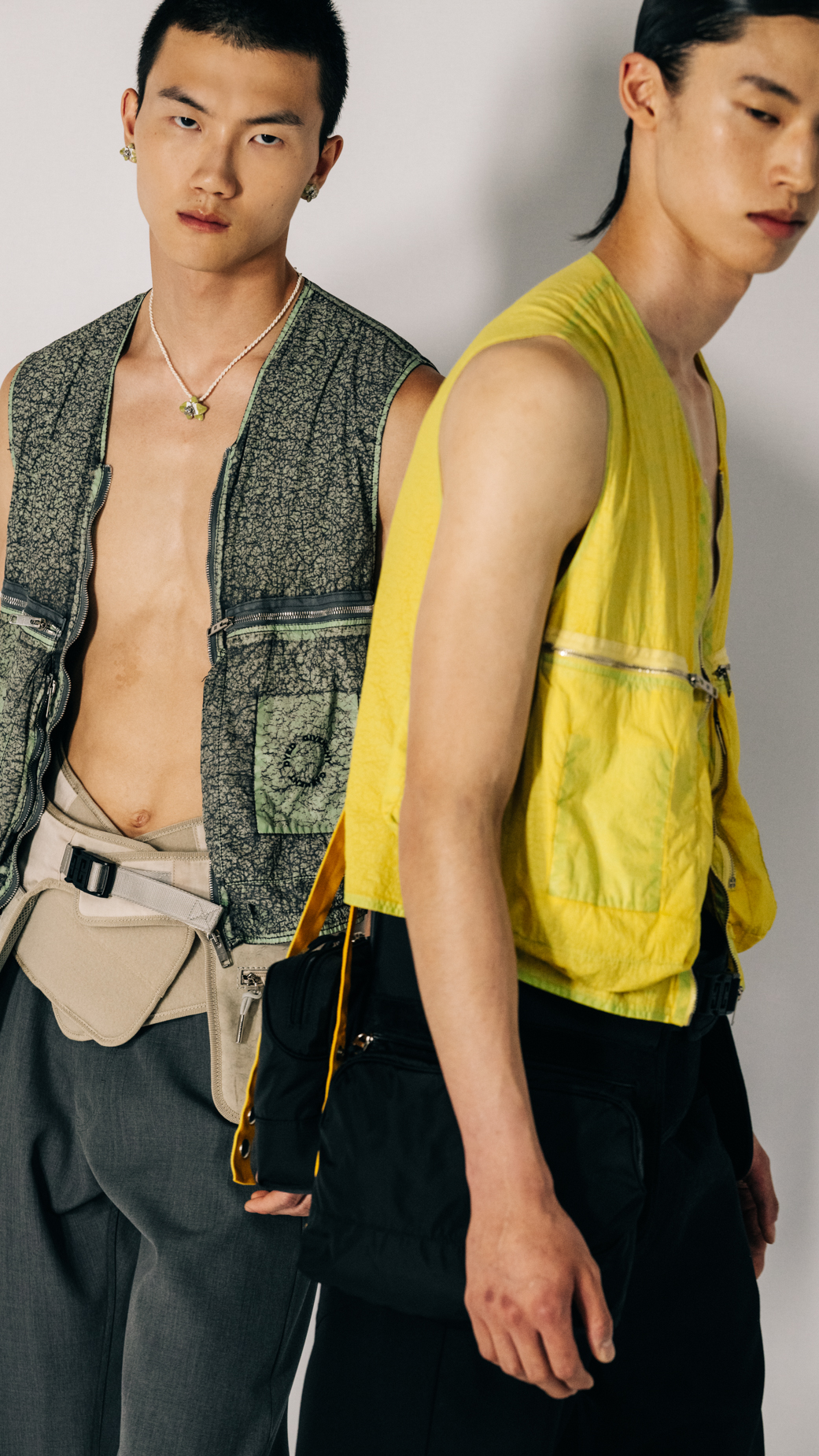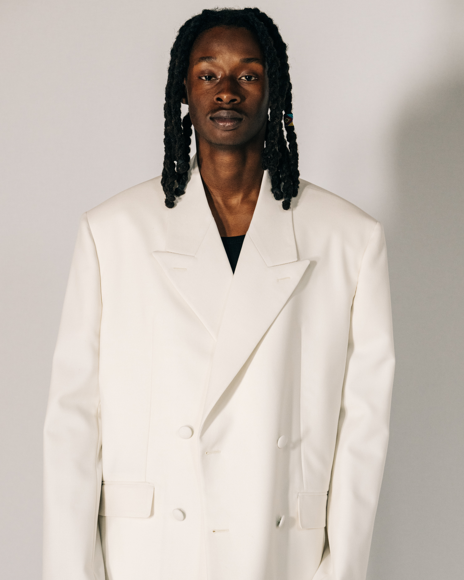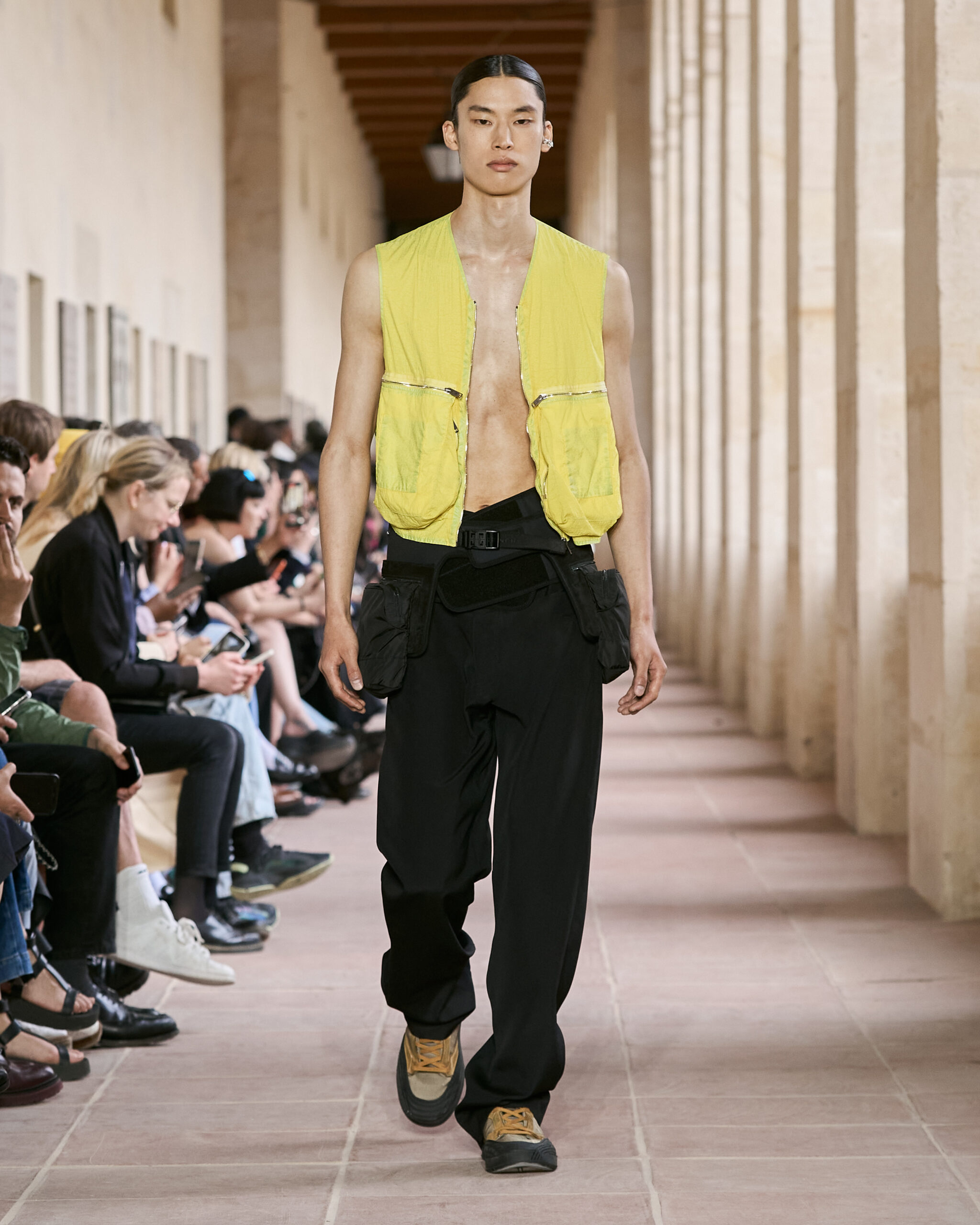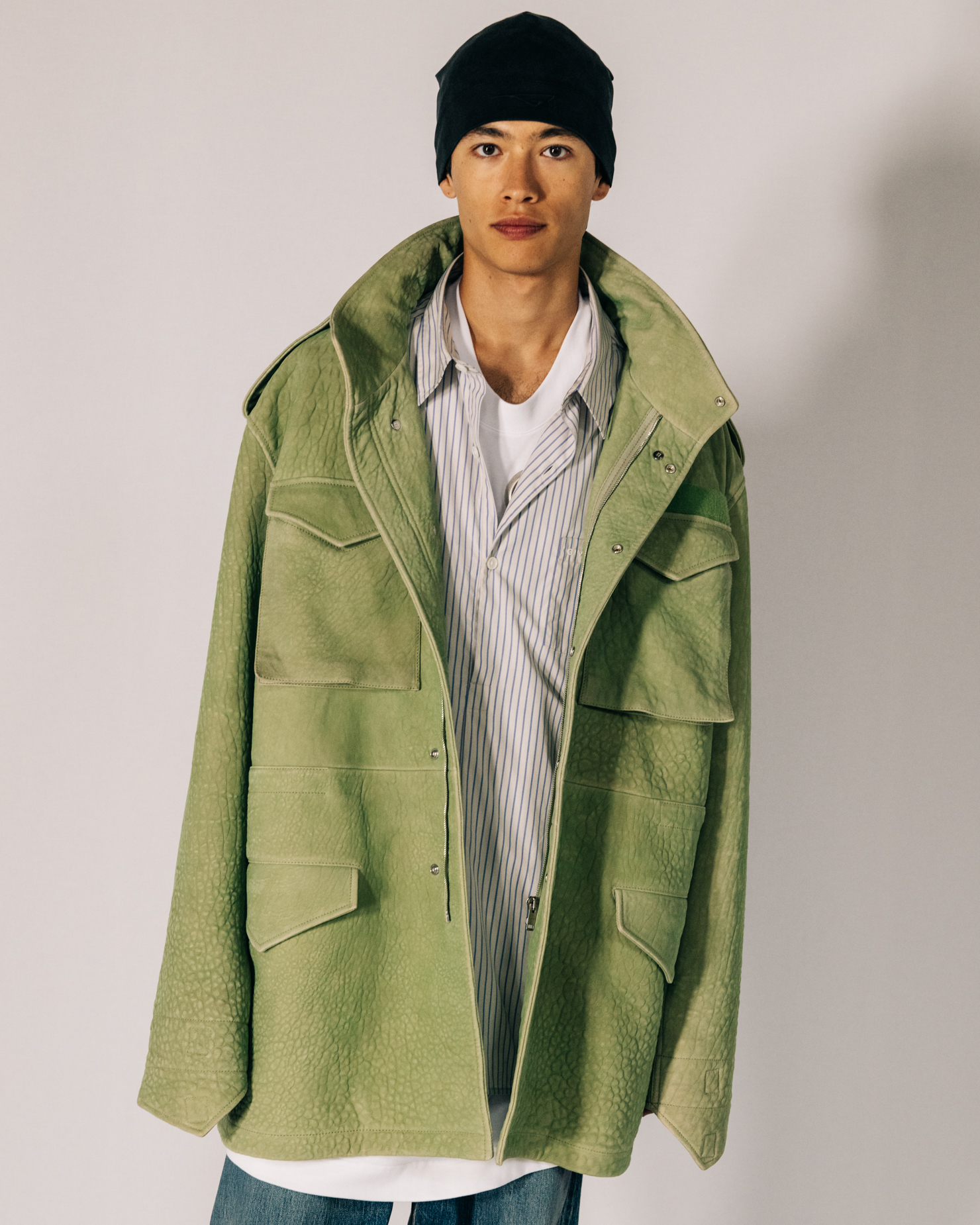 La silhouette évolue pour explorer les articles essentiels de la garde-robe, sublimés par des techniques de luxe. T-shirts longs, pièces en jersey, pantalons cargo larges et chinos surdimensionnés reflètent une idée de proportion réaliste. La texture, l’ajustement et le matériau se fusionnent pour créer une esthétique riche et multidimensionnelle, reflet d’une approche réfléchie de l’élégance masculine.