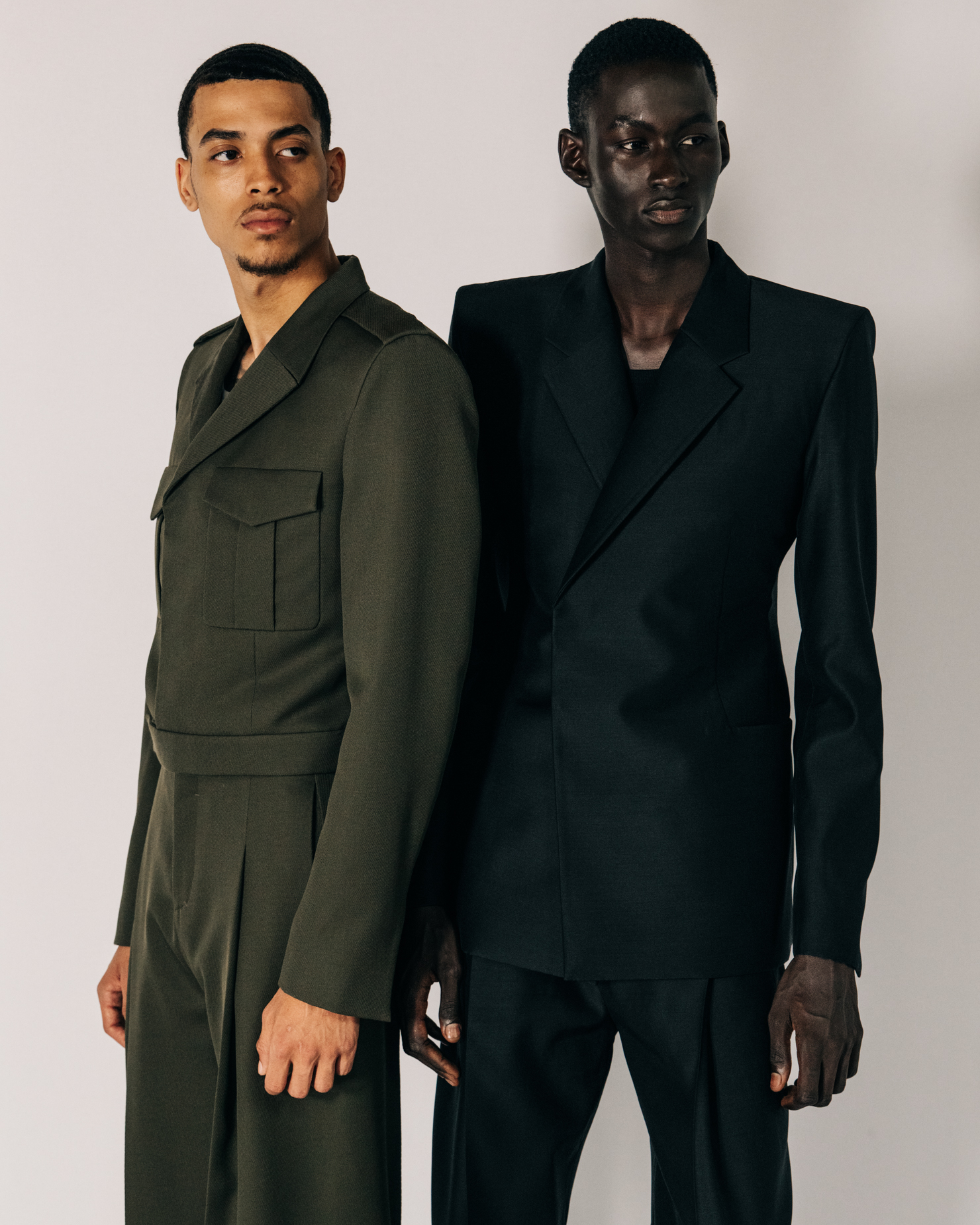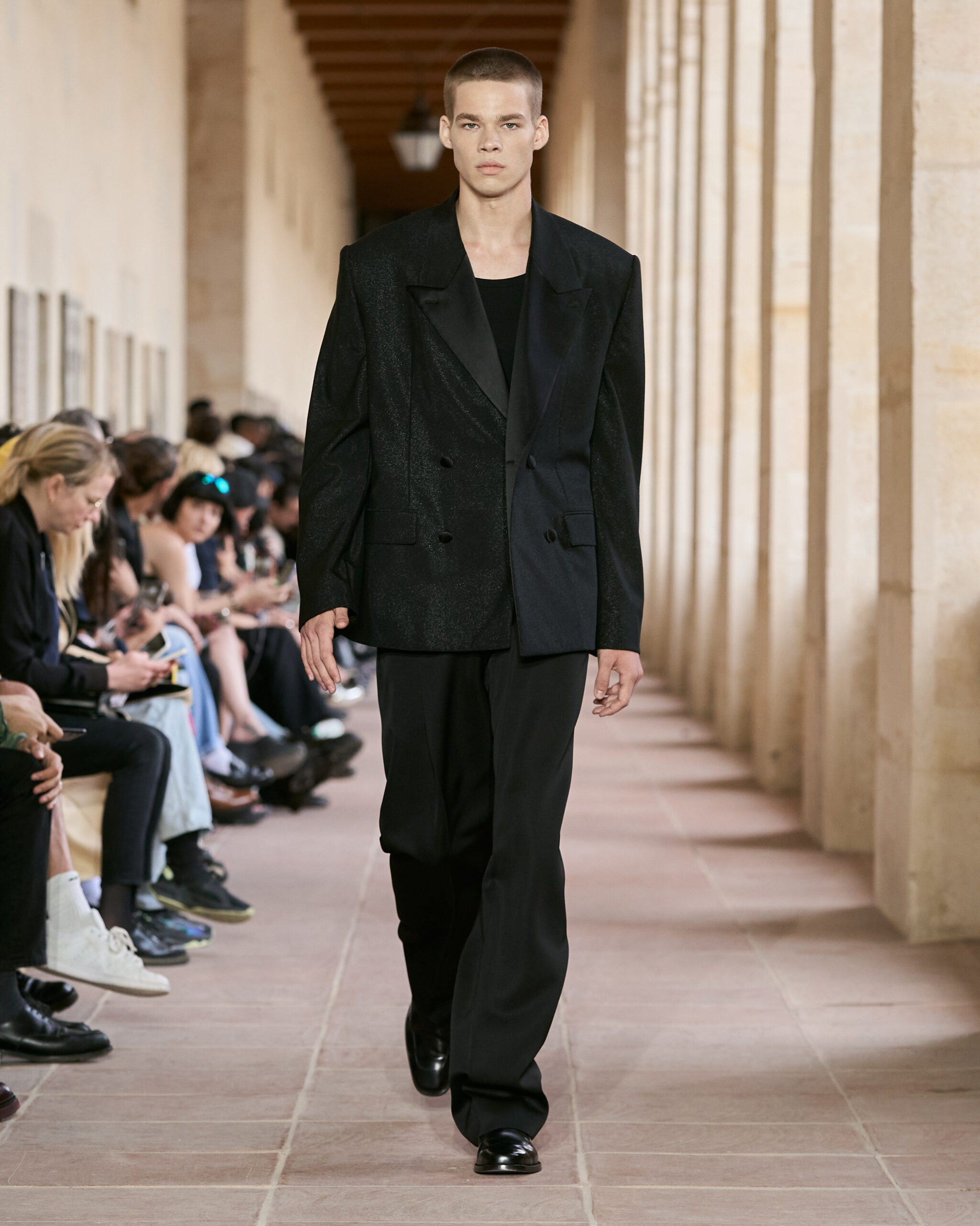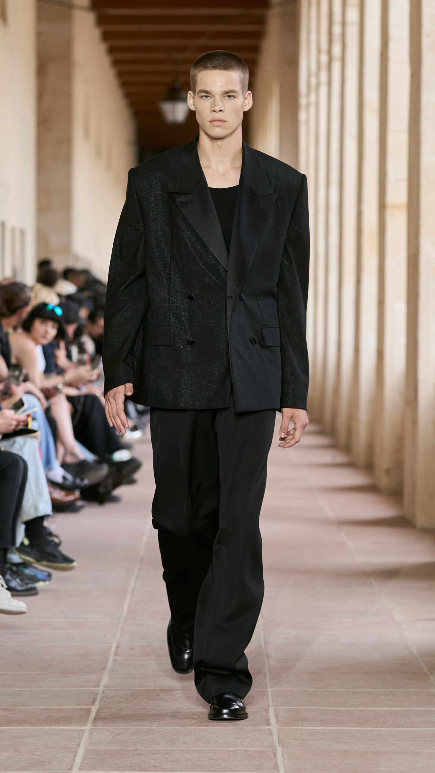 Les smokings en lurex ou en laine brossée témoignent d’une sophistication formative, ni surdimensionnée ni sculptée, avec une longueur légèrement allongée et des manches raccourcies. Ces détails sont appliqués à une veste militaire de haute couture taillée de manière complexe, imitant la texture de la pièce authentique qui l’a inspirée.