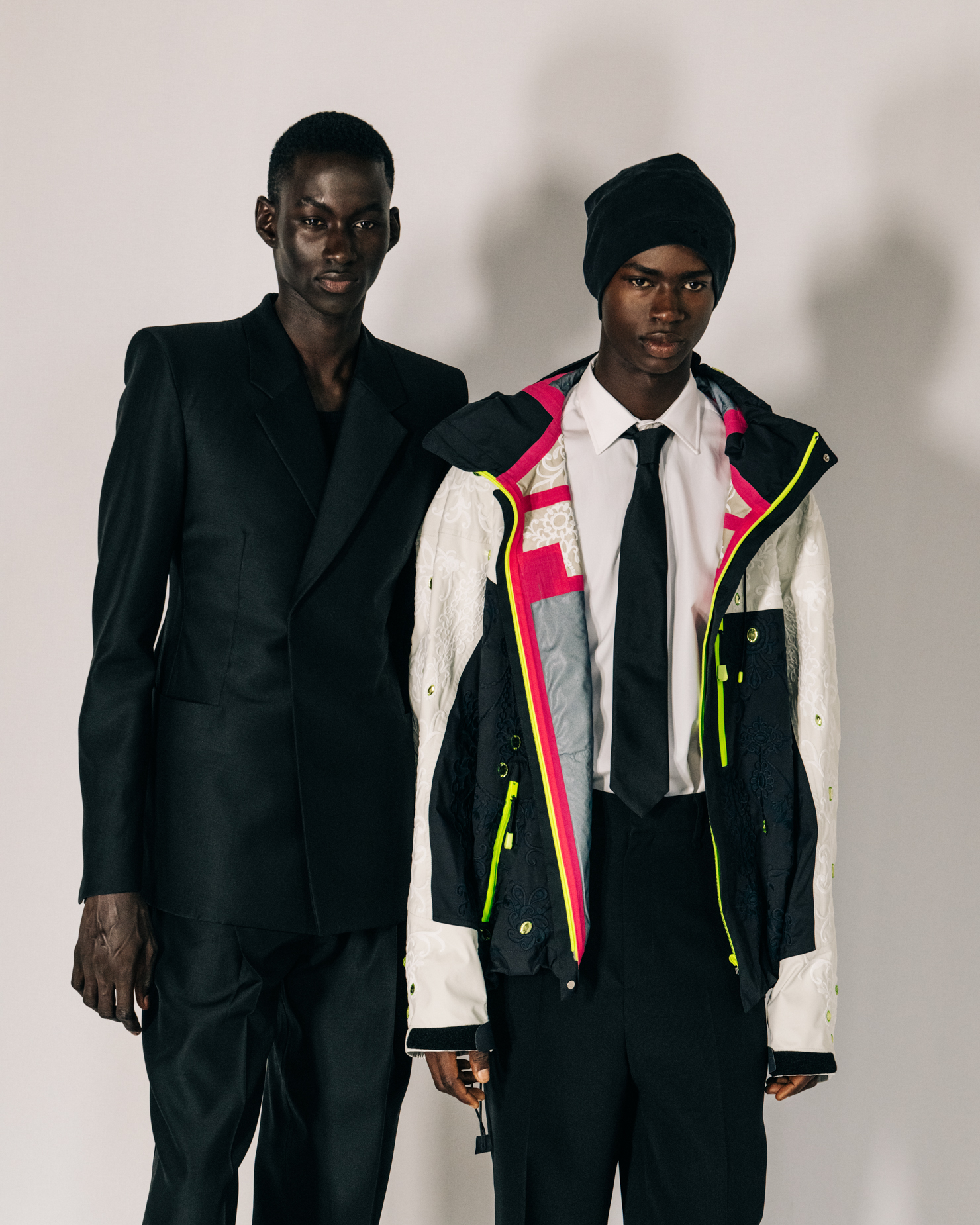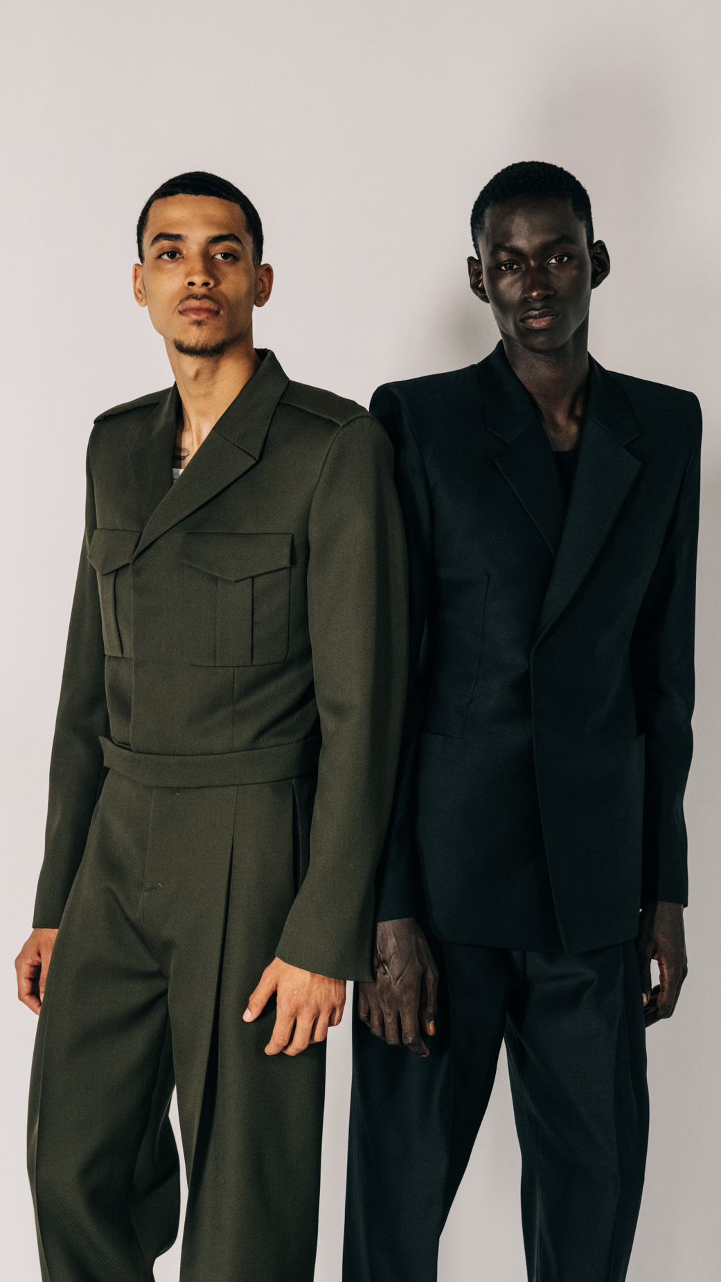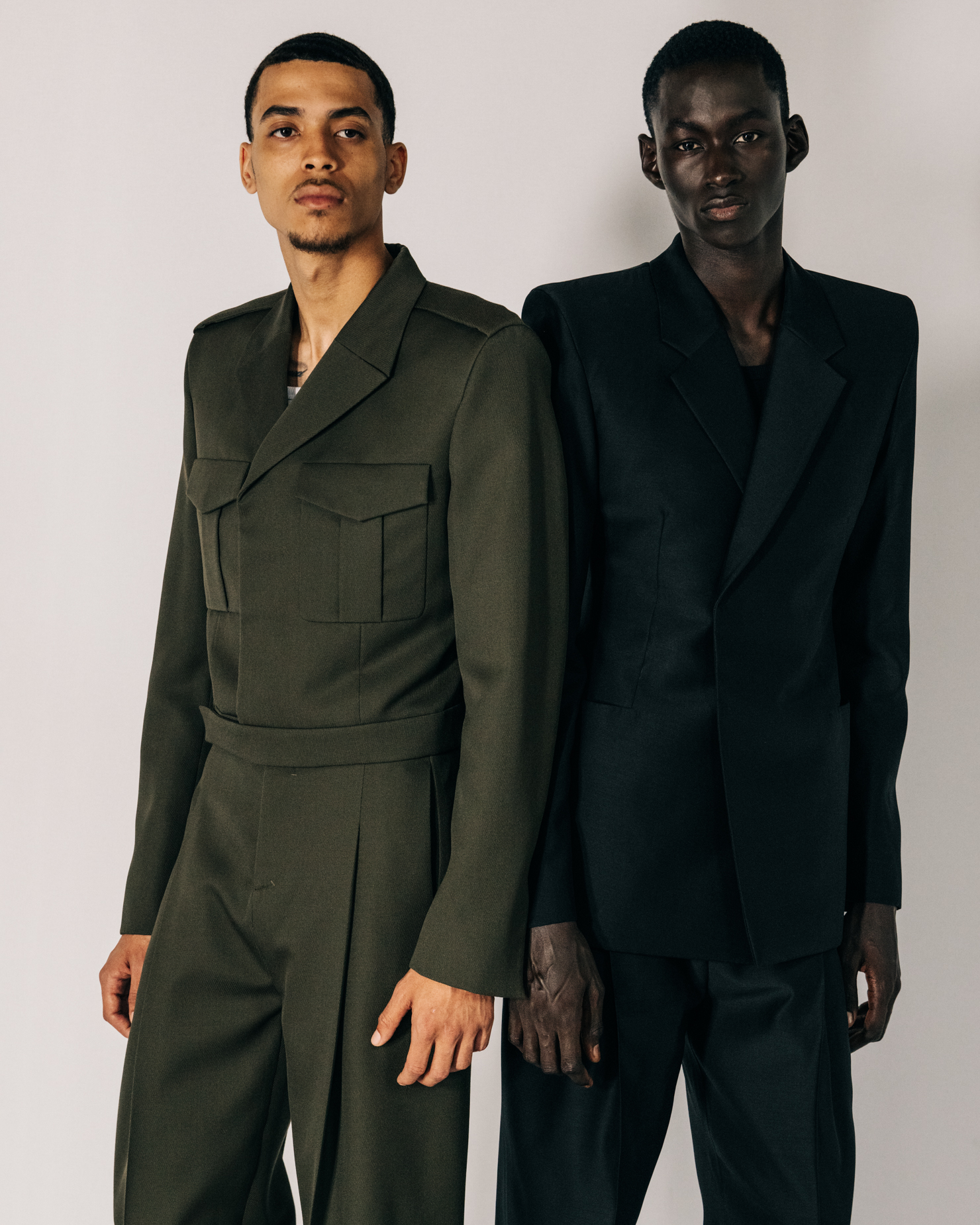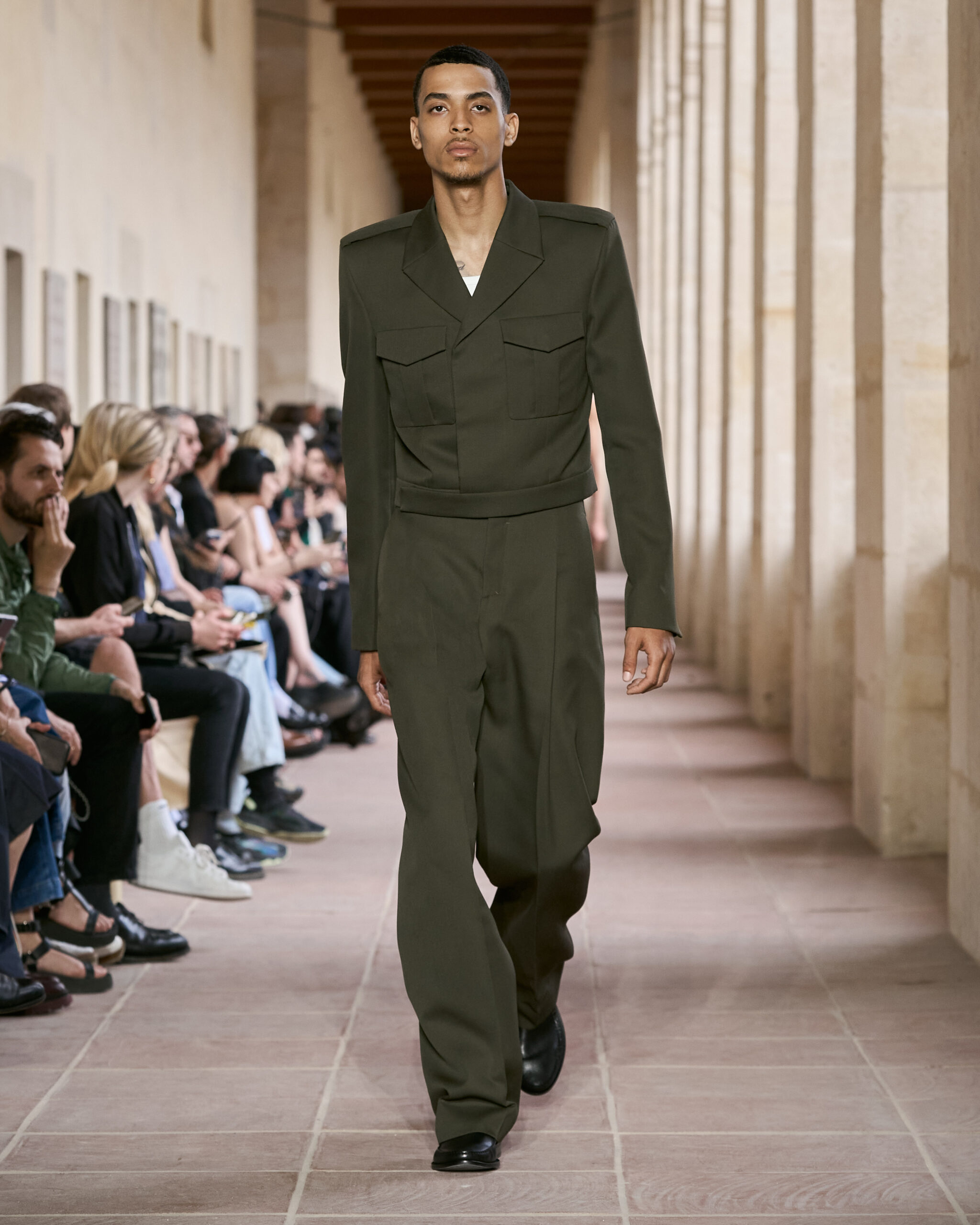 Les smokings en lurex ou en laine brossée témoignent d’une sophistication formative, ni surdimensionnée ni sculptée, avec une longueur légèrement allongée et des manches raccourcies. Ces détails sont appliqués à une veste militaire de haute couture taillée de manière complexe, imitant la texture de la pièce authentique qui l’a inspirée.