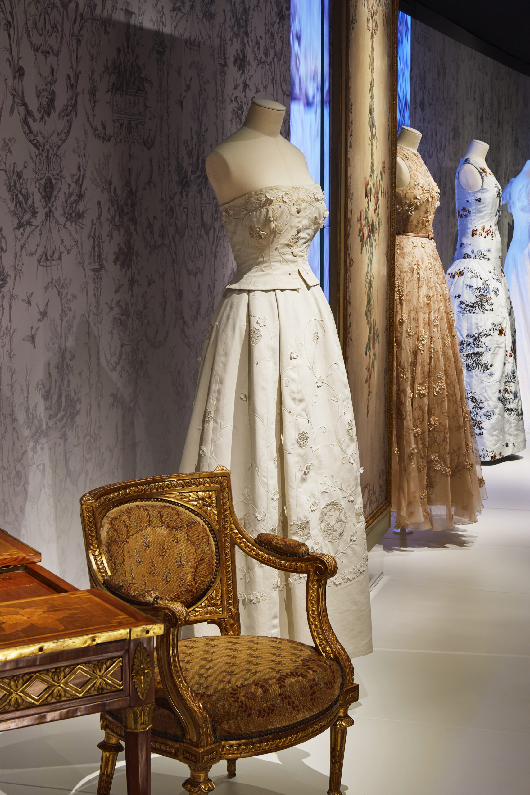 Christian Dior lui-même était fasciné par le siècle des Lumières. Cette passion se manifeste à travers une collection exquise d’objets, de photographies et de vêtements, dont la robe en tulle plissé et dentelle conçue par Maria Grazia Chiuri pour la série Marie-Antoinette.
