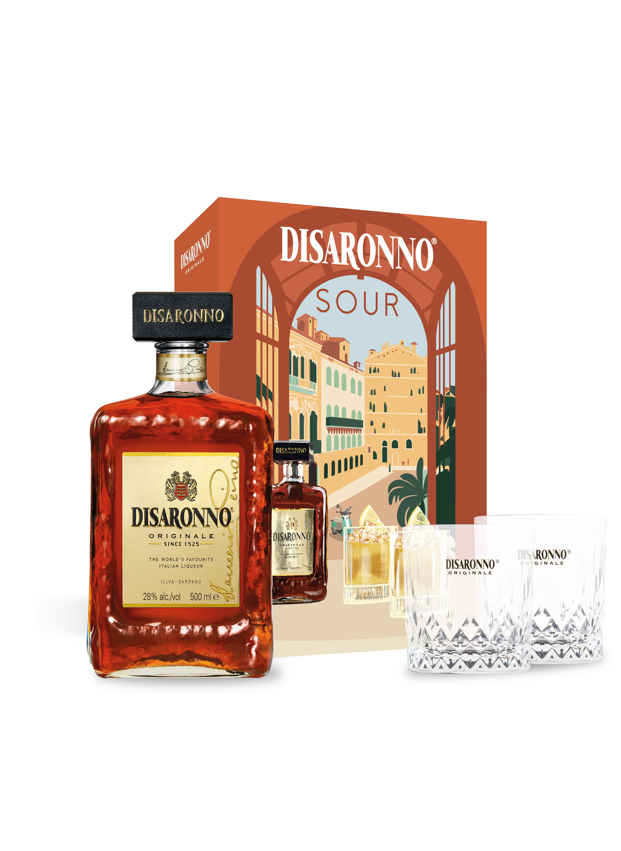 Un Coffret Coloré pour Noël Le Coffret Disaronno Sour, aux couleurs chaudes et inspirées de l’architecture italienne, contient une bouteille de 50cl de Disaronno Originale et deux verres type Old Fashioned. Le design du coffret reflète les nuances orangées de la liqueur, et une illustration au dos présente la recette du cocktail, invitant à la création.
