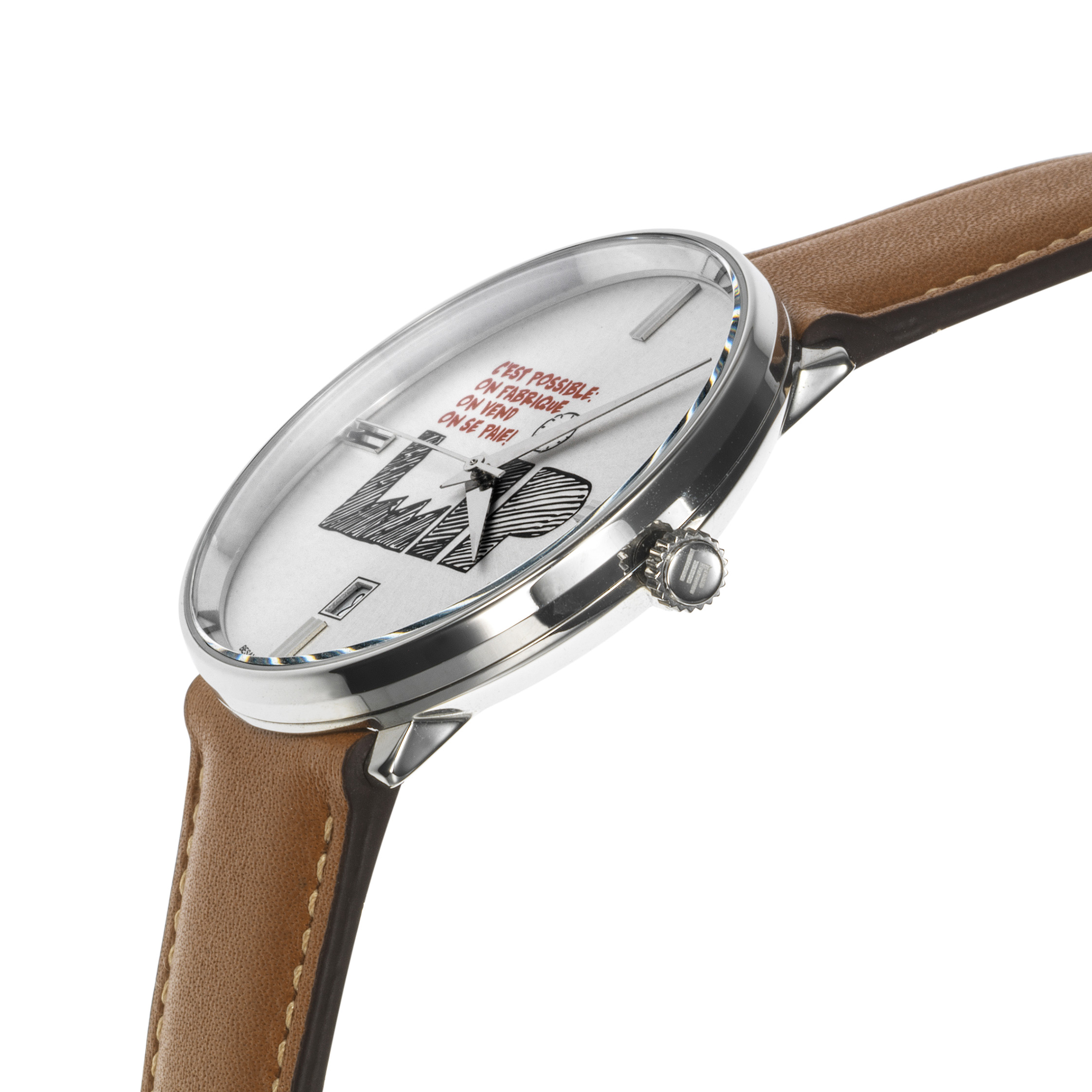 Dans cette optique de célébration et de revitalisation, LIP dévoile une montre en édition limitée à 1 973 exemplaires, rappelant à la fois l’année emblématique et la volonté farouche des employés. Sur son cadran est gravée la phrase : « C’EST POSSIBLE: ON FABRIQUE, ON VEND, ON SE PAIE ! », un slogan devenu célèbre et qui incarne l’esprit résilient des employés de LIP.