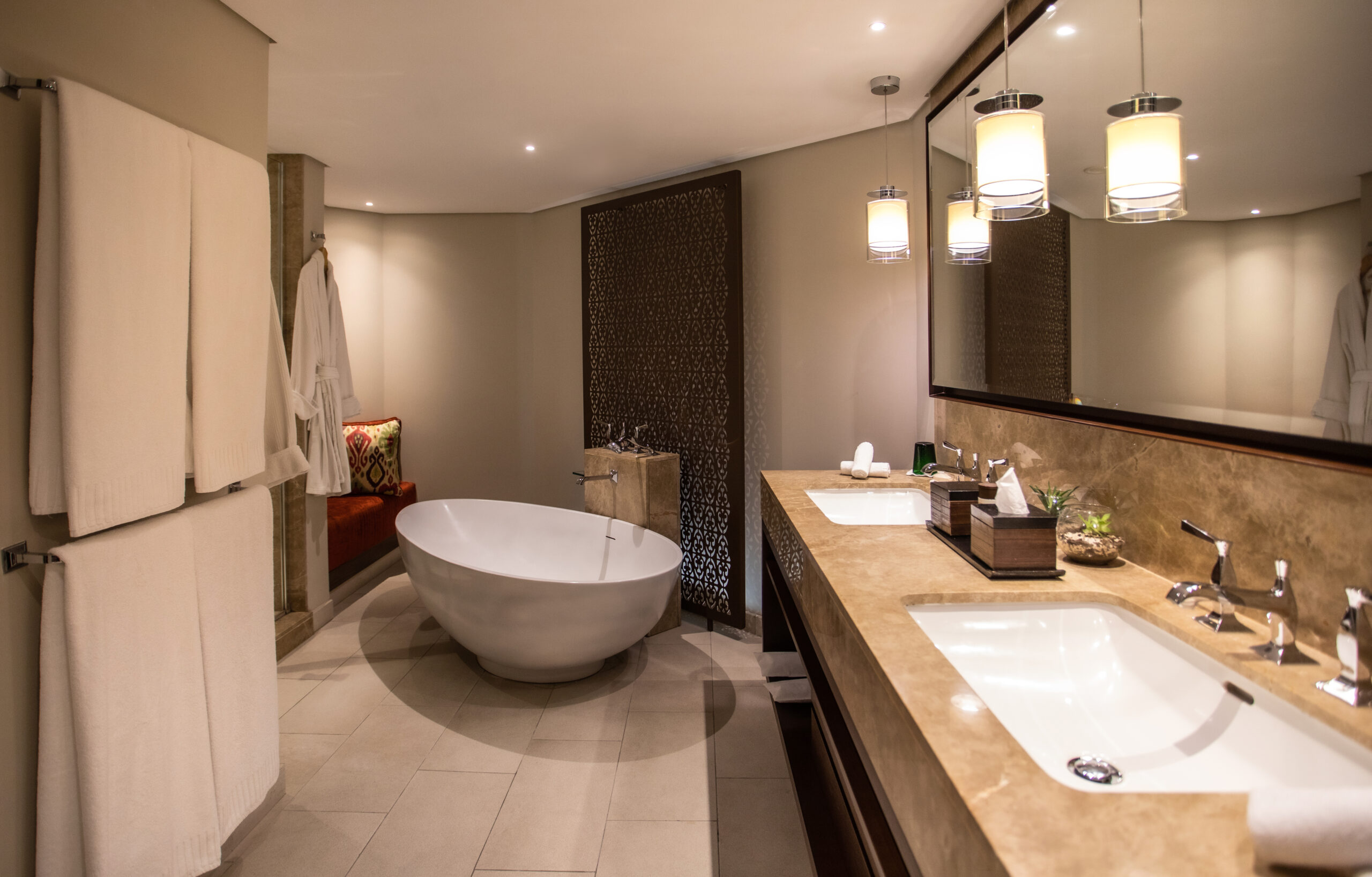 Les suites s’ouvrent toutes sur un patio tropical, invitant à la contemplation. Cet écrin de sérénité permet de se sentir « comme à la maison » à l’autre bout du monde. Les photographies en noir et blanc et aquarelles locales ajoutent une touche d’authenticité à ce décor inspiré par la nature environnante.