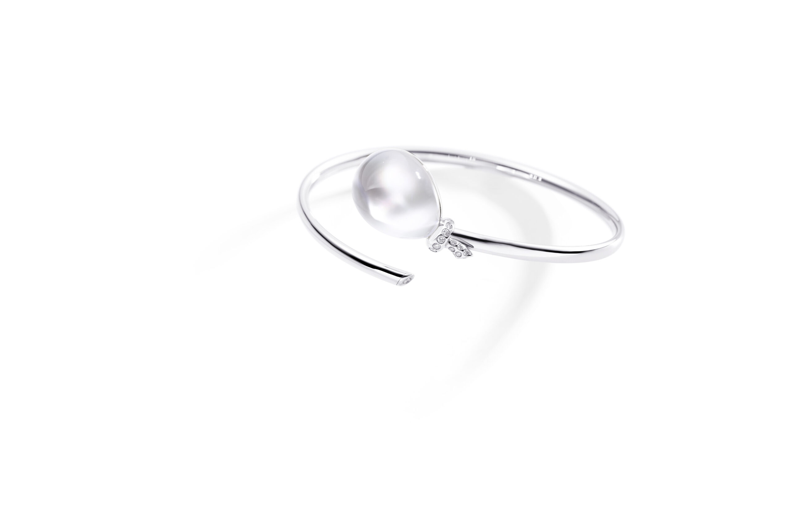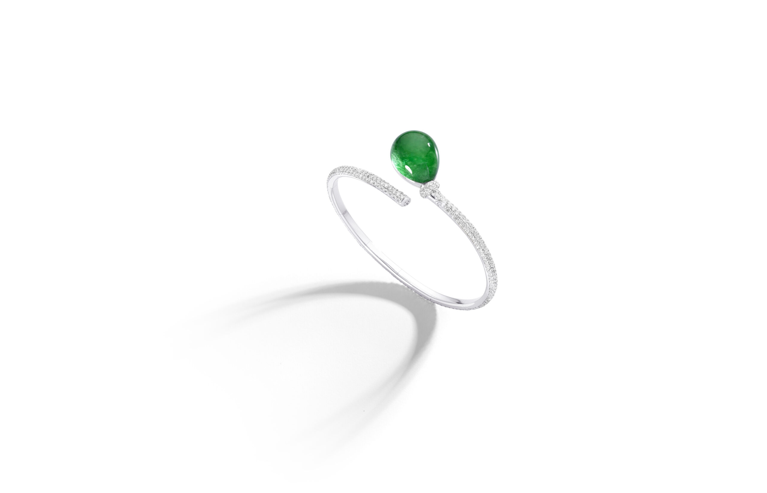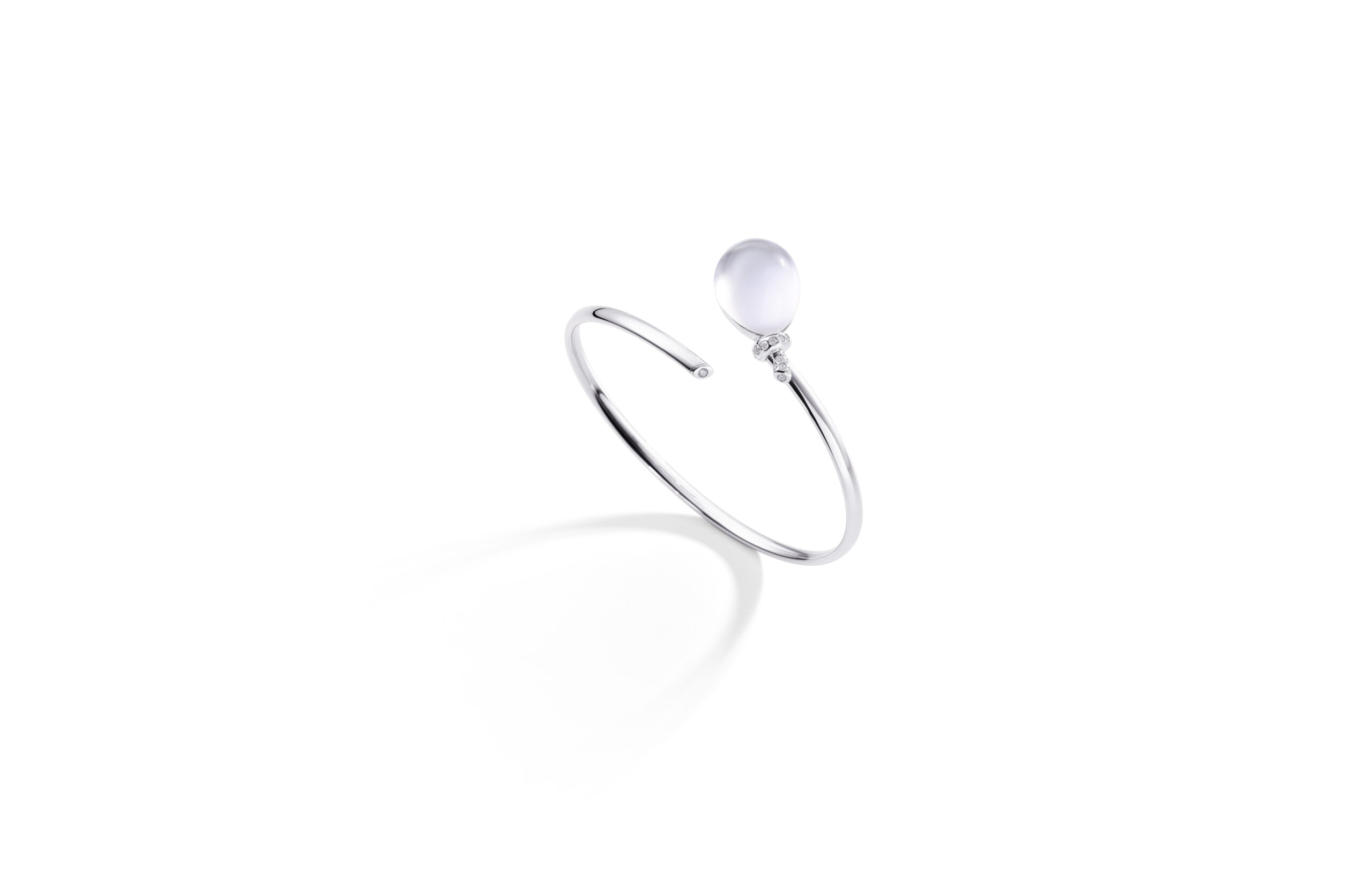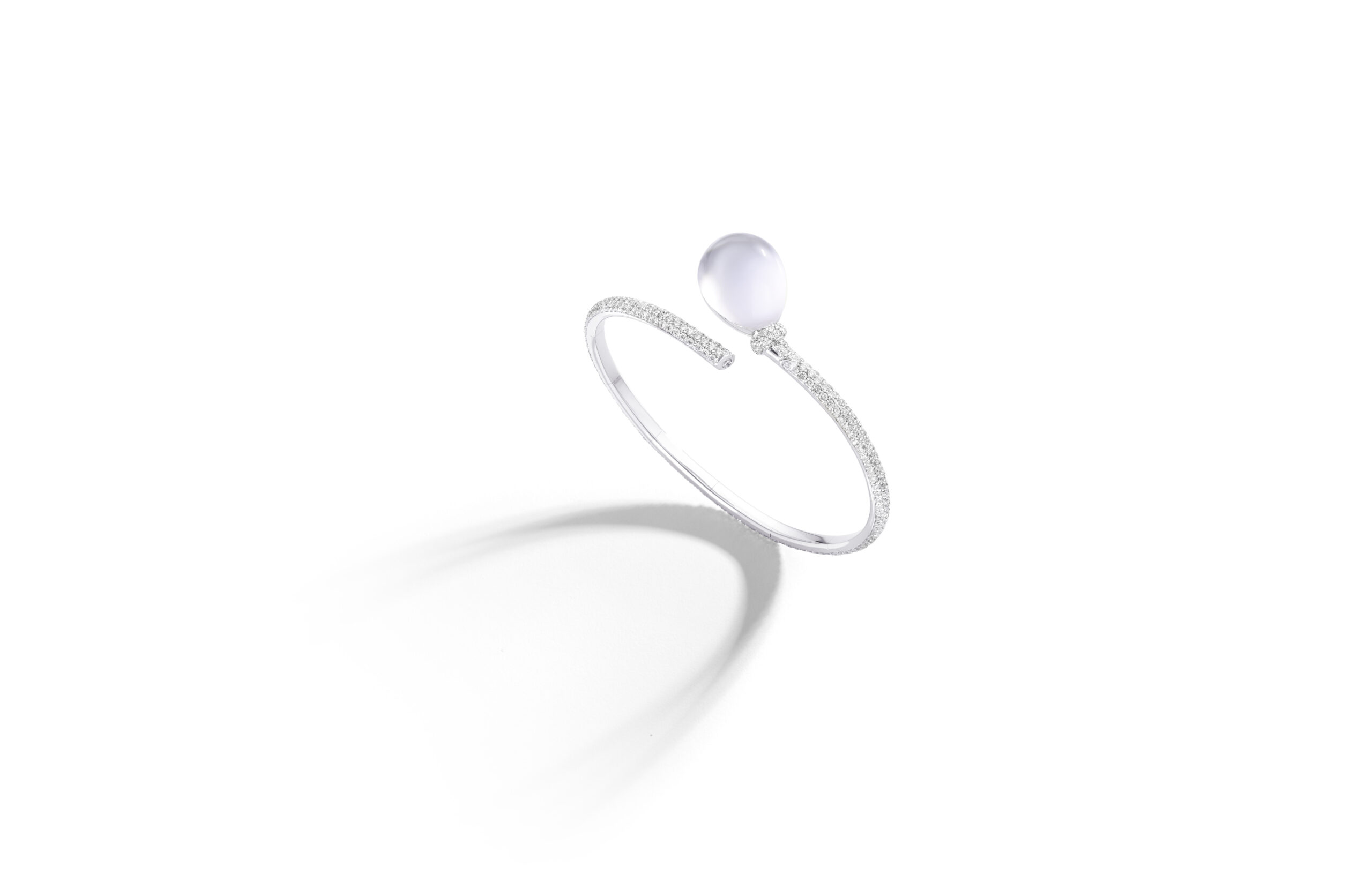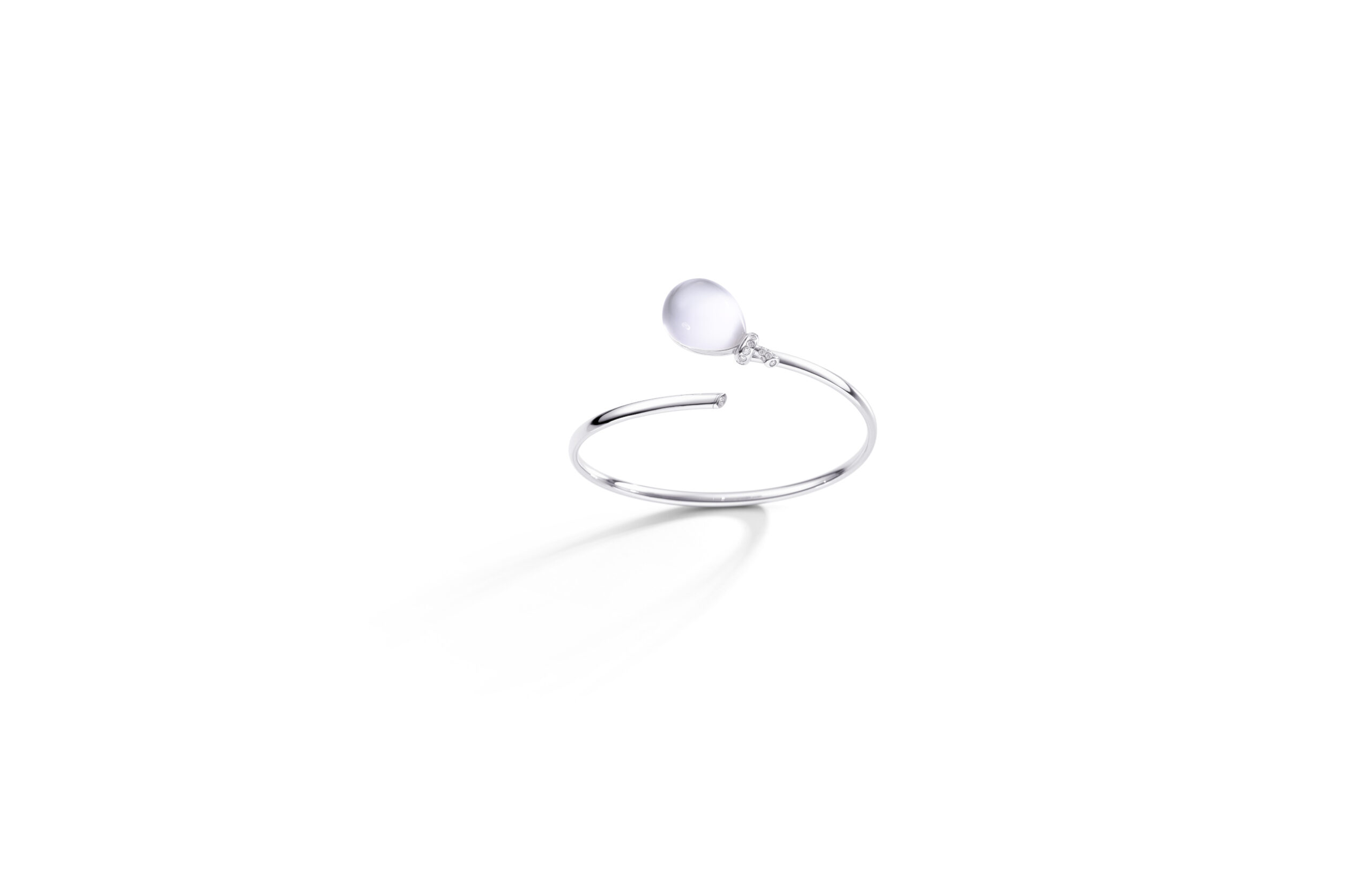 Les bracelets Palloncino arborent le motif signature de la collection : un nœud en or blanc pavé de diamants blancs. Ils sont ornés de pierres semi-précieuses colorées associées à du cristal de roche, selon la technique « Trasparenze » propre à Vhernier.