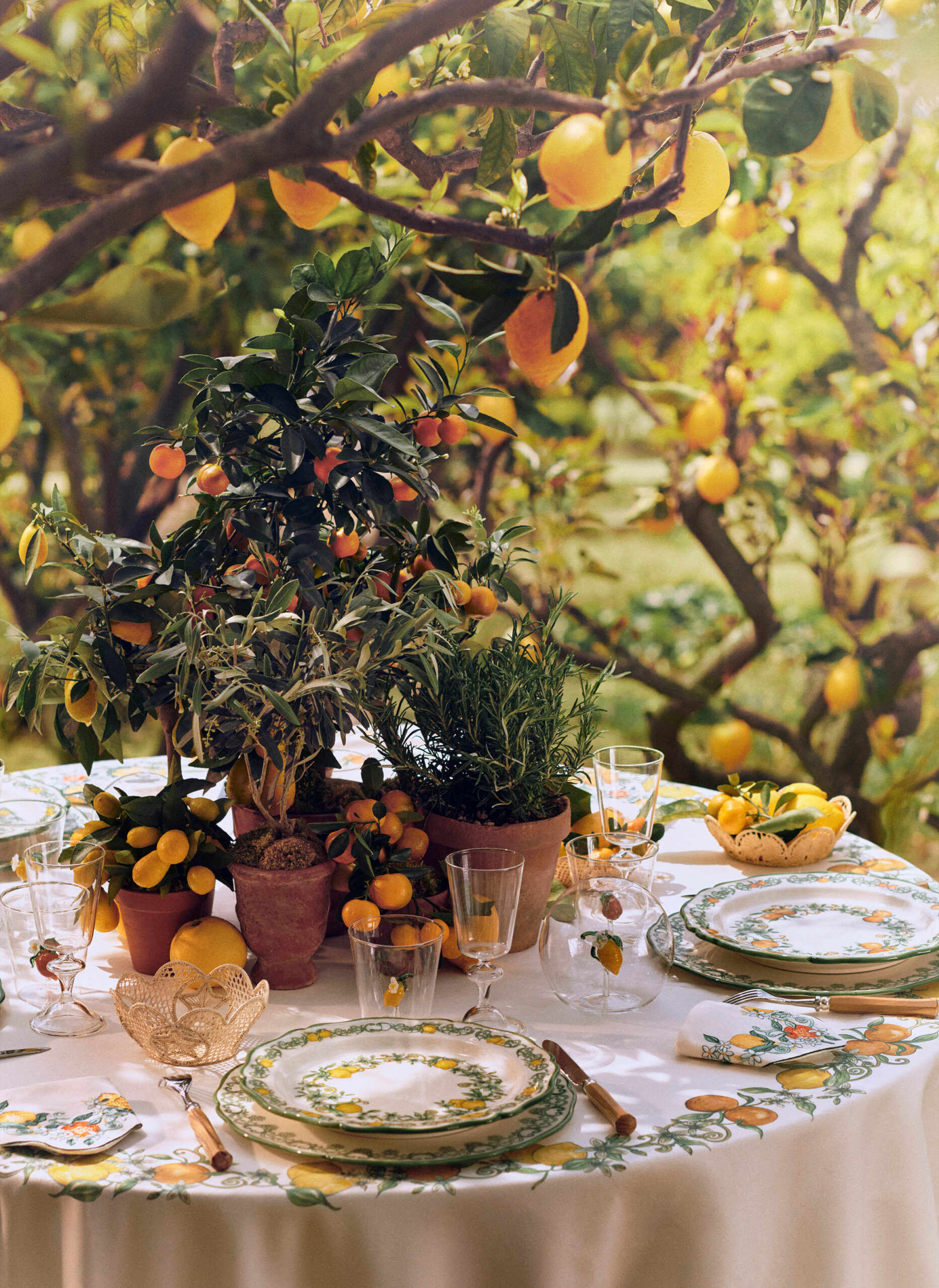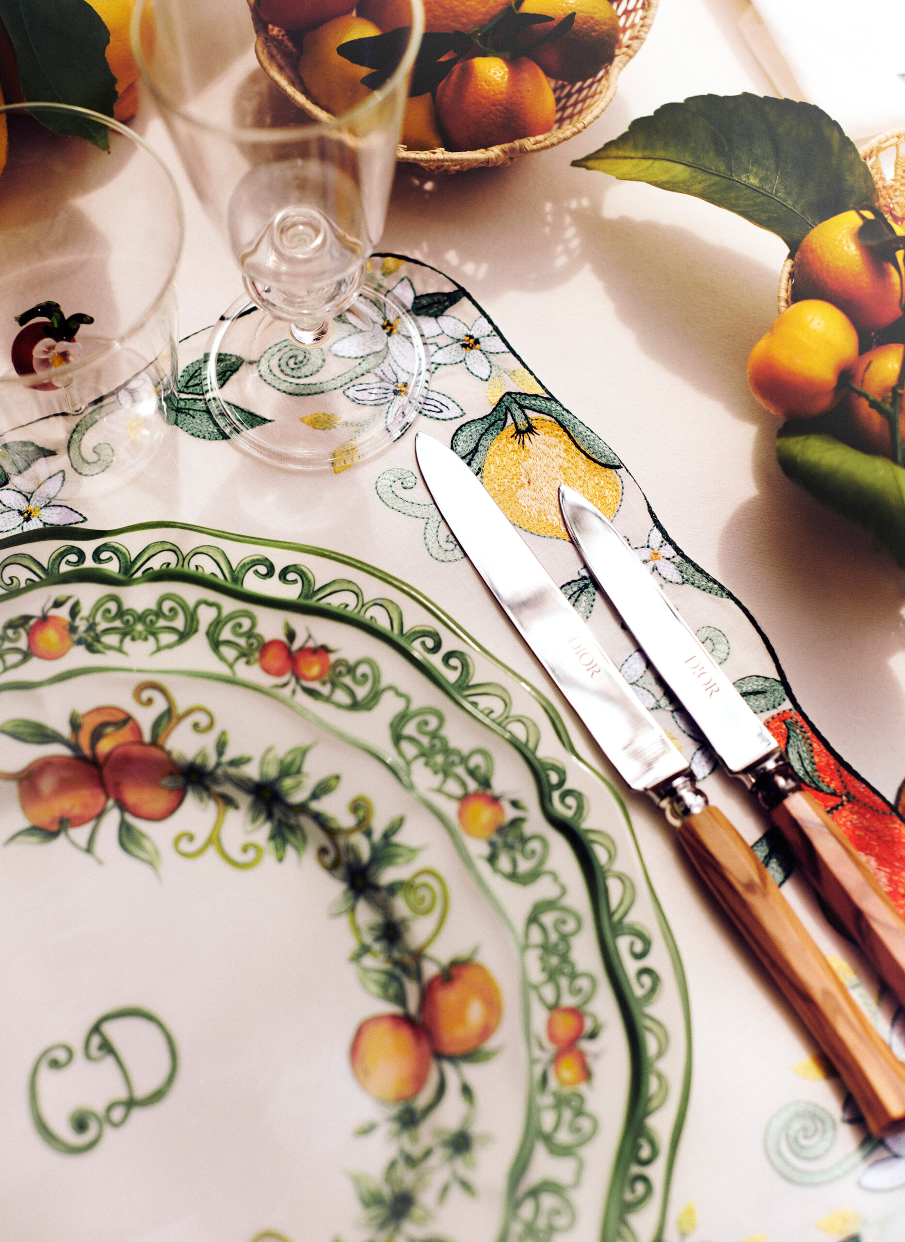 La collection Sole di Sicilia célèbre la passion du couturier-fondateur Christian Dior pour la nature et la botanique. Elle est composée de pièces aux nuances acidulées sur le thème des agrumes, comme des assiettes en faïence décorées d’esquisses de citrons et d’oranges, un plat de présentation orné d’un élégant motif végétal, des verres intérieurs et des bulles décoratives, et un set et une serviette en lin brodé.