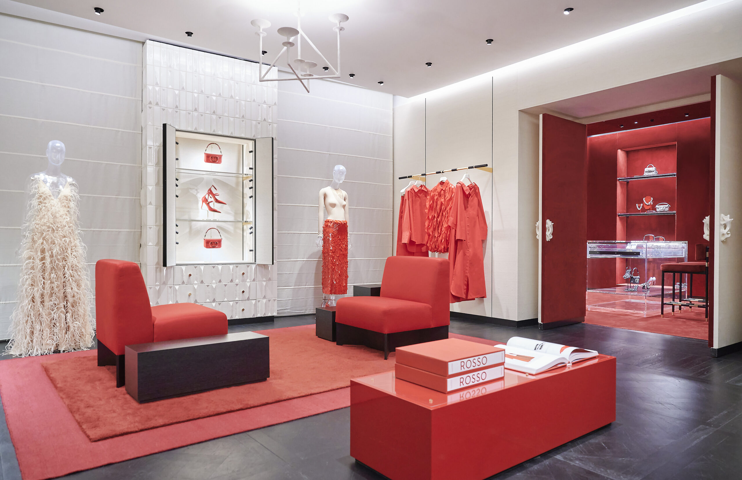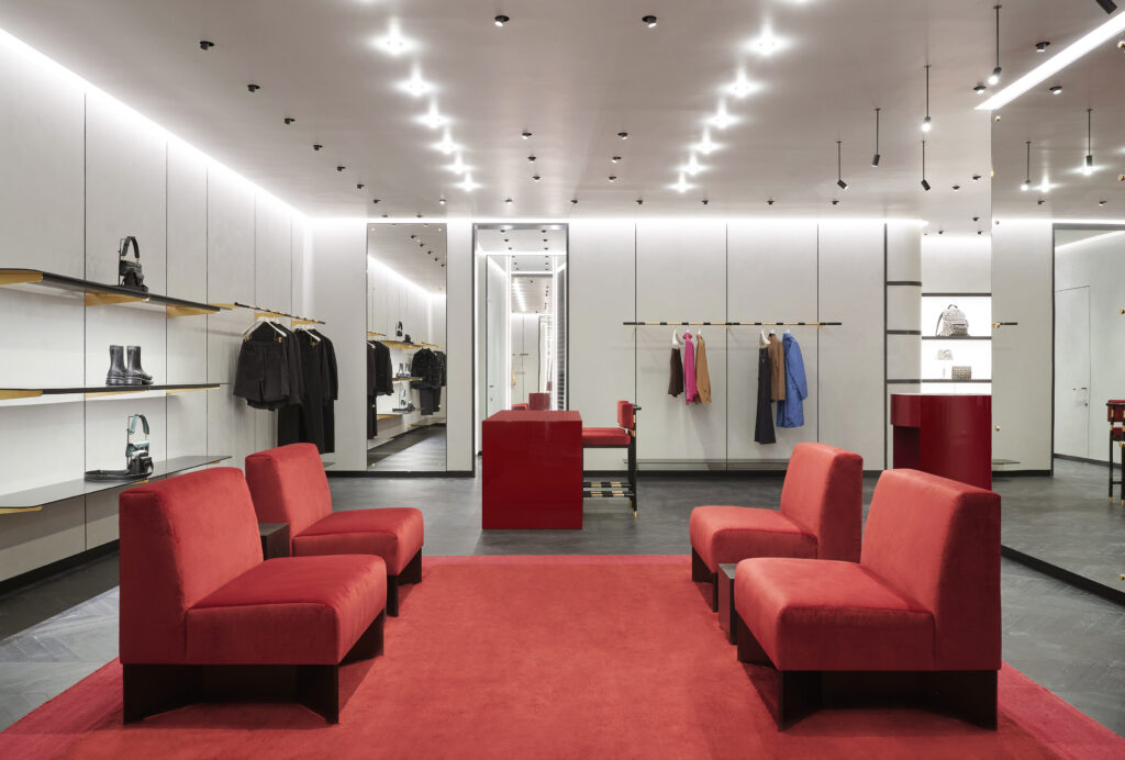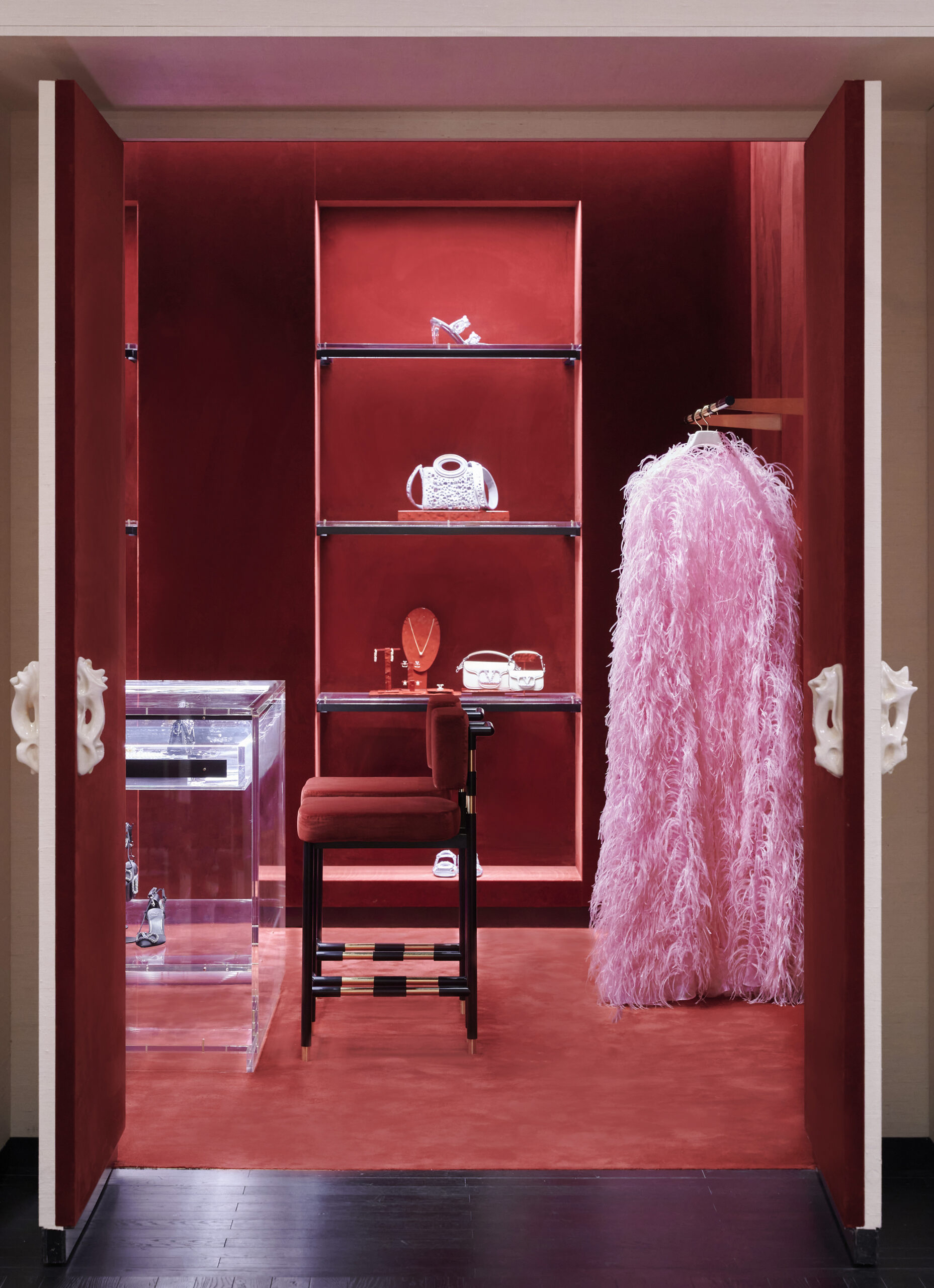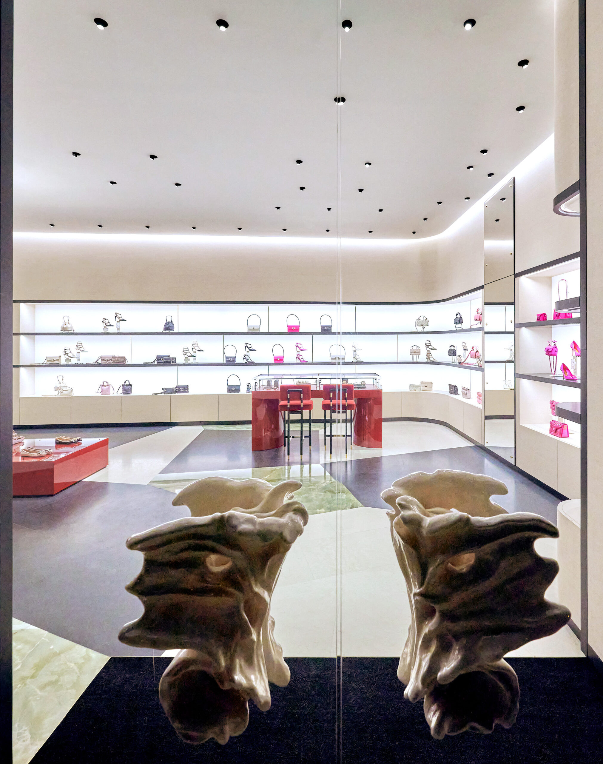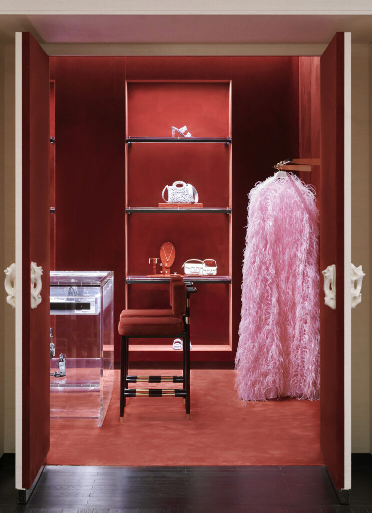 Le rouge, signature emblématique de la maison, imprègne chaque recoin, s’exprimant sous des formes variées, du laqué au velouté. Cet éclat vermillon se contraste parfaitement avec des tons d’ivoire, offrant une danse visuelle évoquant les années 1930 à 1970. Mais les racines romaines de la marque ne sont jamais loin, avec des touches de marbre, d’onyx et de géométries métaphysiques qui rappellent son héritage.