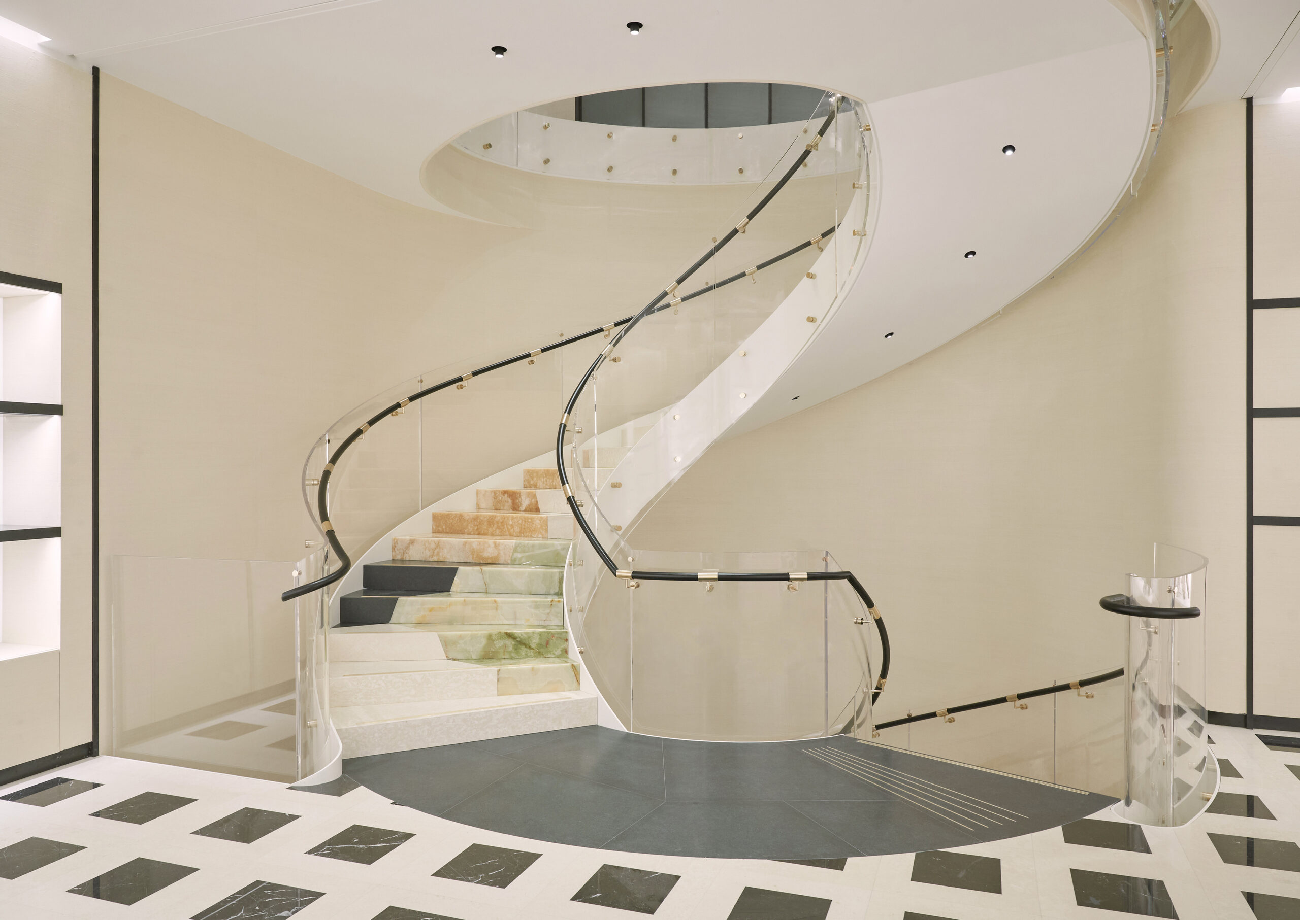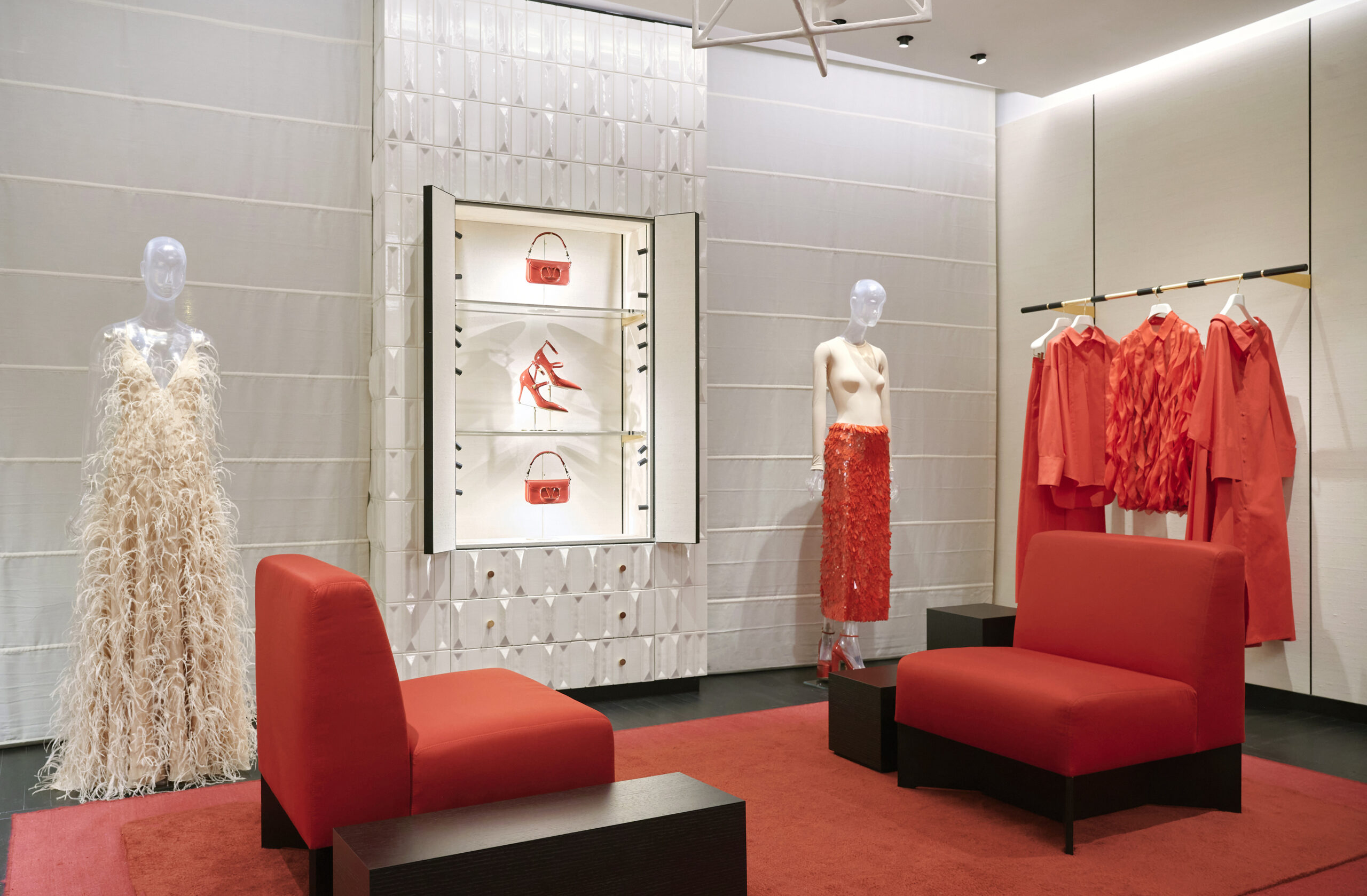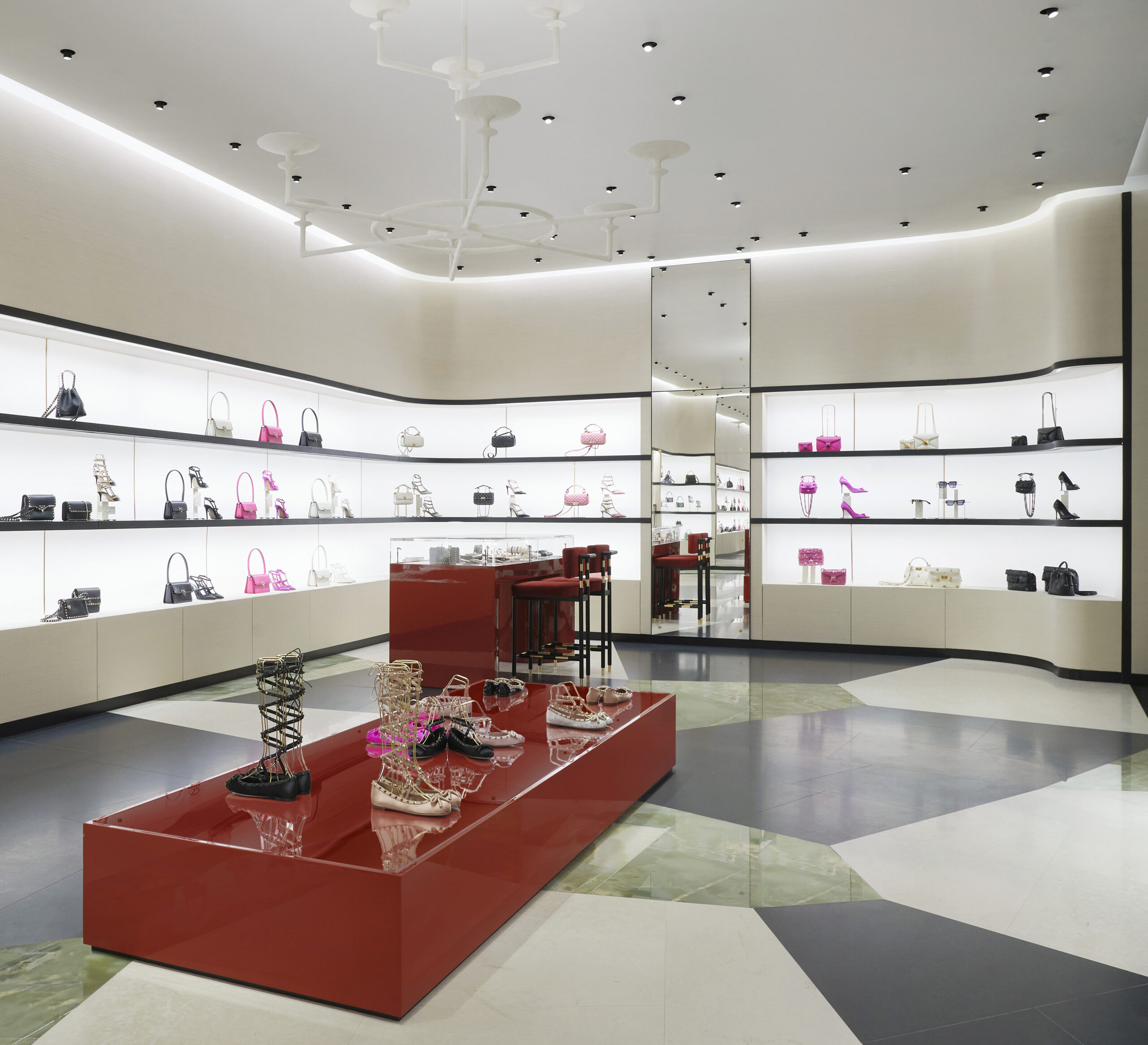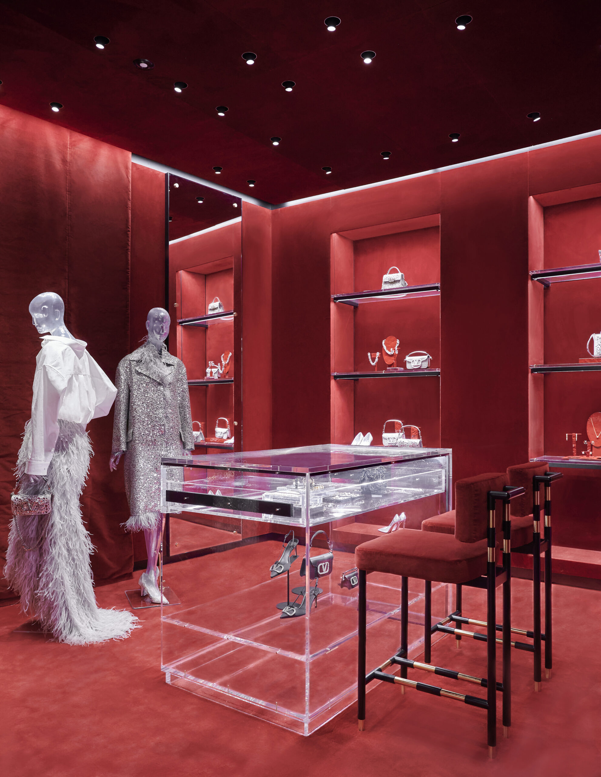 Le rouge, signature emblématique de la maison, imprègne chaque recoin, s’exprimant sous des formes variées, du laqué au velouté. Cet éclat vermillon se contraste parfaitement avec des tons d’ivoire, offrant une danse visuelle évoquant les années 1930 à 1970. Mais les racines romaines de la marque ne sont jamais loin, avec des touches de marbre, d’onyx et de géométries métaphysiques qui rappellent son héritage.