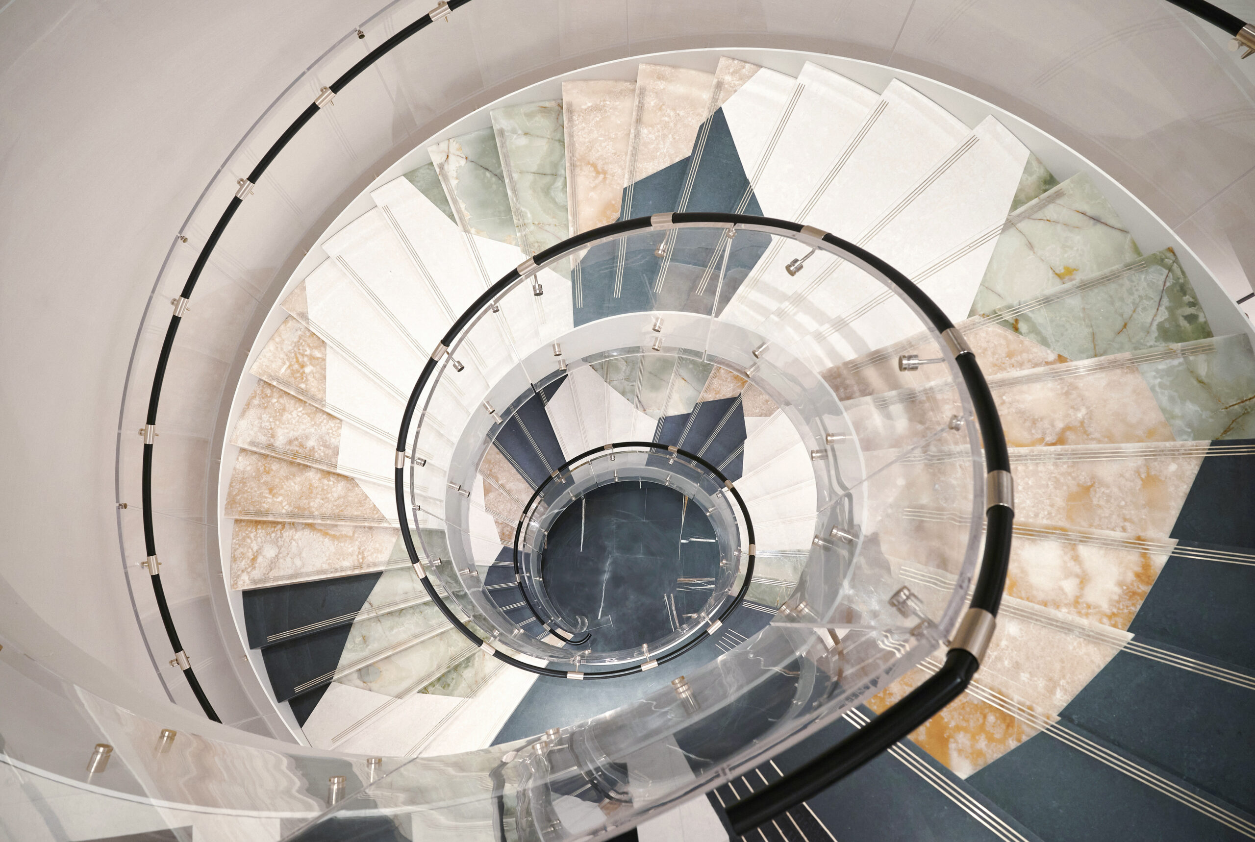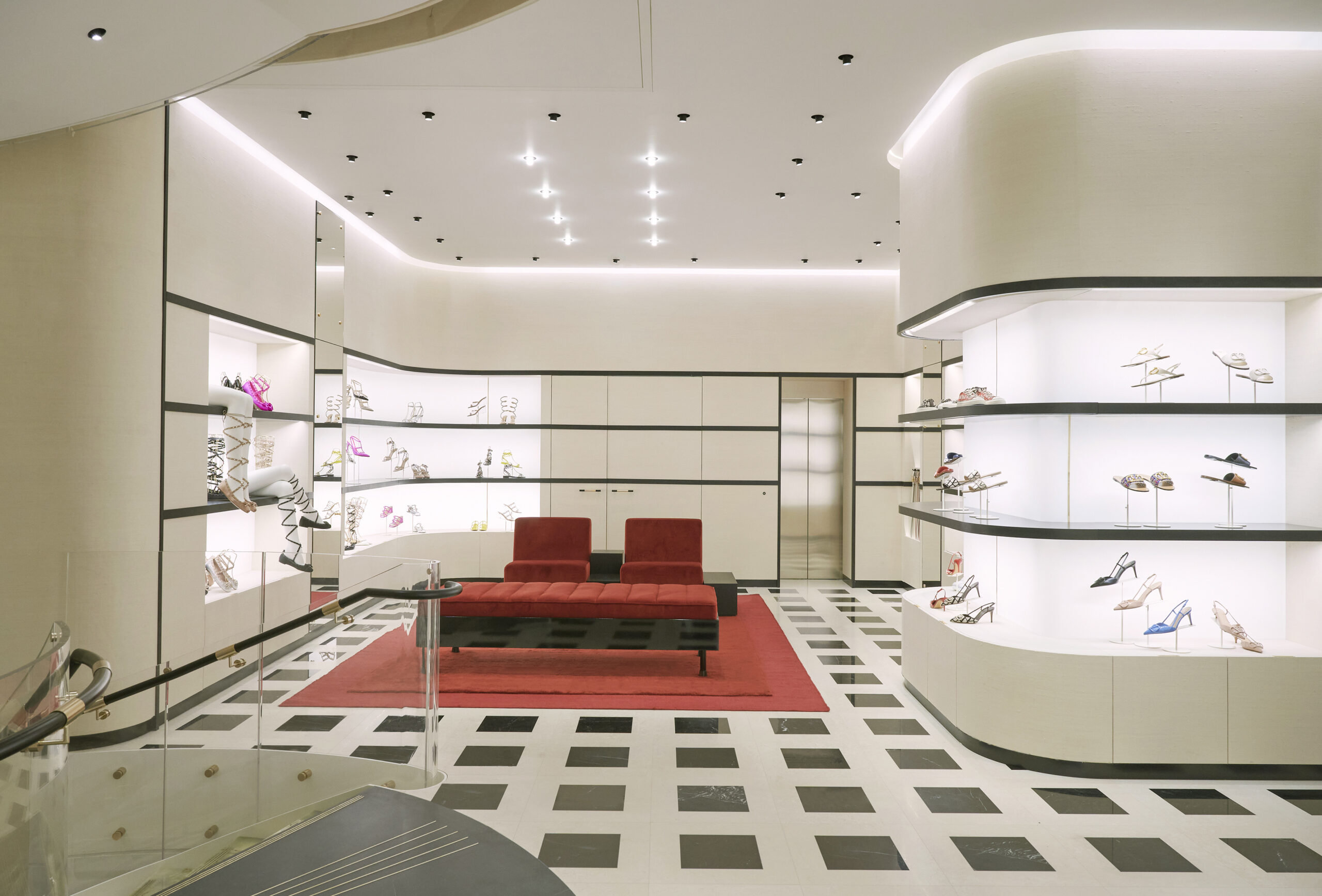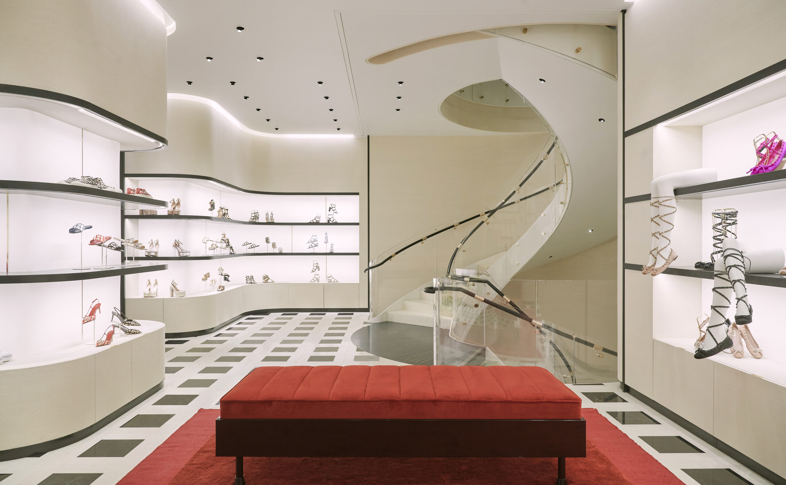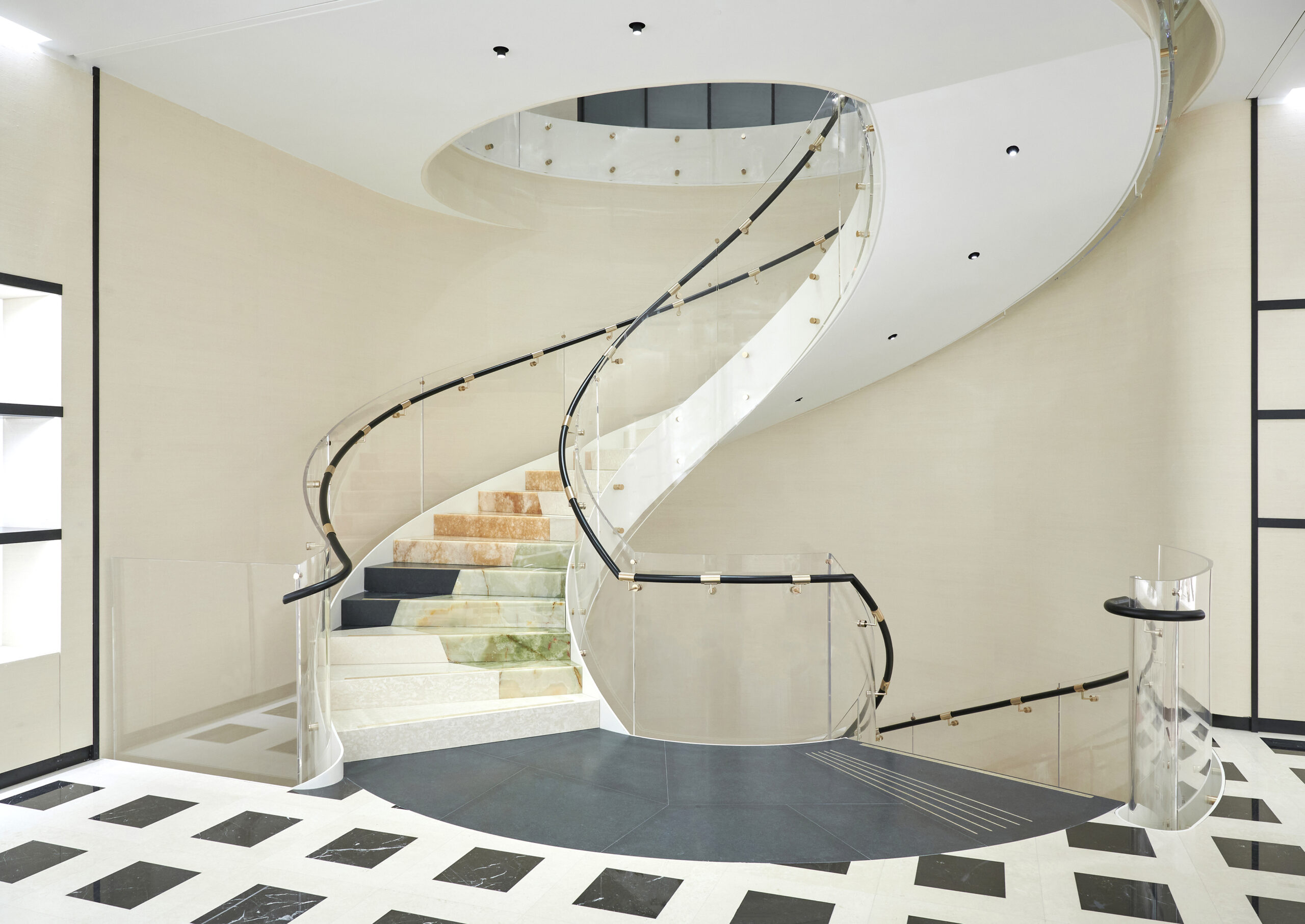 Le rouge, signature emblématique de la maison, imprègne chaque recoin, s’exprimant sous des formes variées, du laqué au velouté. Cet éclat vermillon se contraste parfaitement avec des tons d’ivoire, offrant une danse visuelle évoquant les années 1930 à 1970. Mais les racines romaines de la marque ne sont jamais loin, avec des touches de marbre, d’onyx et de géométries métaphysiques qui rappellent son héritage.