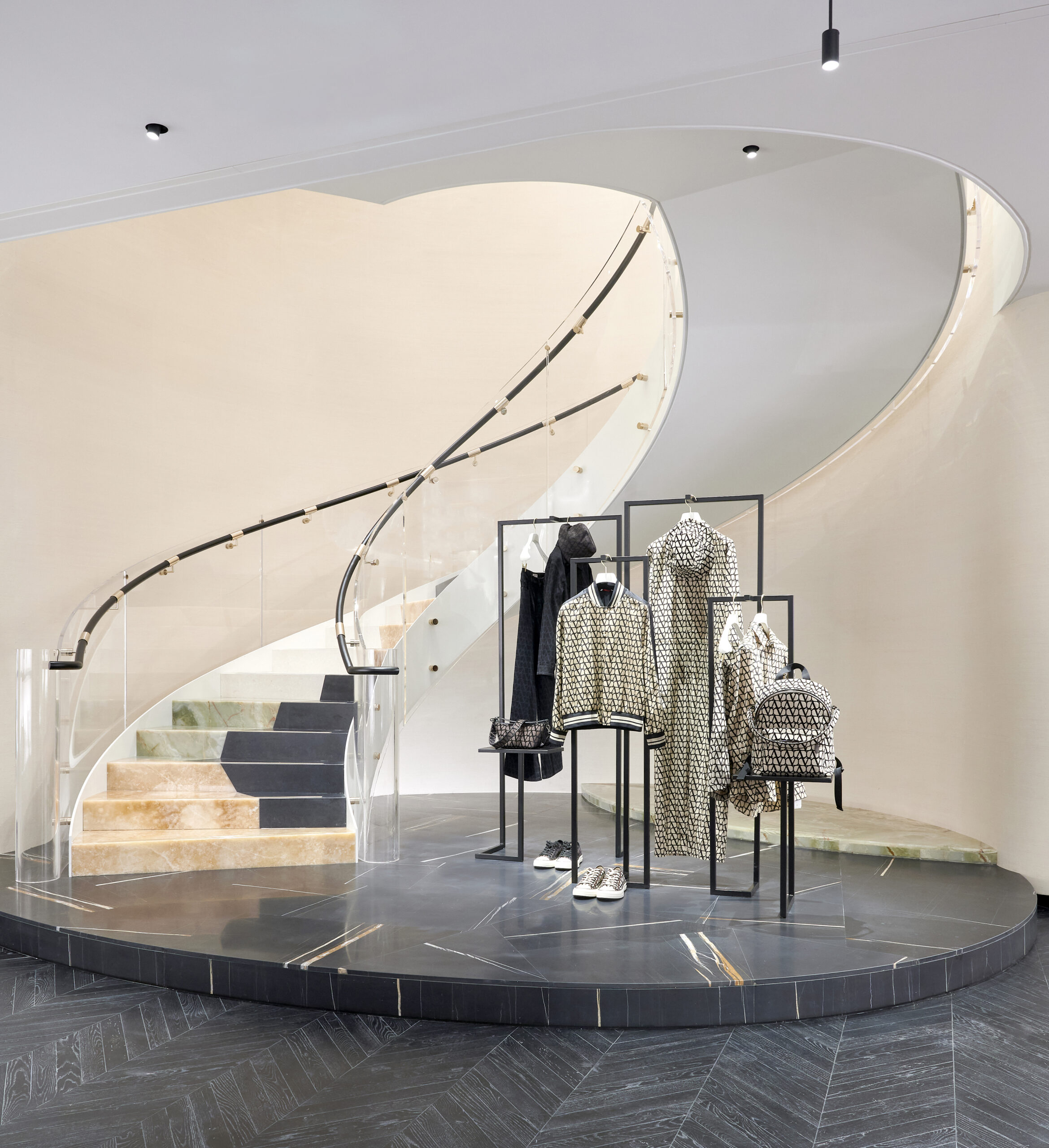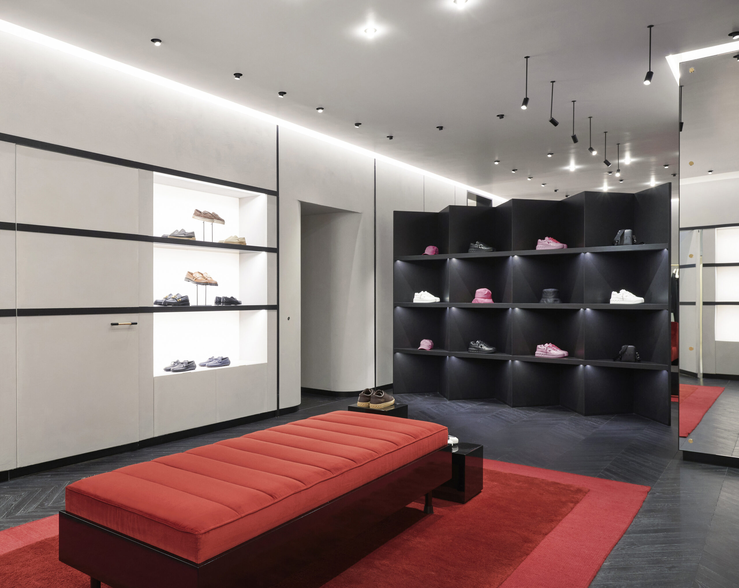 Ce n’est pas seulement un espace de vente, c’est une célébration du savoir-faire. Chaque détail de la boutique rend hommage à l’artisanat : des vitrines en laiton martelé, des poignées en céramique et des lustres en plâtre, créations de talents tels que Fabio Cinti, Massimiliano Pipolo et Alexandre Logé.