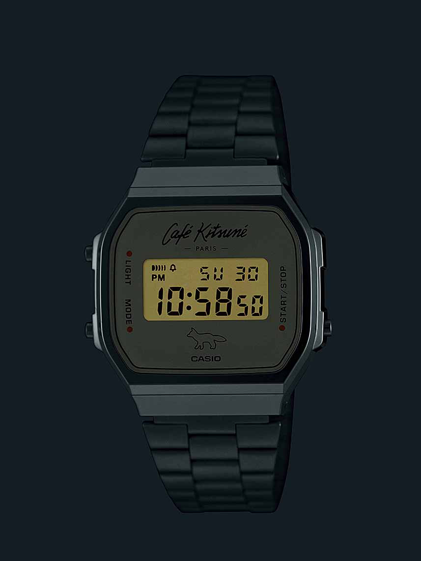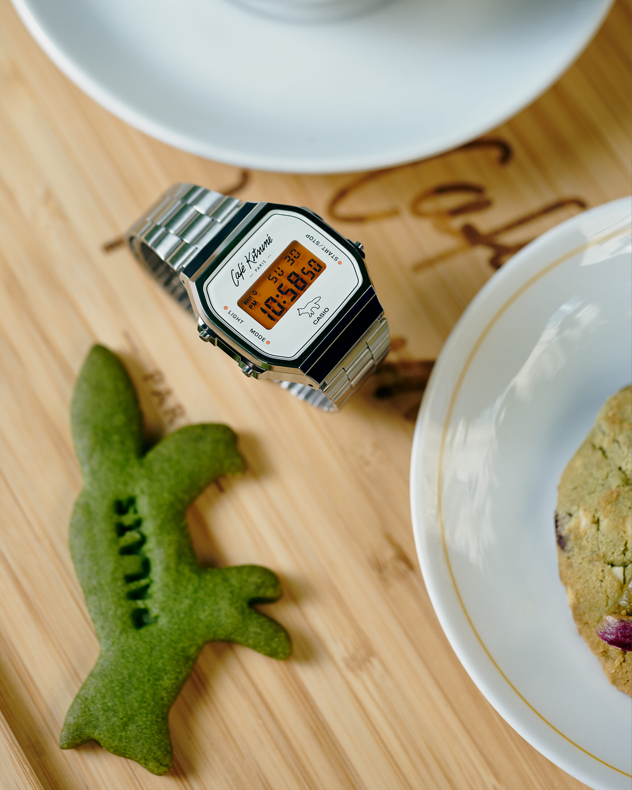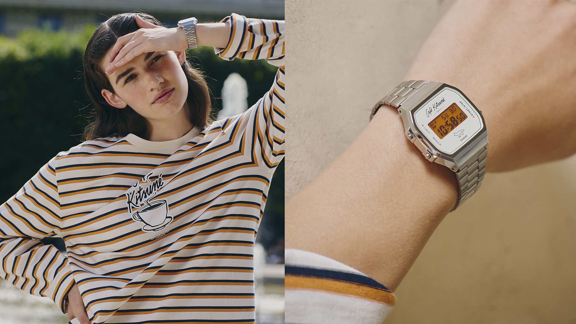 Son boîtier de couleur crème, juxtaposé à un écran LCD orange, évoque une chaleur qui est en parfaite harmonie avec les teintes emblématiques qui ornent les boutiques Café Kitsuné à travers le monde. Le logo Café Kitsuné, intégré de manière subtile mais distincte dans le design du cadran, ainsi qu’un discret contour du logo du renard emblématique gravé sur la boucle et au dos du boîtier, ajoutent une touche d’exclusivité qui est typique de la marque Kitsuné.