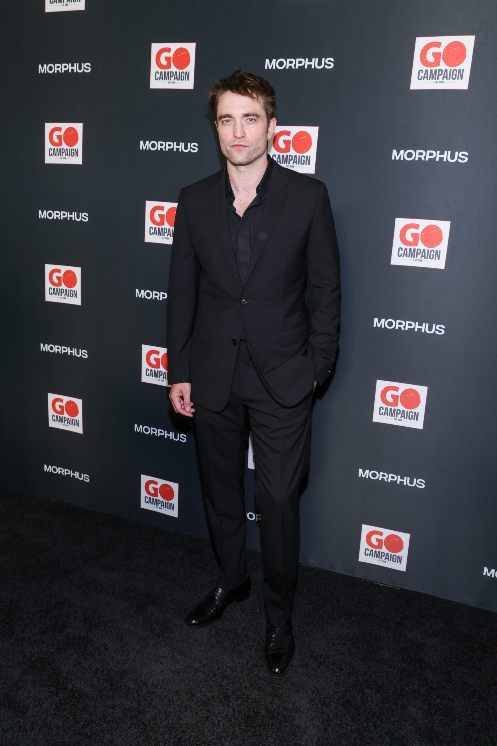 ROBERT PATTINSON WORE A DIOR MEN’S COLLECTION BLACK WOOL NOTCH LAPEL SUIT, A CLASSIC BLACK COTTON SHIRT AND BLACK LEATHER DERBIES.