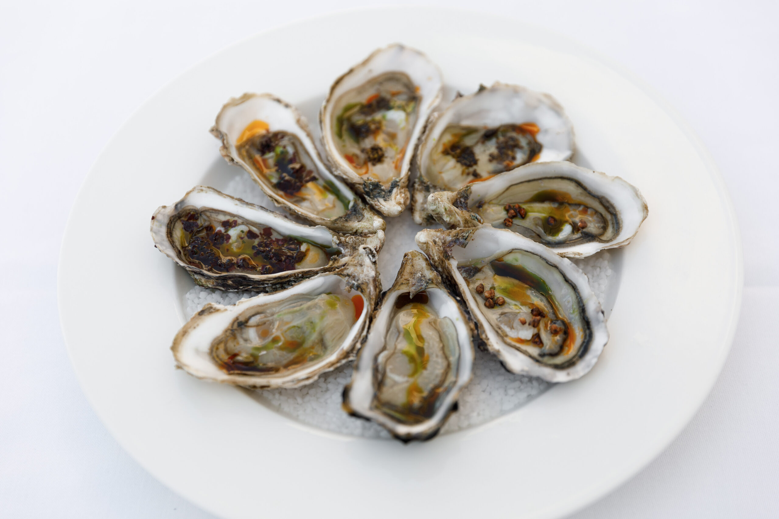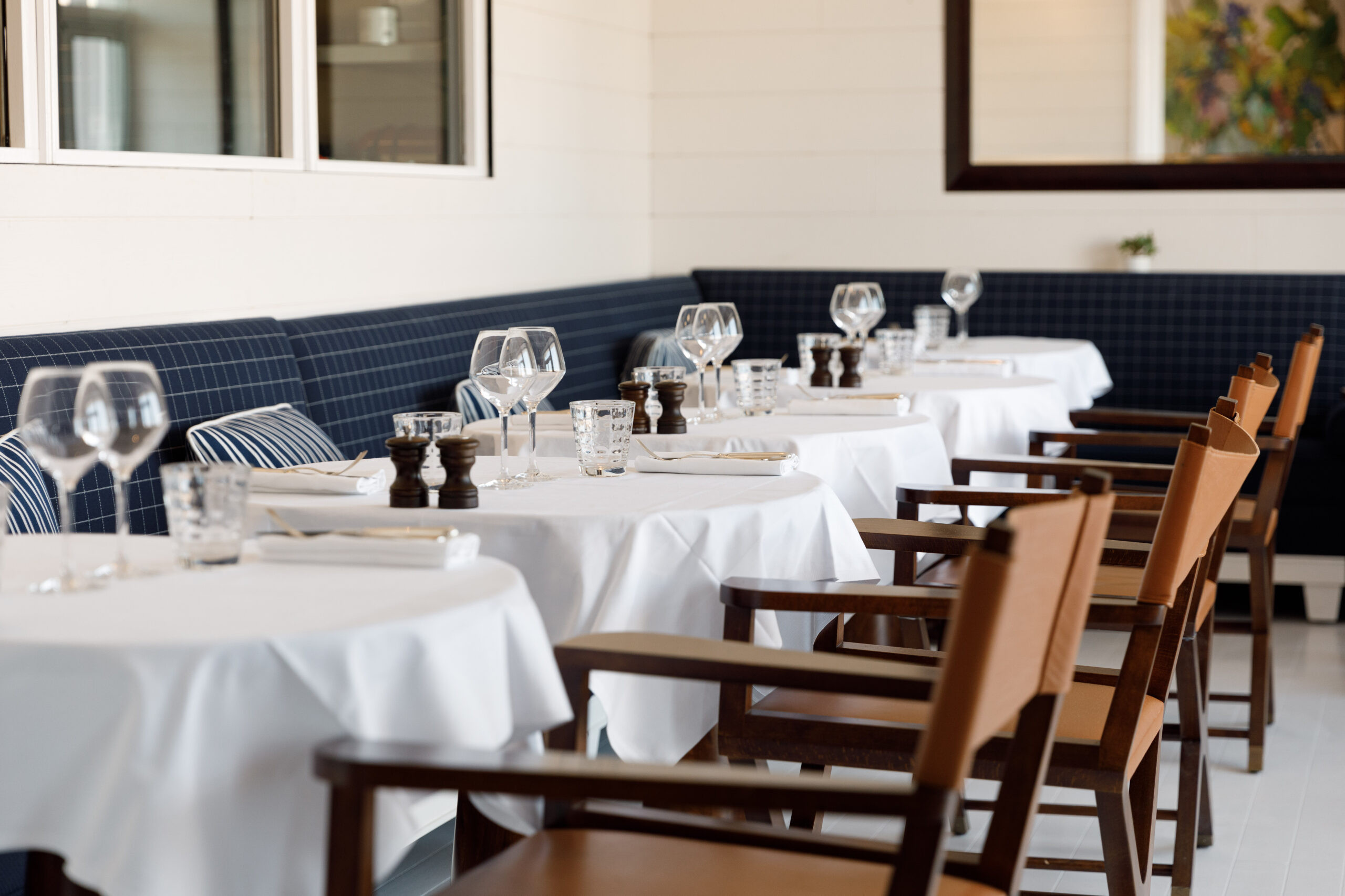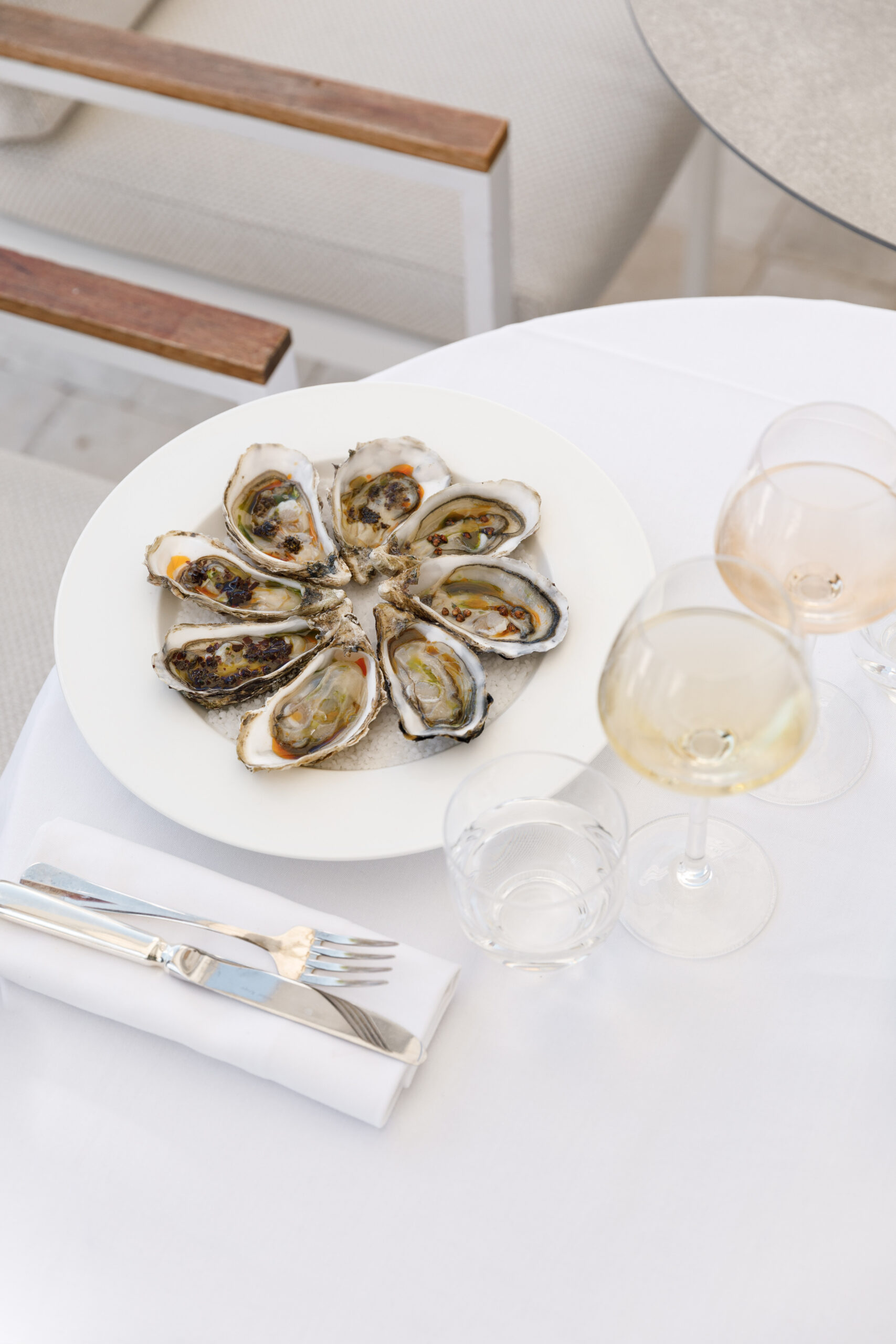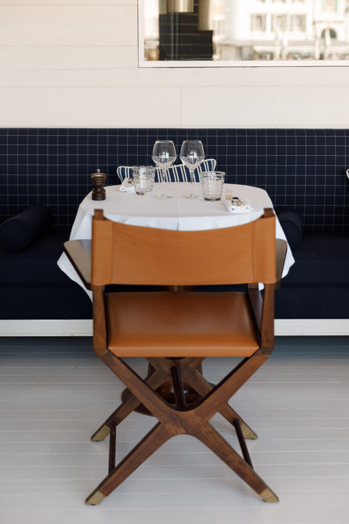 Inauguré en 2021, George’s se distingue par son cadre élégant. Entre la spacieuse terrasse offrant une vue panoramique sur le port et la salle principale aux nuances de blanc et de bleu, chaque coin est un véritable appel à la détente et à la contemplation. L’immense baie vitrée qui s’étend sur toute la longueur du restaurant dévoile en transparence les coulisses des cuisines, créant une expérience immersive pour les convives.