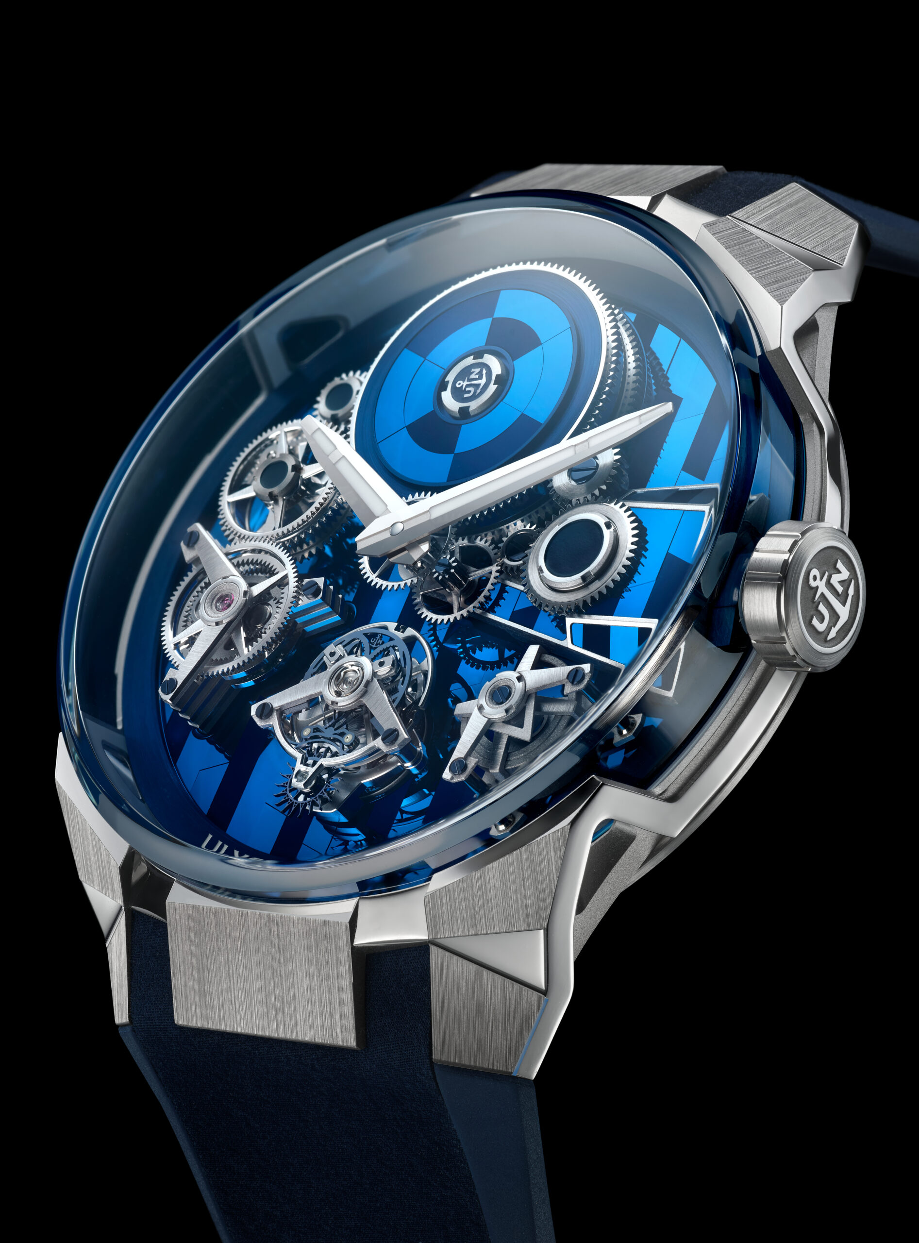 Sur un cadran en marqueterie bleutée, les composants du calibre Manufacture UN-176 semblent léviter, seulement maintenus par des arcs de cercle en acier. Ce mouvement flying tourbillon à échappement constant dévoile son ballet hypnotique au travers d’une glace saphir élargie.