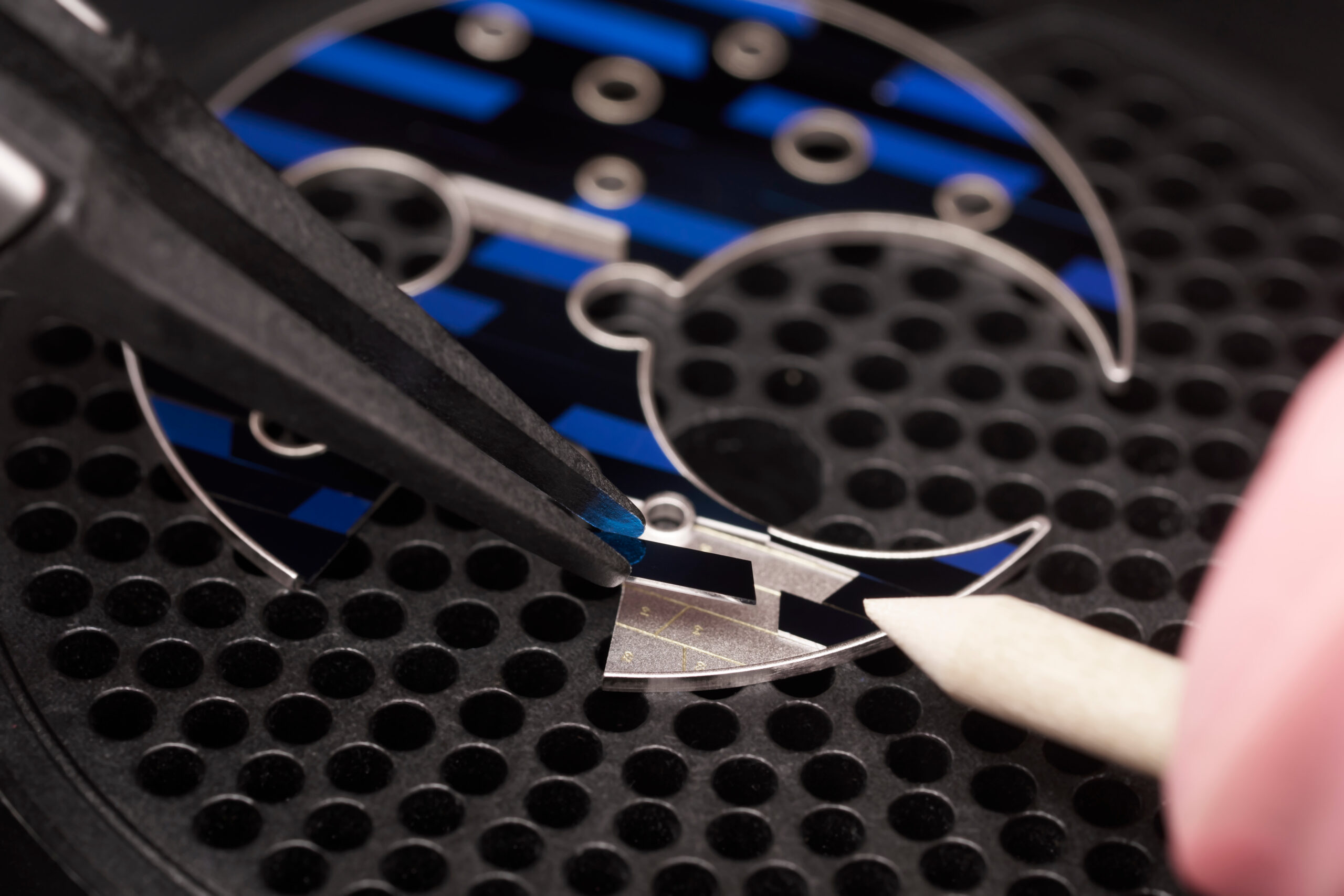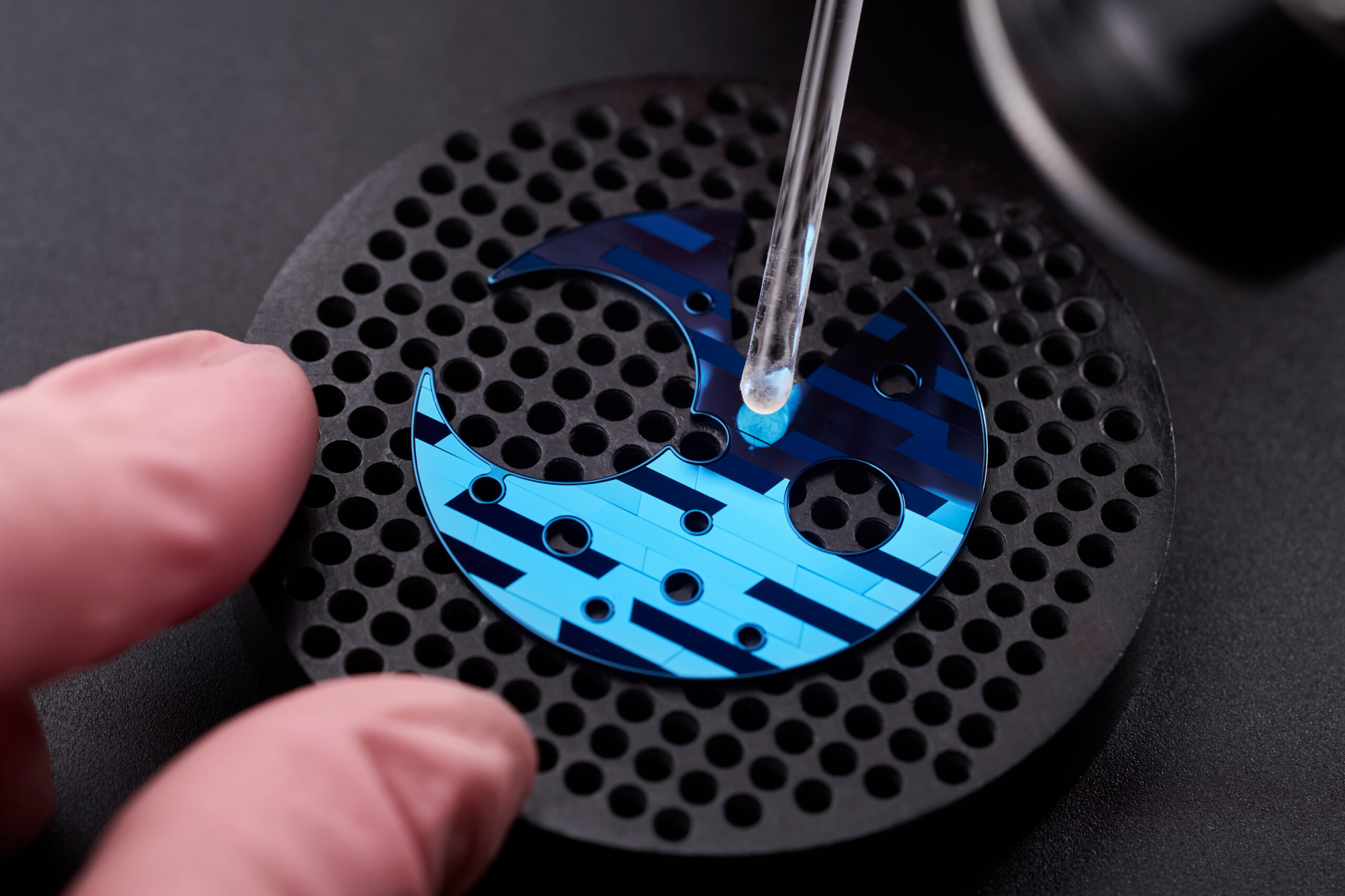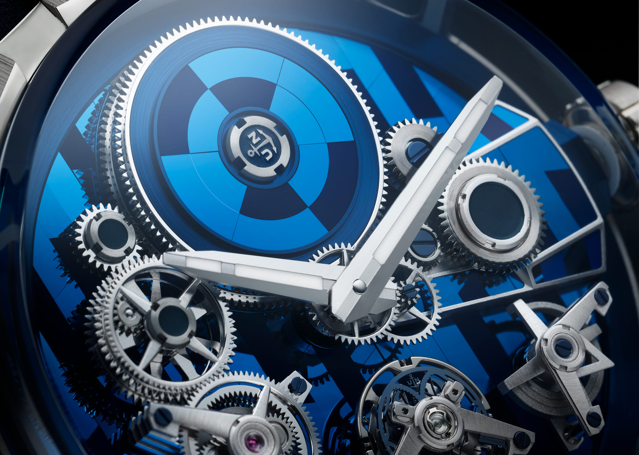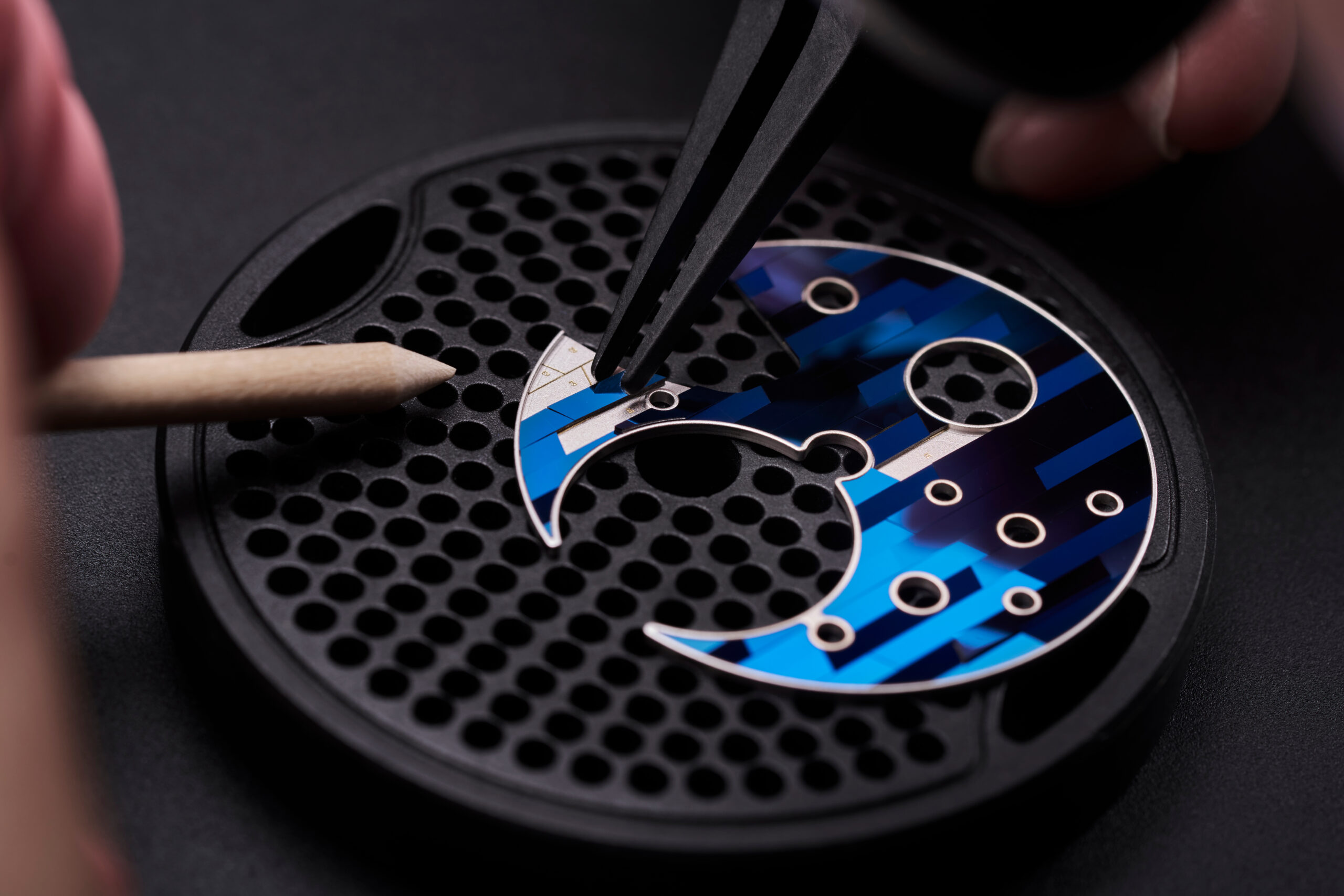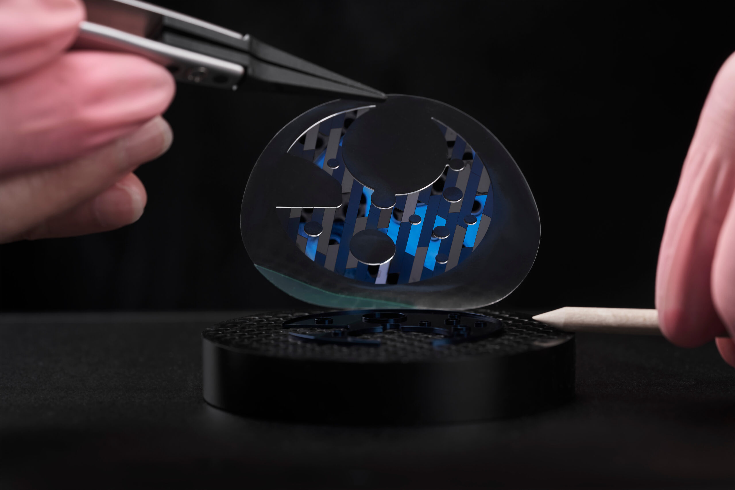 Assembler ces fragments d’une extrême fragilité relève de la gageure et exige une précision chirurgicale de la part des artisans de la maison. Le fond de boîte arbore également pour la première fois un décor en silicium bleu.