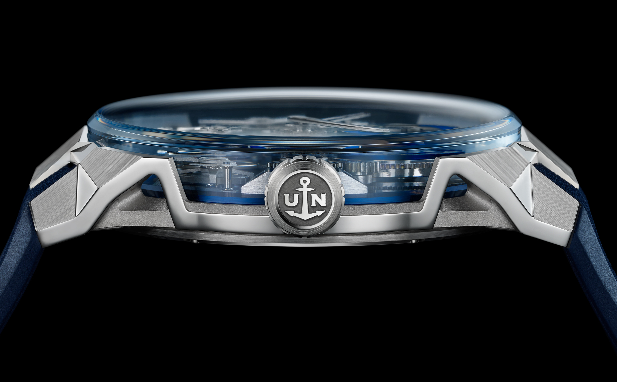 Au coeur de cette création, le mouvement Manufacture UN-176 repousse les limites de la construction horlogère. Tourbillon volant, ancre en lévitation, barillet et rouages aériens… tous les éléments semblent défier les lois de la gravité.