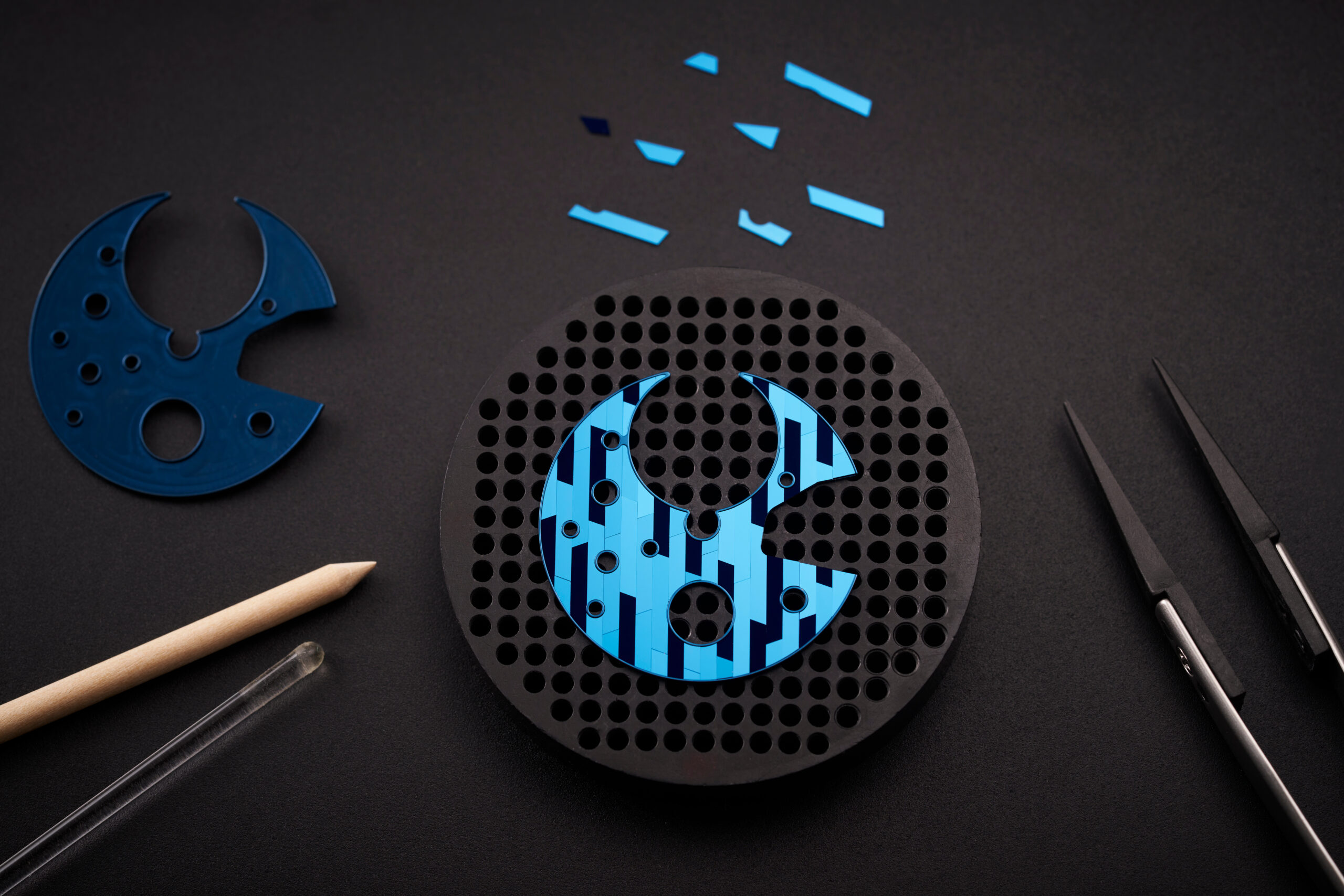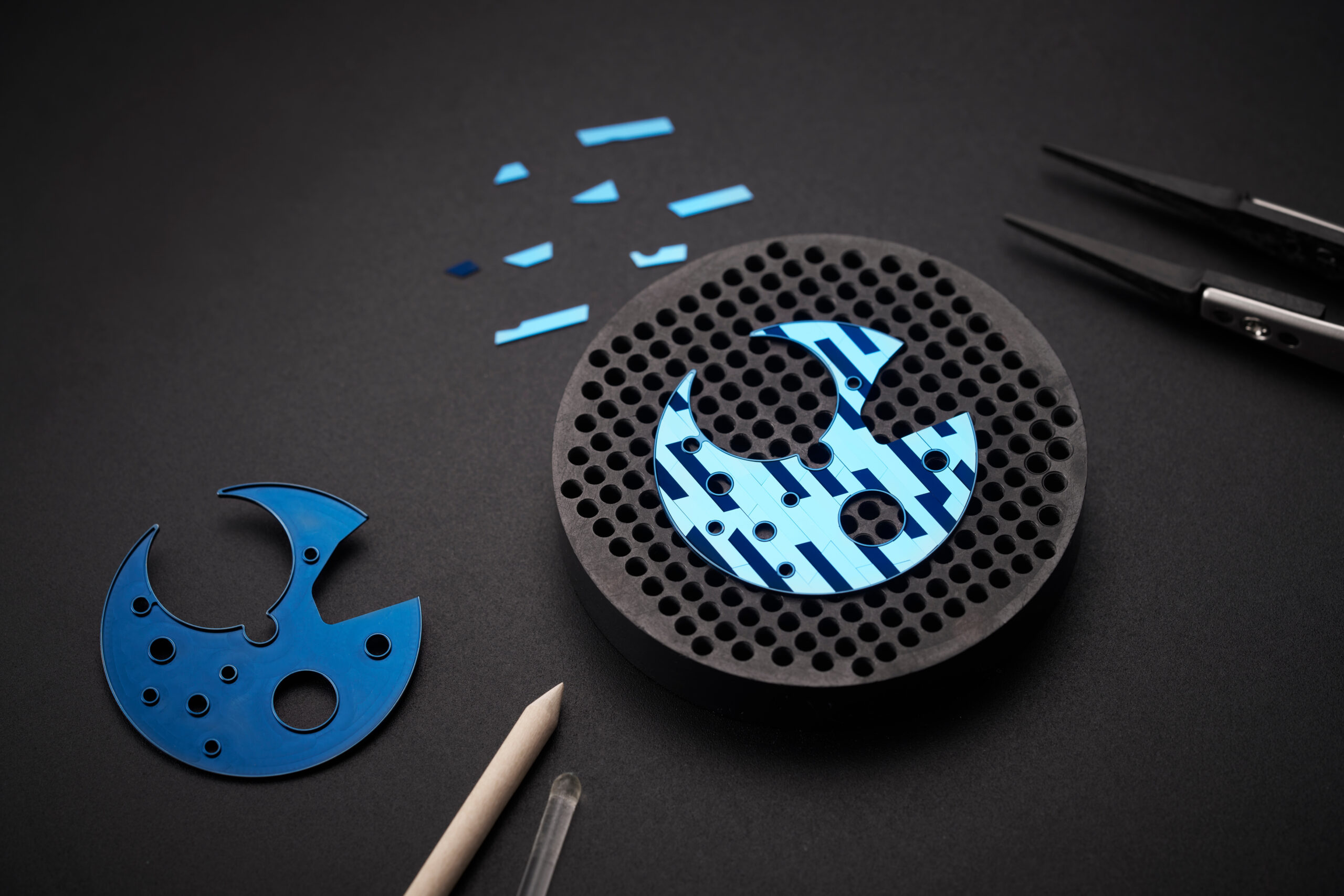 Composée de 103 plaquettes de silicium bleui, cette marqueterie artisanale sublime le cadran. Grâce à un savant jeu de surfaces mates et brillantes, elle sculpte la lumière pour un rendu saisissant.