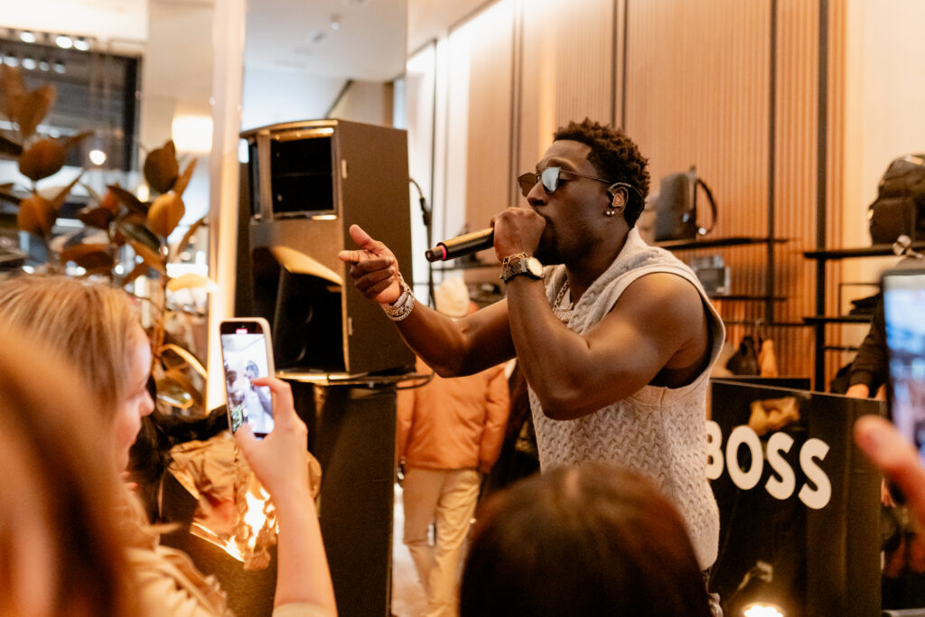 L’événement fut marqué par une présence notoire d’invités de marque, habillés en BOSS, foulant un tapis noir élégant qui se fondait dans l’ambiance sophistiquée de la boutique. Les DJs IMANI, Claire Lyons et Dave Nunes ont donné le ton musical, suivis d’une performance du rappeur Frenna, tandis que les cocktails et bouchées conçus par le chef étoilé Joris Bijdendijk éveillaient les sens des convives.