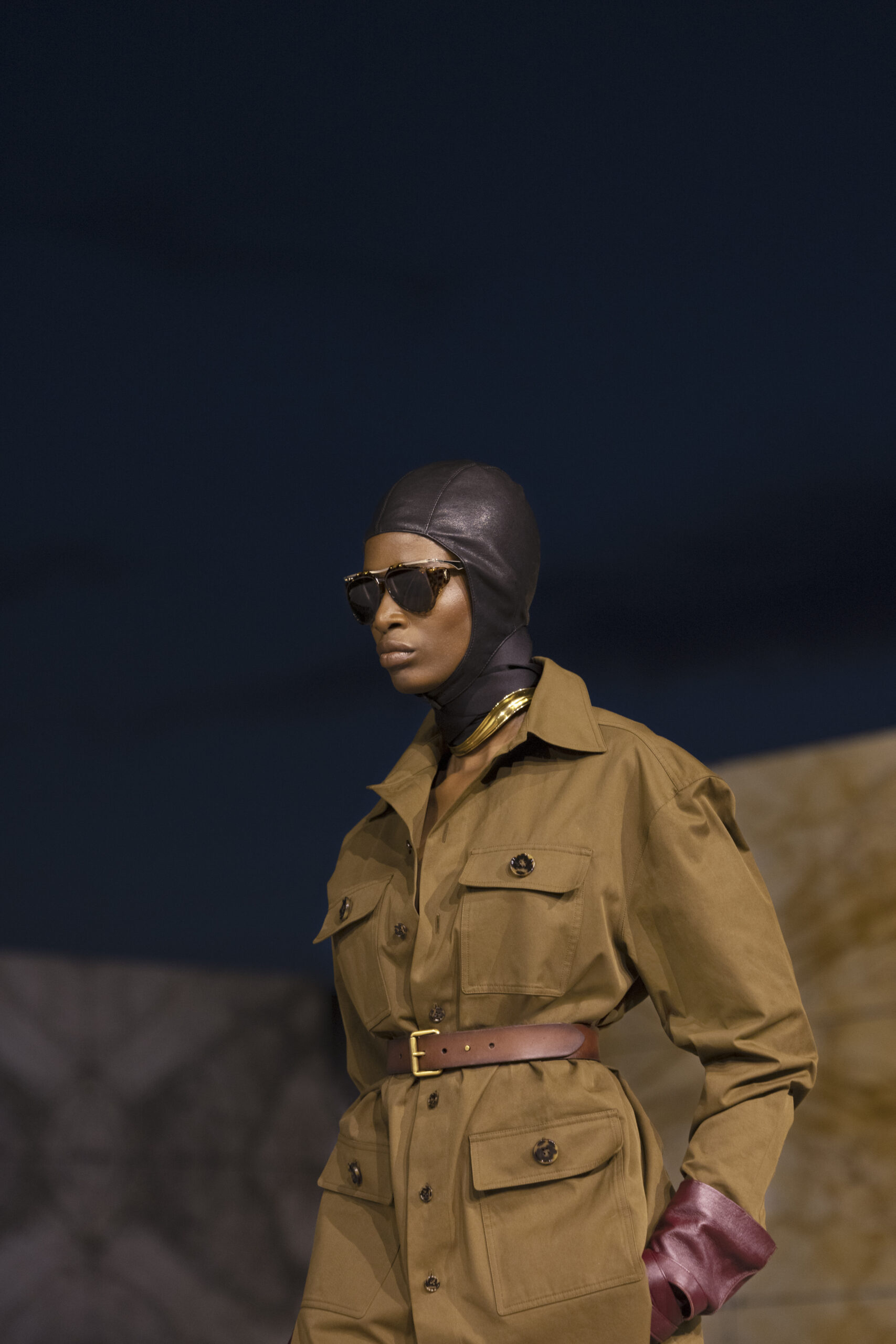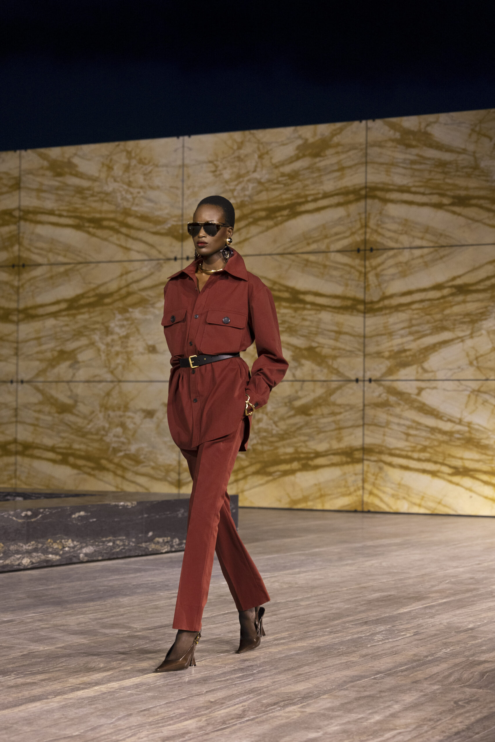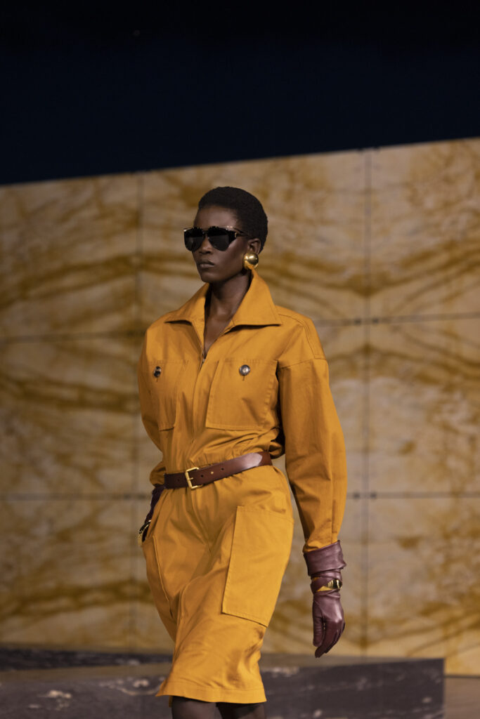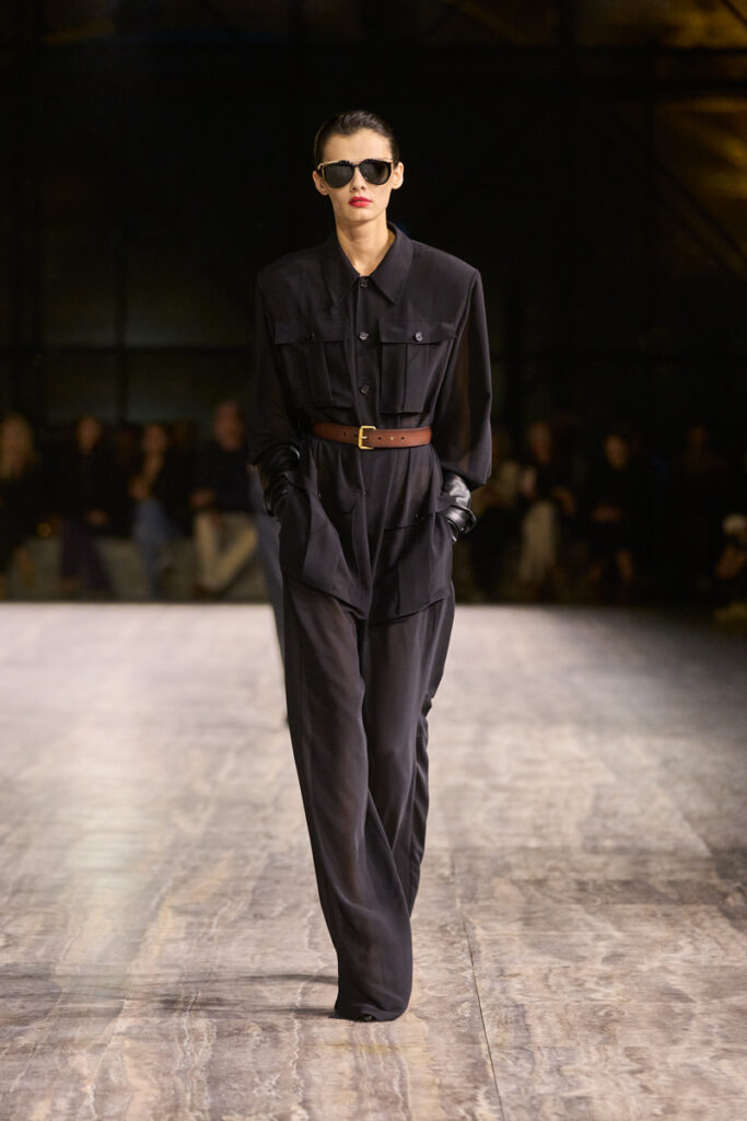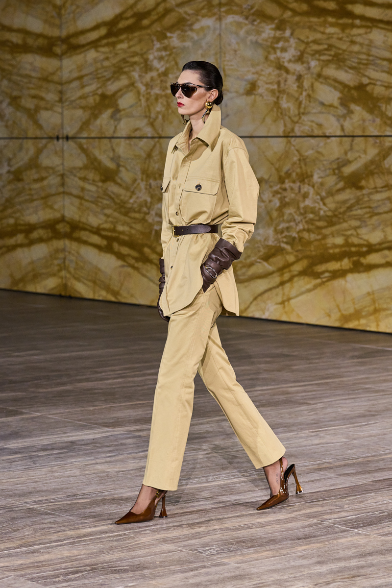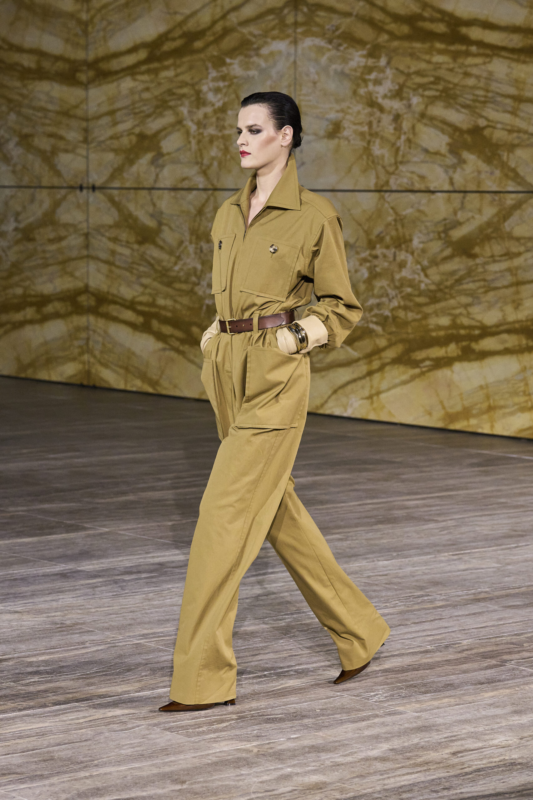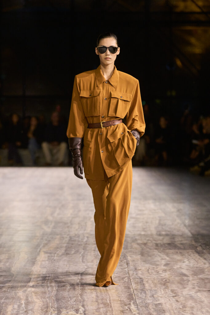 La veste safari et la combinaison trouvent ici des versions sophistiquées grâce à un travail sur les volumes et les détails, tels que les ceintures marquant la taille. Les coupes empruntées au vestiaire masculin se parent de notes raffinées comme les gants et talons aiguilles.