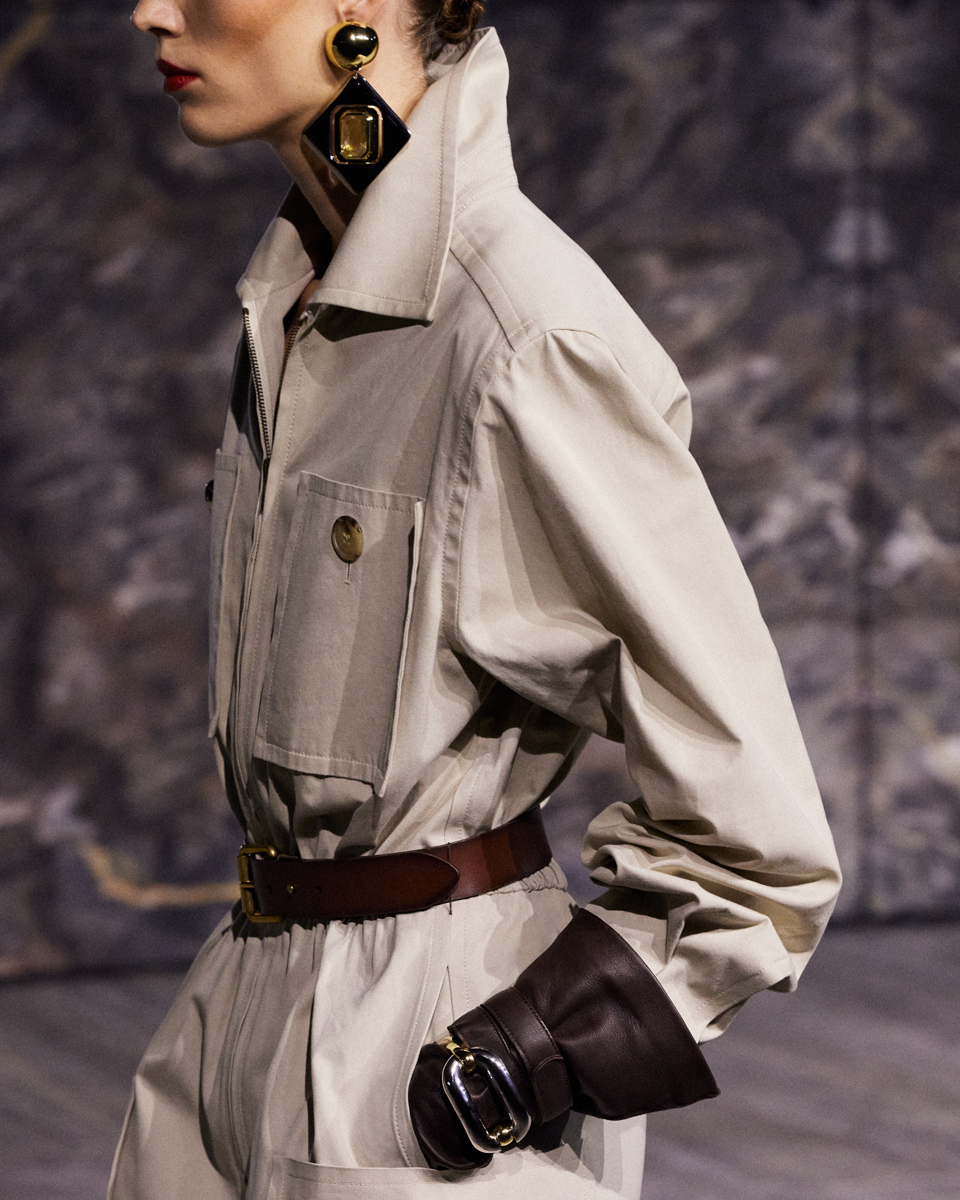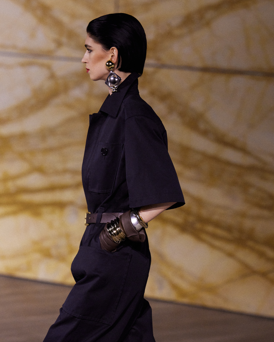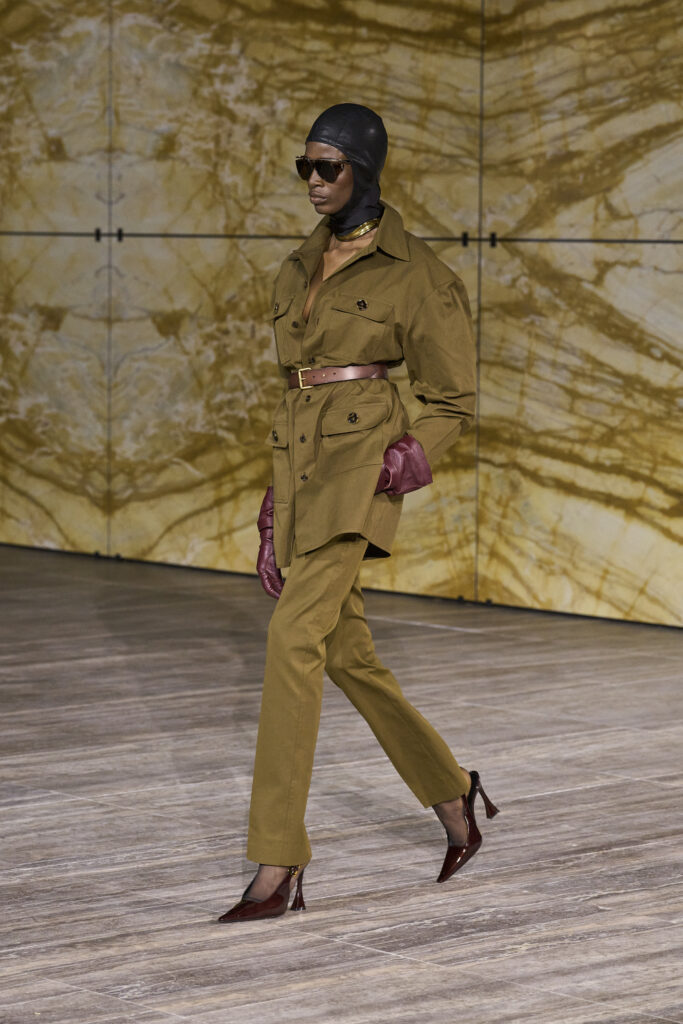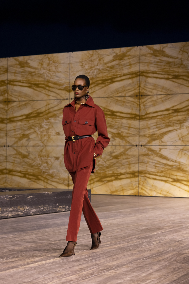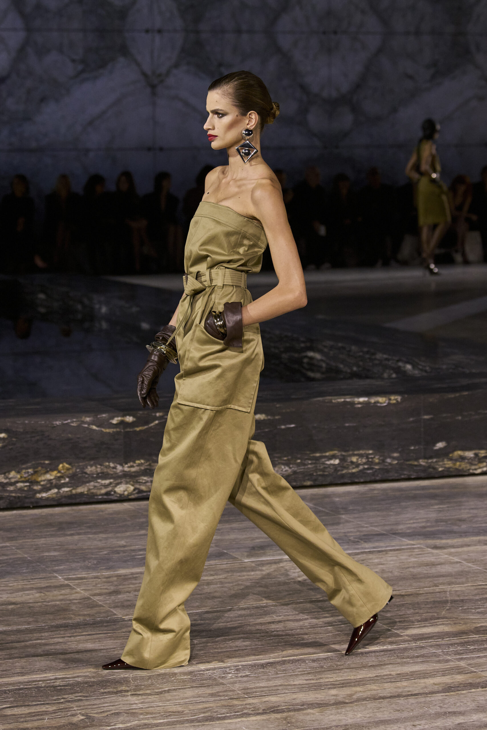 La veste safari et la combinaison trouvent ici des versions sophistiquées grâce à un travail sur les volumes et les détails, tels que les ceintures marquant la taille. Les coupes empruntées au vestiaire masculin se parent de notes raffinées comme les gants et talons aiguilles.