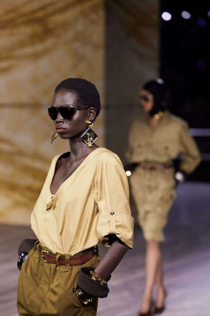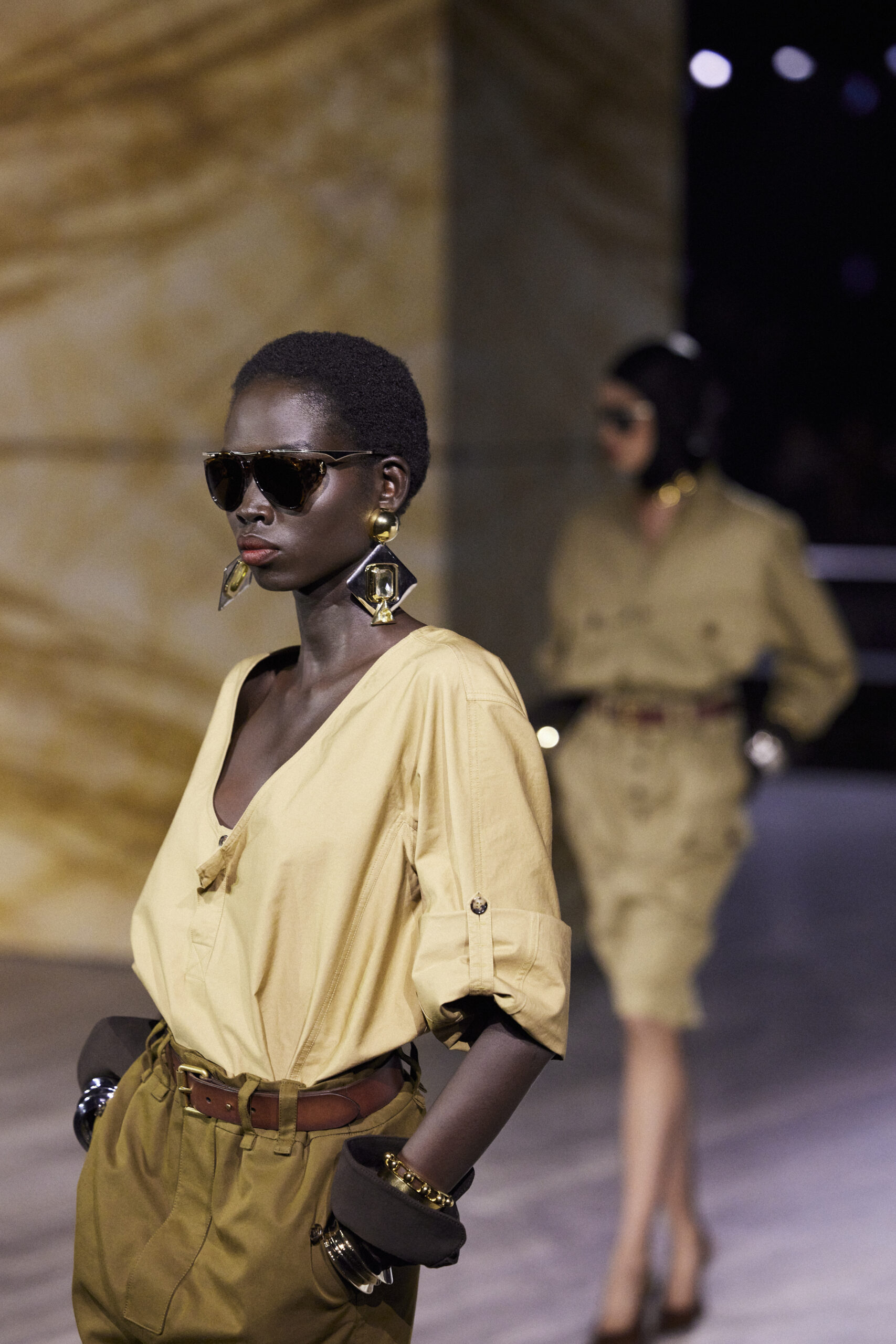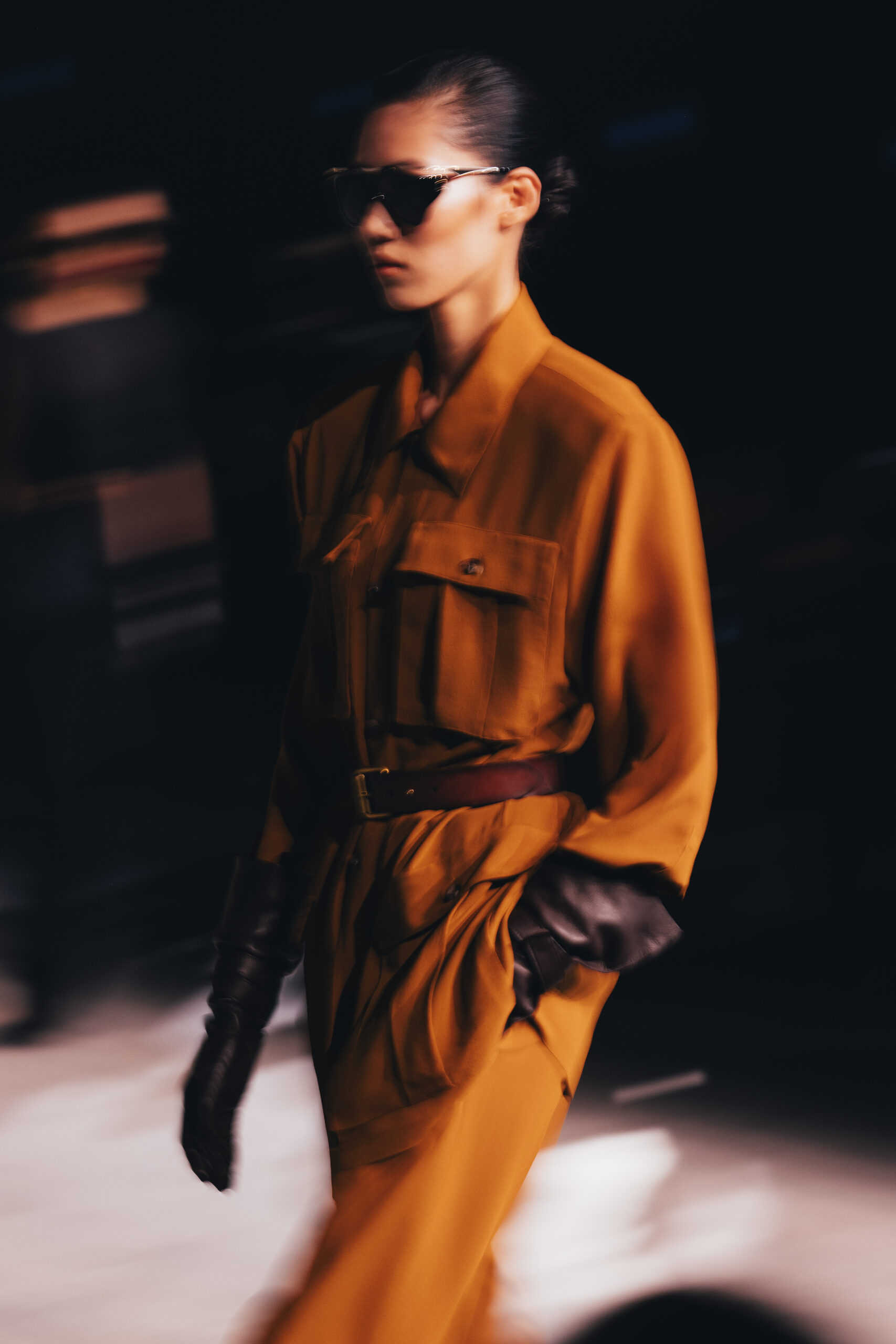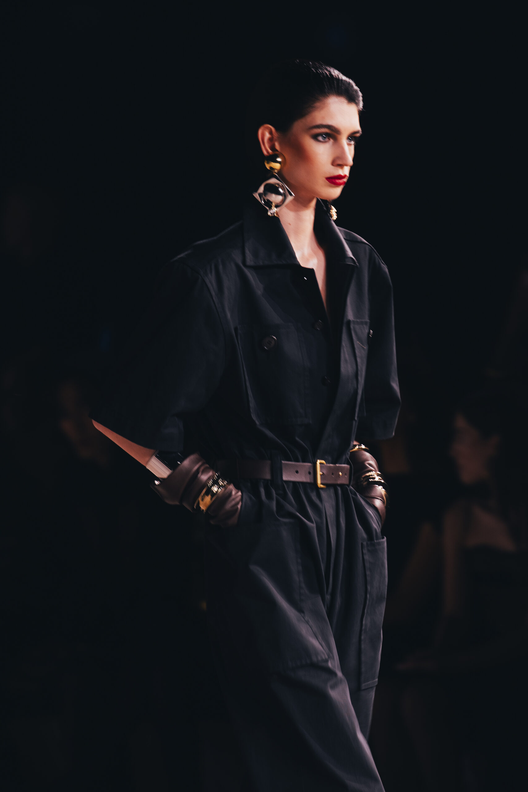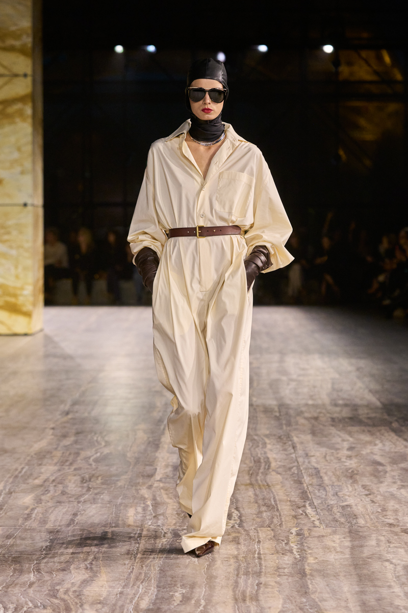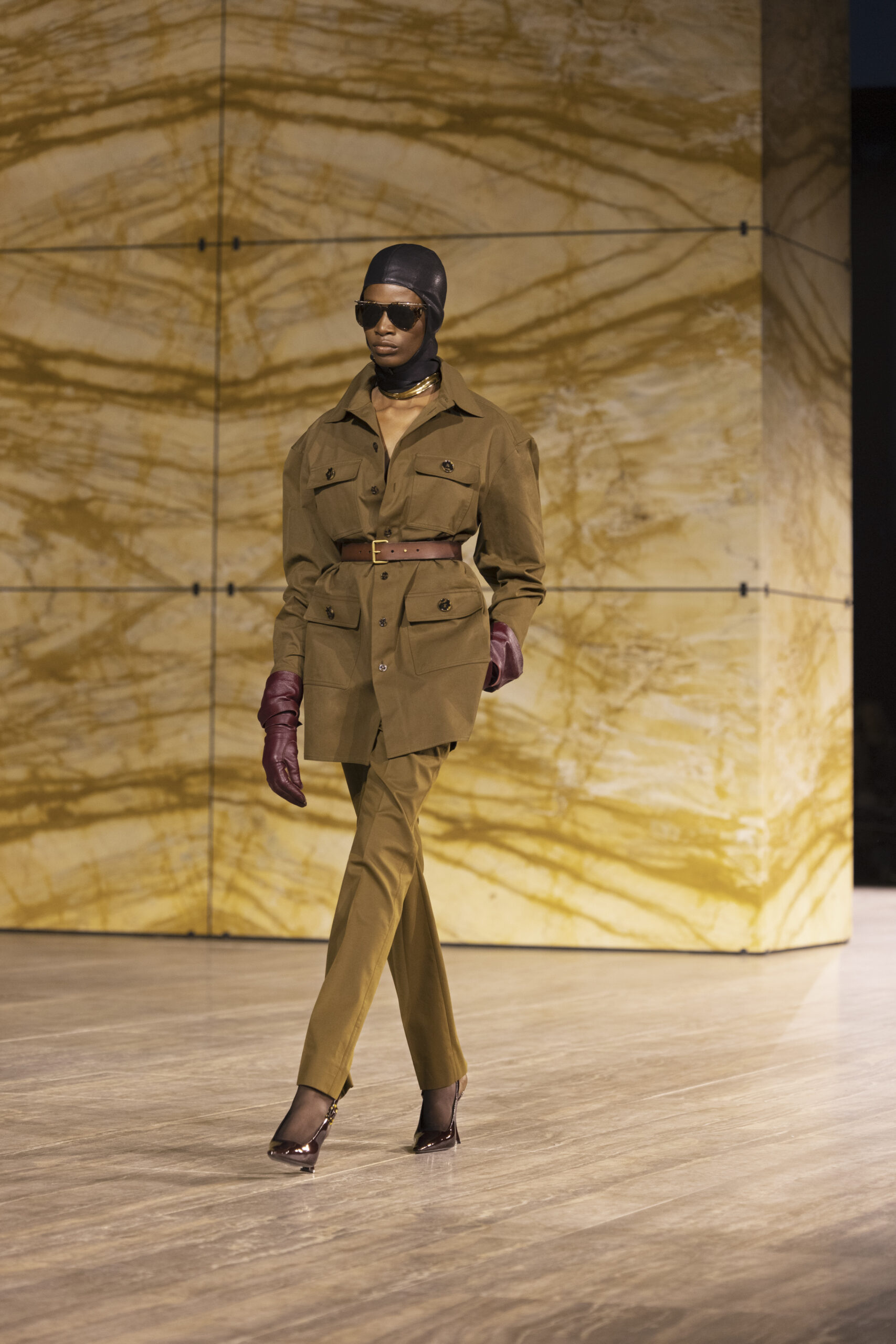 La veste safari et la combinaison trouvent ici des versions sophistiquées grâce à un travail sur les volumes et les détails, tels que les ceintures marquant la taille. Les coupes empruntées au vestiaire masculin se parent de notes raffinées comme les gants et talons aiguilles.