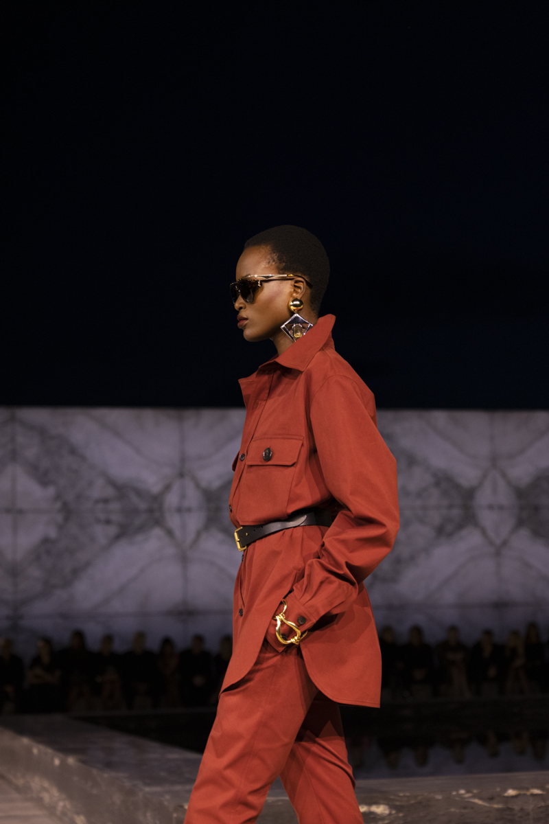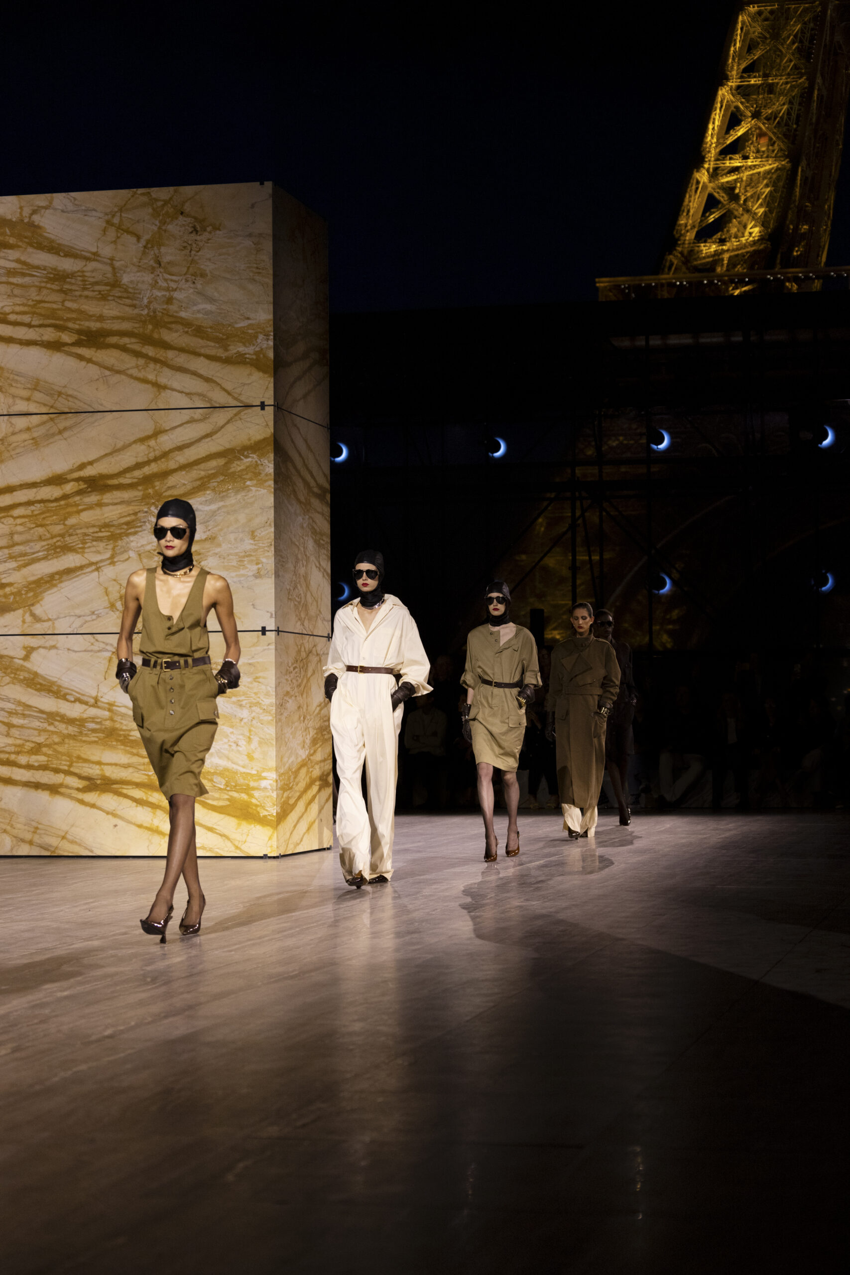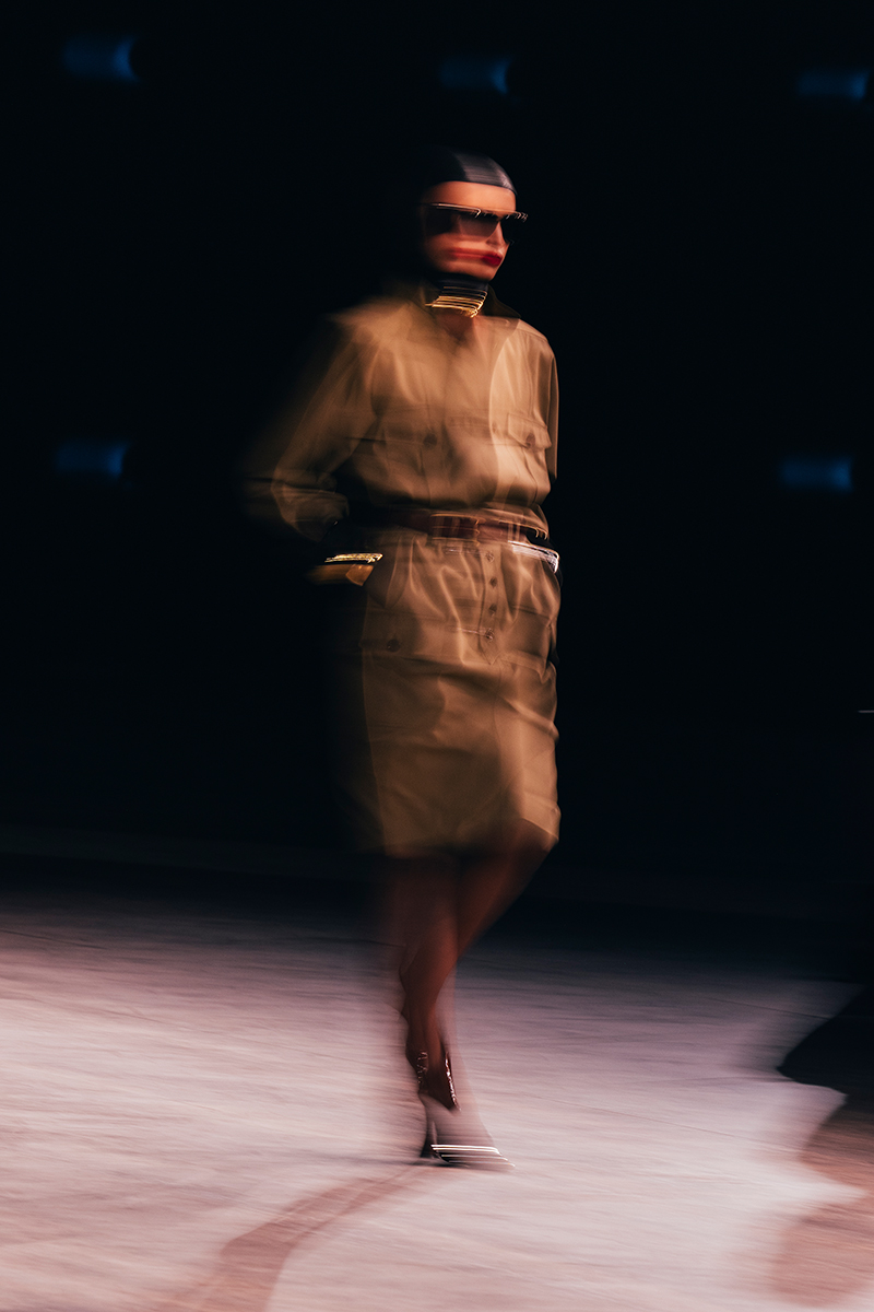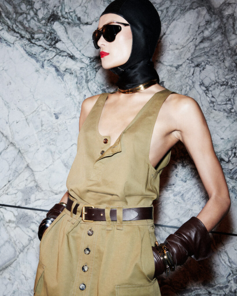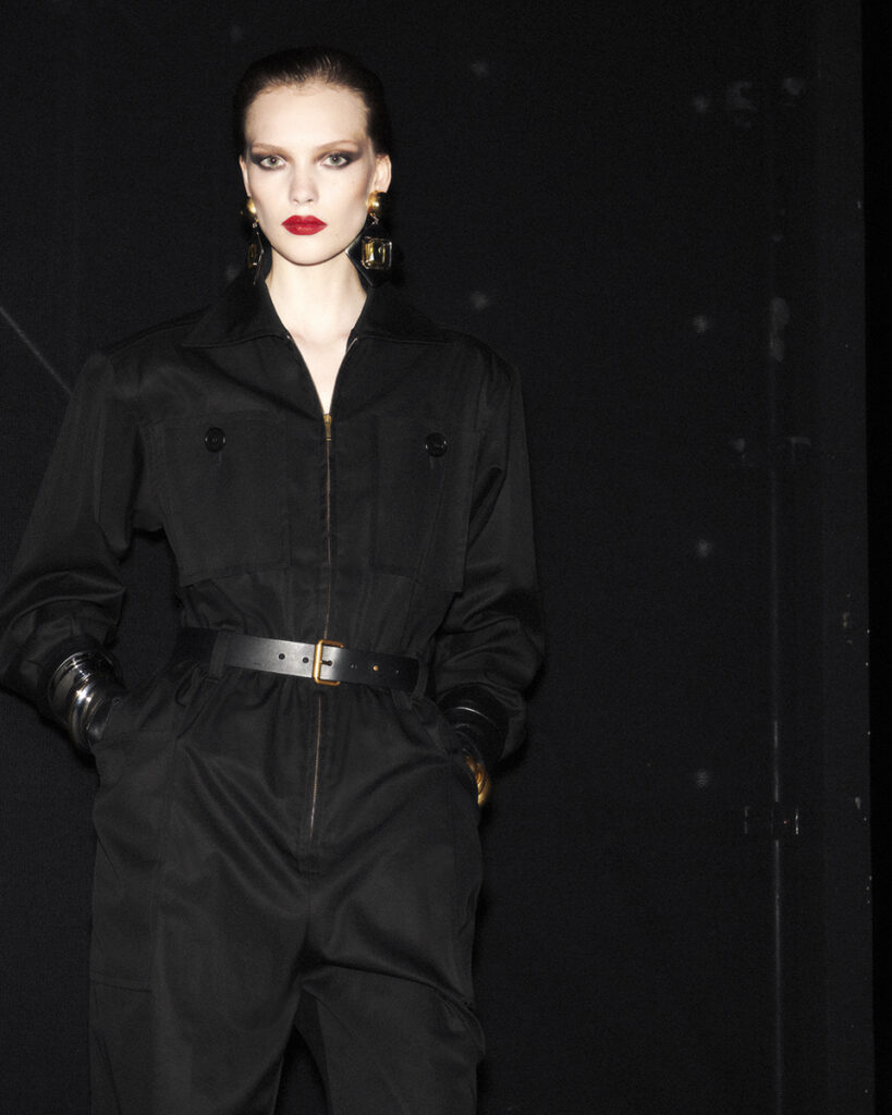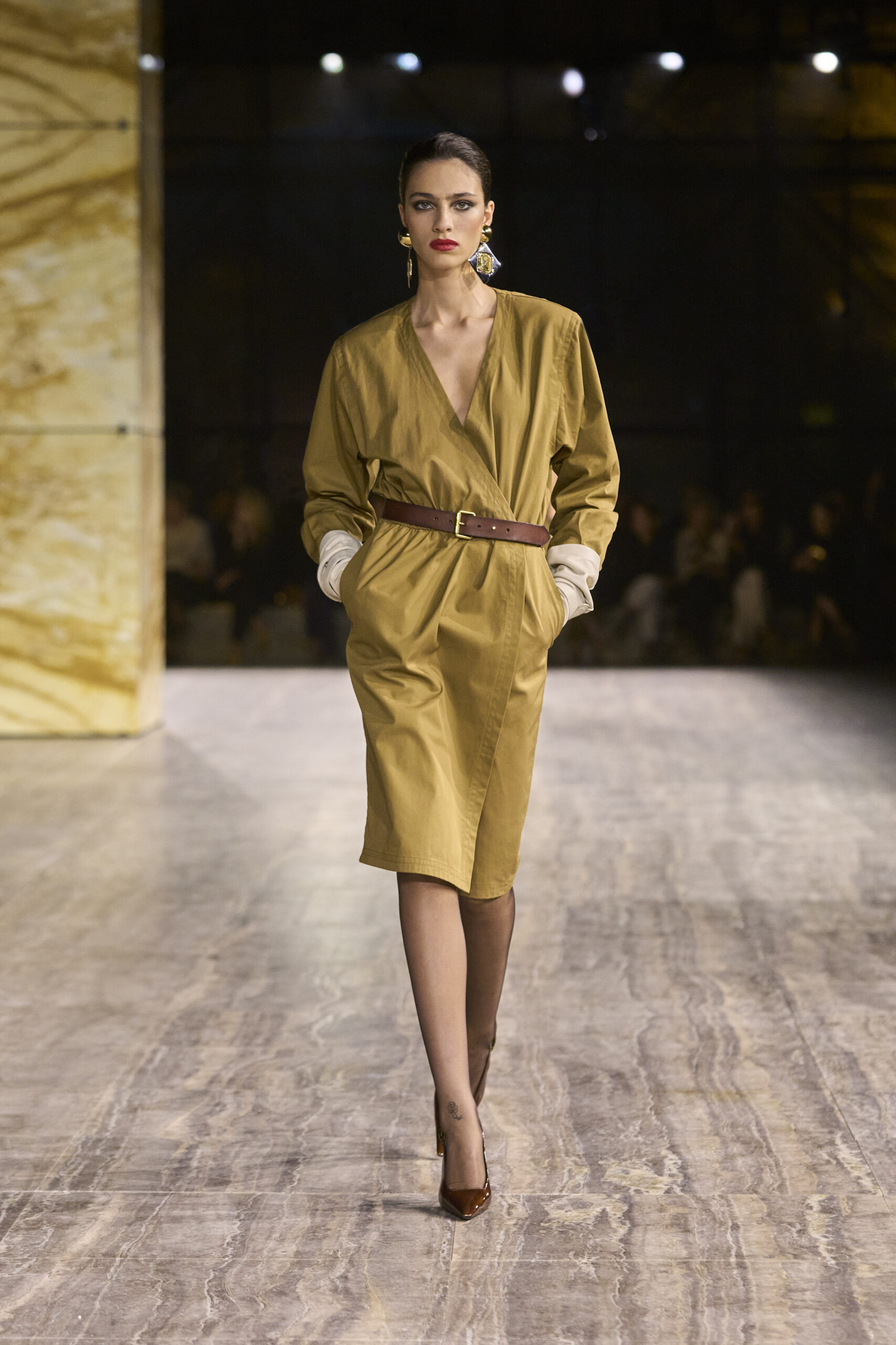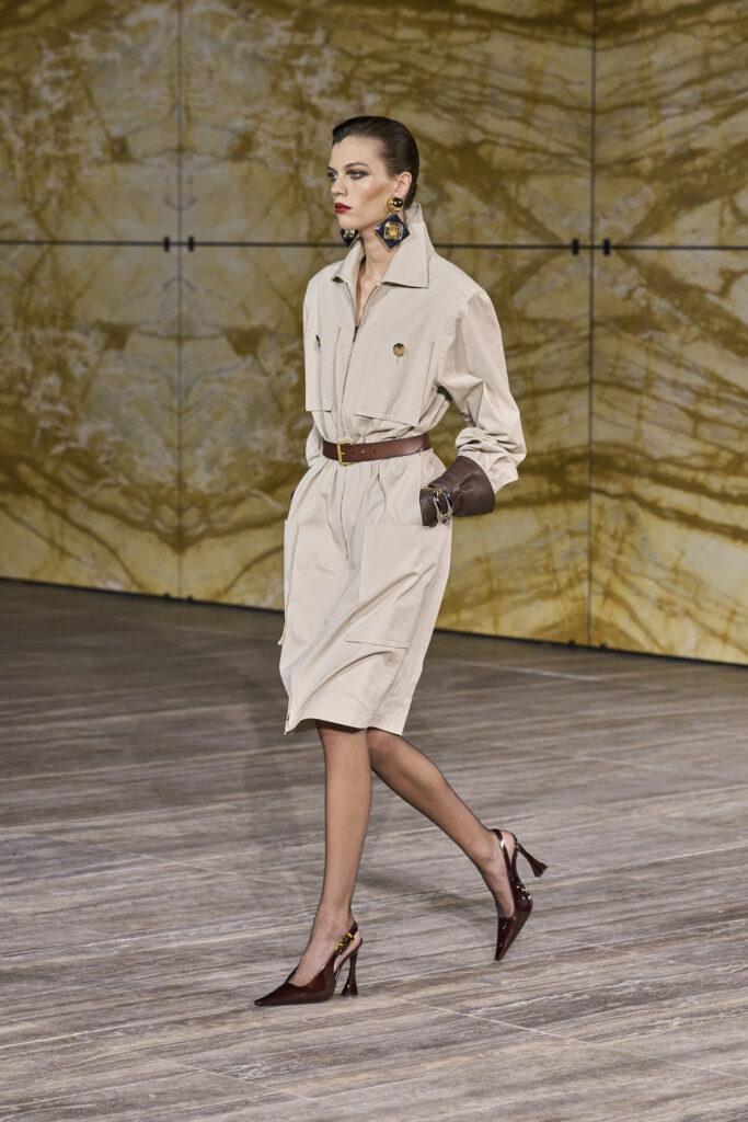 La veste safari et la combinaison trouvent ici des versions sophistiquées grâce à un travail sur les volumes et les détails, tels que les ceintures marquant la taille. Les coupes empruntées au vestiaire masculin se parent de notes raffinées comme les gants et talons aiguilles.
