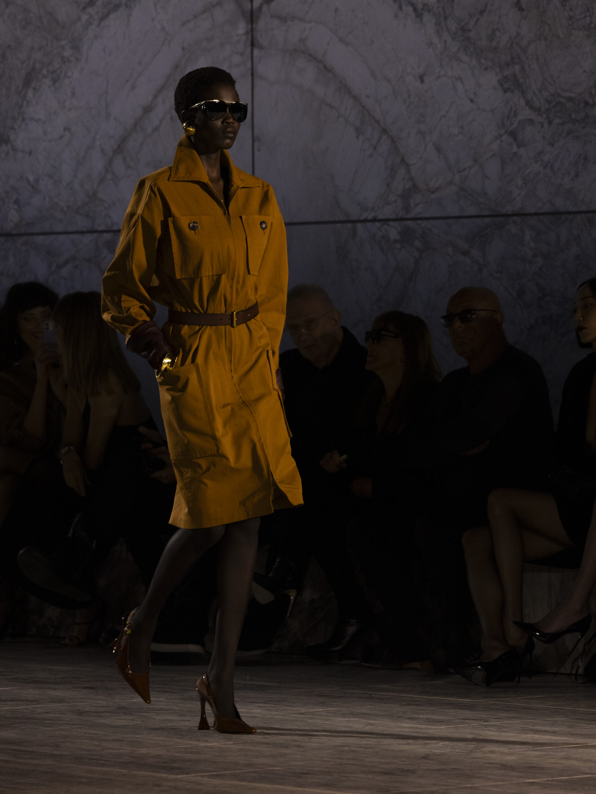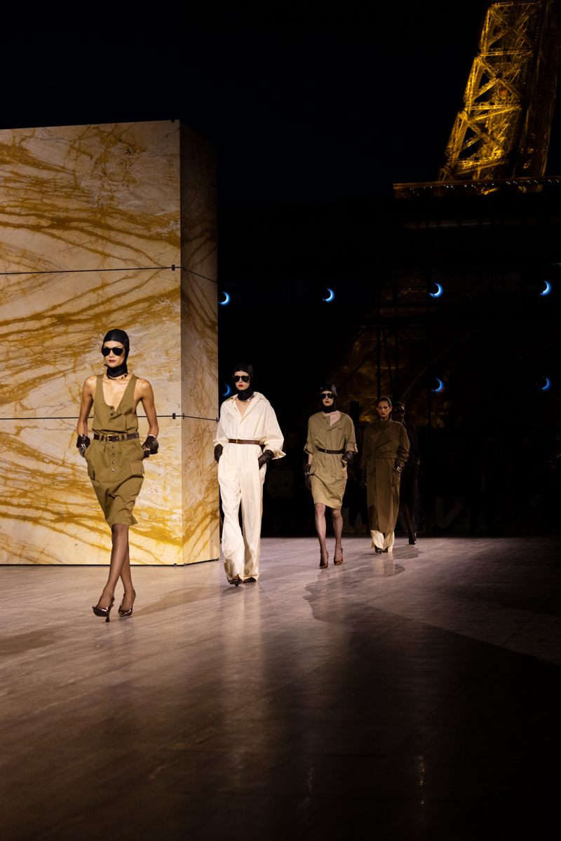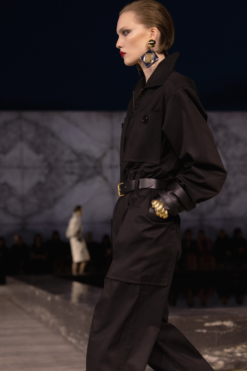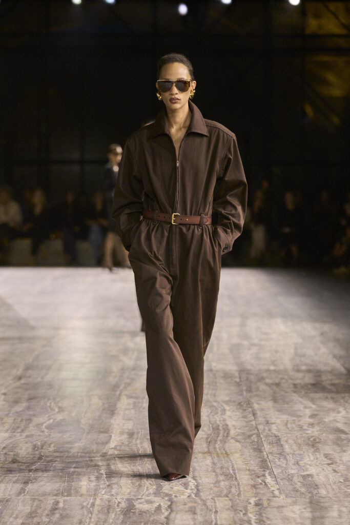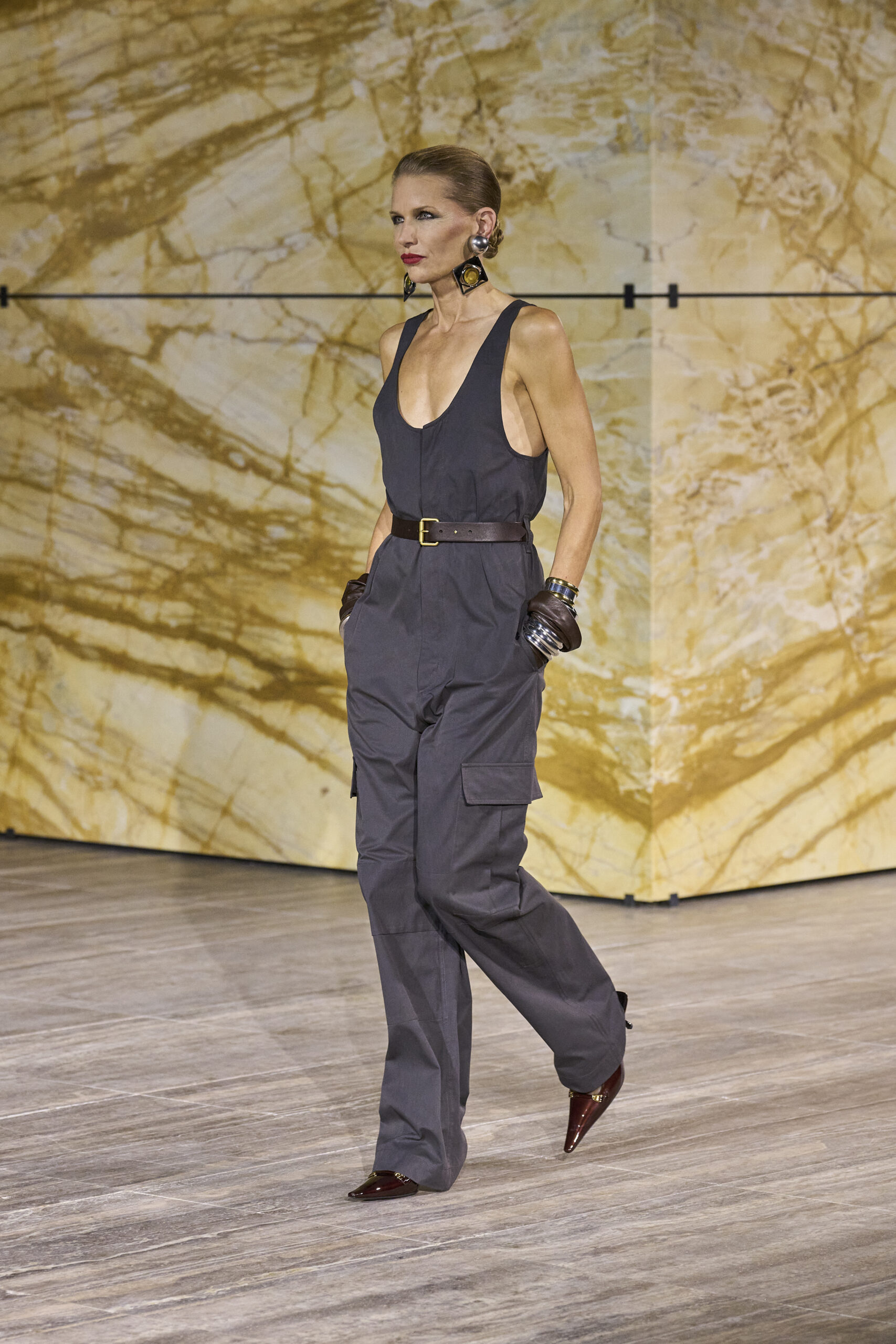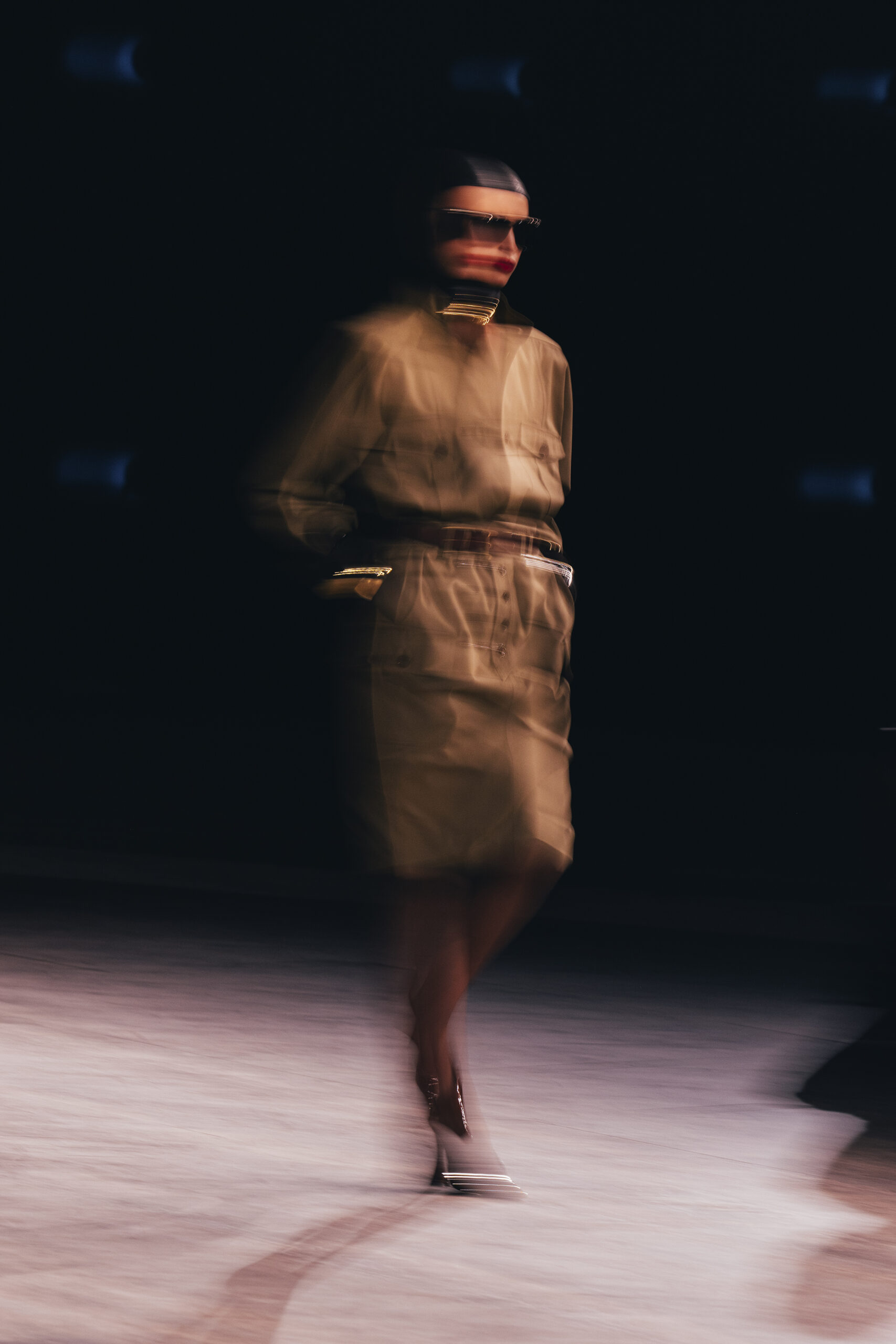 La veste safari et la combinaison trouvent ici des versions sophistiquées grâce à un travail sur les volumes et les détails, tels que les ceintures marquant la taille. Les coupes empruntées au vestiaire masculin se parent de notes raffinées comme les gants et talons aiguilles.