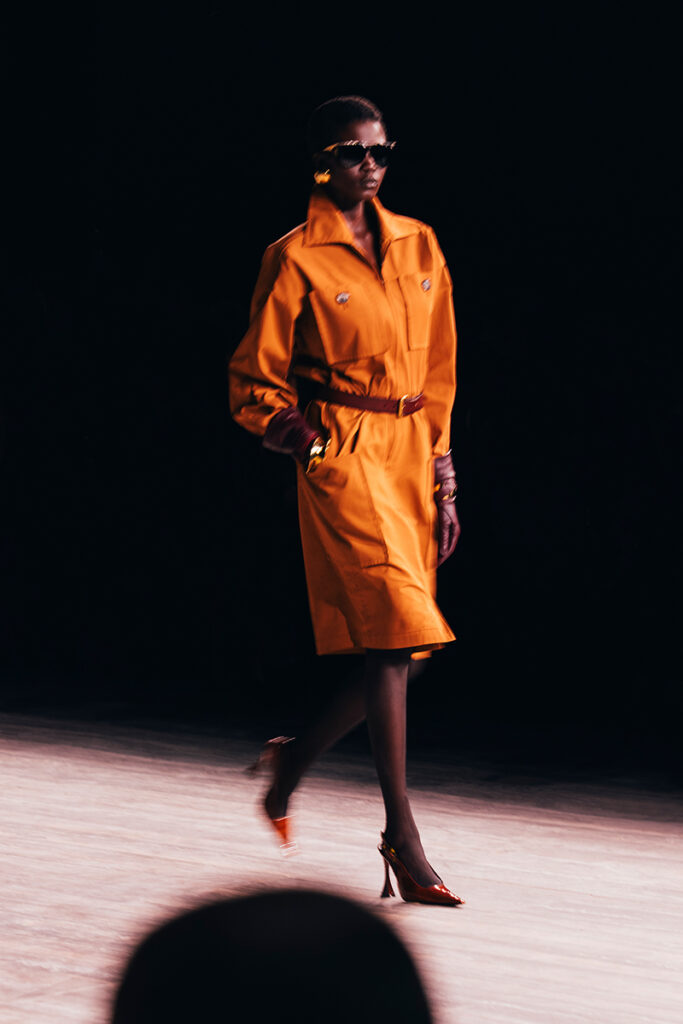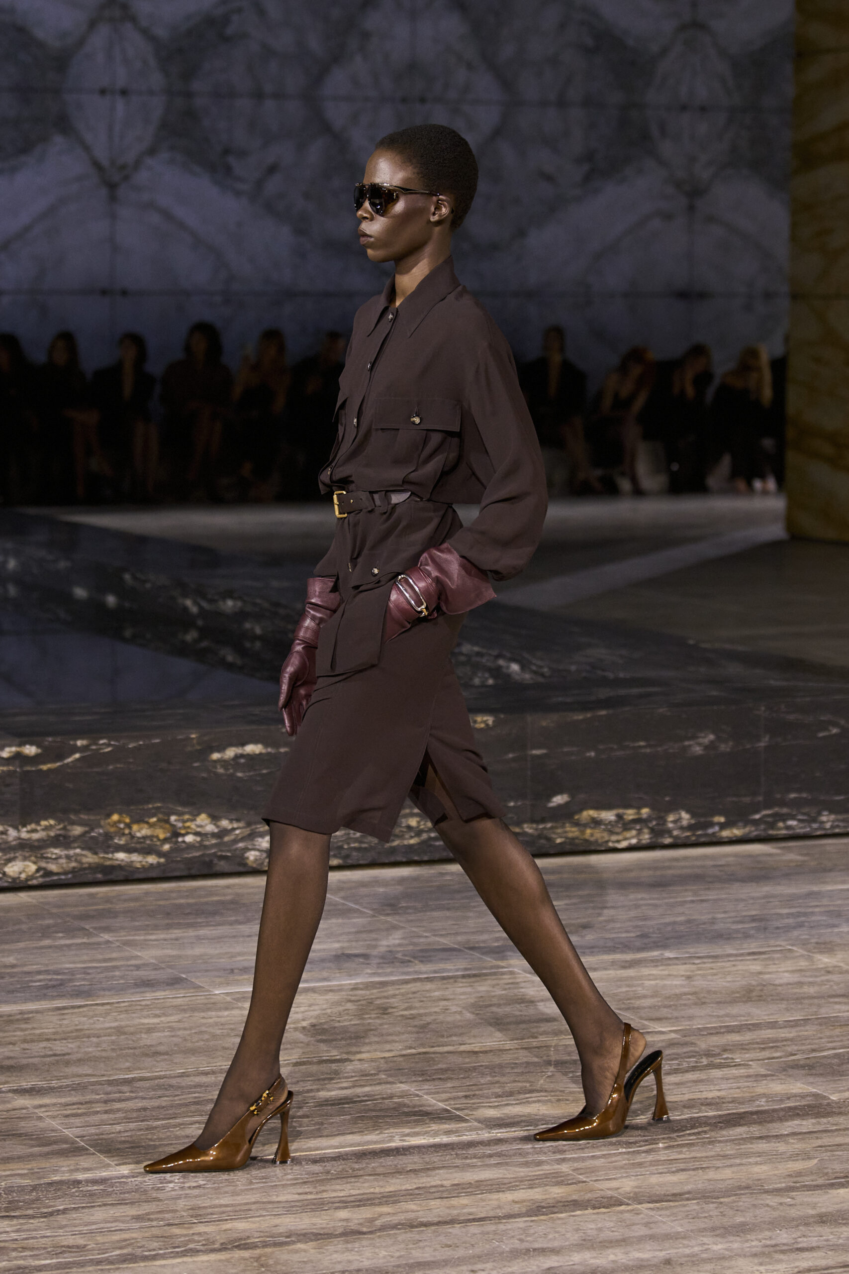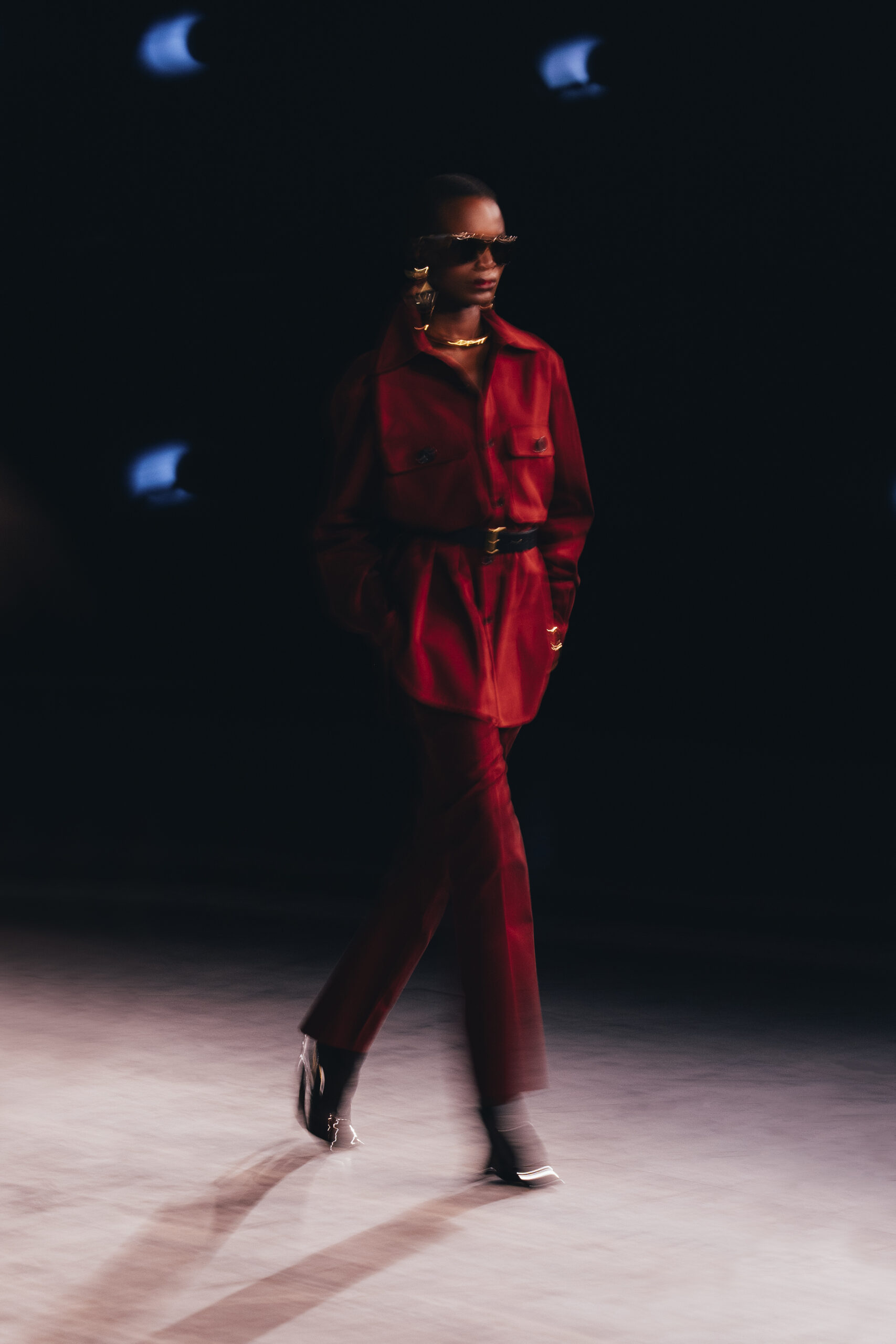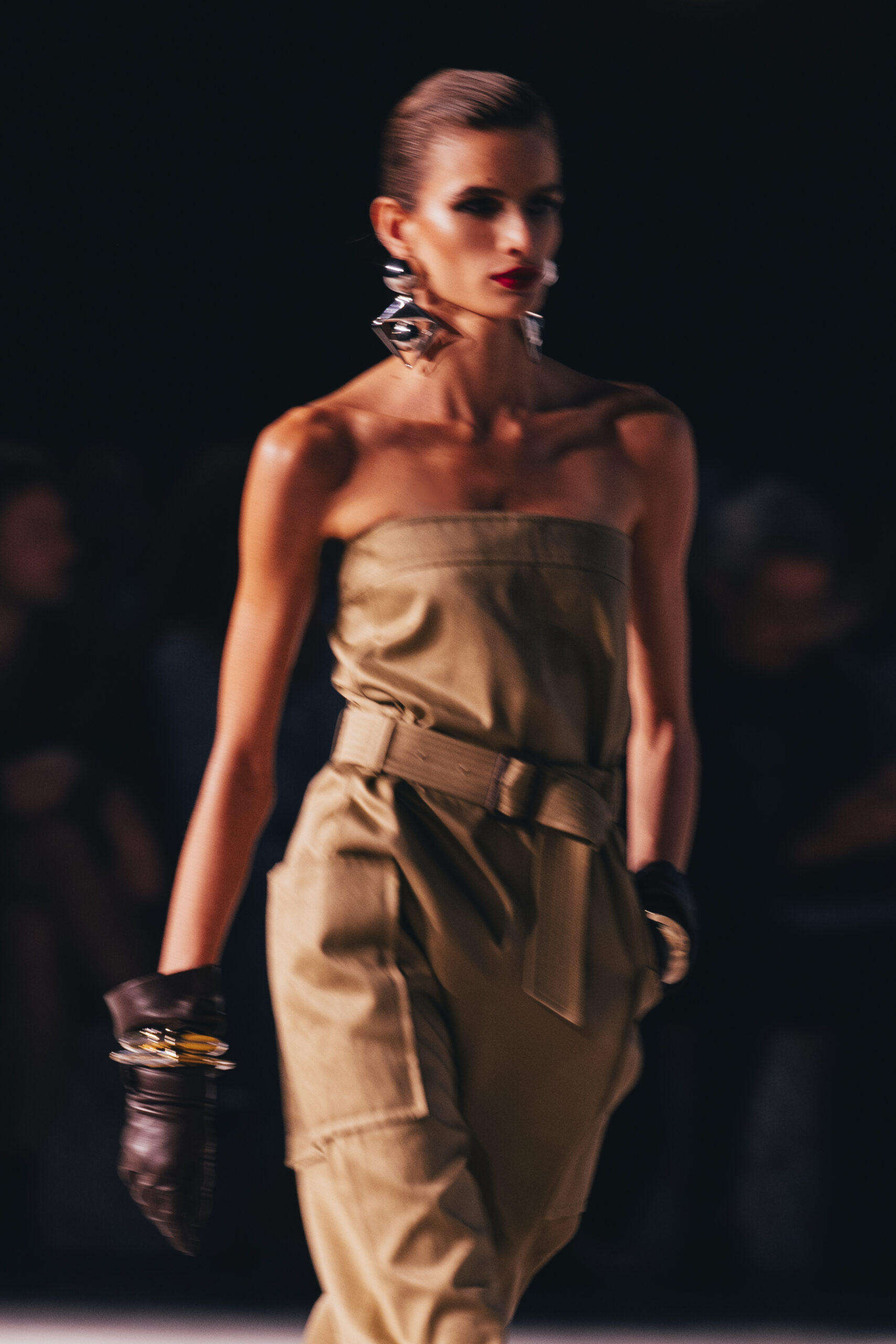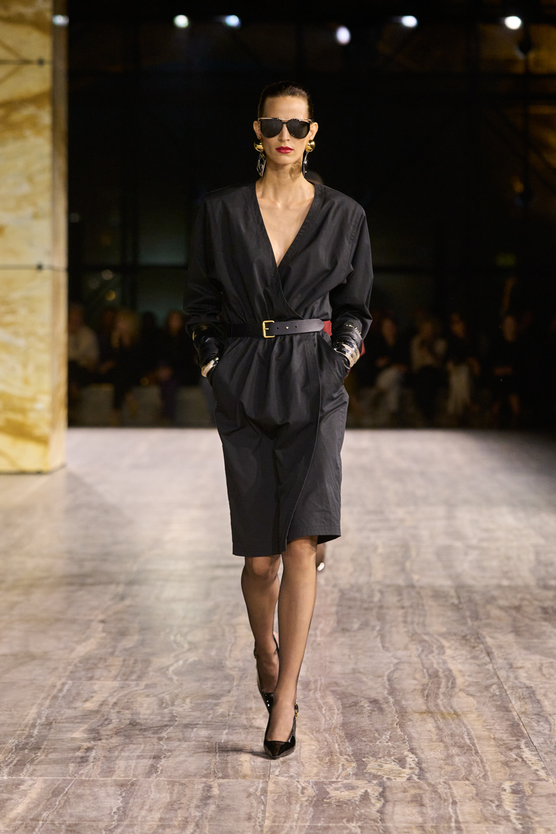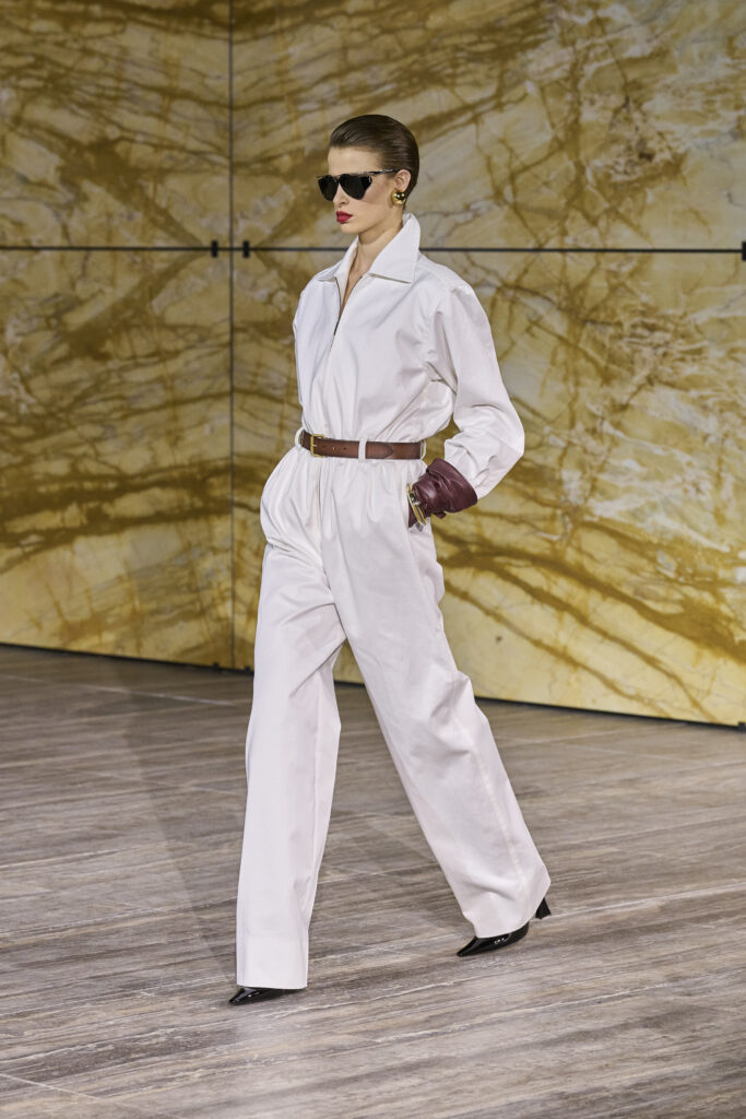 La veste safari et la combinaison trouvent ici des versions sophistiquées grâce à un travail sur les volumes et les détails, tels que les ceintures marquant la taille. Les coupes empruntées au vestiaire masculin se parent de notes raffinées comme les gants et talons aiguilles.