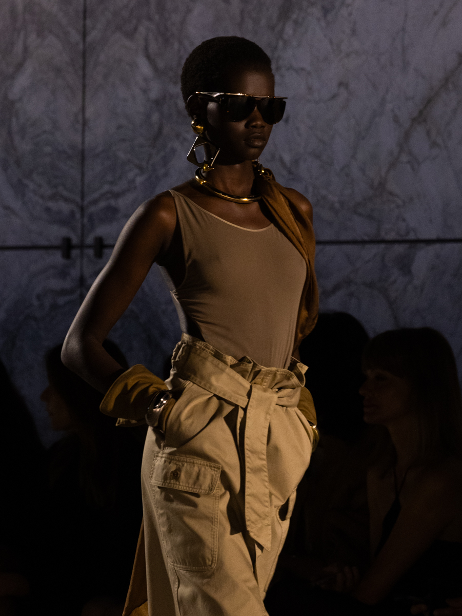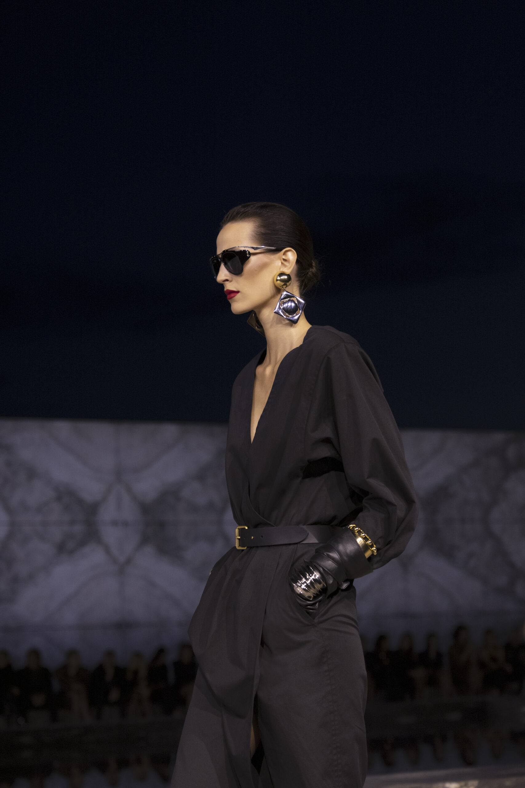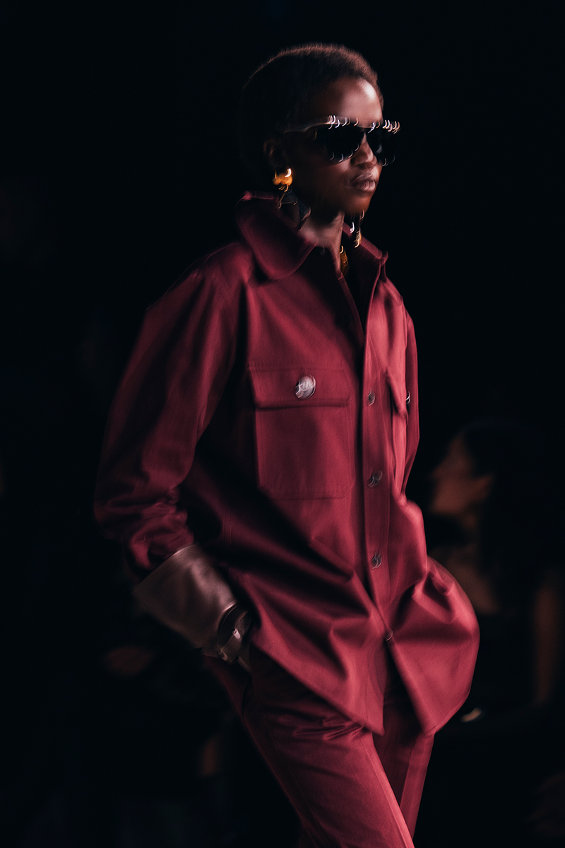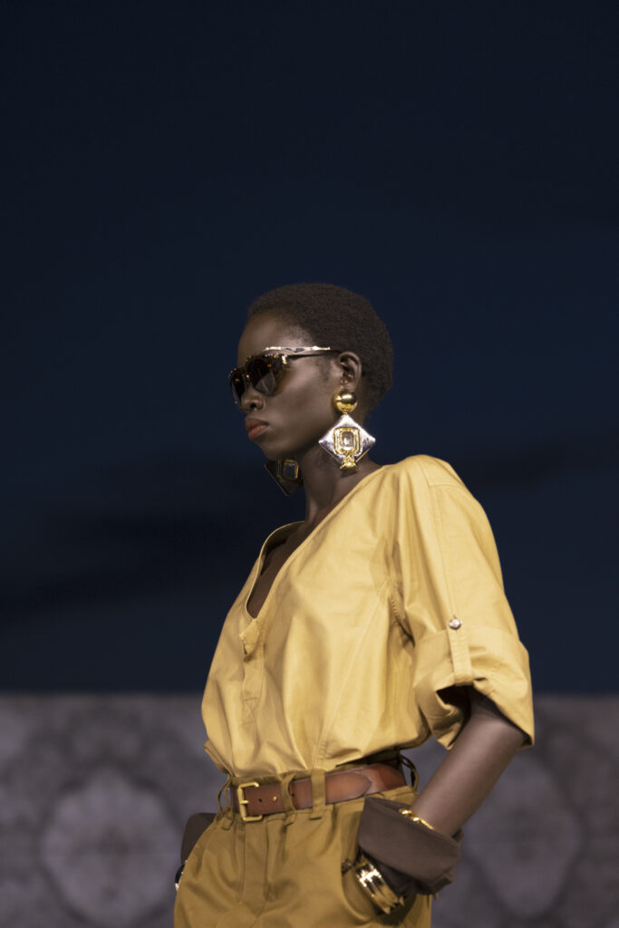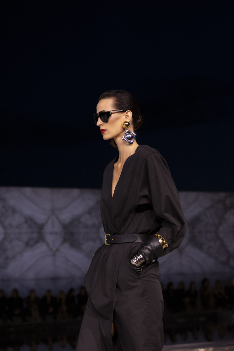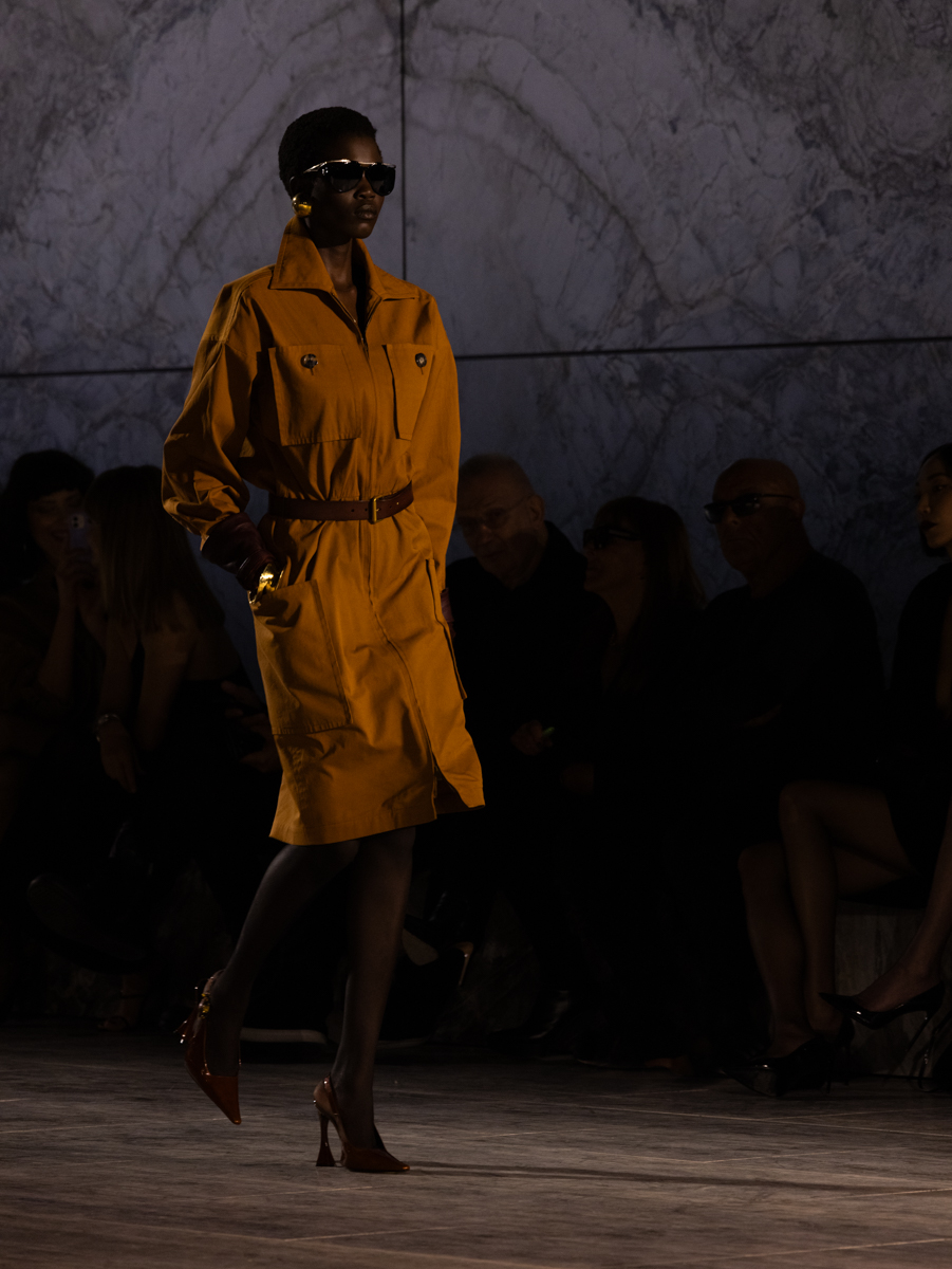 La veste safari et la combinaison trouvent ici des versions sophistiquées grâce à un travail sur les volumes et les détails, tels que les ceintures marquant la taille. Les coupes empruntées au vestiaire masculin se parent de notes raffinées comme les gants et talons aiguilles.