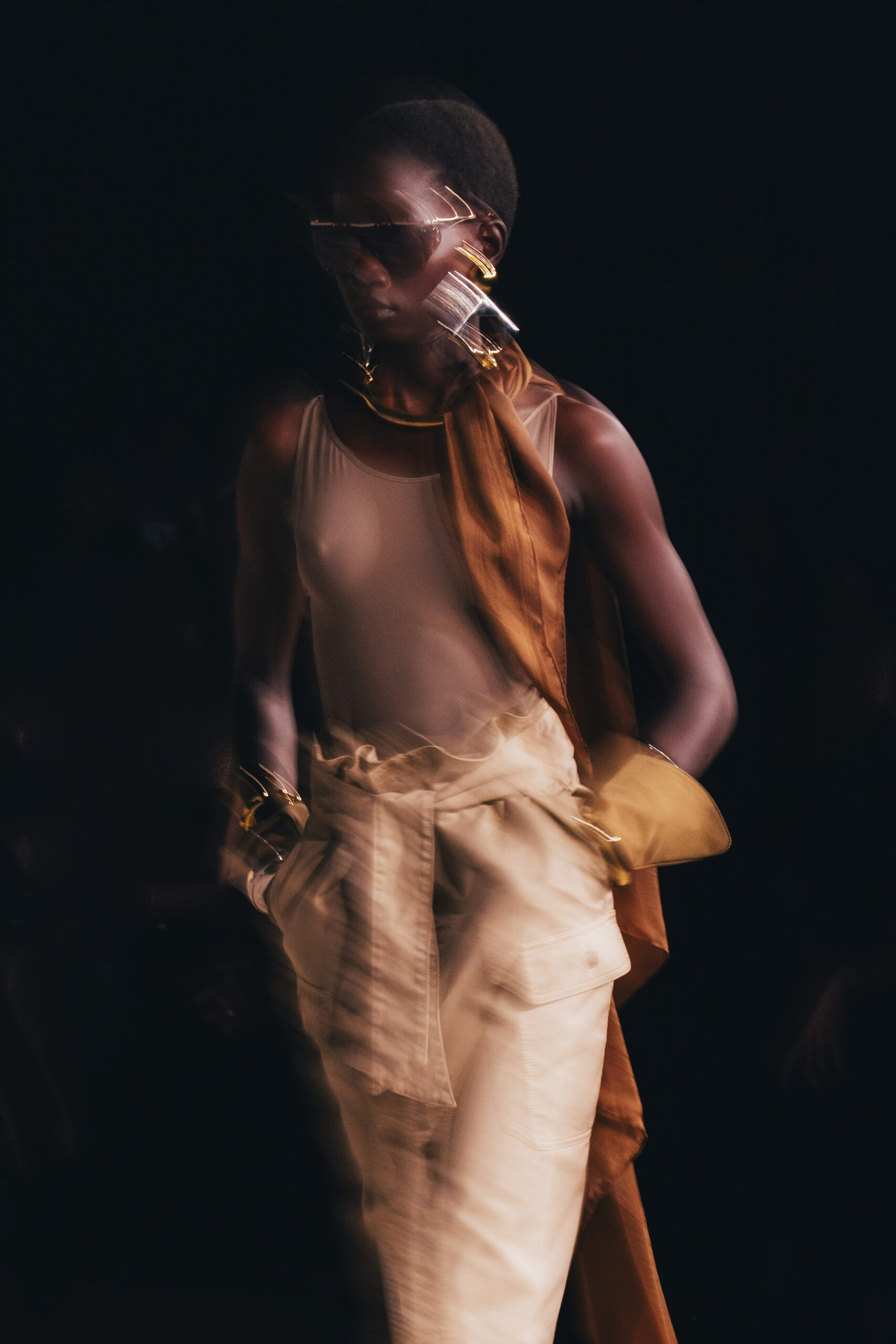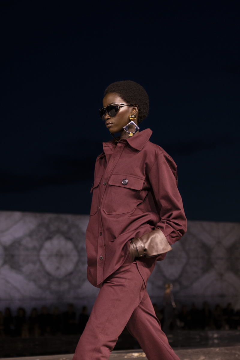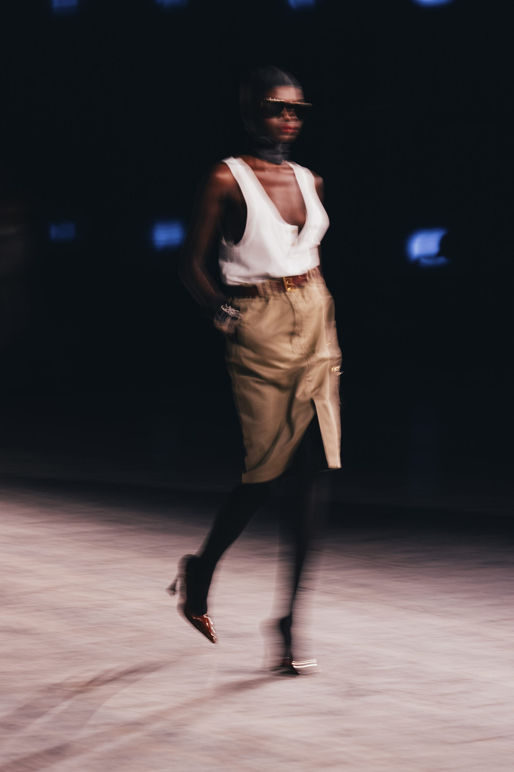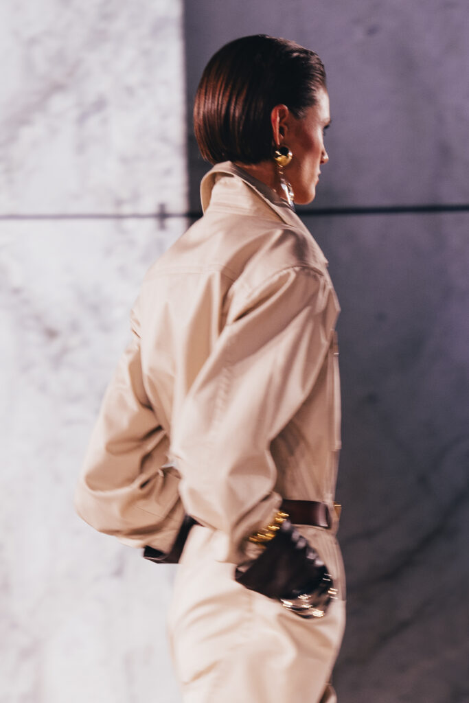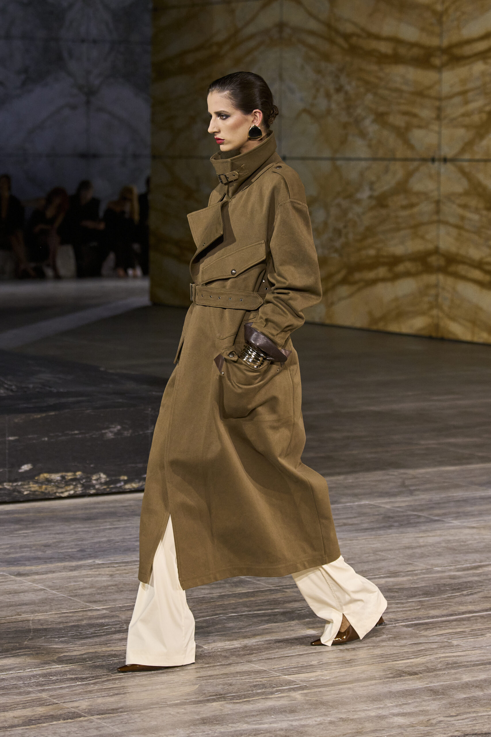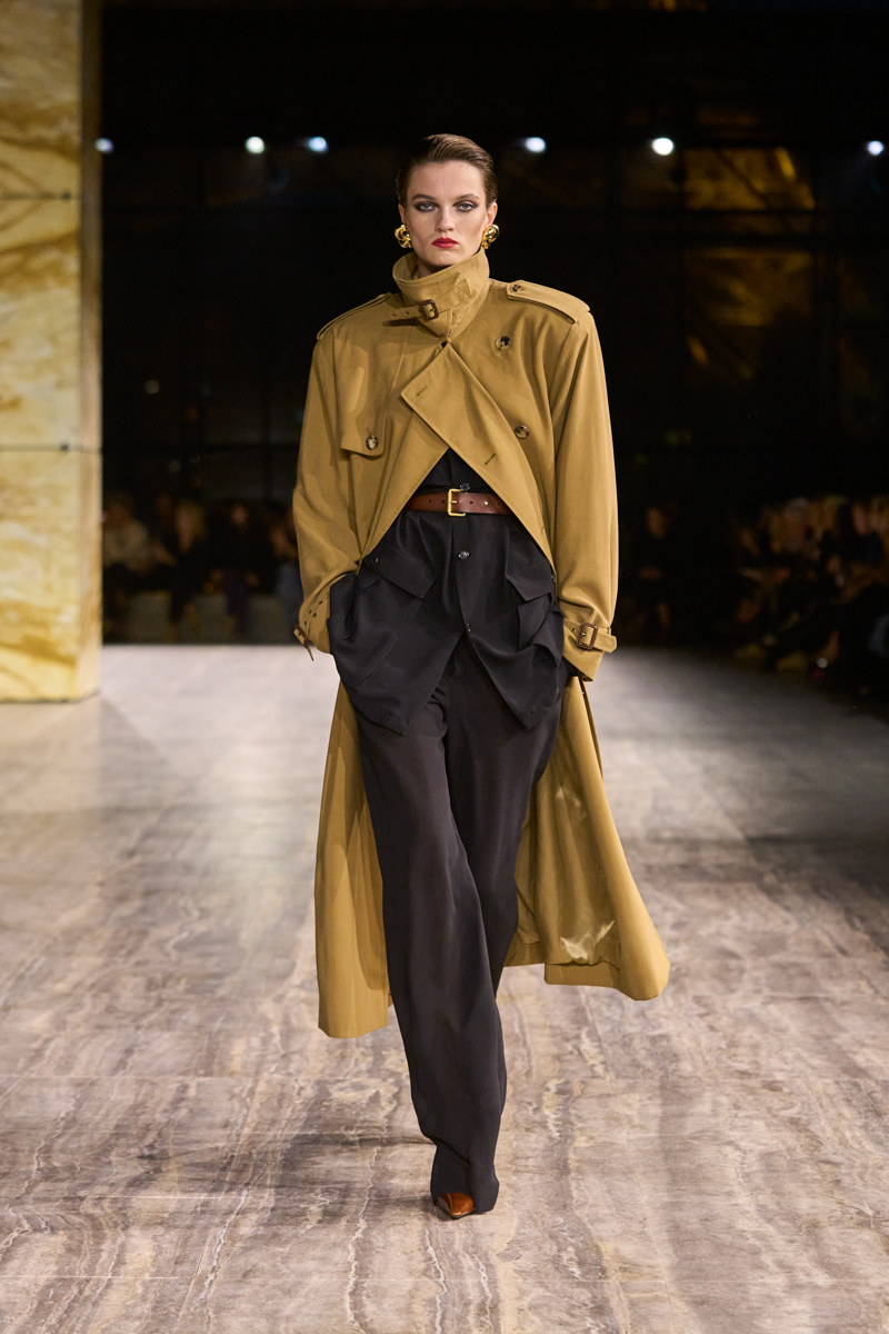 La veste safari et la combinaison trouvent ici des versions sophistiquées grâce à un travail sur les volumes et les détails, tels que les ceintures marquant la taille. Les coupes empruntées au vestiaire masculin se parent de notes raffinées comme les gants et talons aiguilles.