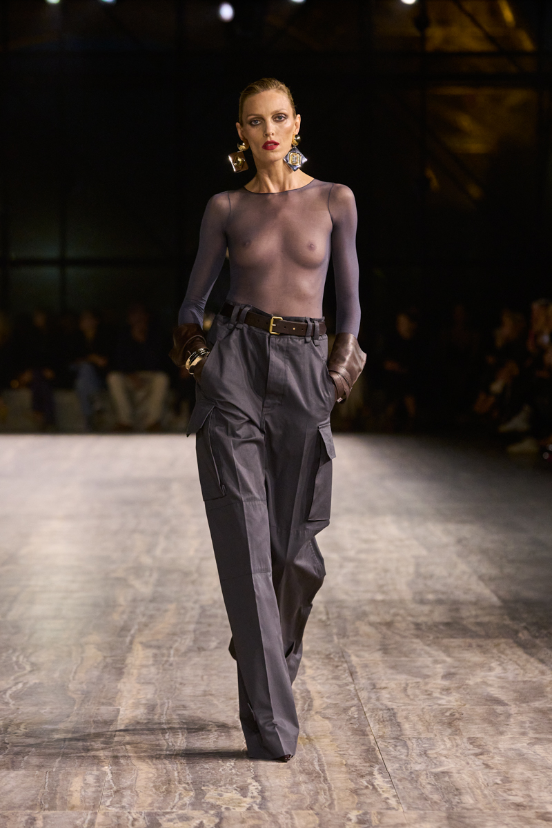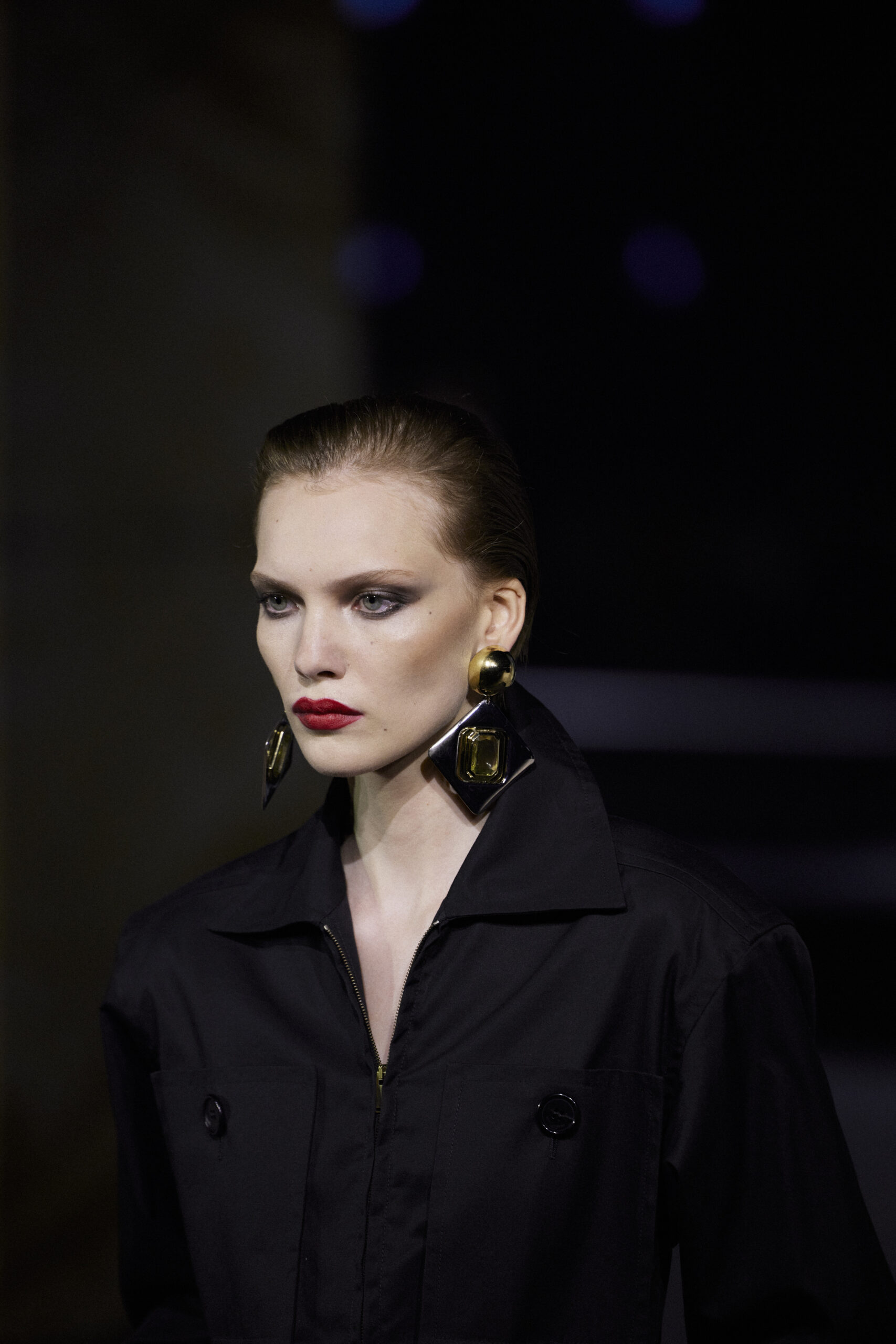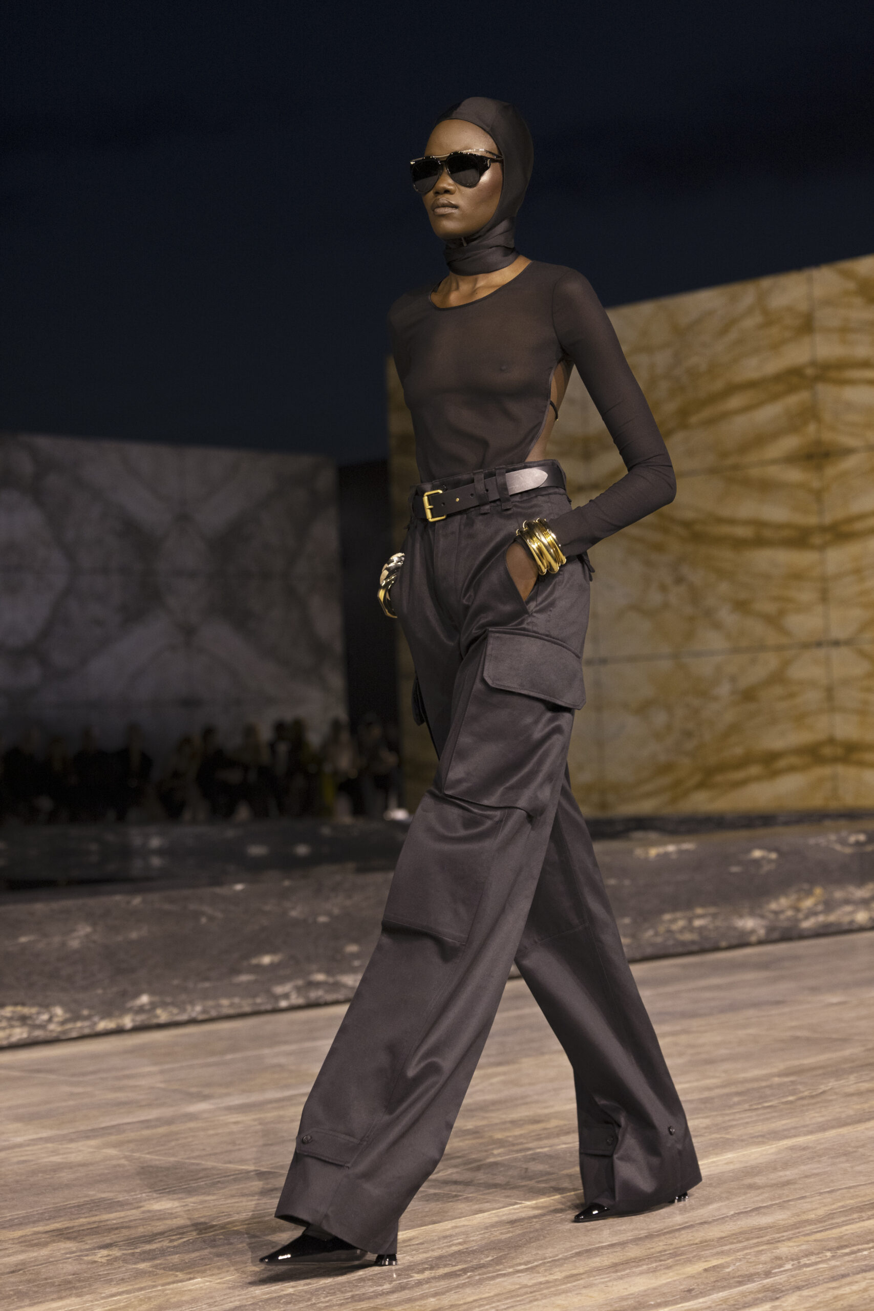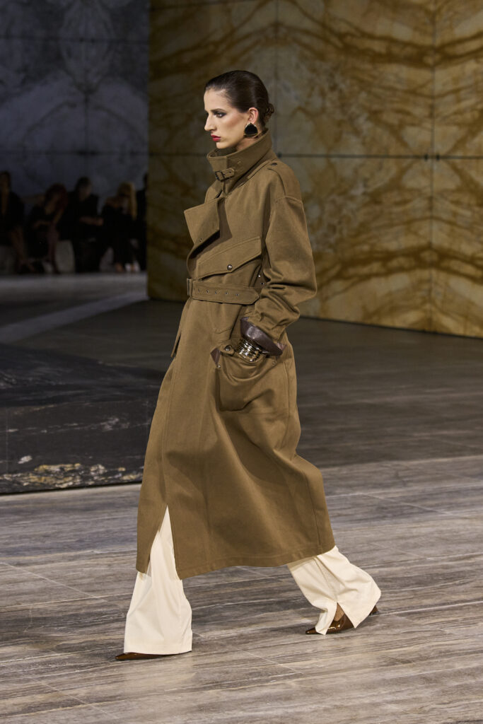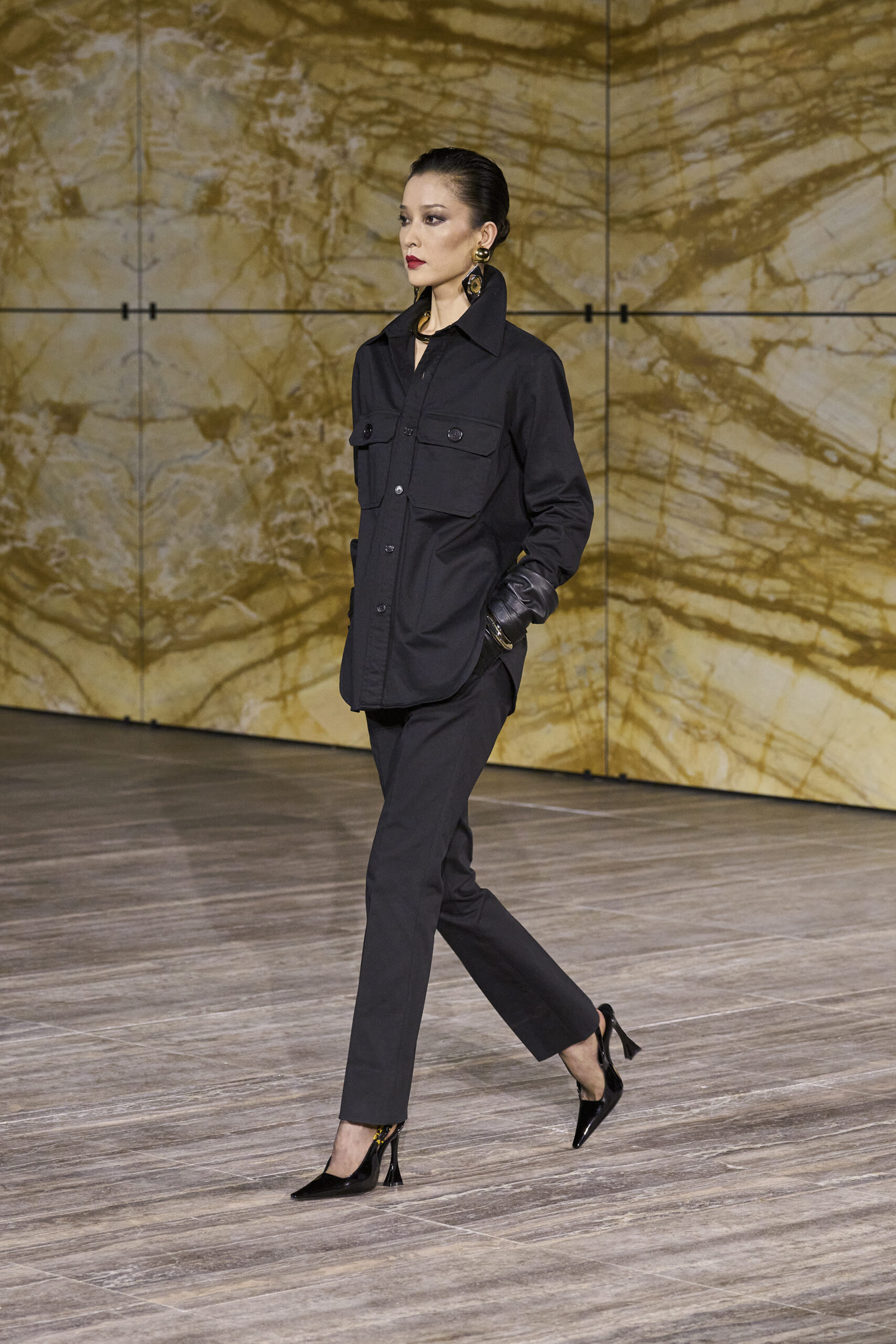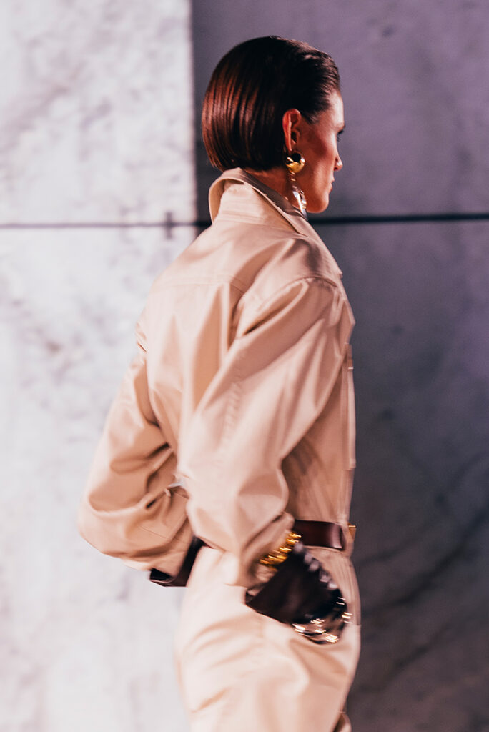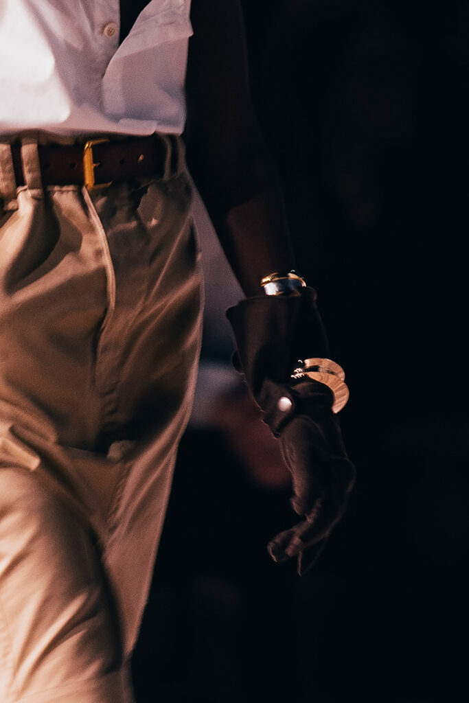 La veste safari et la combinaison trouvent ici des versions sophistiquées grâce à un travail sur les volumes et les détails, tels que les ceintures marquant la taille. Les coupes empruntées au vestiaire masculin se parent de notes raffinées comme les gants et talons aiguilles.