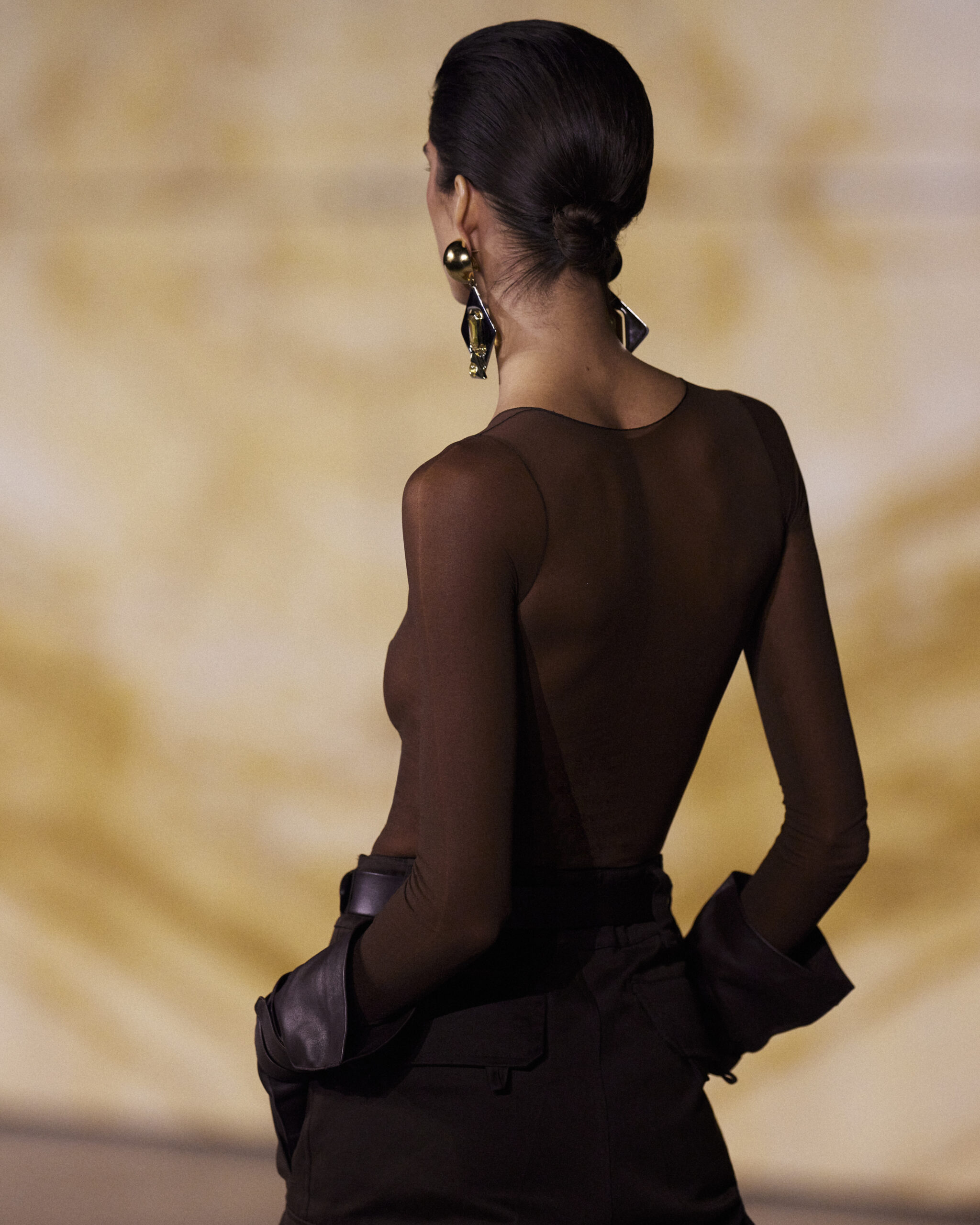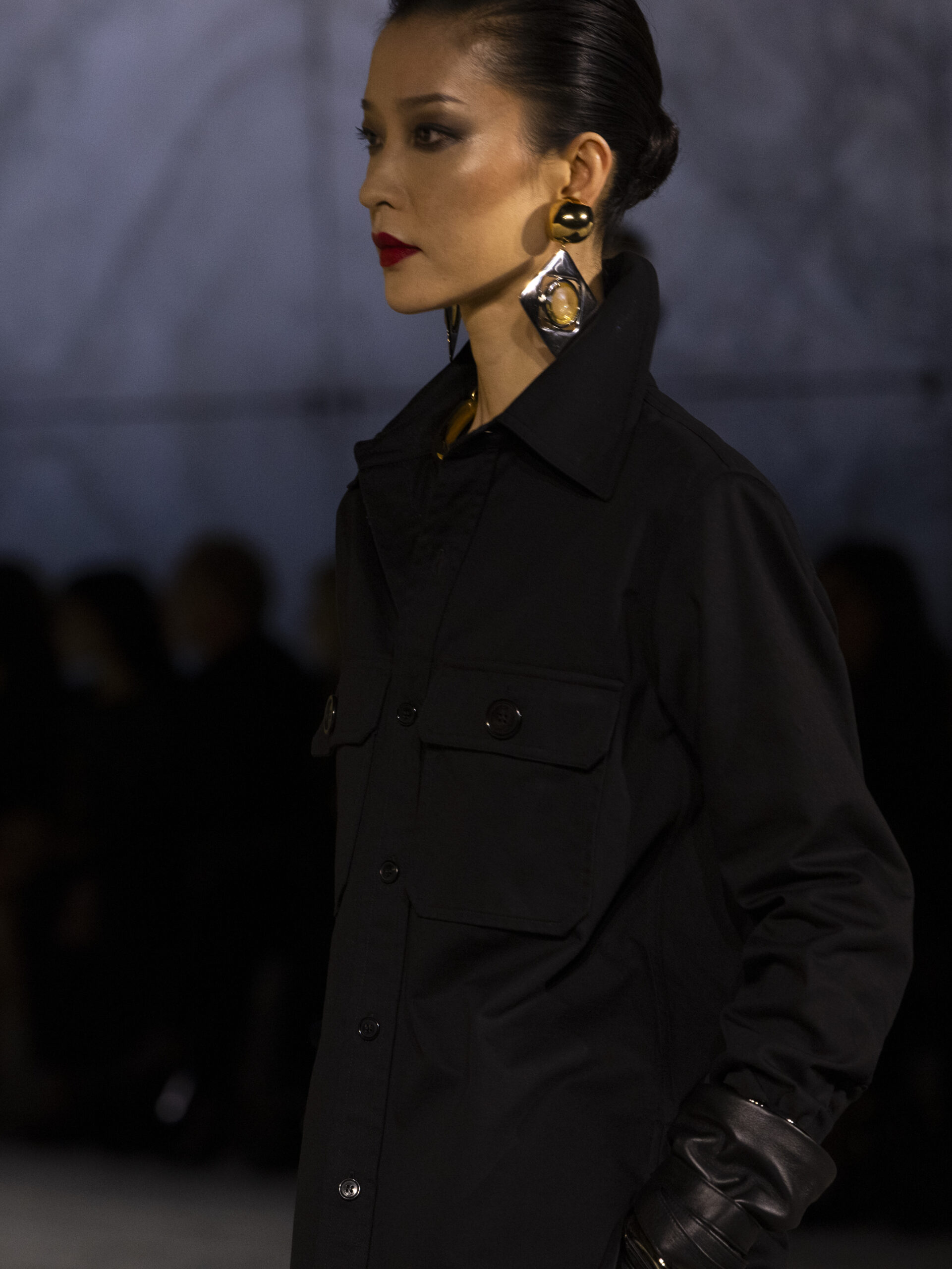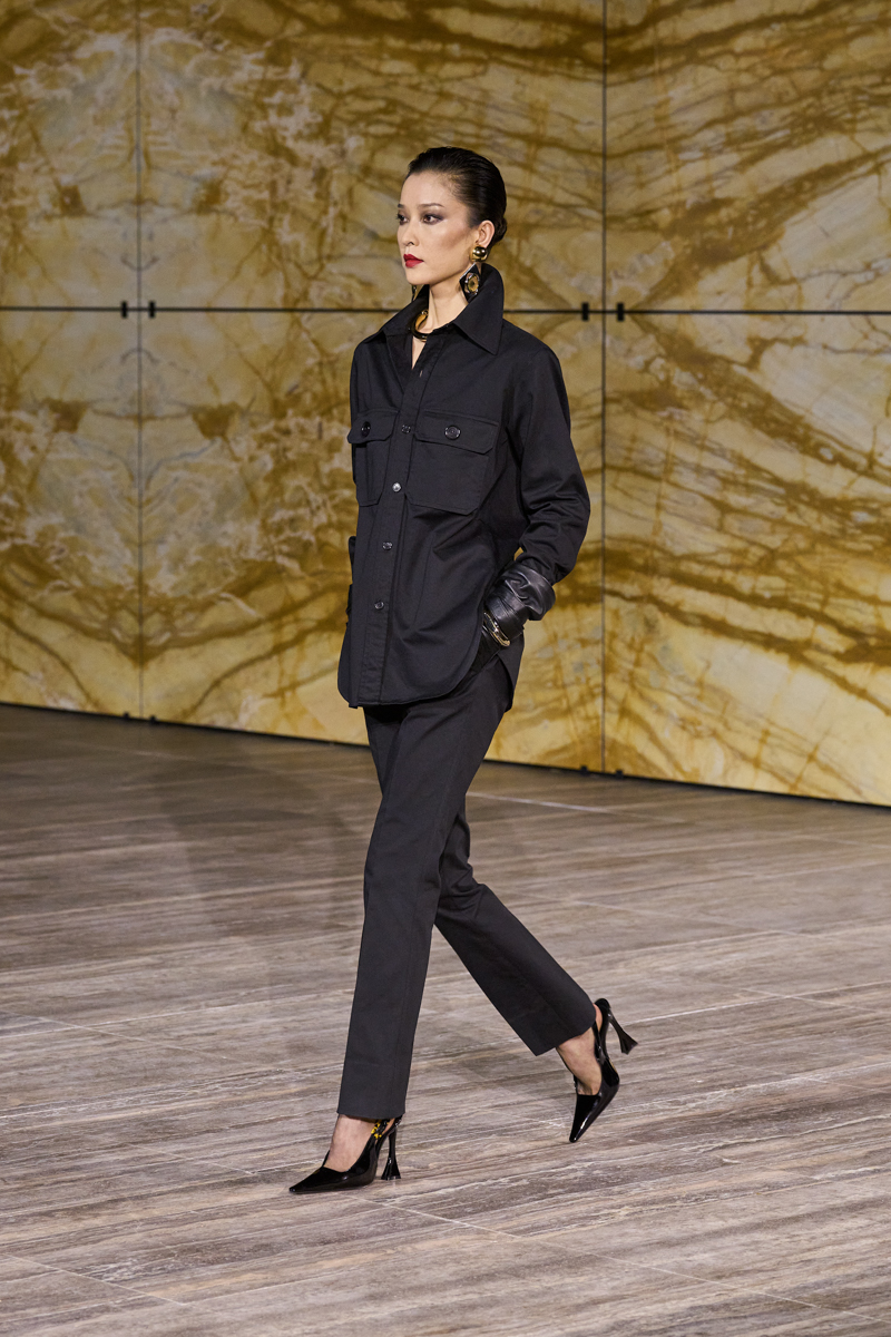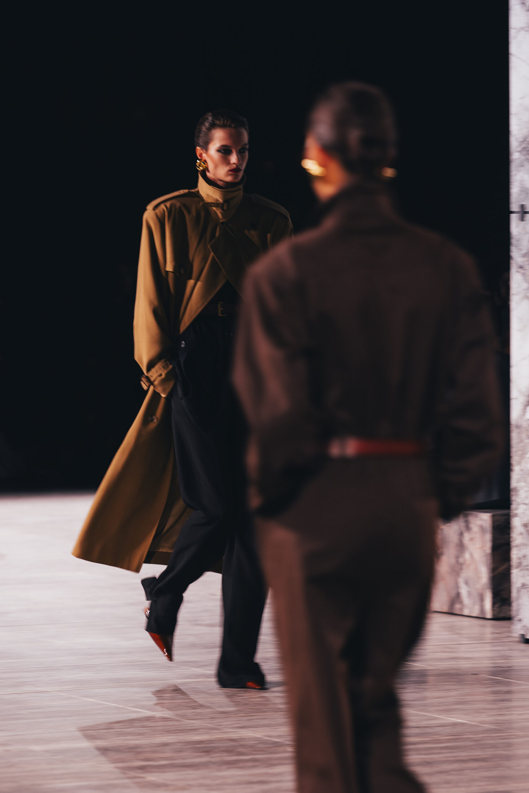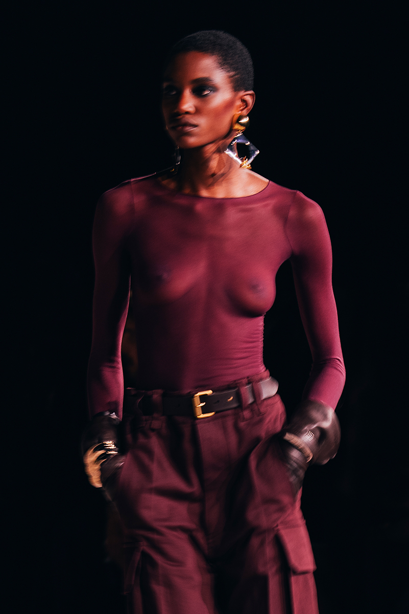 La veste safari et la combinaison trouvent ici des versions sophistiquées grâce à un travail sur les volumes et les détails, tels que les ceintures marquant la taille. Les coupes empruntées au vestiaire masculin se parent de notes raffinées comme les gants et talons aiguilles.