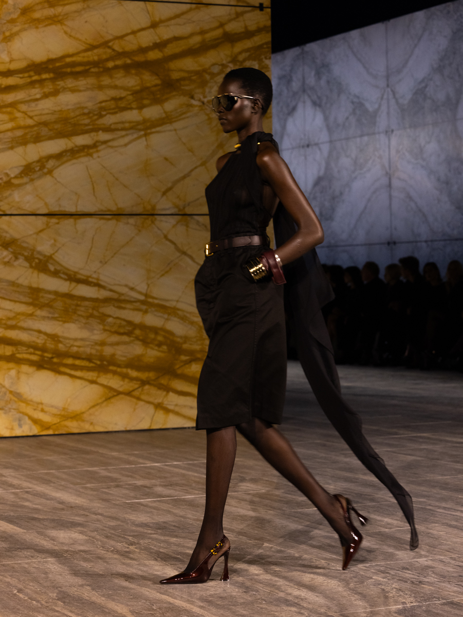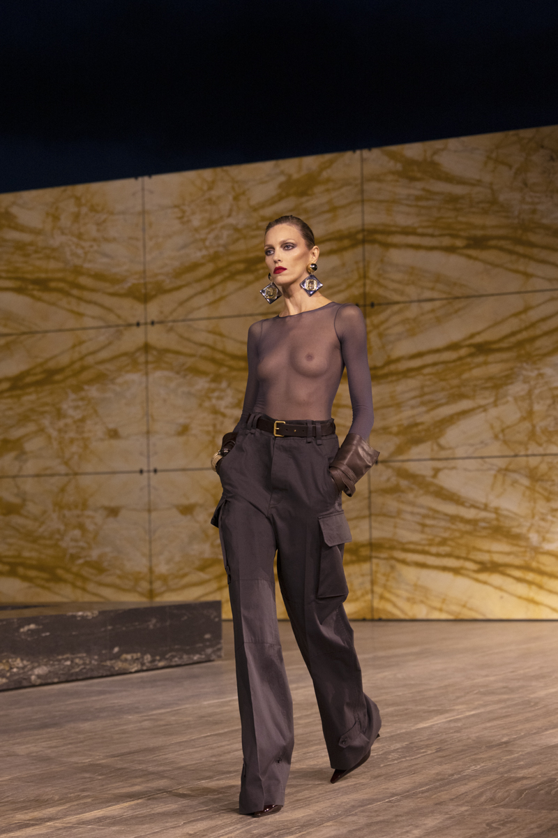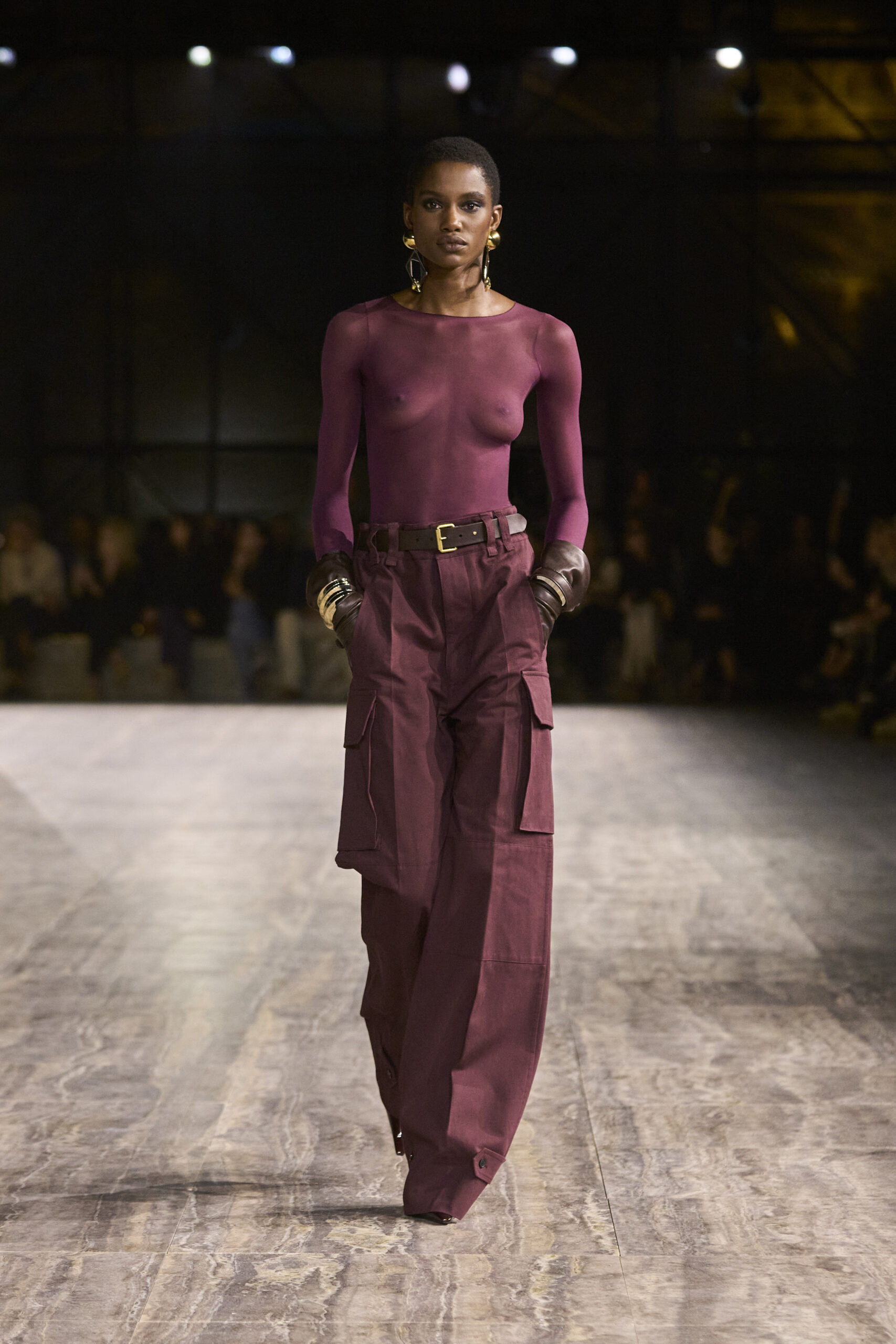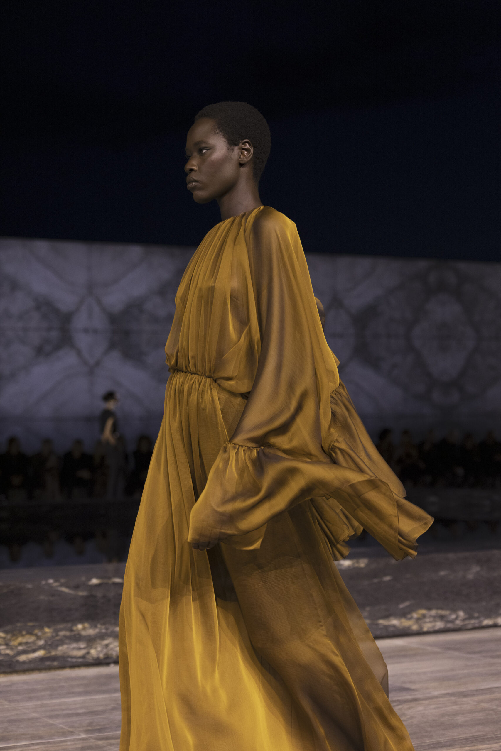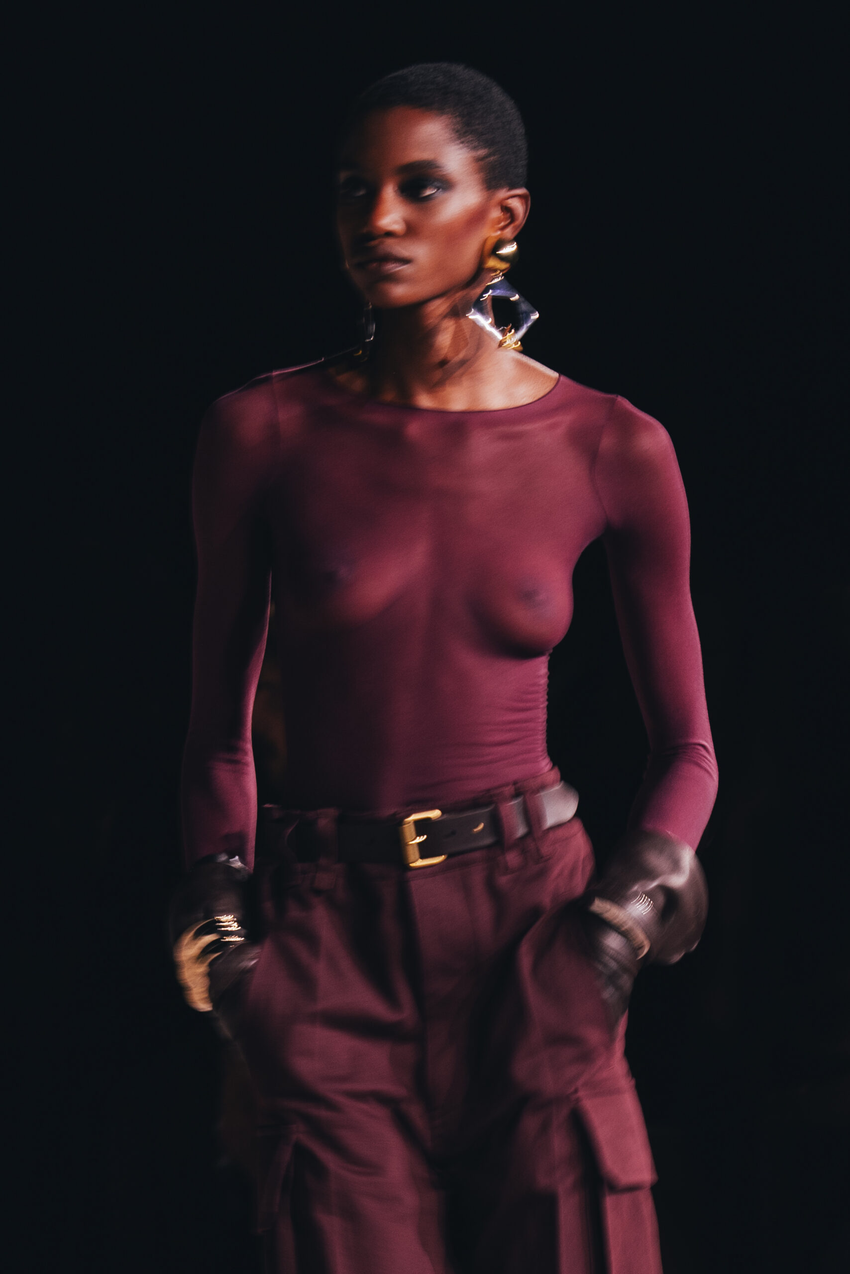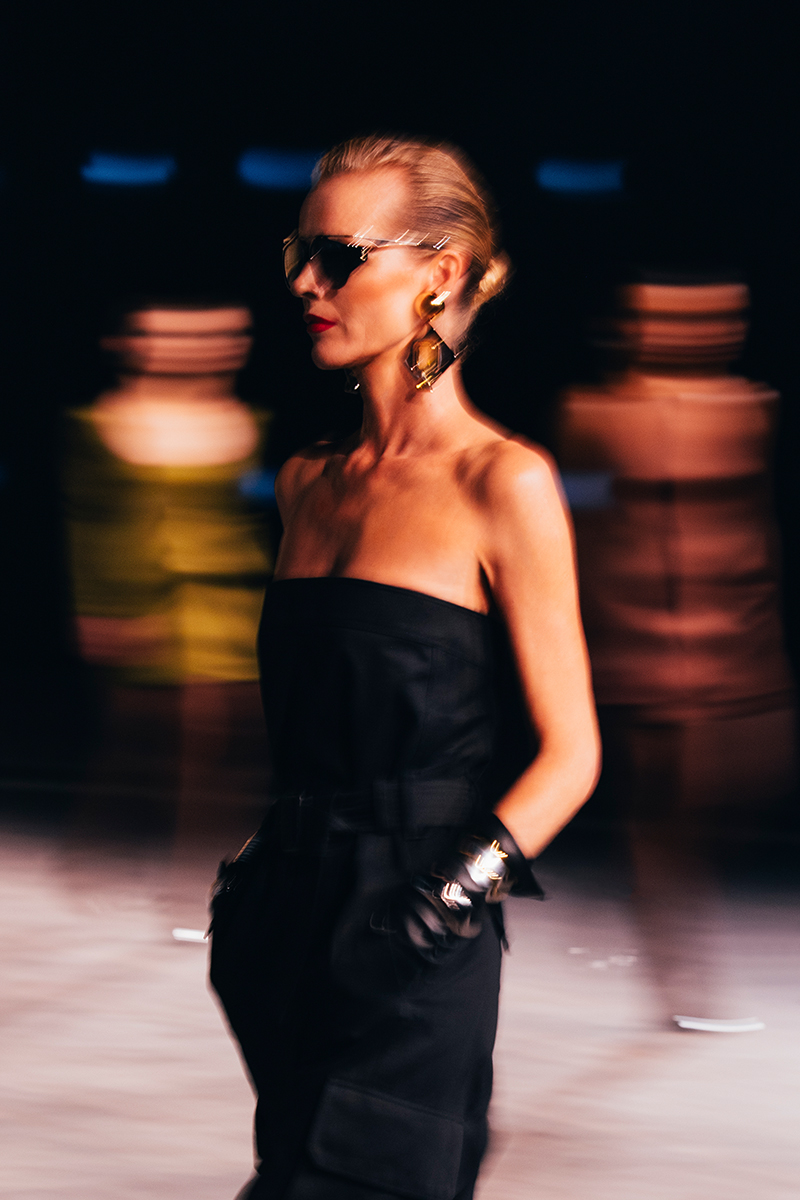 La veste safari et la combinaison trouvent ici des versions sophistiquées grâce à un travail sur les volumes et les détails, tels que les ceintures marquant la taille. Les coupes empruntées au vestiaire masculin se parent de notes raffinées comme les gants et talons aiguilles.