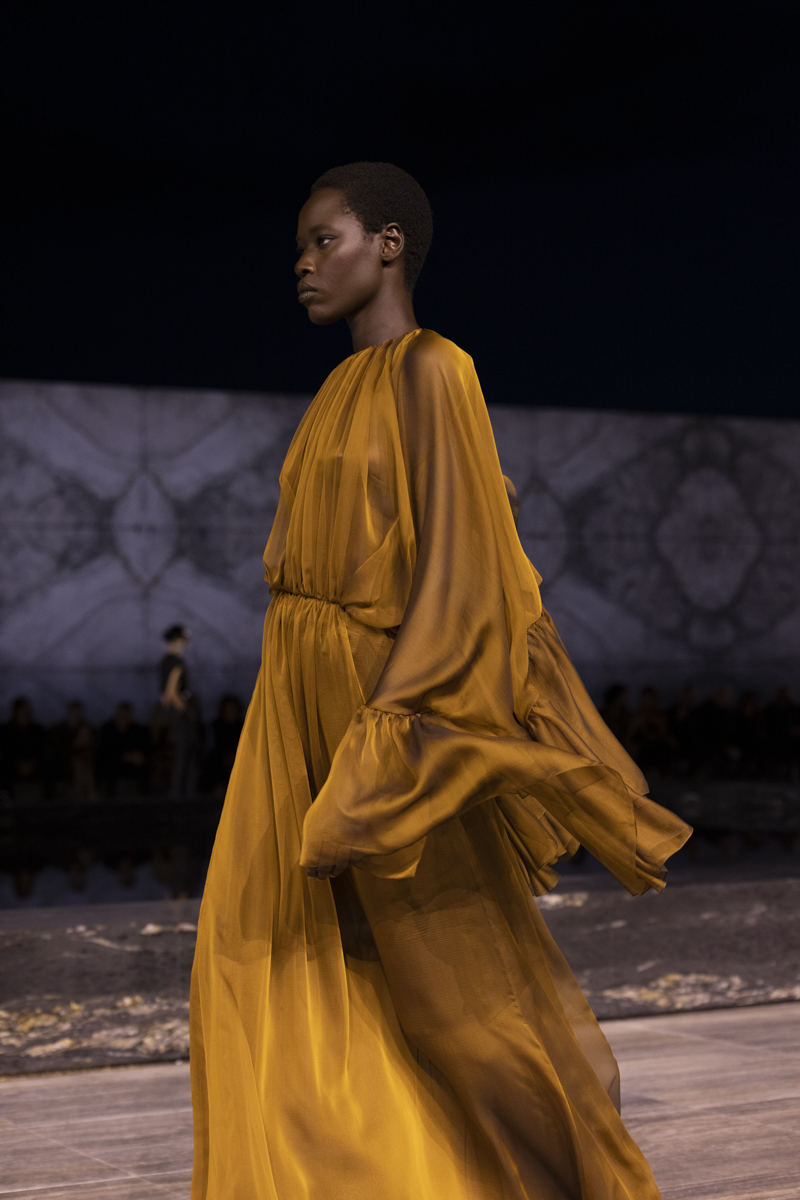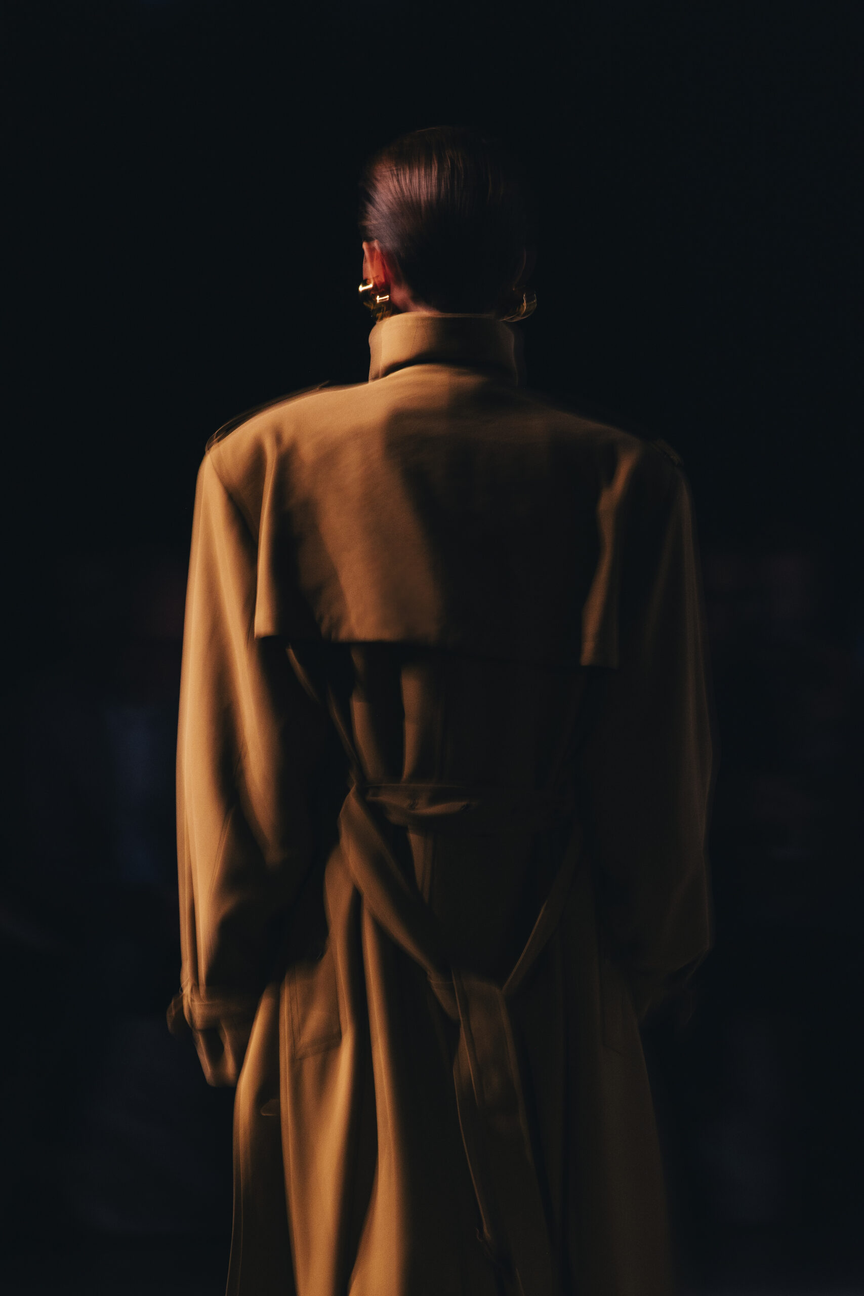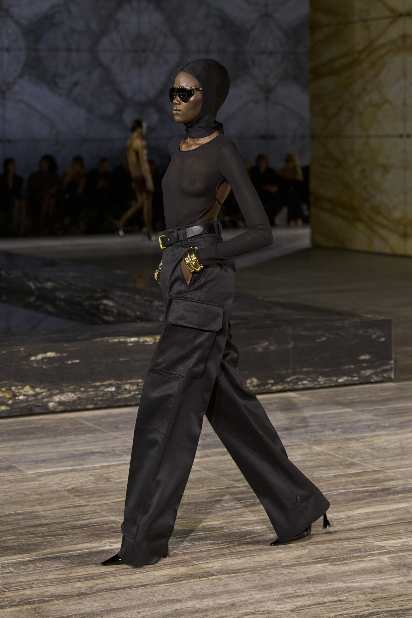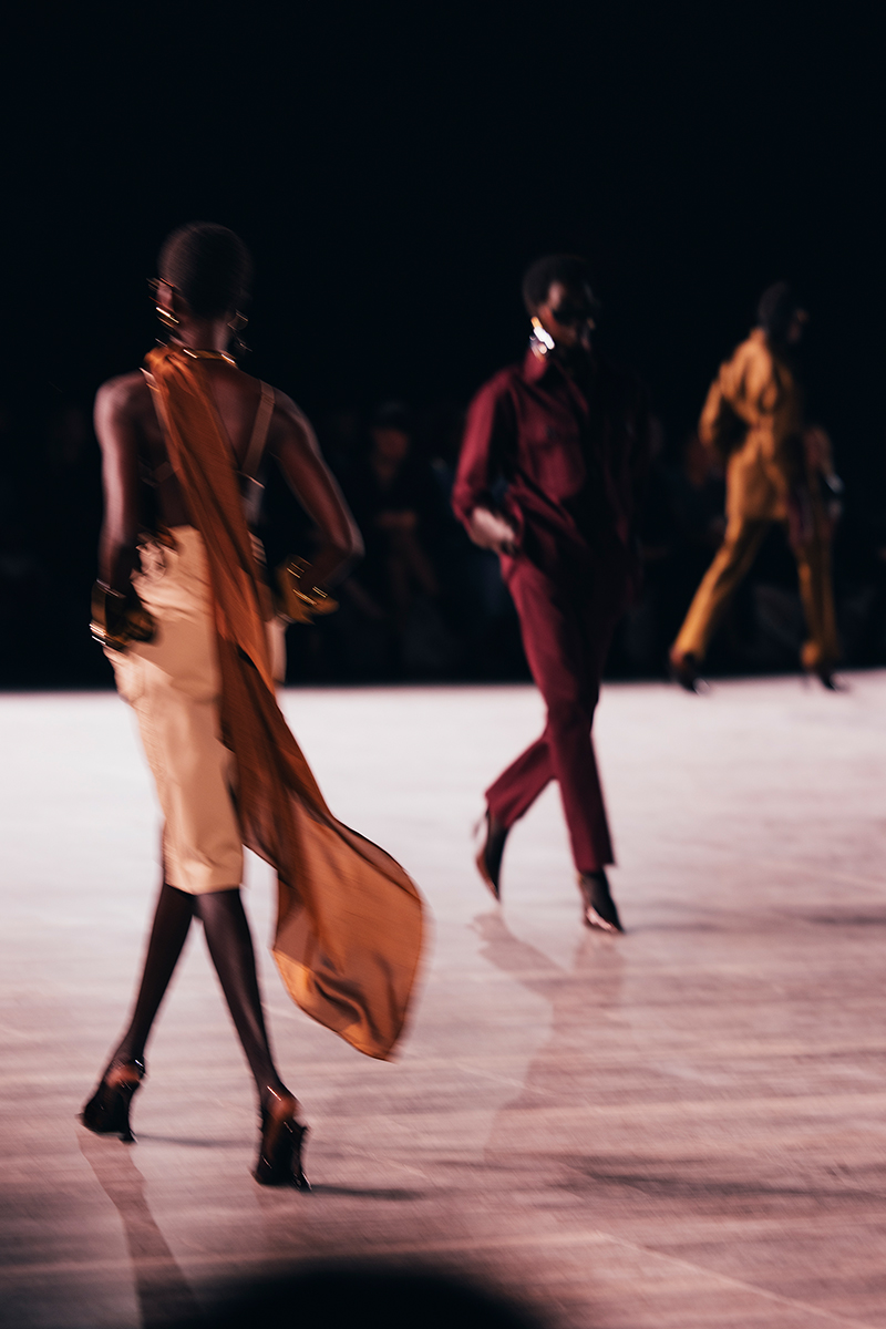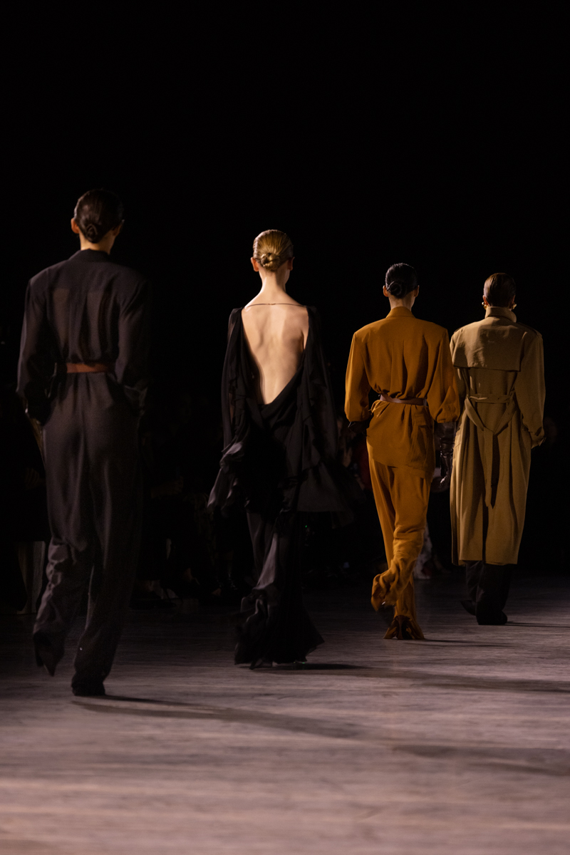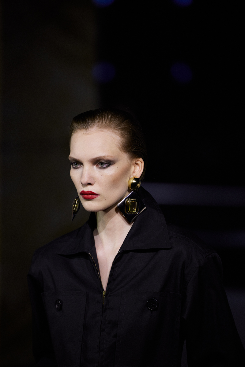 La veste safari et la combinaison trouvent ici des versions sophistiquées grâce à un travail sur les volumes et les détails, tels que les ceintures marquant la taille. Les coupes empruntées au vestiaire masculin se parent de notes raffinées comme les gants et talons aiguilles.