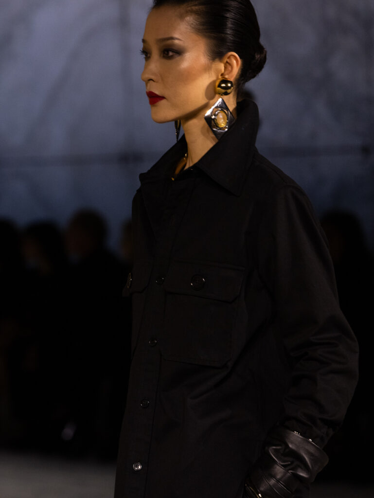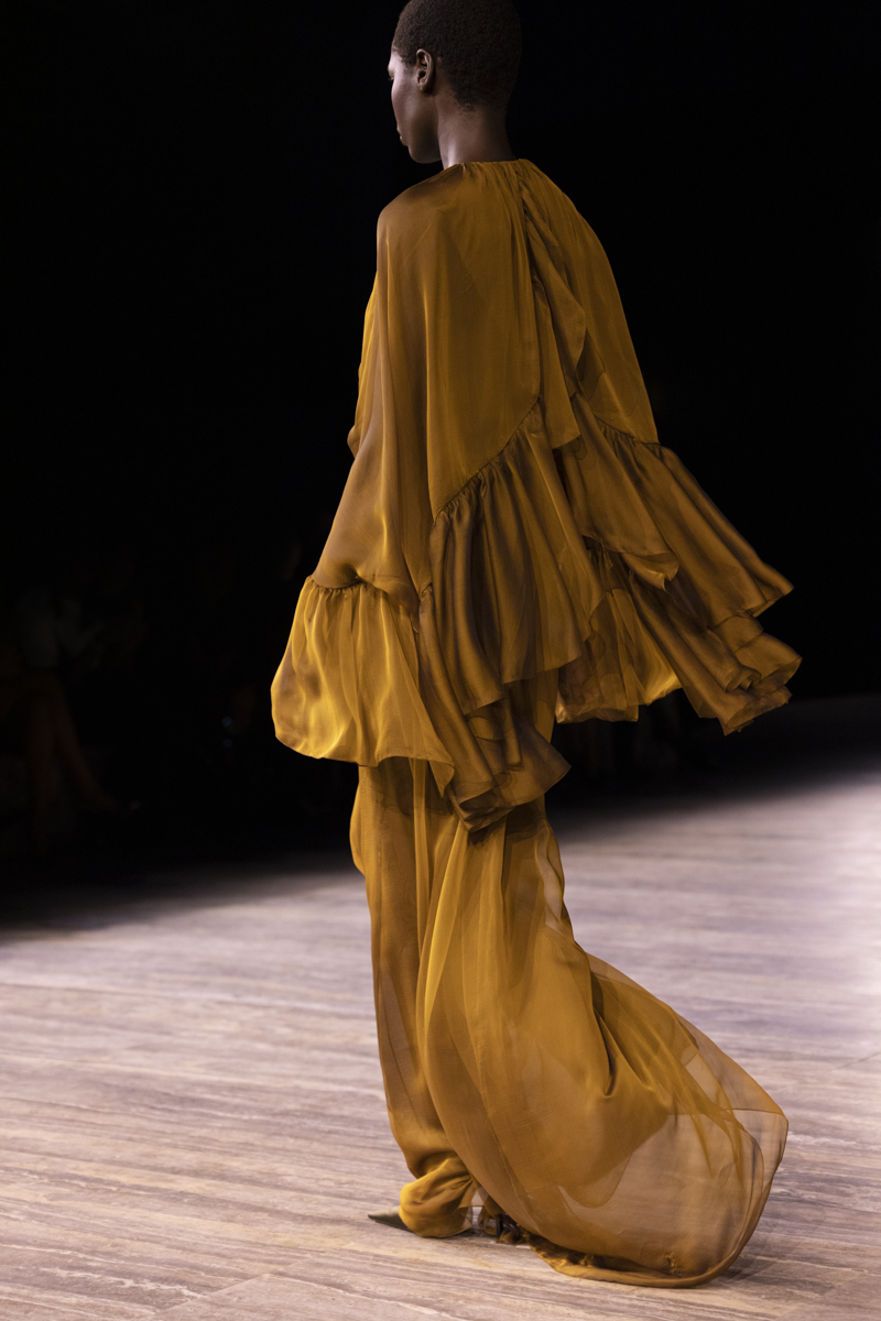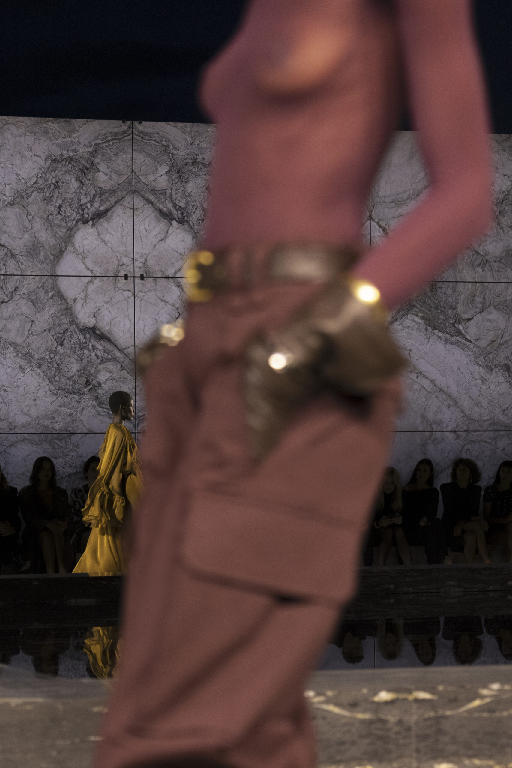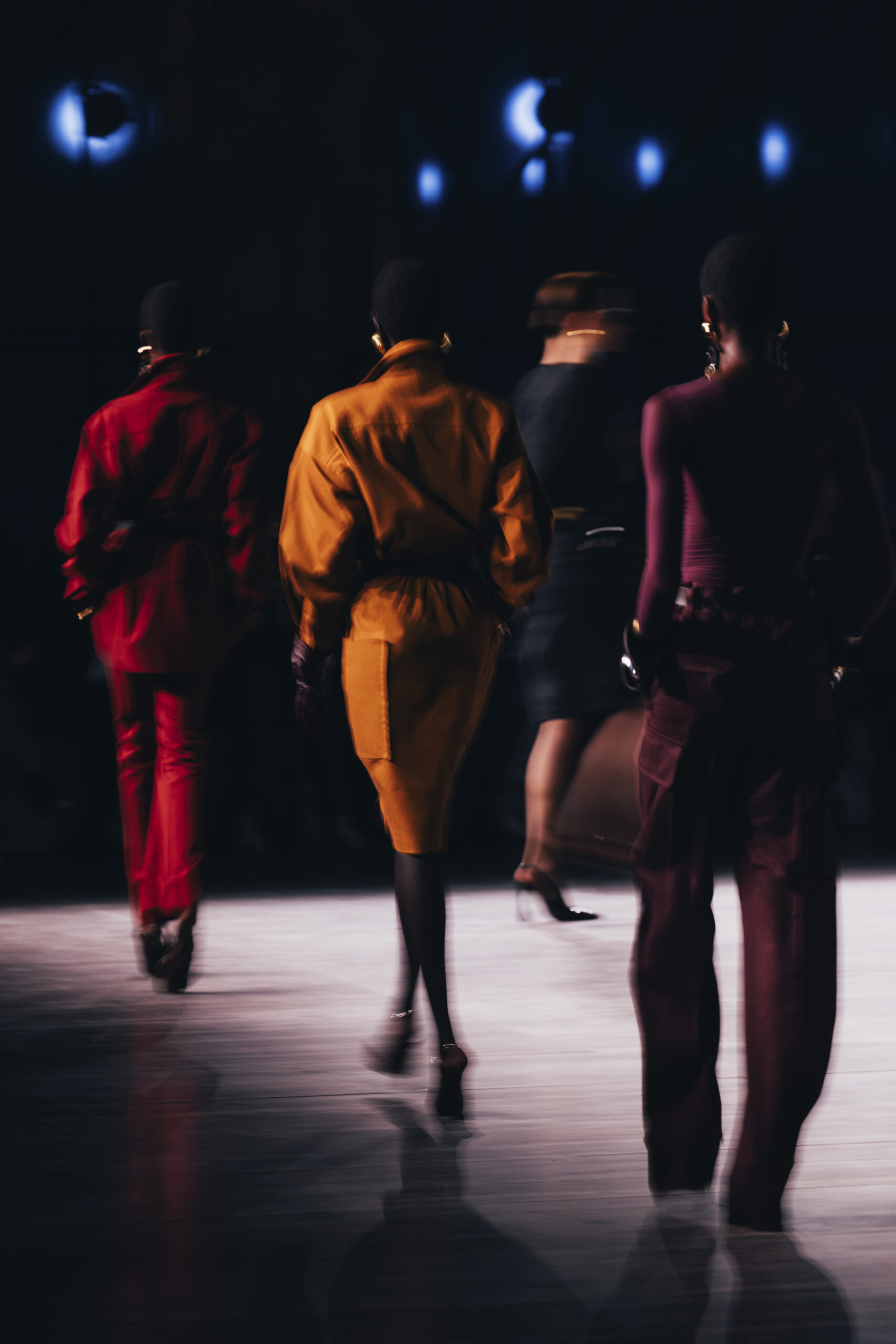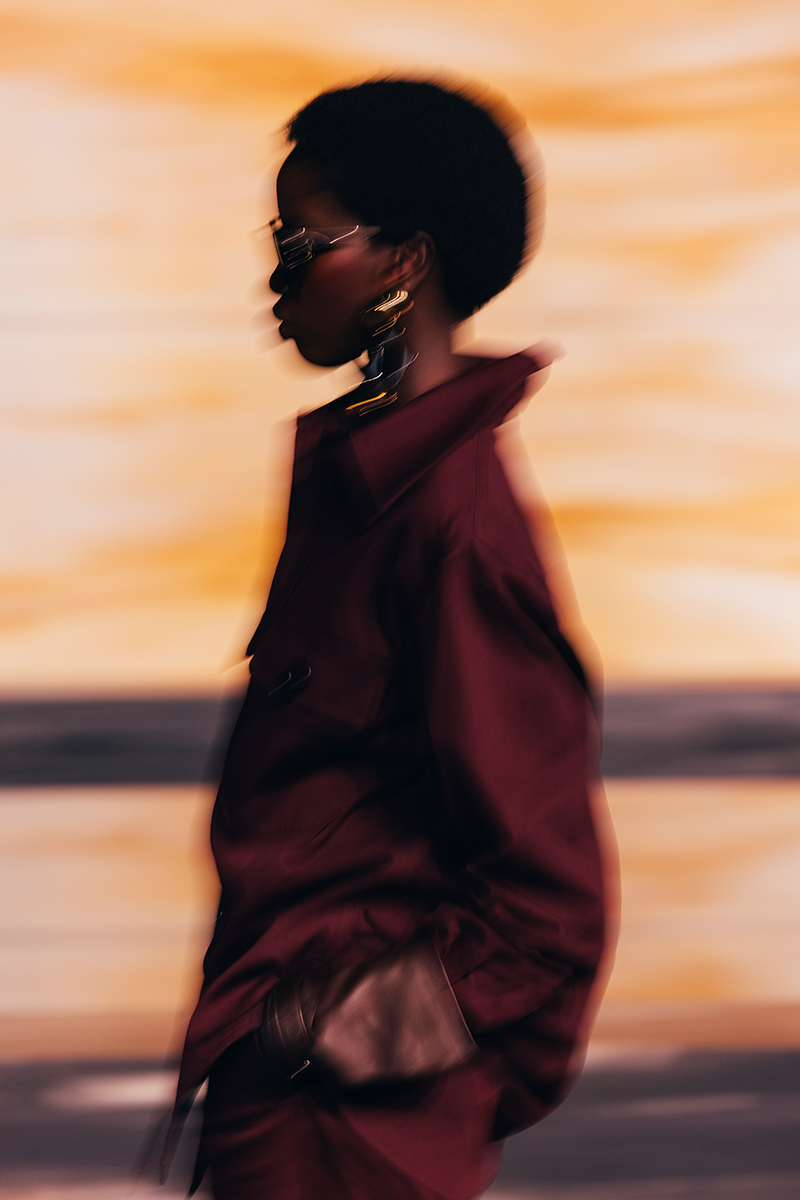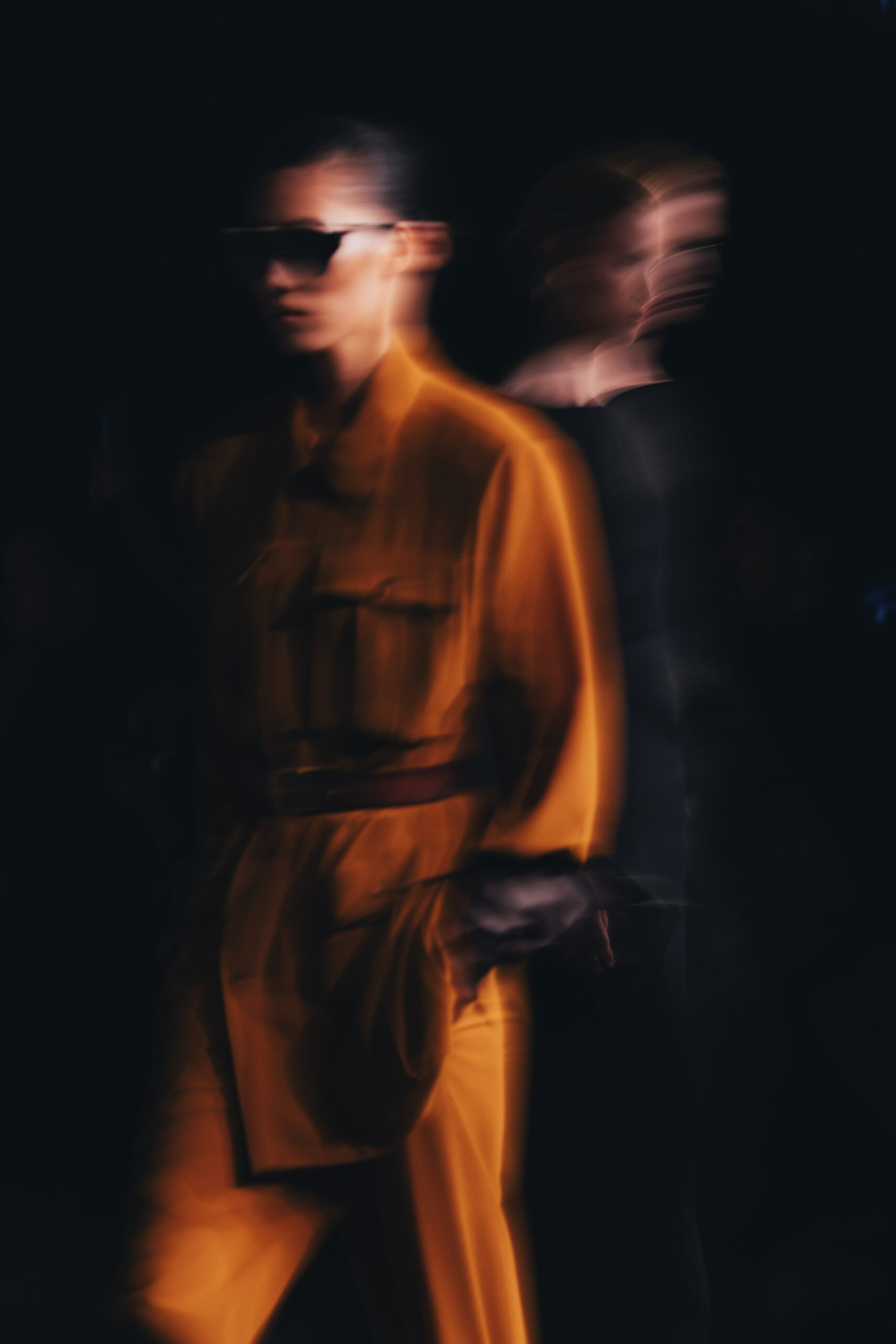 La veste safari et la combinaison trouvent ici des versions sophistiquées grâce à un travail sur les volumes et les détails, tels que les ceintures marquant la taille. Les coupes empruntées au vestiaire masculin se parent de notes raffinées comme les gants et talons aiguilles.