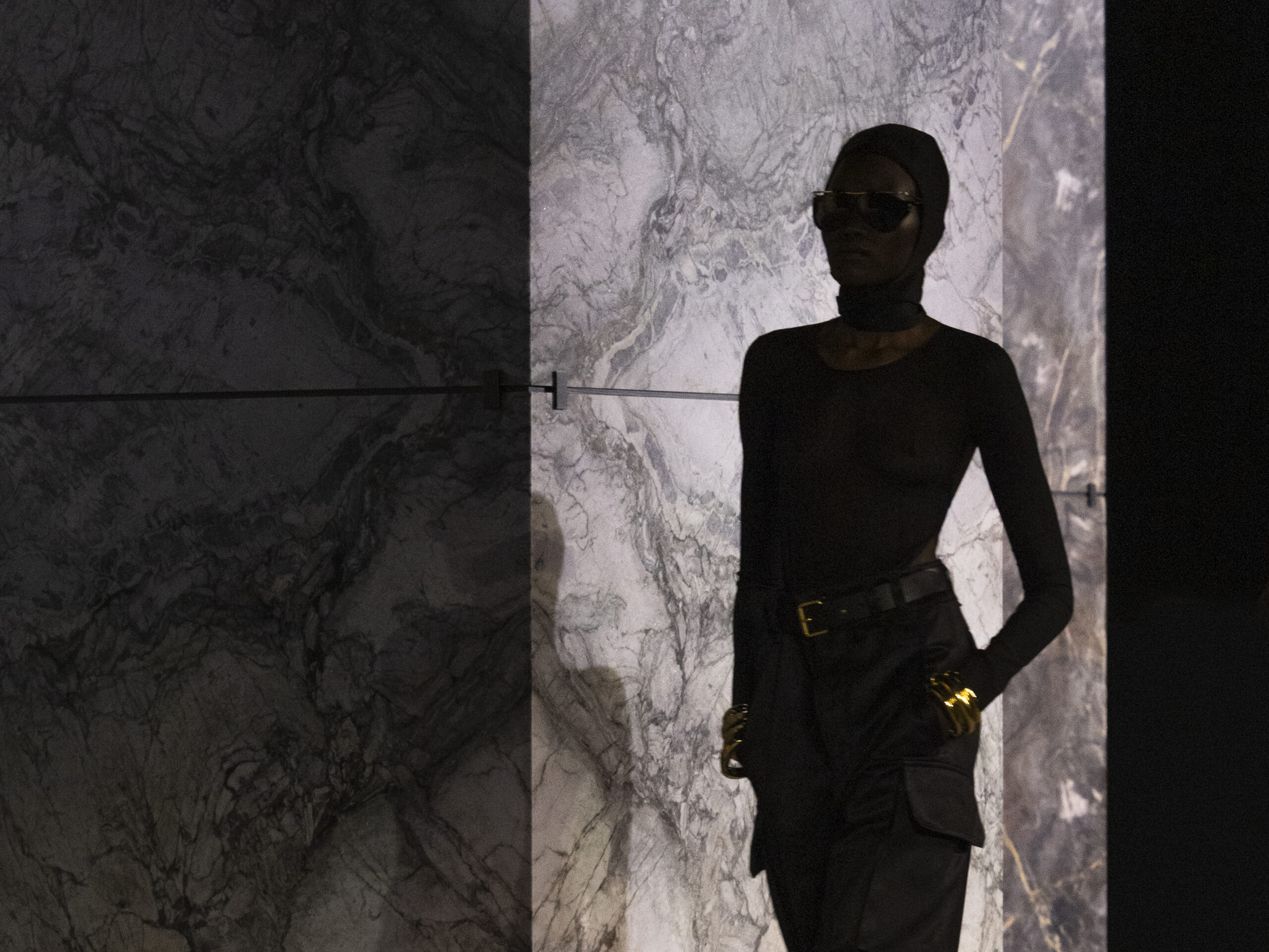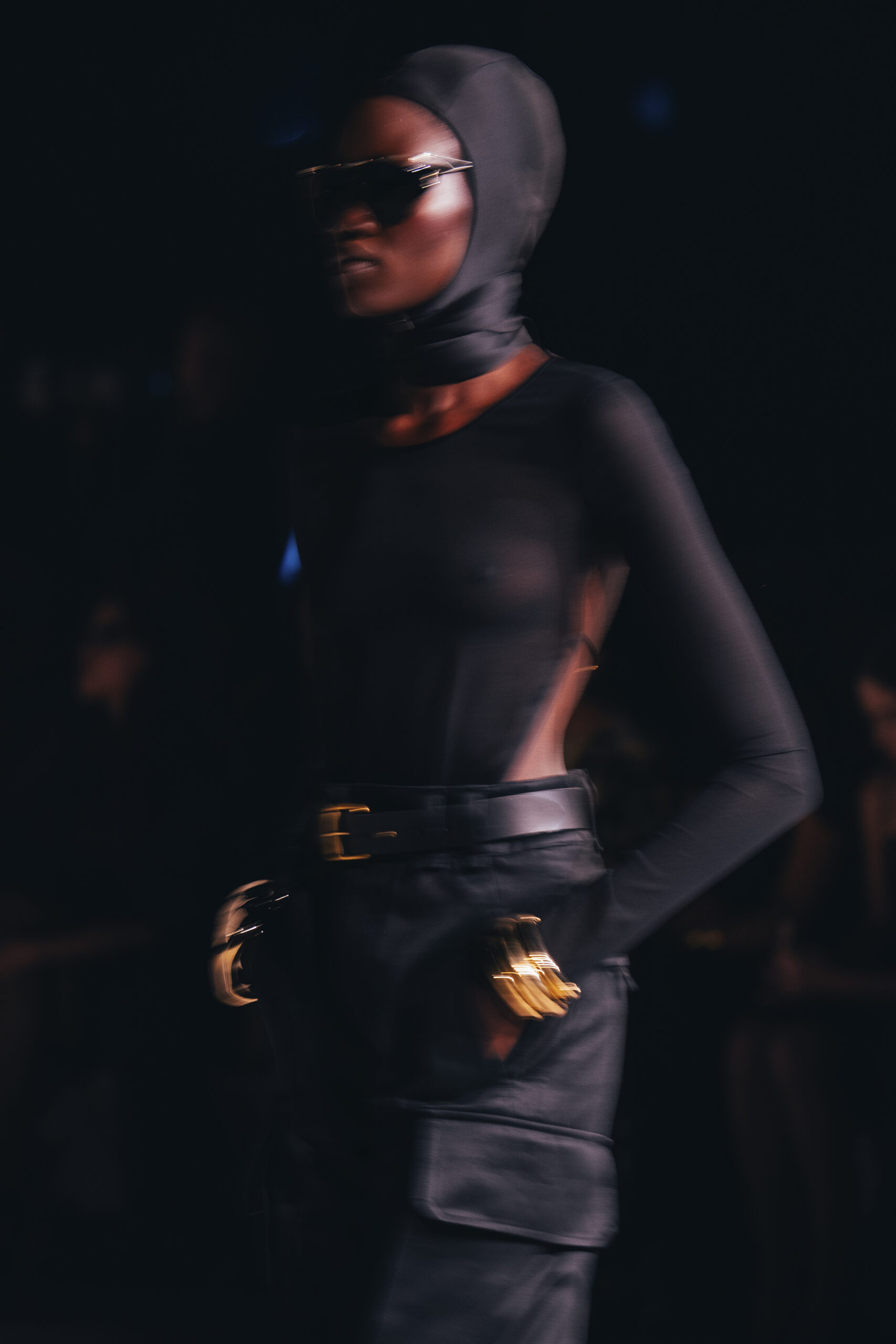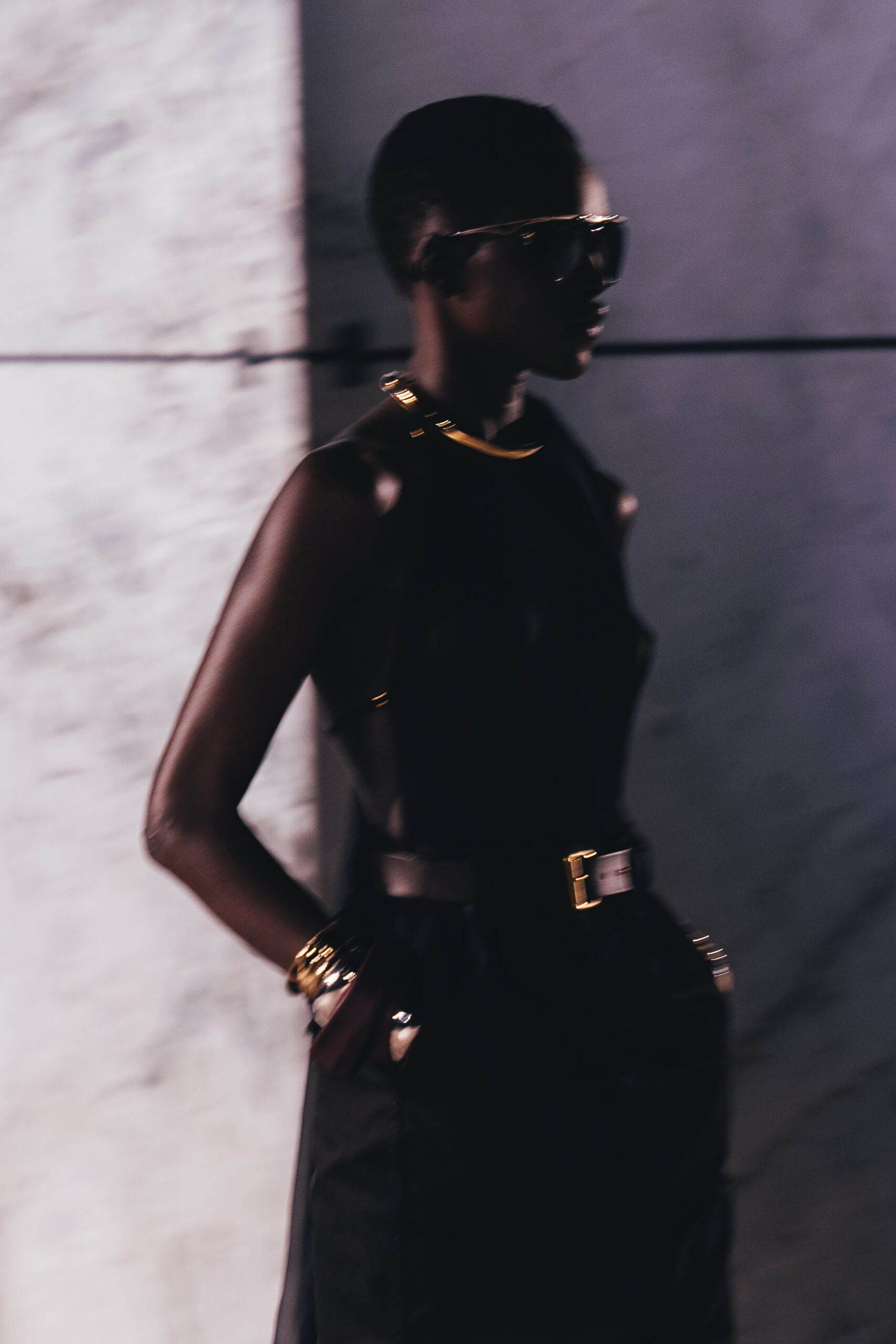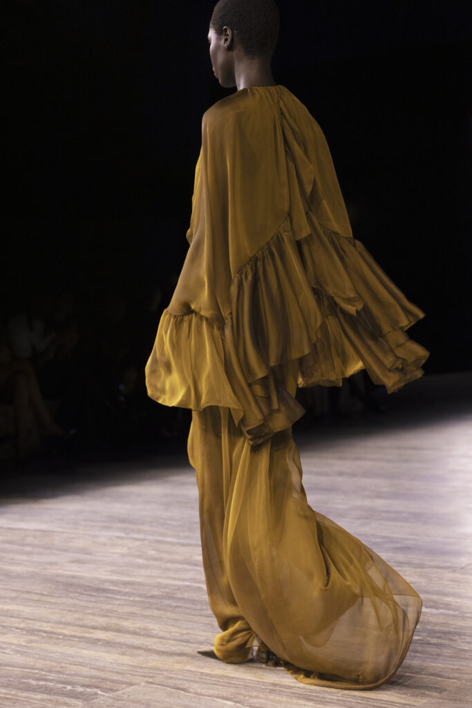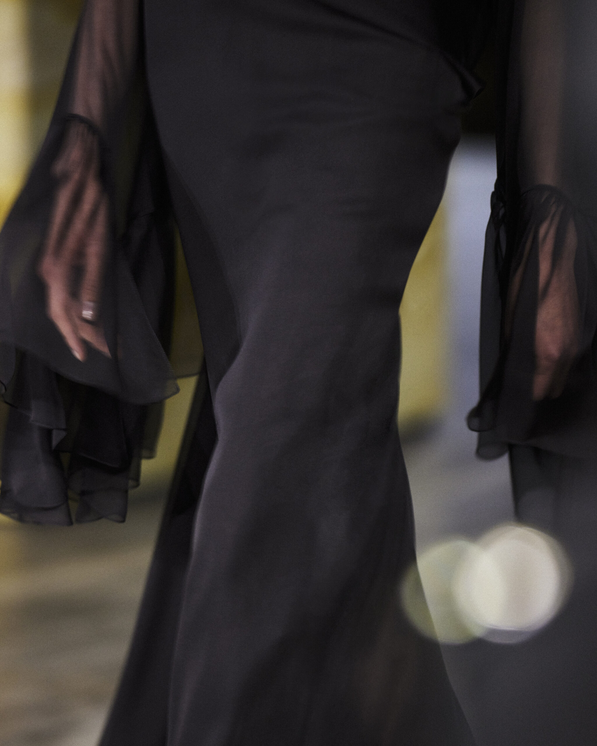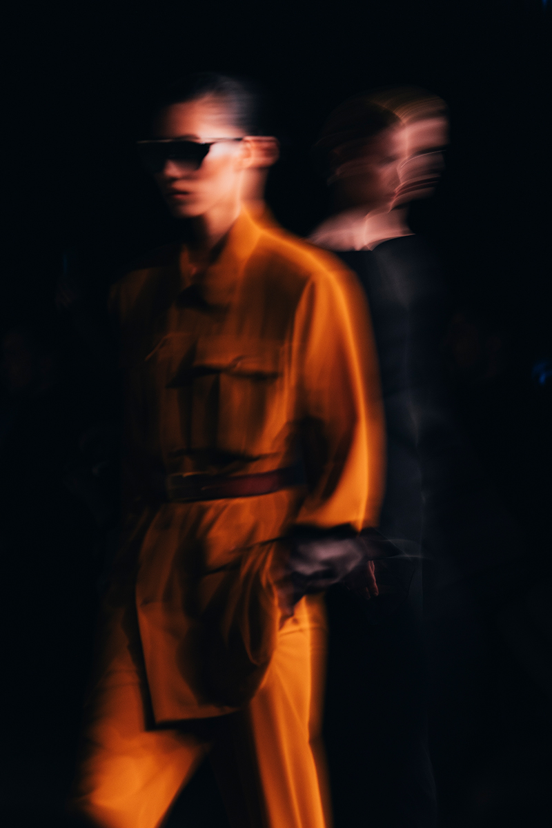 La veste safari et la combinaison trouvent ici des versions sophistiquées grâce à un travail sur les volumes et les détails, tels que les ceintures marquant la taille. Les coupes empruntées au vestiaire masculin se parent de notes raffinées comme les gants et talons aiguilles.