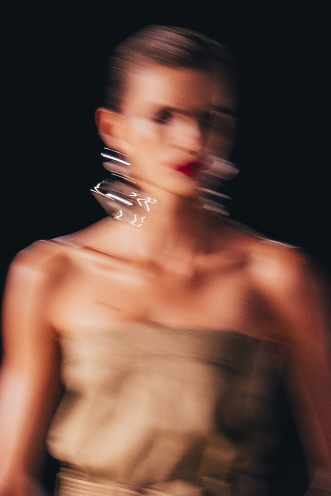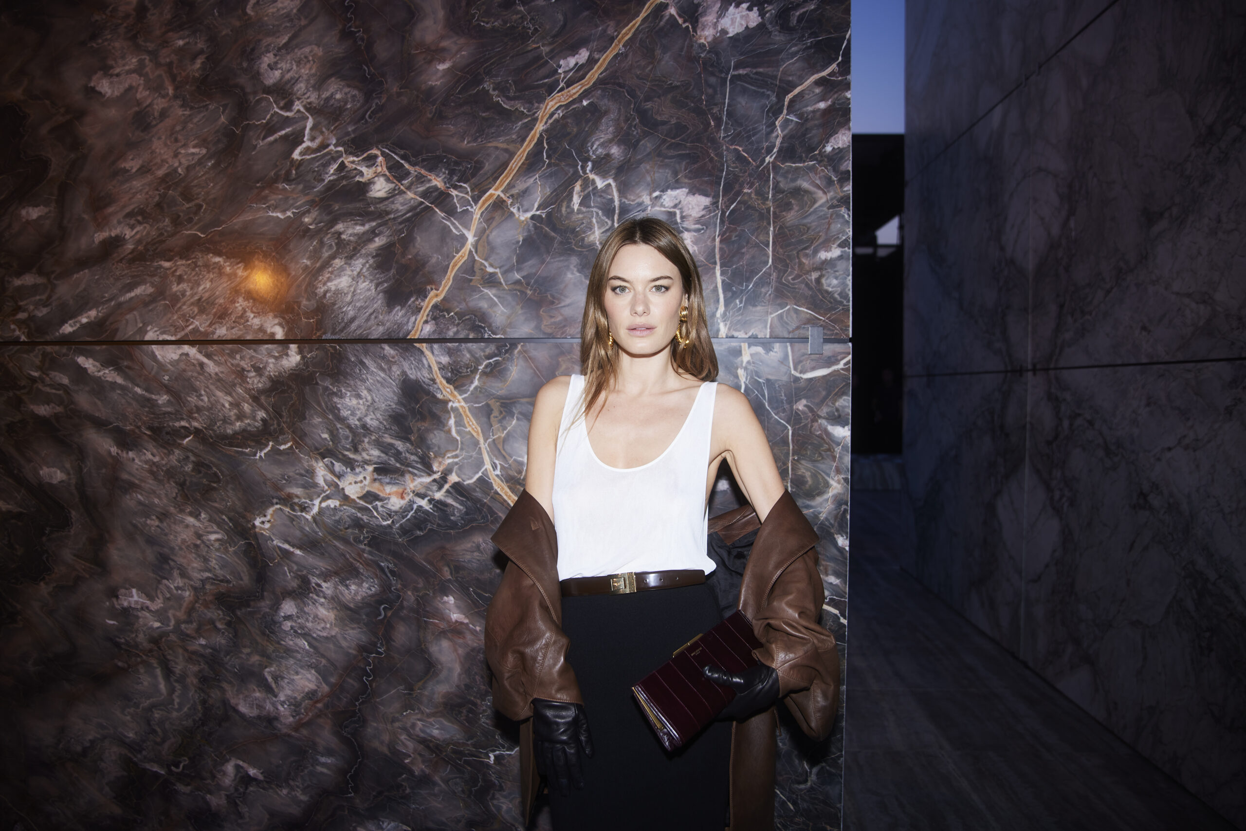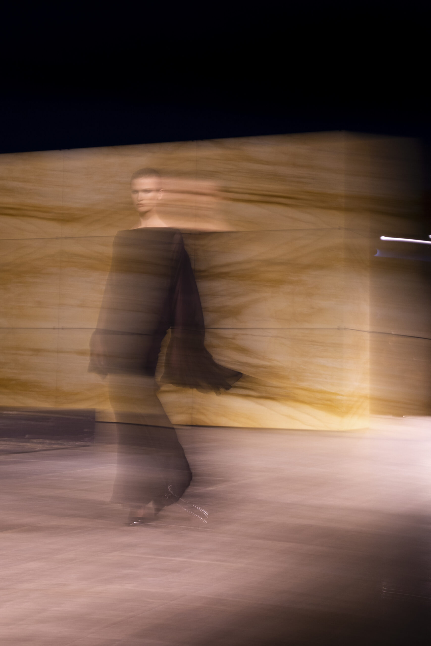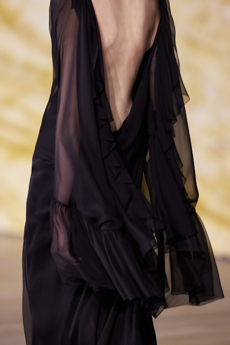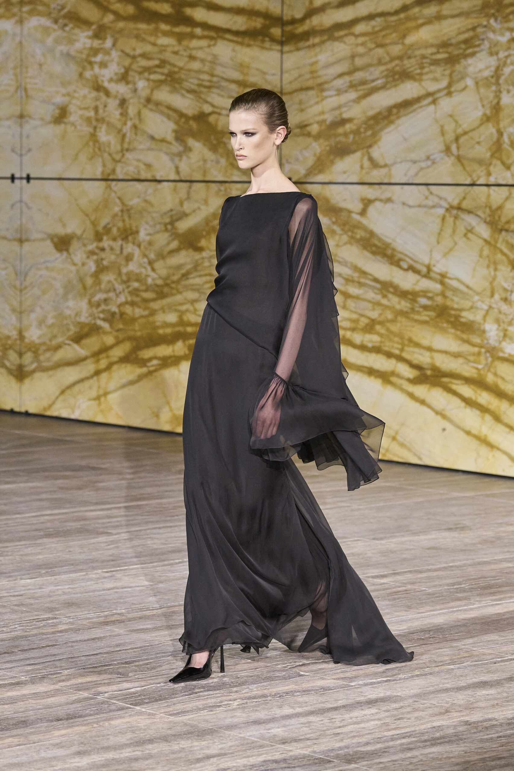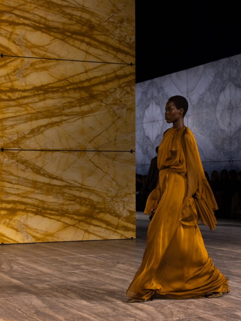 La veste safari et la combinaison trouvent ici des versions sophistiquées grâce à un travail sur les volumes et les détails, tels que les ceintures marquant la taille. Les coupes empruntées au vestiaire masculin se parent de notes raffinées comme les gants et talons aiguilles.