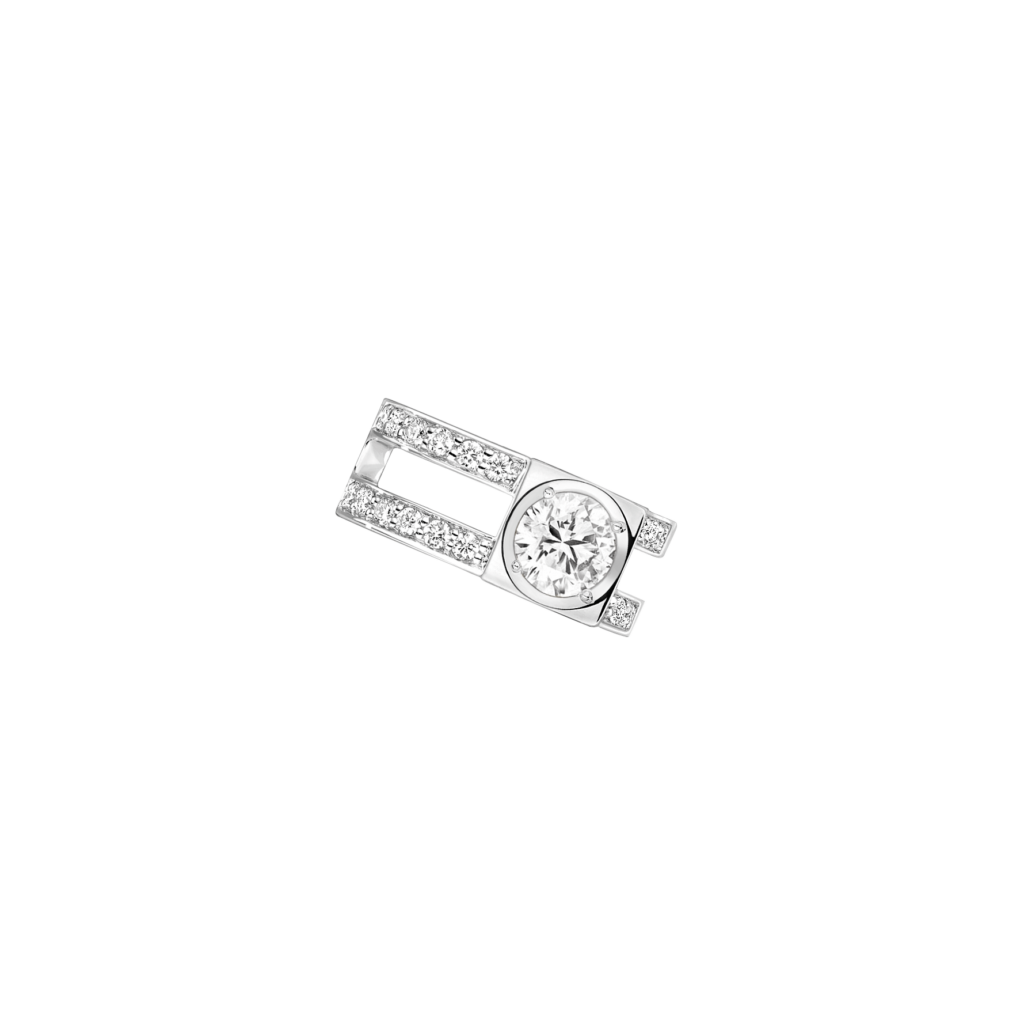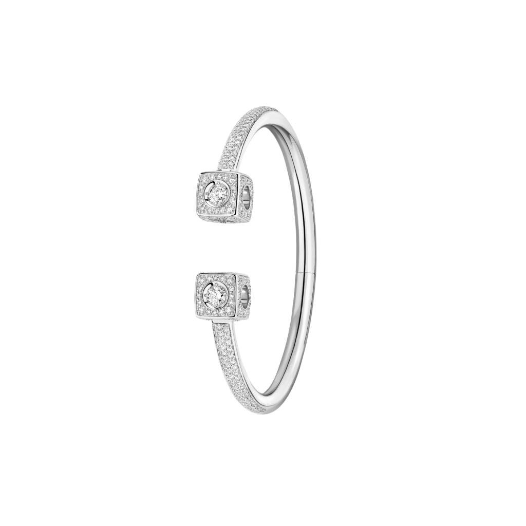 Le Cube Diamant se pare également de nouveaux portés, à l’instar du bracelet souple ou de la bague d’oreille, twistée dans une version deux rangs très graphique.