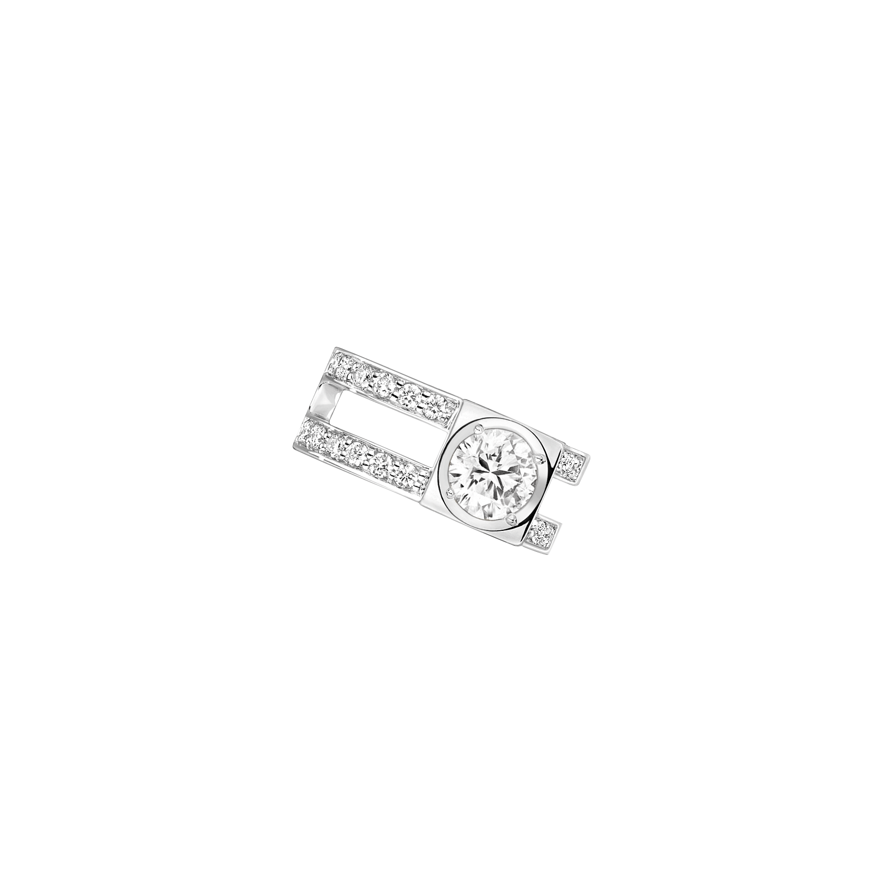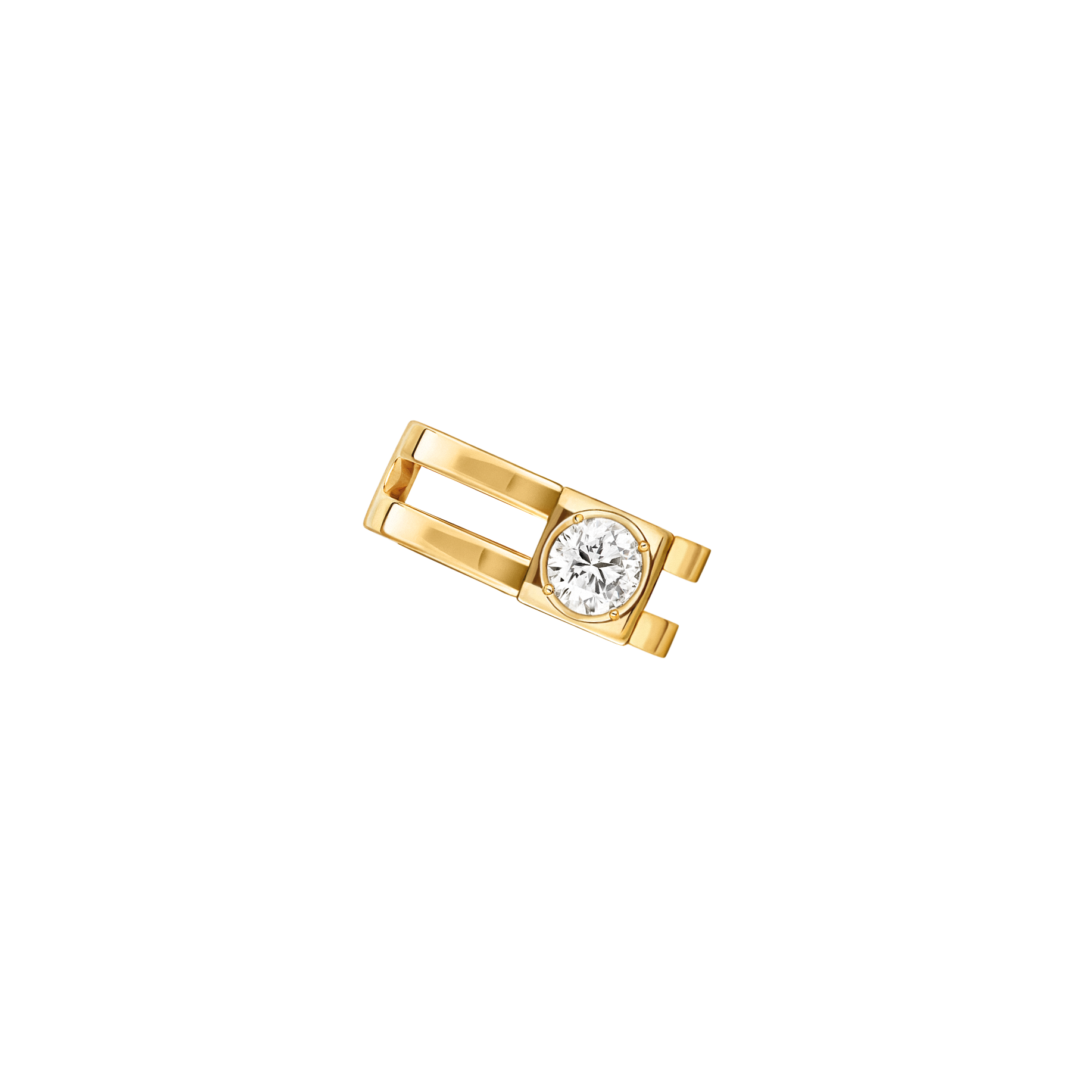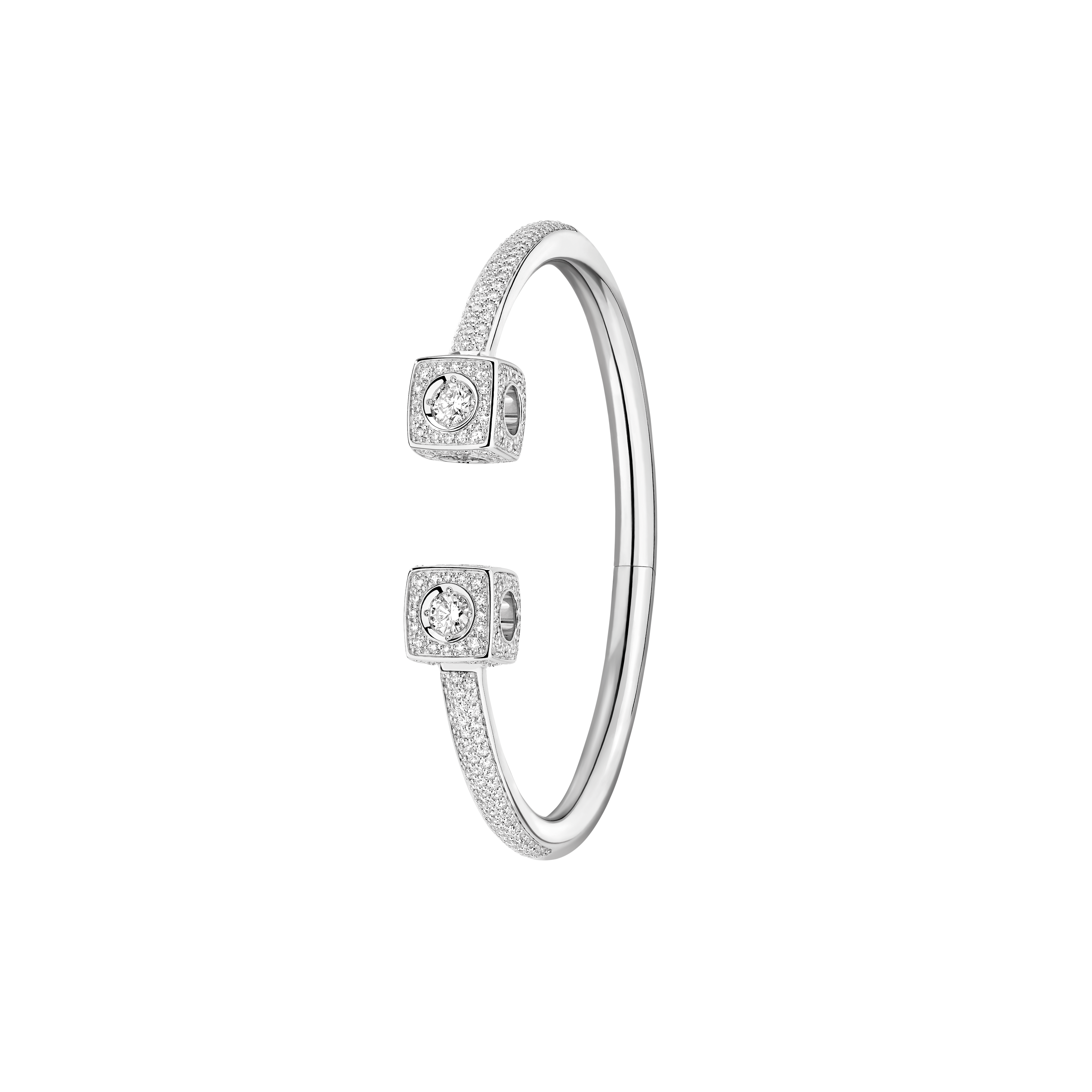 Le Cube Diamant se pare également de nouveaux portés, à l’instar du bracelet souple ou de la bague d’oreille, twistée dans une version deux rangs très graphique.