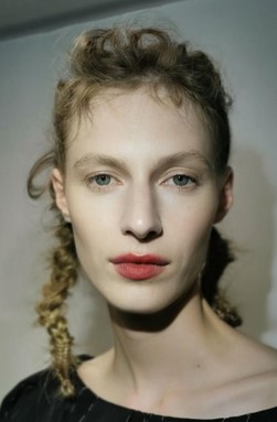 Les textures et les couleurs se rencontrent et se mêlent dans une palette qui flirte avec l’avant-garde sans jamais s’en éloigner complètement. Les lèvres, élément central de ces tableaux vivants, se parent de baume transparent pour un effet nude frais ou se teintent de corail romantique, tandis que d’autres osent des couleurs métallisées audacieuses – argent scintillant, bleu brillant et rouge orangé – créant un dialogue visuel vibrant avec les créations vestimentaires de Margiela.