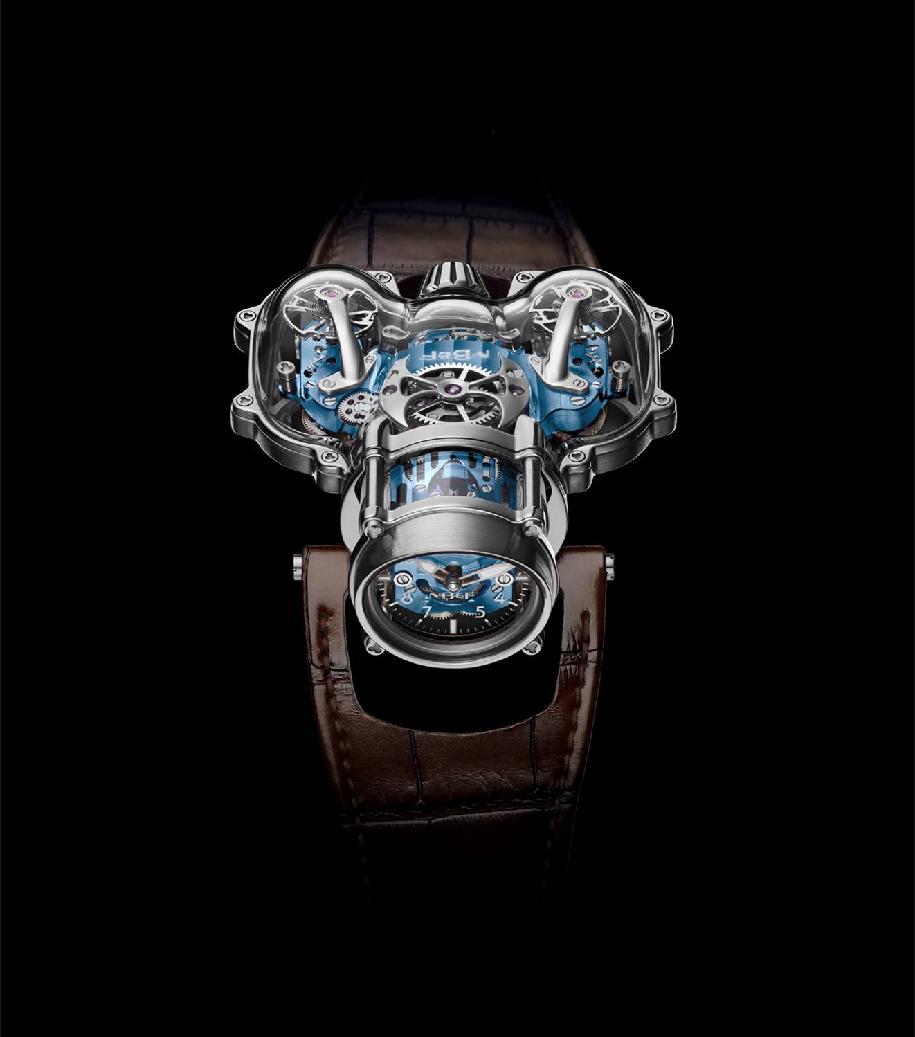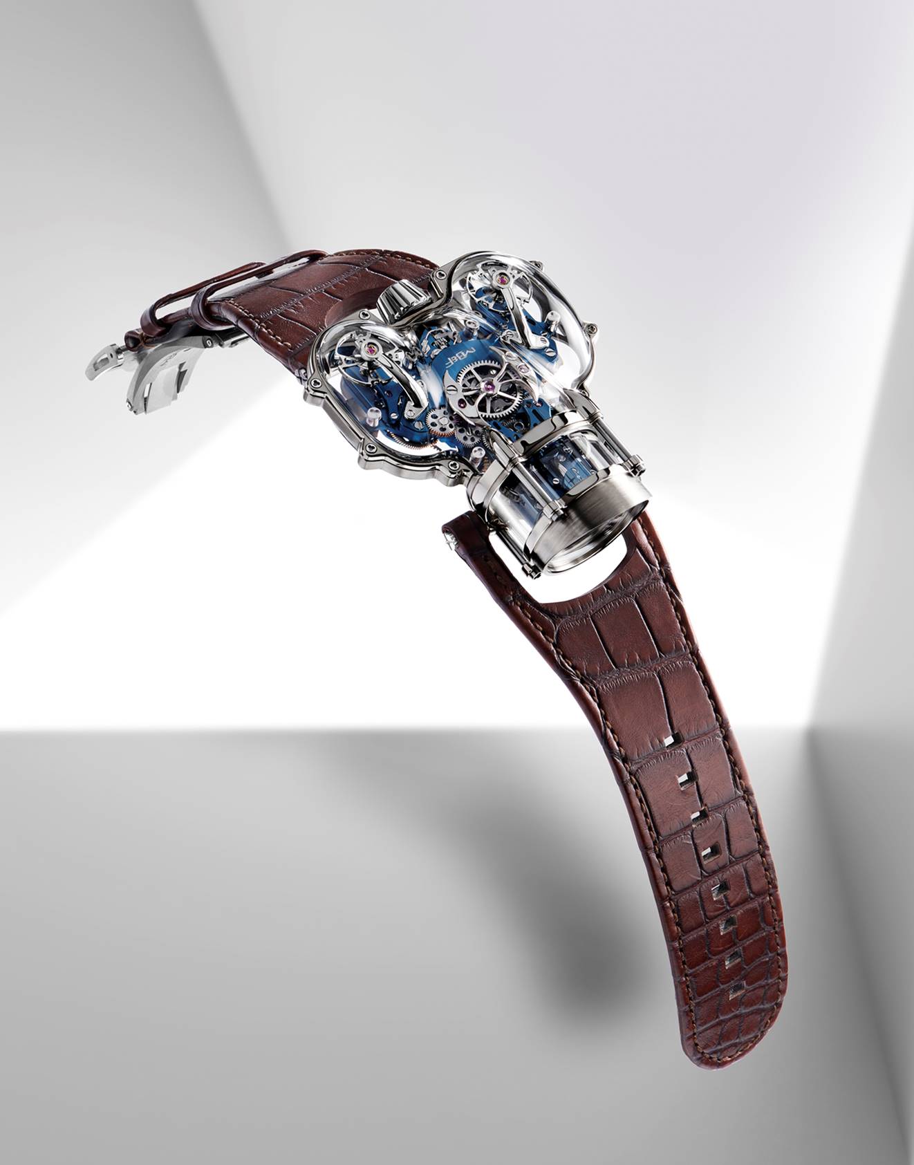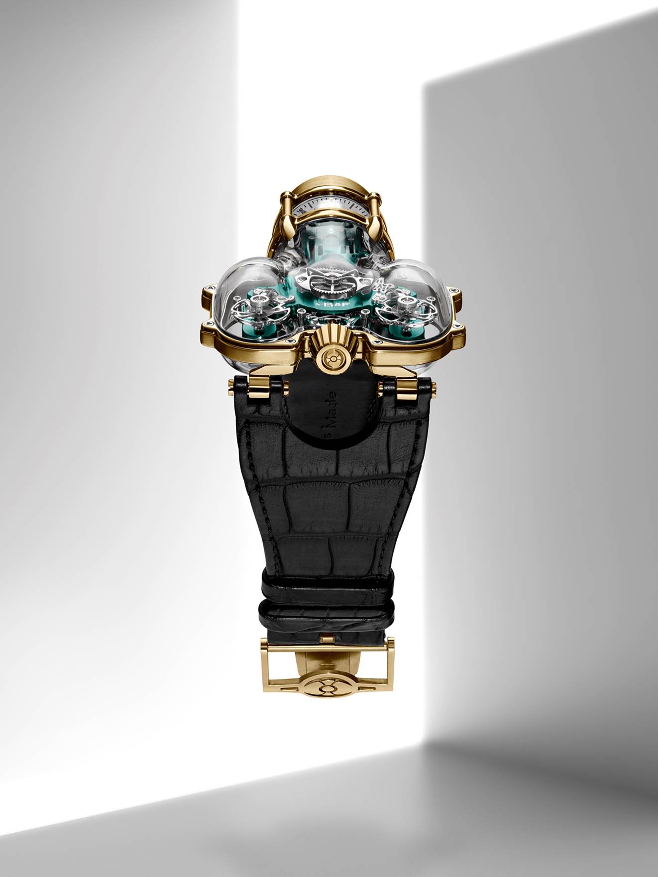 Aujourd’hui, deux nouvelles éditions Sapphire Vision en or sont dévoilées. La première arbore un boîtier doré jaune enjolivé d’un cadran vert rappelant la couleur du mouvement, tandis que la seconde épouse un ton doré blanc souligné d’un cadran bleu évoquant le mouvement. Là où la plupart des boîtiers saphir sont constitués de deux plaques, le boîtier courbe de la HM9 nécessite un façonnage et un polissage d’une extrême précision. Pour assurer une étanchéité parfaite, MB&F a développé un joint breveté associé à une technique maîtrisée de scellement sous vide.