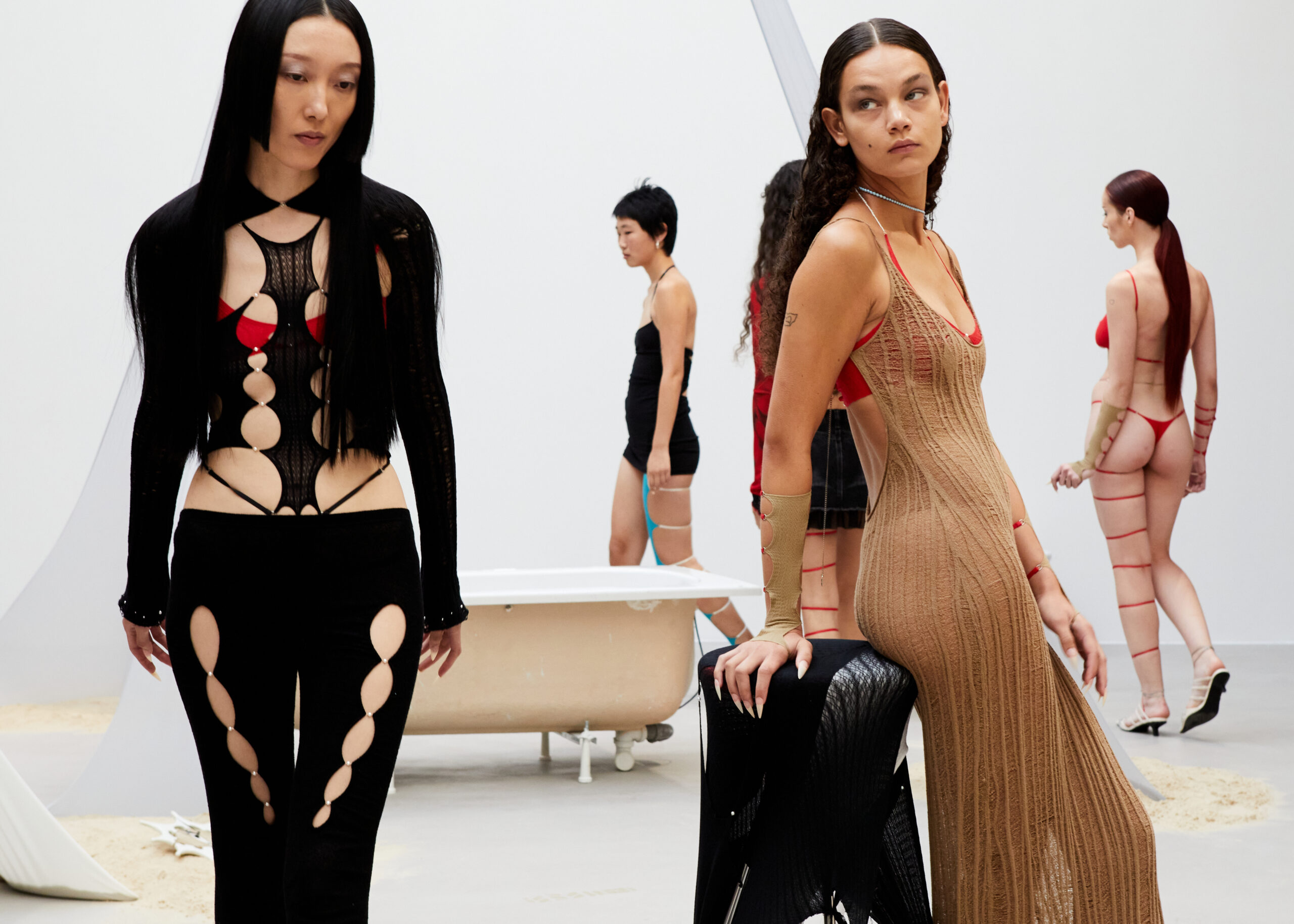 Le casting de cette collection est aussi diversifié et captivant que les pièces elles-mêmes, avec des talents tels que Alici, Anais, Emily, jusqu’à Tara. Leurs déambulations, orchestrées par le chorégraphe Mès Lesne, donnent vie à la vision artistique de RUI.