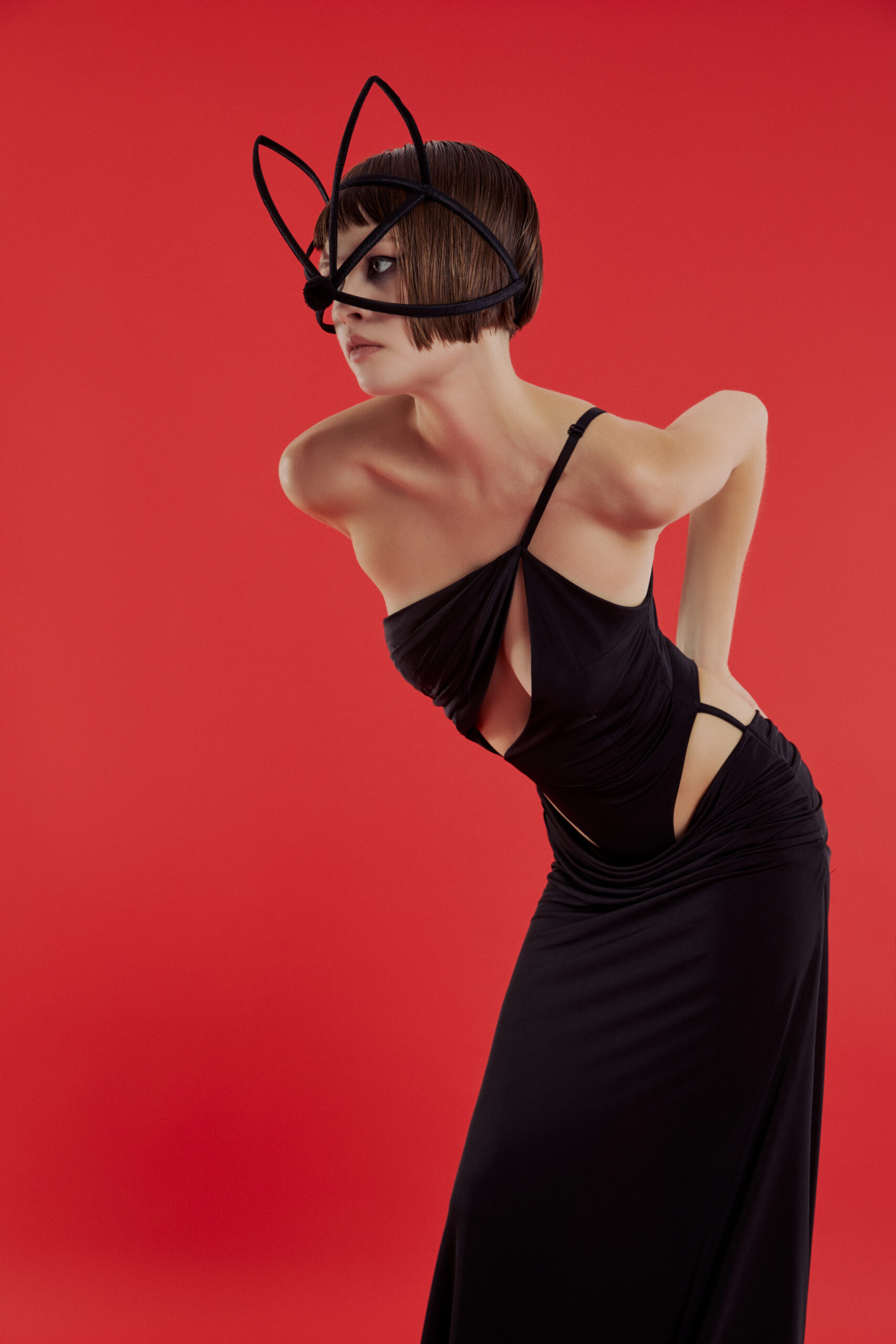 Au cœur de cette collection, une robe seconde peau célèbre la silhouette féminine avec audace, et des bodys effet micro-robe célèbrent la physicalité en attendant un changement – un changement qui est aussi métaphorique que littéral, évoquant le passage de l’ombre à la lumière, de l’incertitude à la clarté.