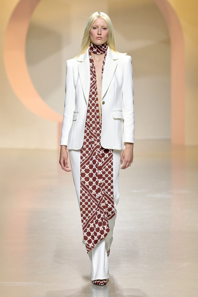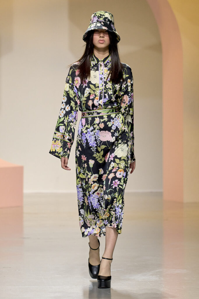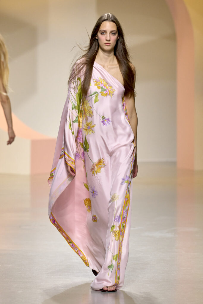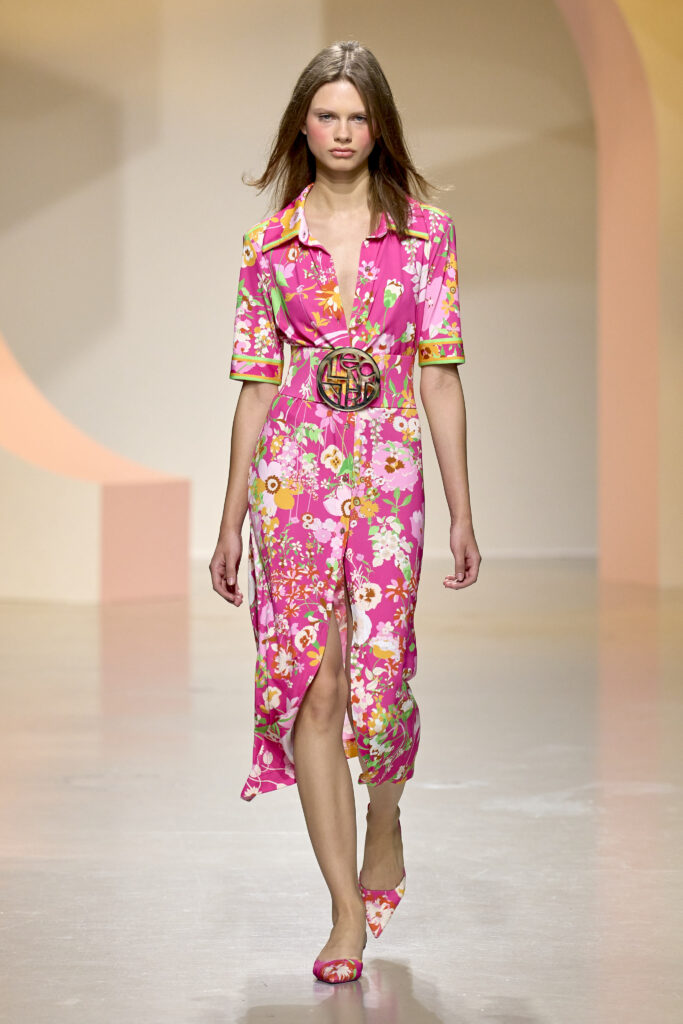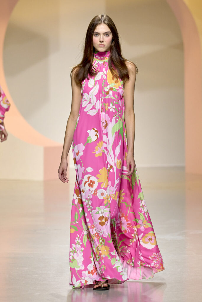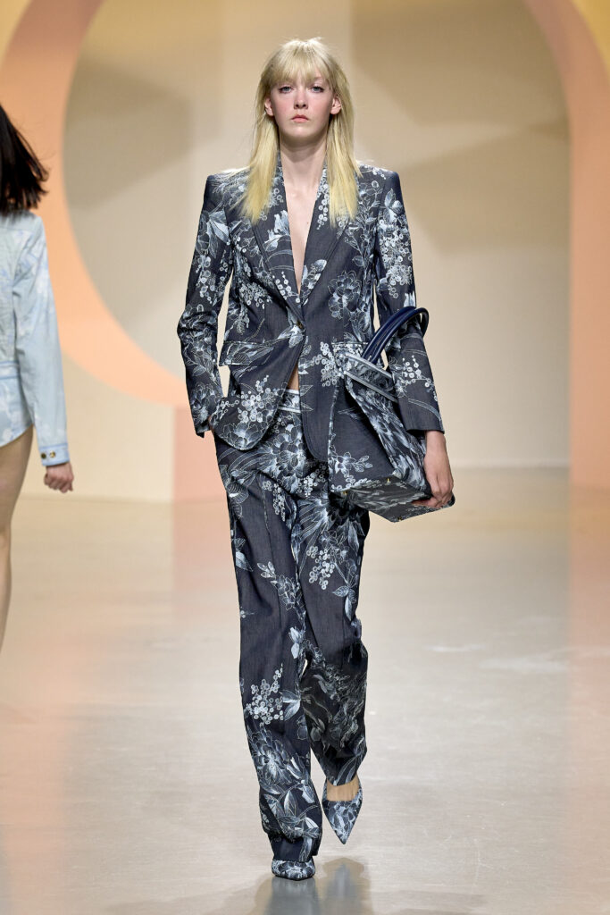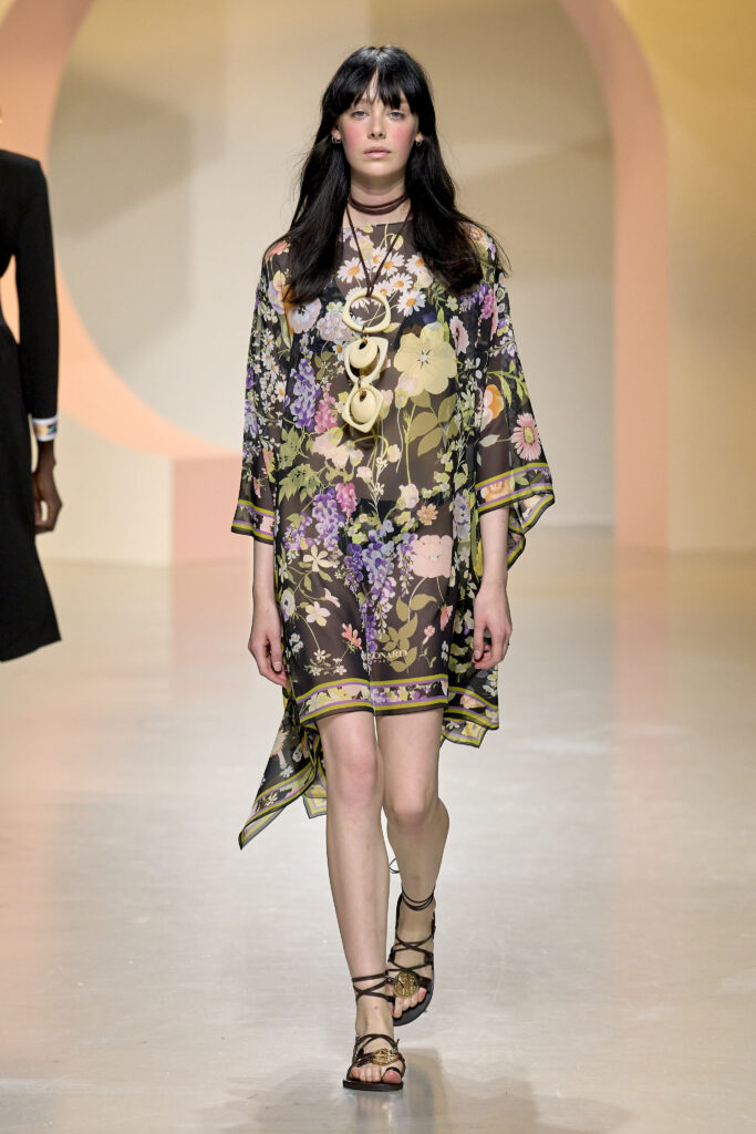 L’ouverture du défilé, marquée par une veste de costume blanc portée à même la peau, évoque la sensualité intemporelle incarnée par Bianca Jagger lors de son union avec Mick. La signature florale de la Maison LEONARD, véritable hymne à la joie de vivre, est revisitée à travers des imprimés fleuris vibrant de couleurs. Cependant, l’audace de la collection ne s’arrête pas là. Elle propose une évolution stylistique avec des pantalons fluides et évasés, des blouses amplement poétiques, des ponchos, des escarpins mutins et un sac qui promet de devenir culte.