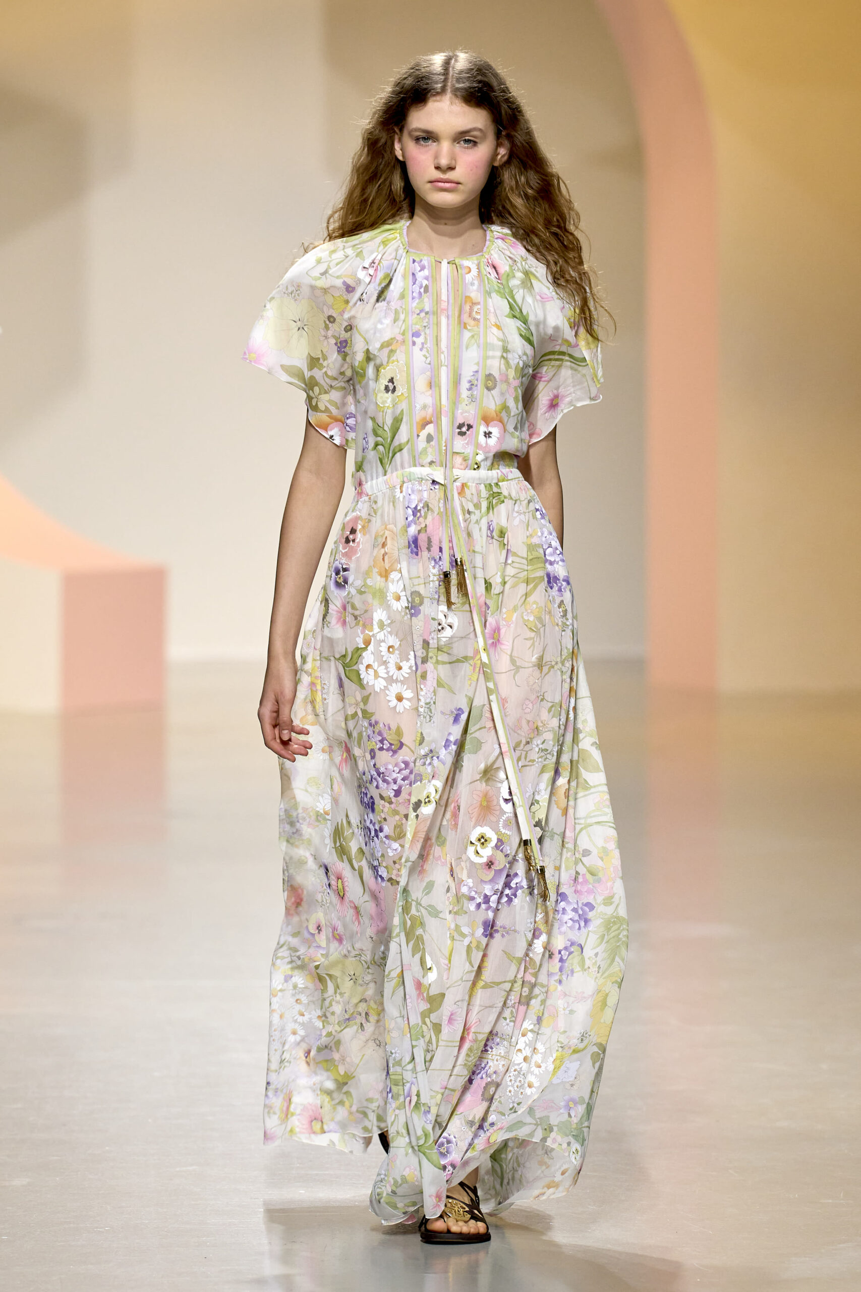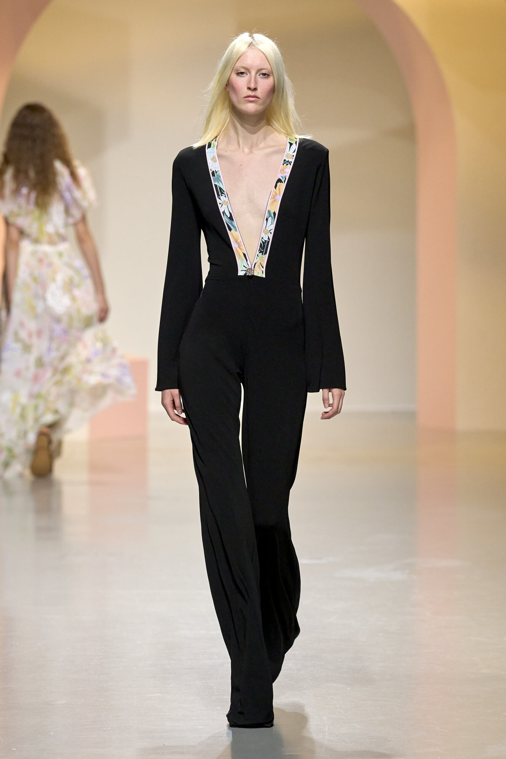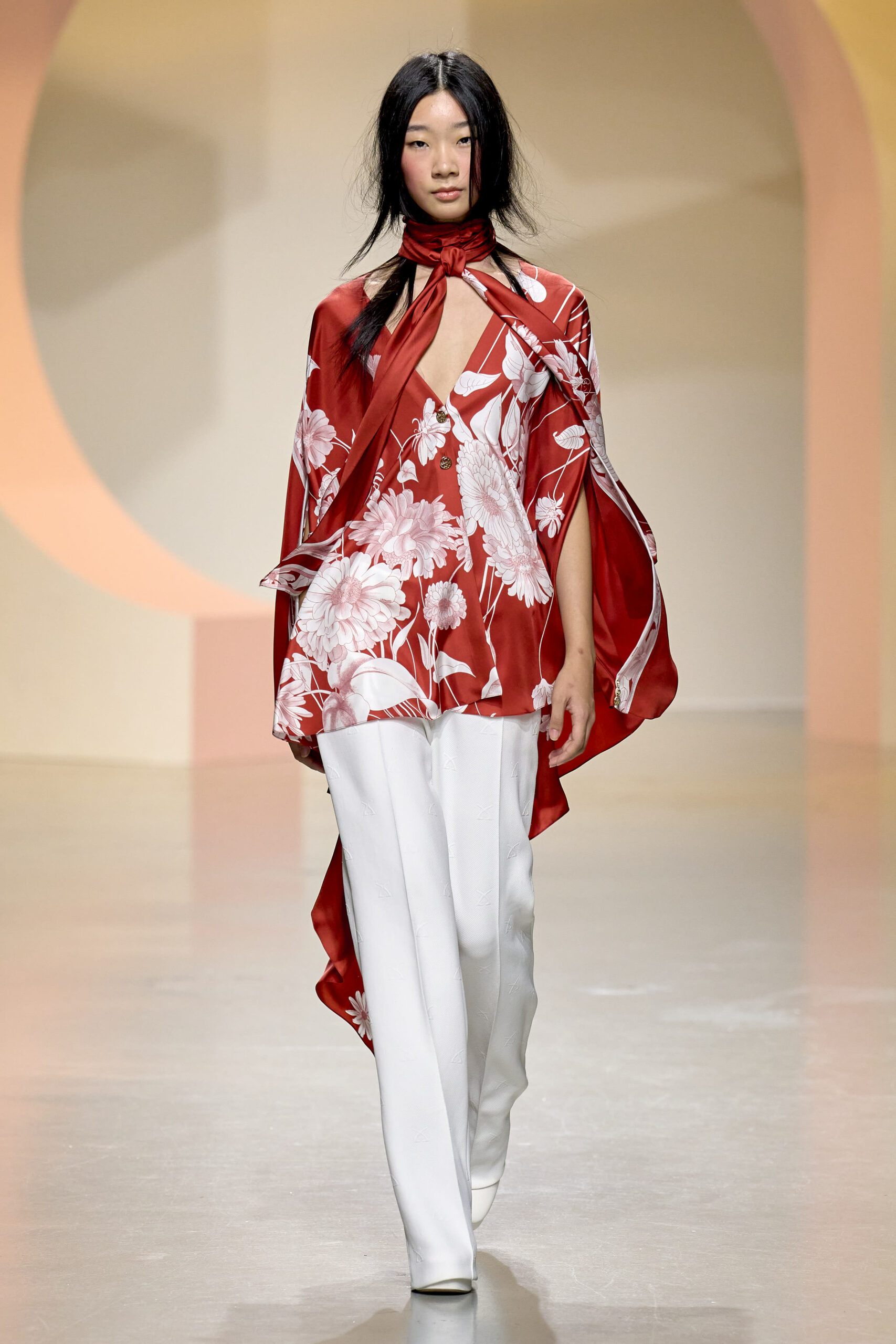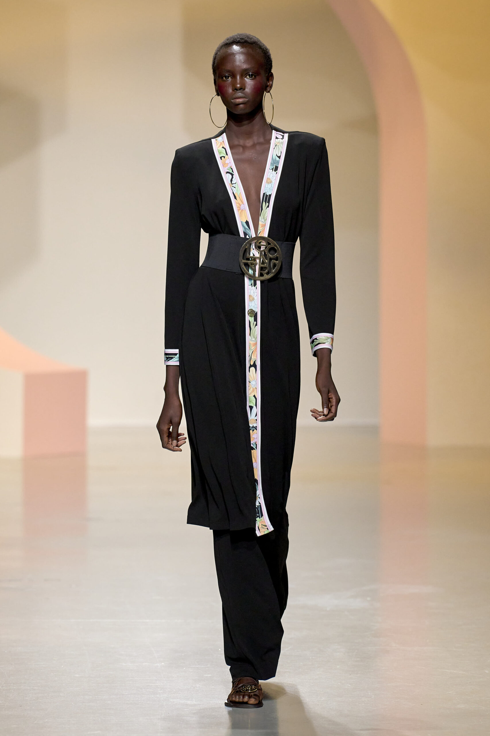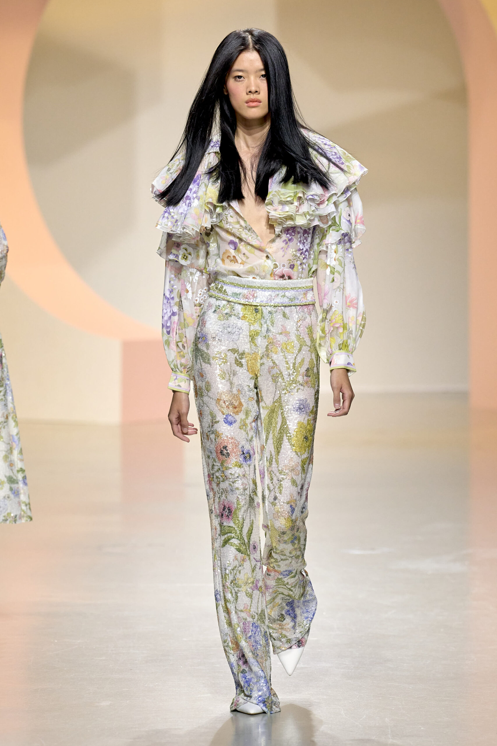L’ouverture du défilé, marquée par une veste de costume blanc portée à même la peau, évoque la sensualité intemporelle incarnée par Bianca Jagger lors de son union avec Mick. La signature florale de la Maison LEONARD, véritable hymne à la joie de vivre, est revisitée à travers des imprimés fleuris vibrant de couleurs. Cependant, l’audace de la collection ne s’arrête pas là. Elle propose une évolution stylistique avec des pantalons fluides et évasés, des blouses amplement poétiques, des ponchos, des escarpins mutins et un sac qui promet de devenir culte.