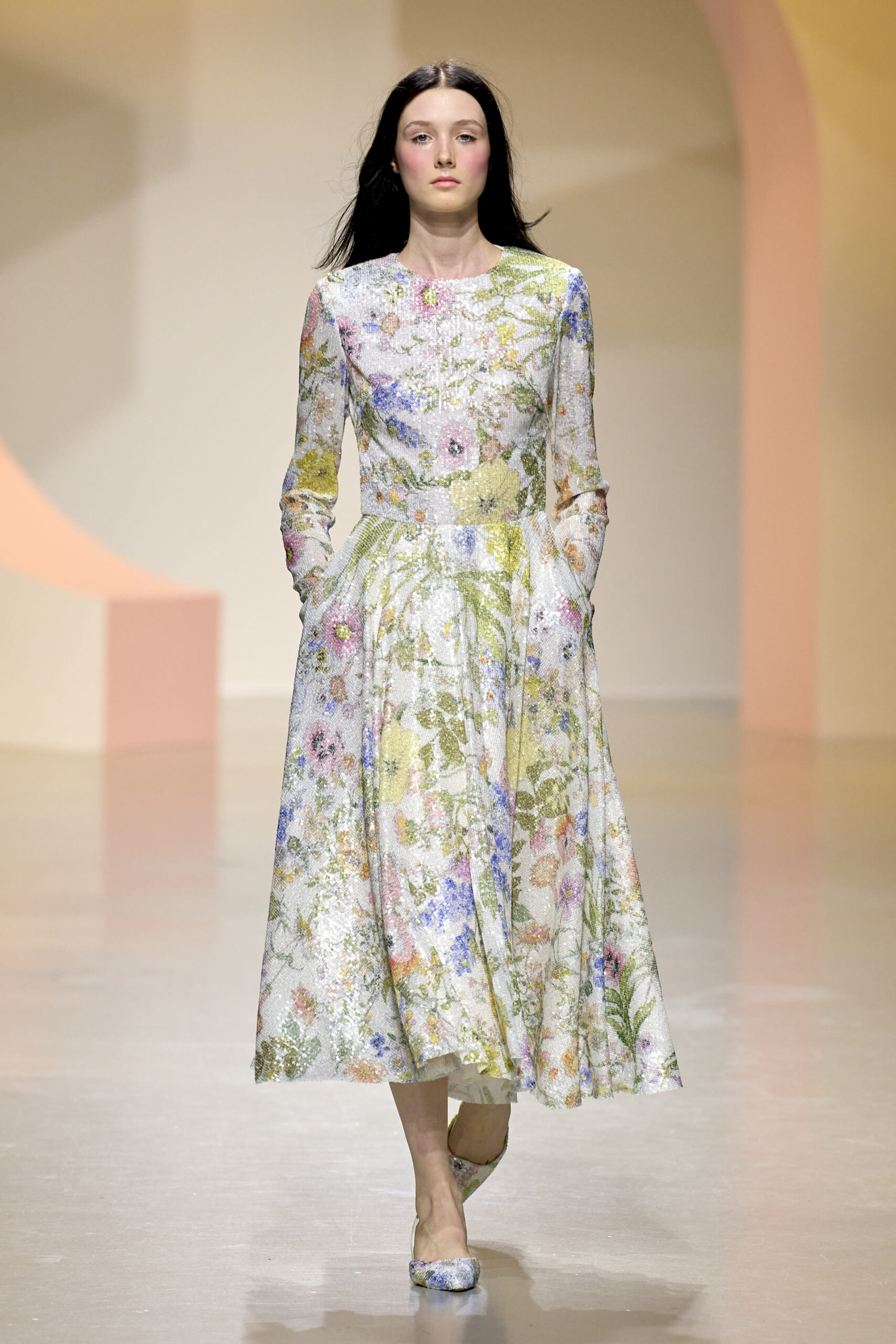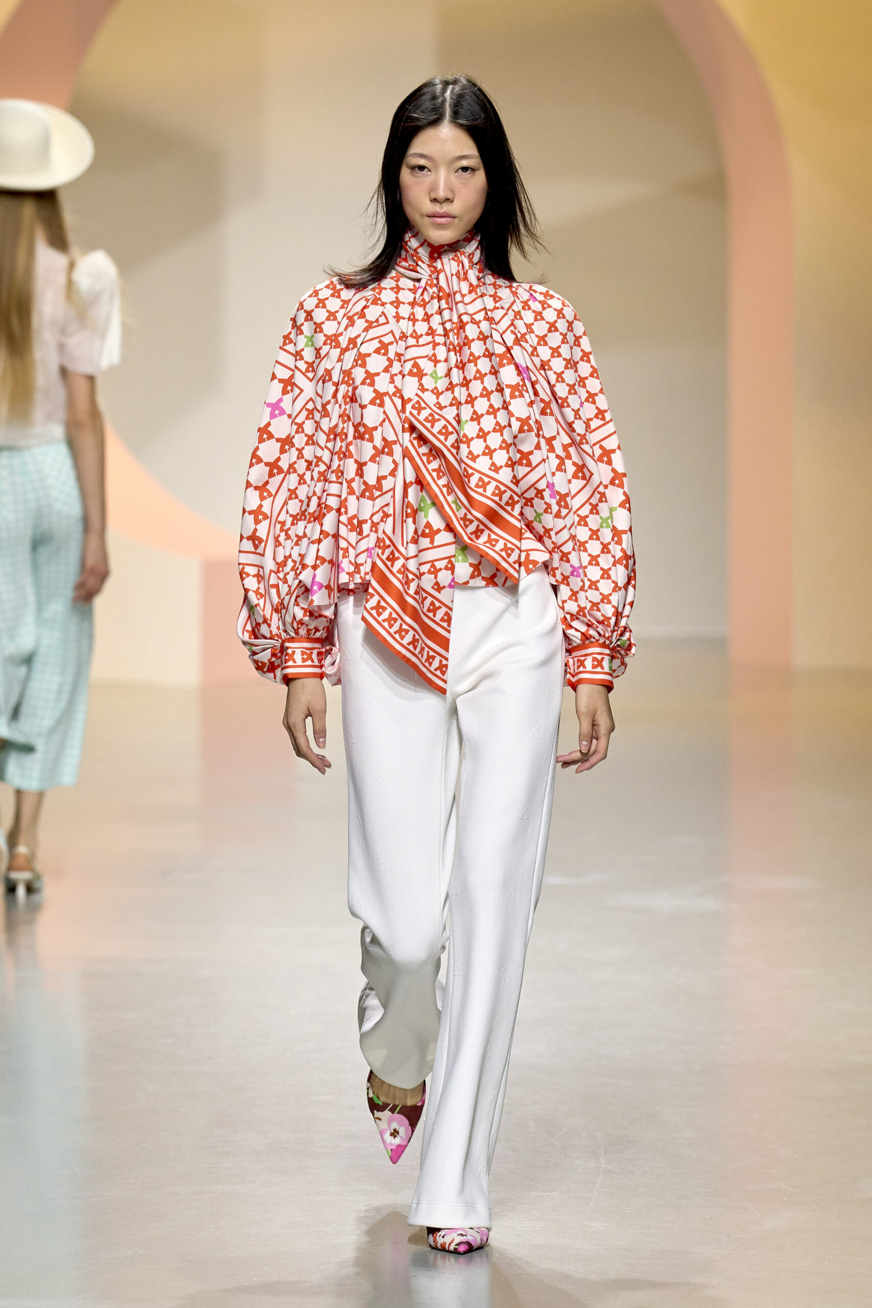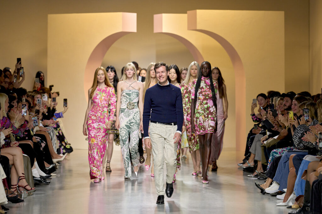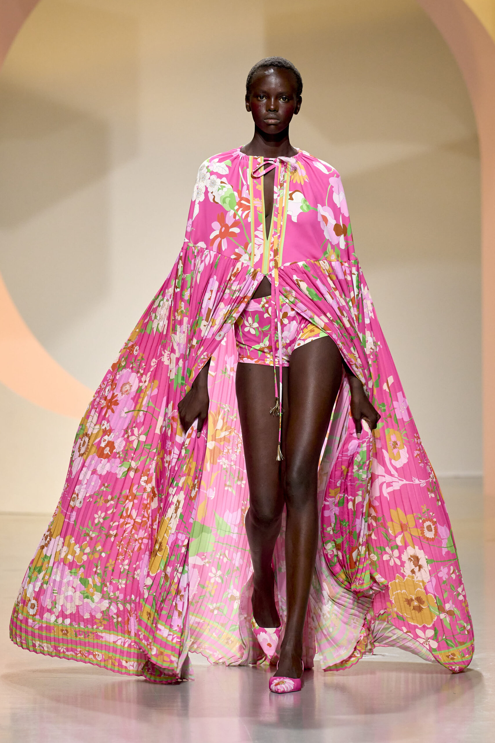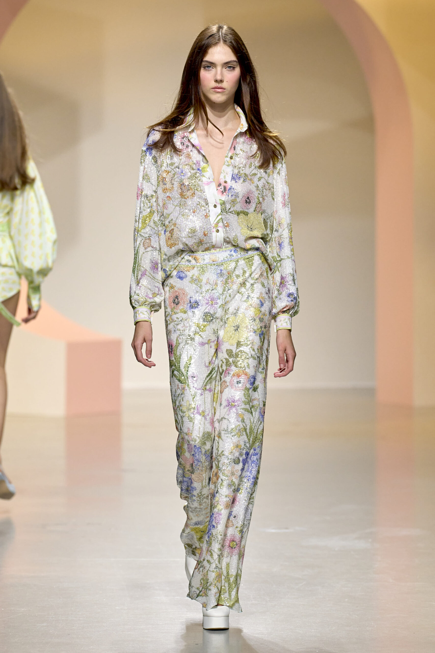 L’ouverture du défilé, marquée par une veste de costume blanc portée à même la peau, évoque la sensualité intemporelle incarnée par Bianca Jagger lors de son union avec Mick. La signature florale de la Maison LEONARD, véritable hymne à la joie de vivre, est revisitée à travers des imprimés fleuris vibrant de couleurs. Cependant, l’audace de la collection ne s’arrête pas là. Elle propose une évolution stylistique avec des pantalons fluides et évasés, des blouses amplement poétiques, des ponchos, des escarpins mutins et un sac qui promet de devenir culte.