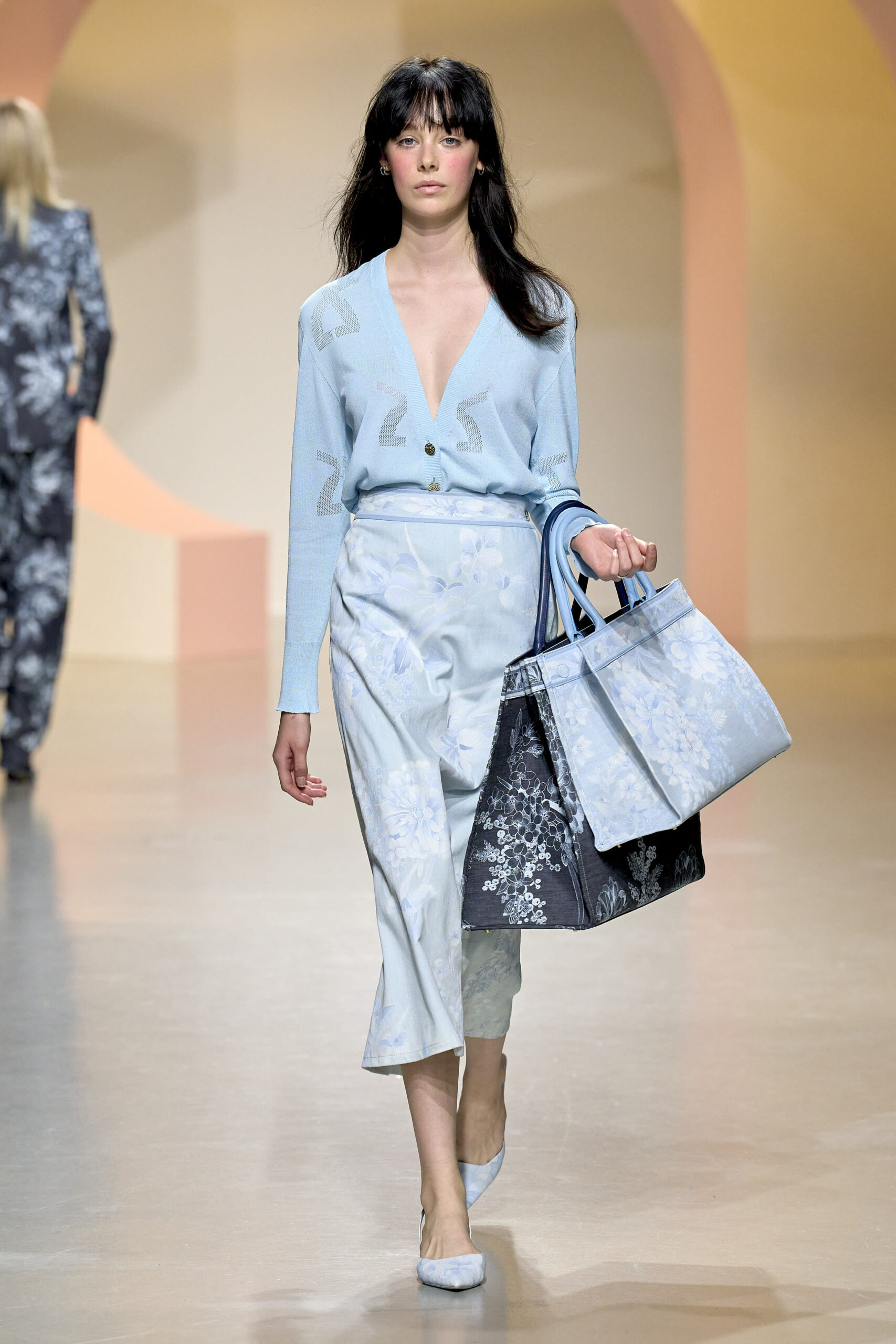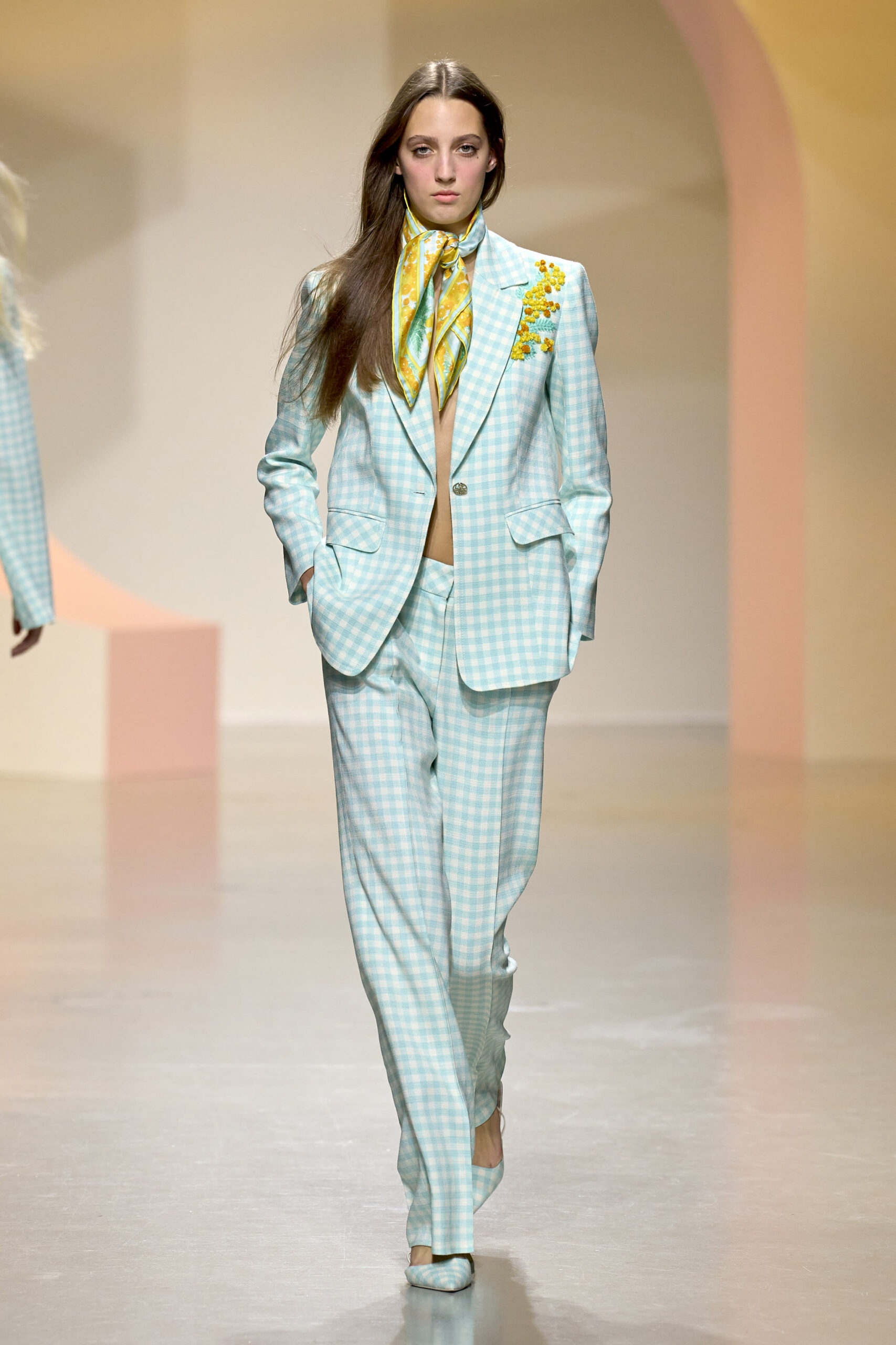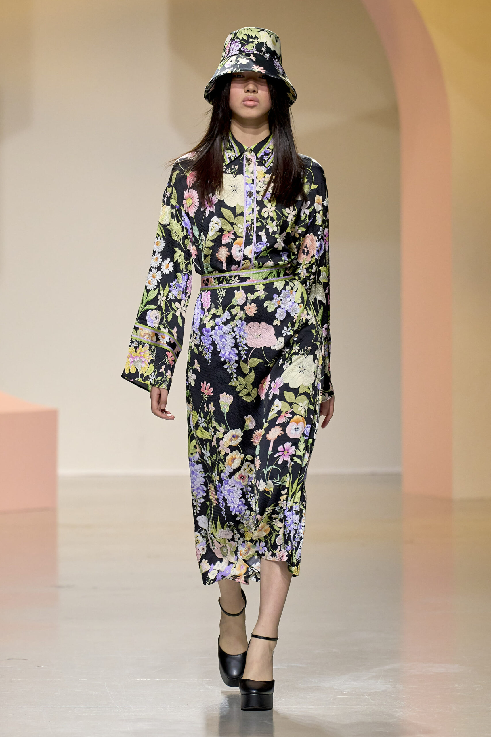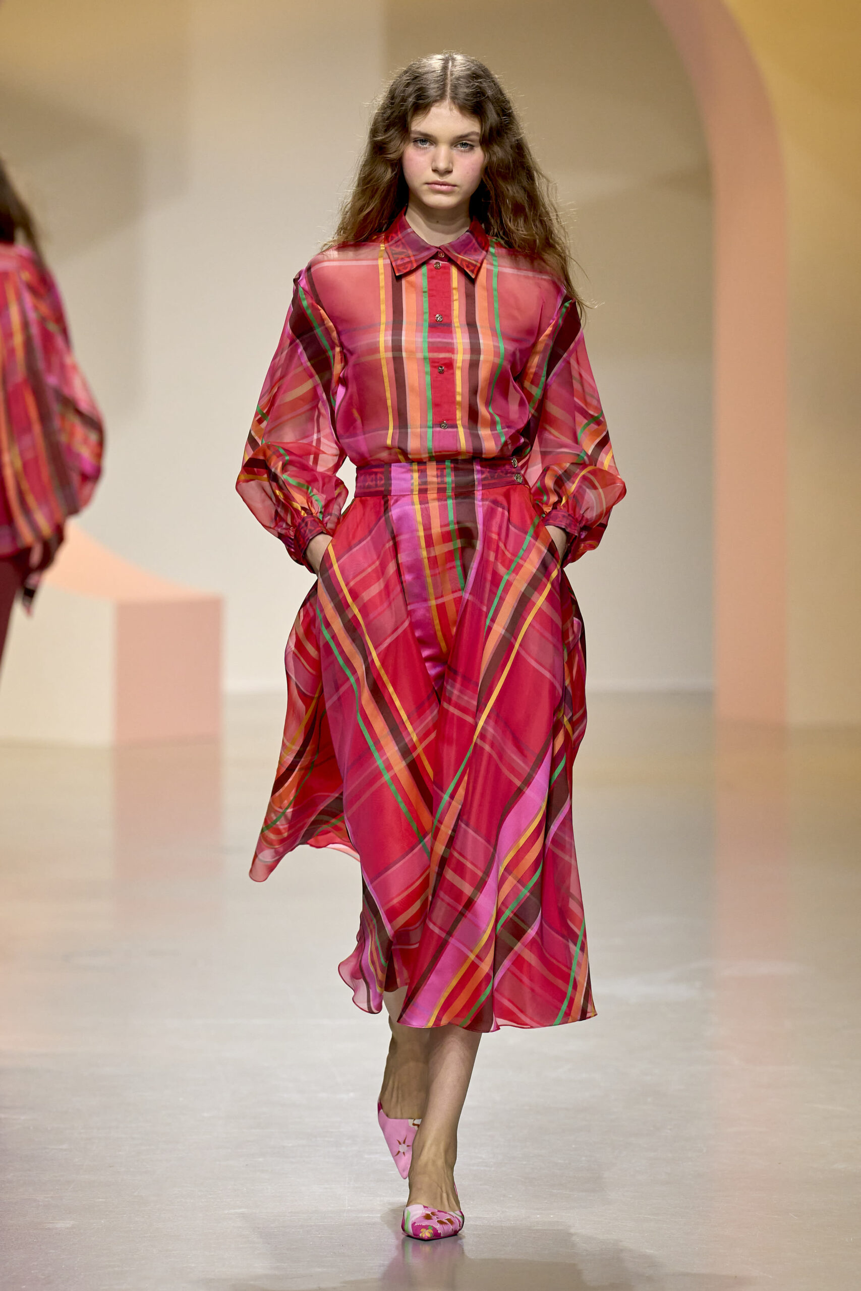 L’ouverture du défilé, marquée par une veste de costume blanc portée à même la peau, évoque la sensualité intemporelle incarnée par Bianca Jagger lors de son union avec Mick. La signature florale de la Maison LEONARD, véritable hymne à la joie de vivre, est revisitée à travers des imprimés fleuris vibrant de couleurs. Cependant, l’audace de la collection ne s’arrête pas là. Elle propose une évolution stylistique avec des pantalons fluides et évasés, des blouses amplement poétiques, des ponchos, des escarpins mutins et un sac qui promet de devenir culte.